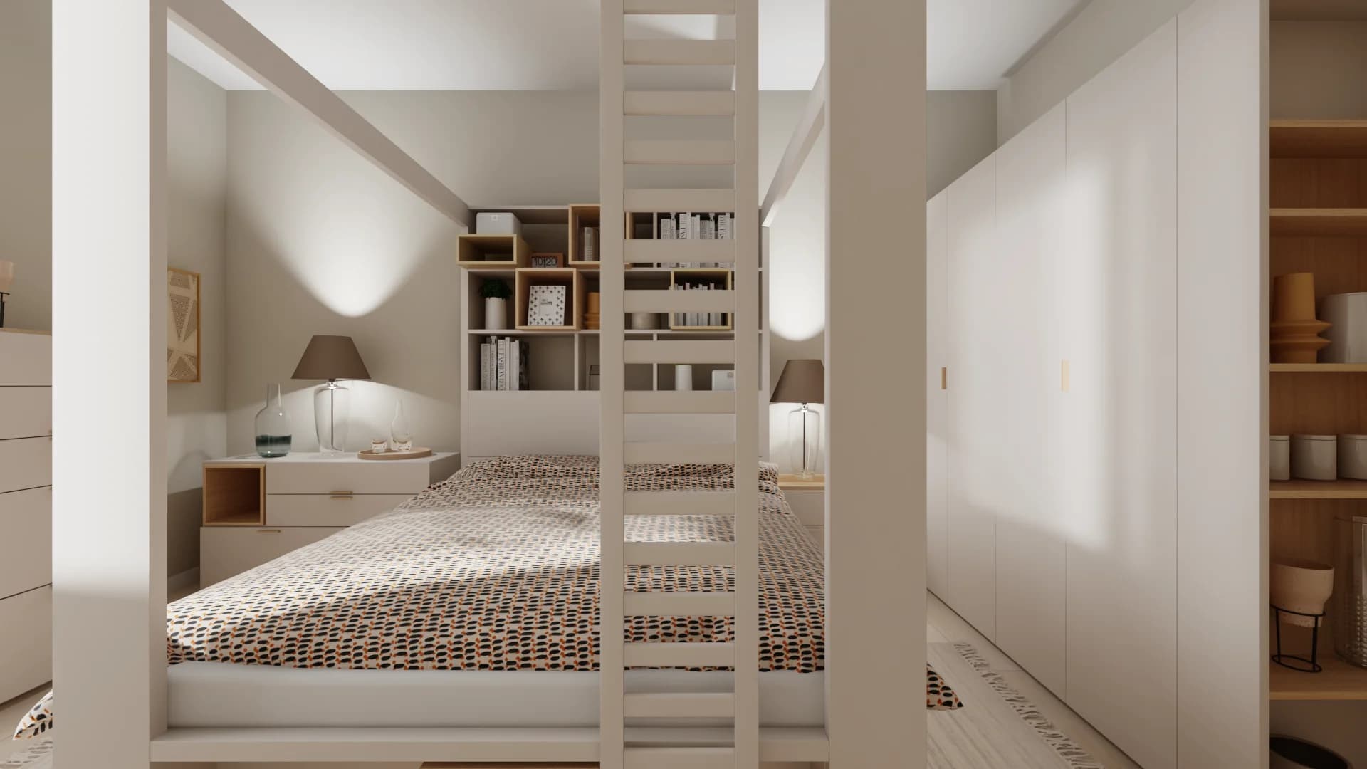Bright bedroom with multifunctional bed