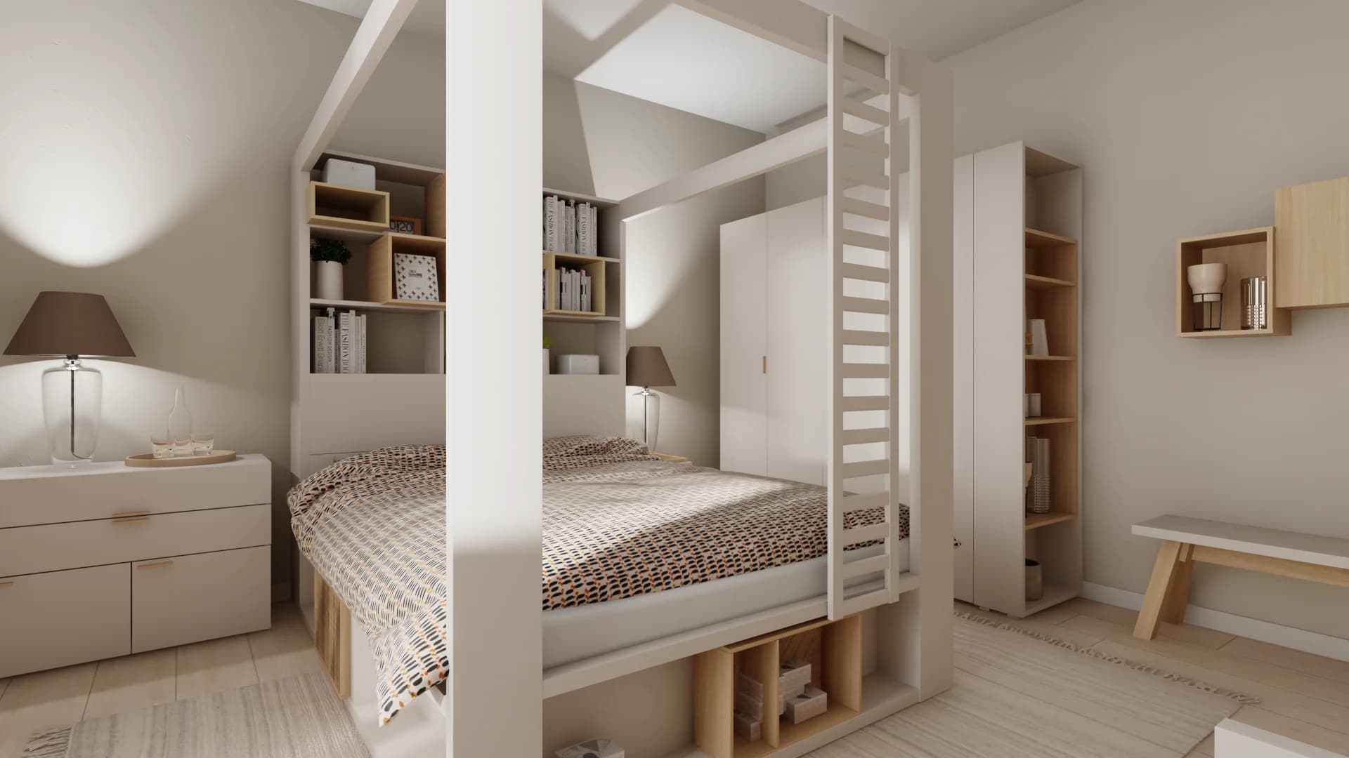The interior of this small bedroom is dominated by a large double bed with a canopy reaching the ceiling. There are many storage compartments and shelves, as well as a functional ladder that can be used as an organiser or flower bed. A small chest of drawers serves as a bedside table, while a spacious wardrobe provides ample space for clothes. Warm colours ensure a cosy atmosphere.