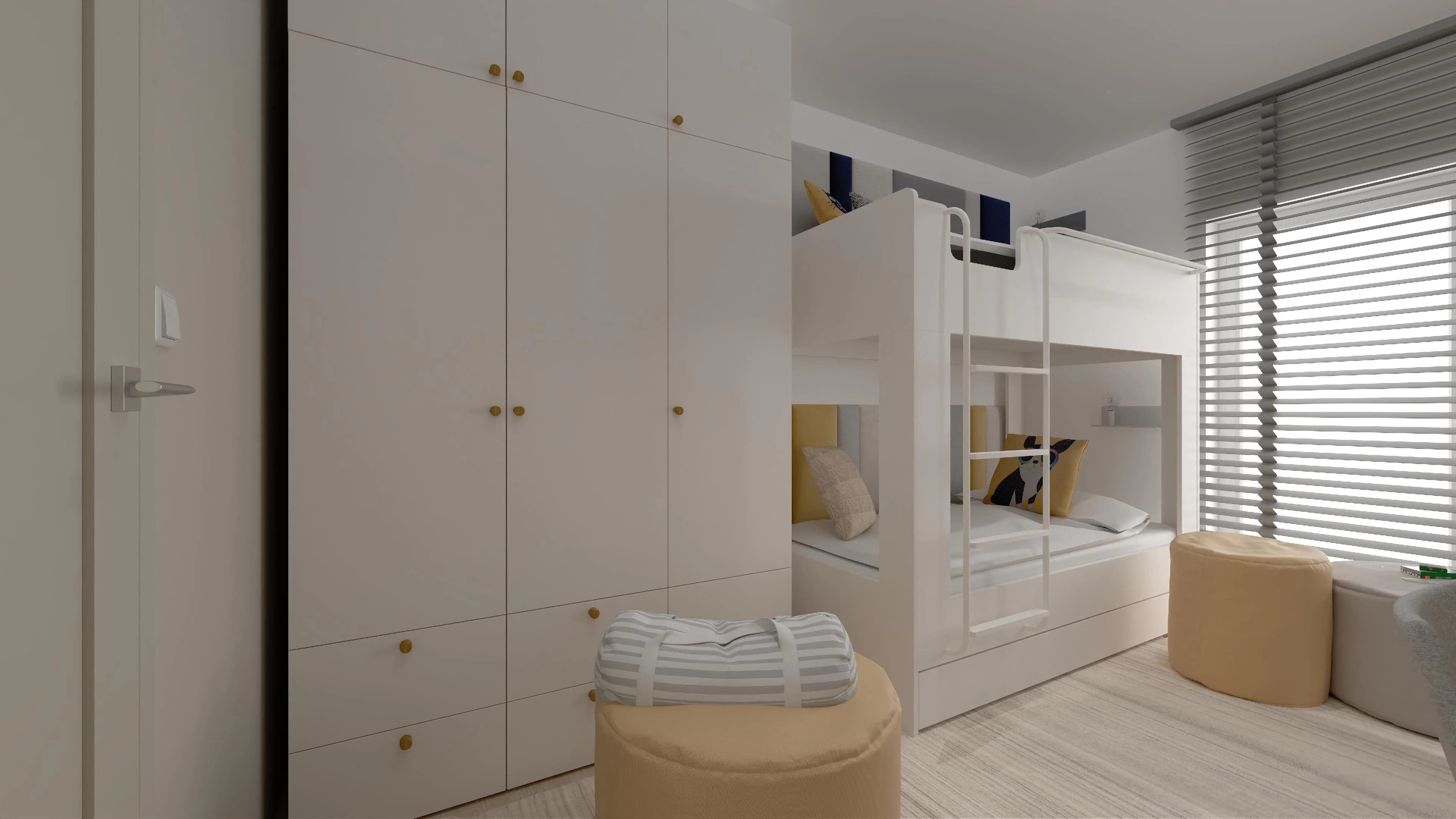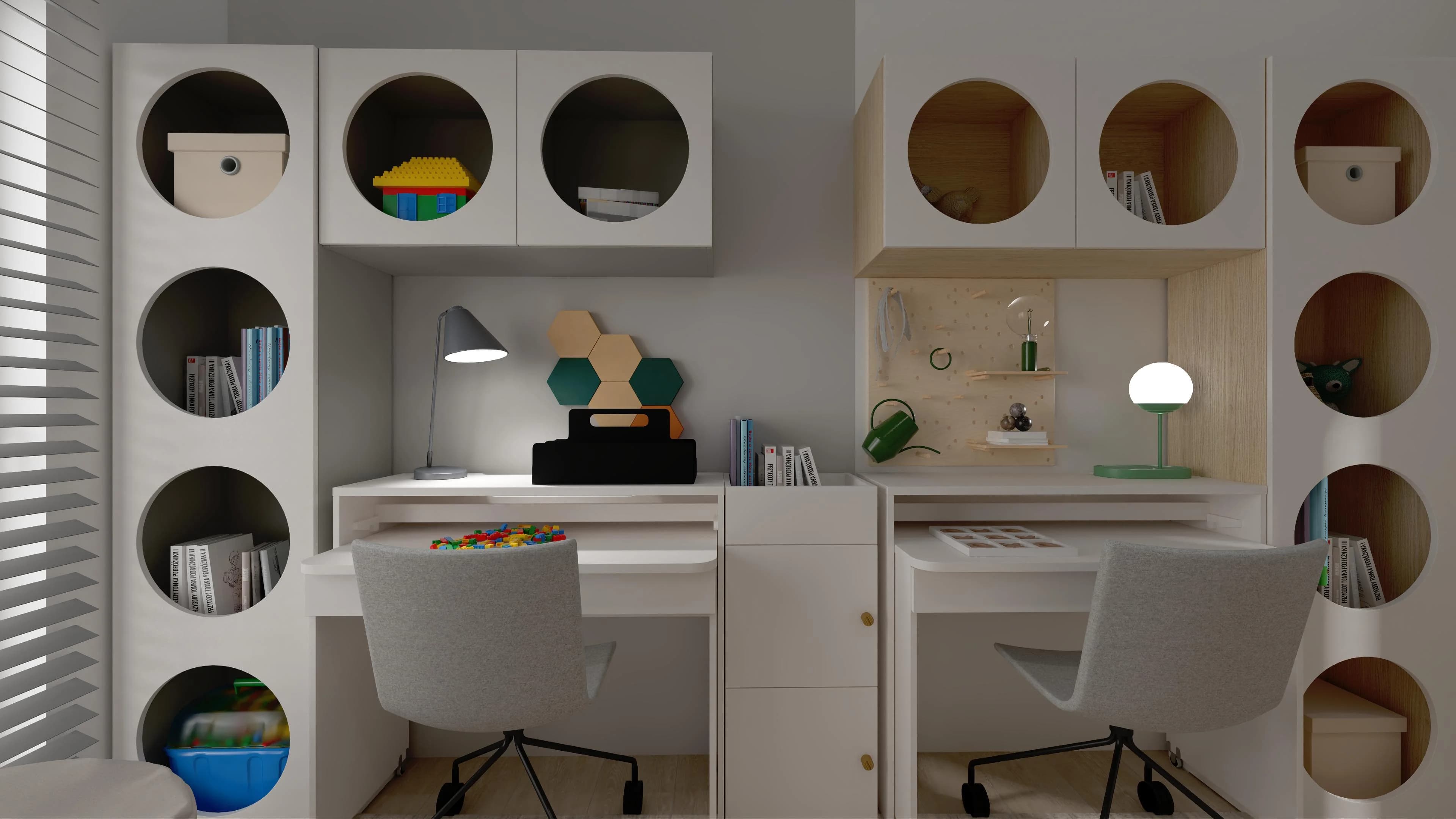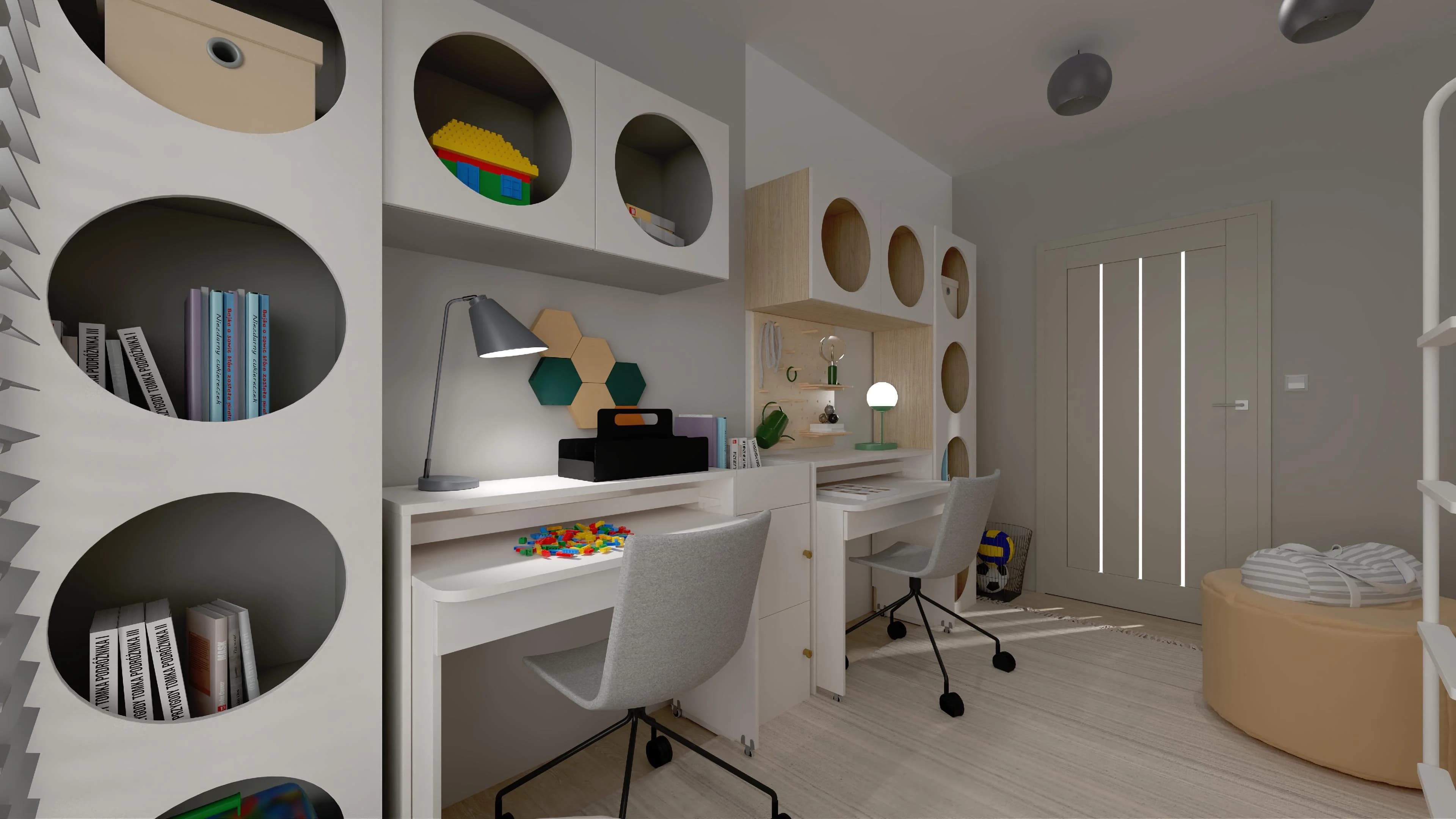 Niewielki pokój dla bliźniaków może rosnąć razem z nimi. Dzięki piętrowemu łóżku z drabinką dzieci mogą wygodnie odpoczywać osobno, ale wciąż być razem. Dwa biurka z obrotowymi krzesłami zapewniają komfortowe warunki do nauki. Oryginalne fronty szafek z okrągłymi wycięciami sprawiają, że ważne rzeczy są pod ręką. Organizację ubrań ułatwia duża szafa.