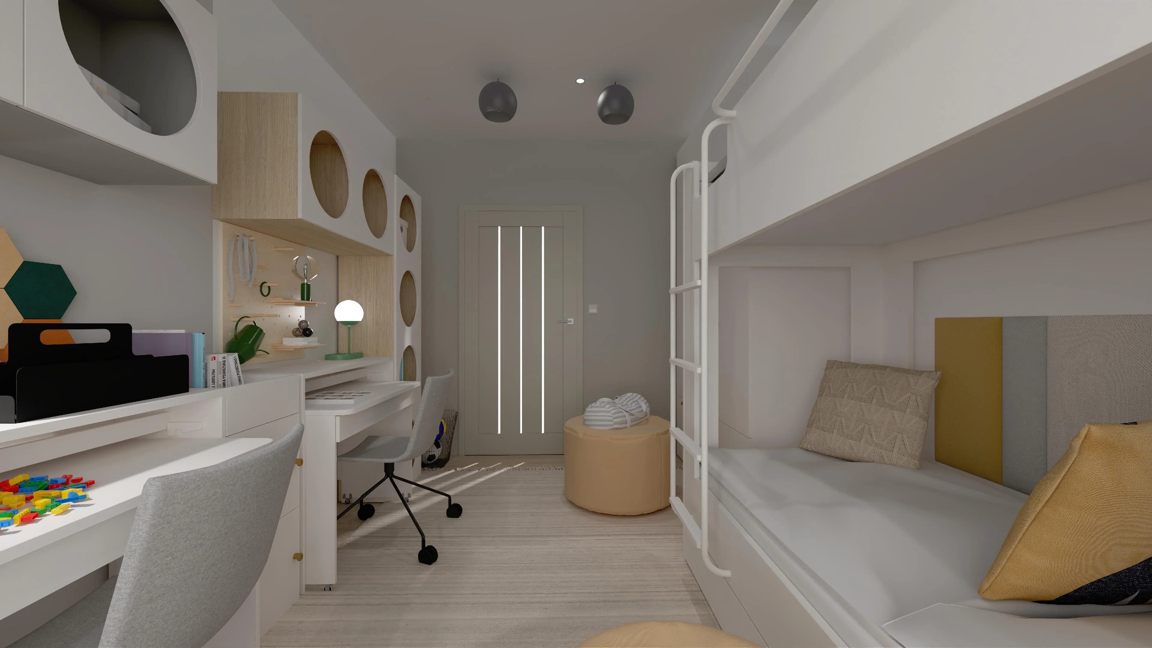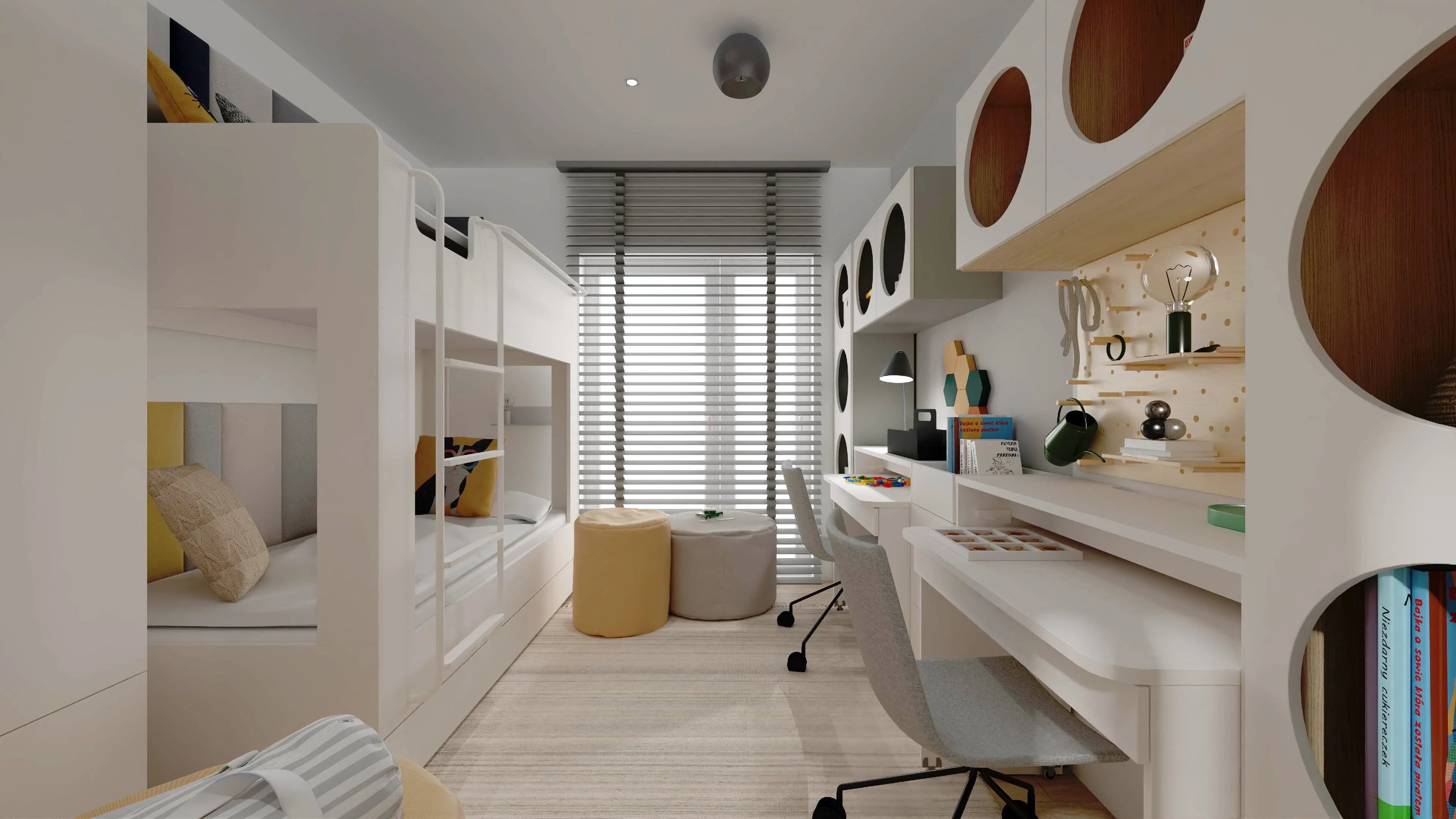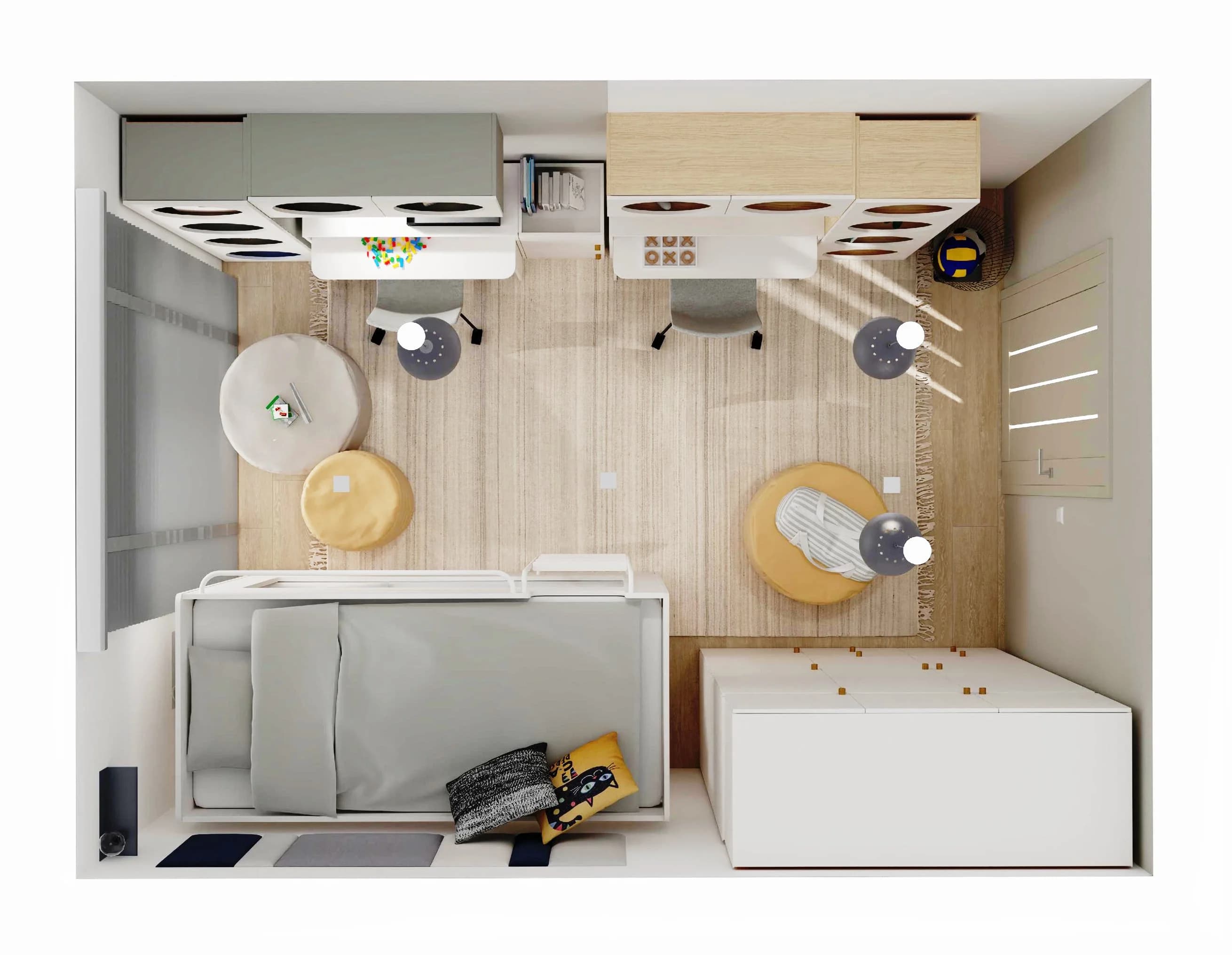 Niewielki pokój dla bliźniaków może rosnąć razem z nimi. Dzięki piętrowemu łóżku z drabinką dzieci mogą wygodnie odpoczywać osobno, ale wciąż być razem. Dwa biurka z obrotowymi krzesłami zapewniają komfortowe warunki do nauki. Oryginalne fronty szafek z okrągłymi wycięciami sprawiają, że ważne rzeczy są pod ręką. Organizację ubrań ułatwia duża szafa.