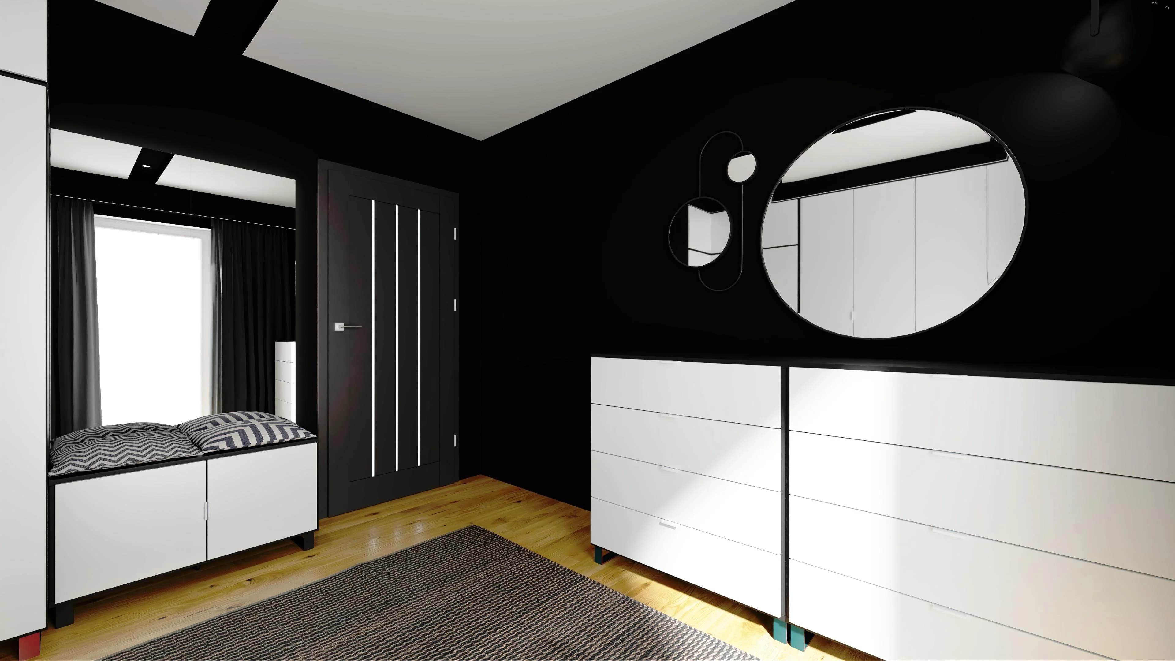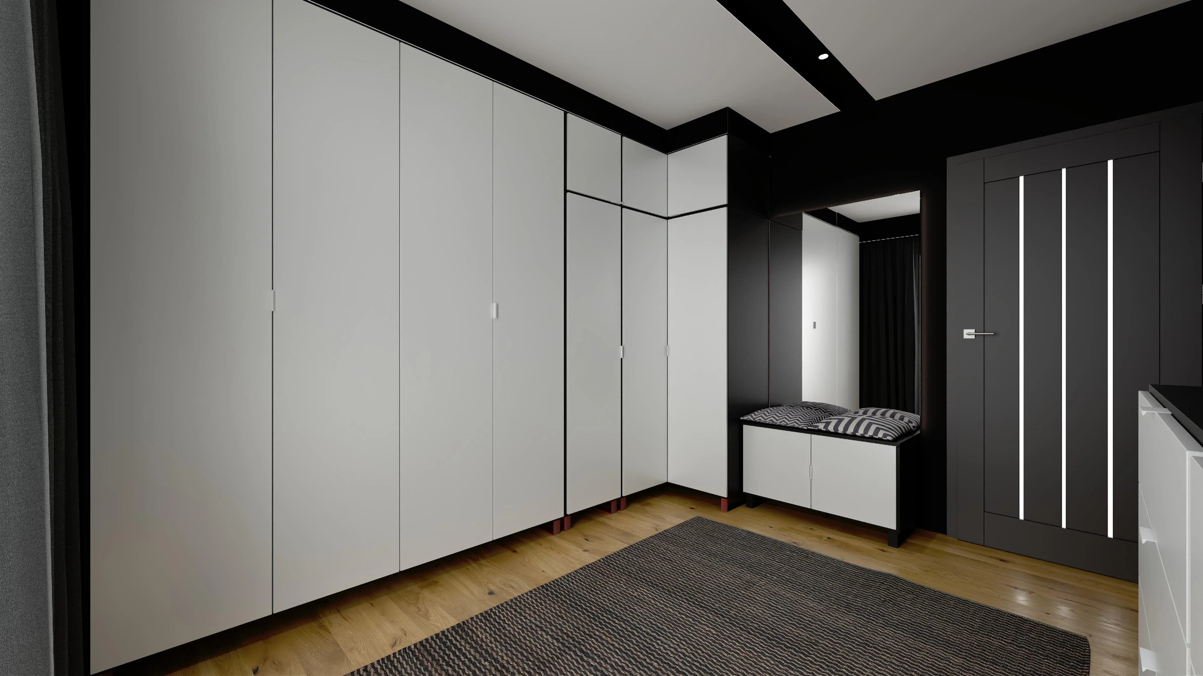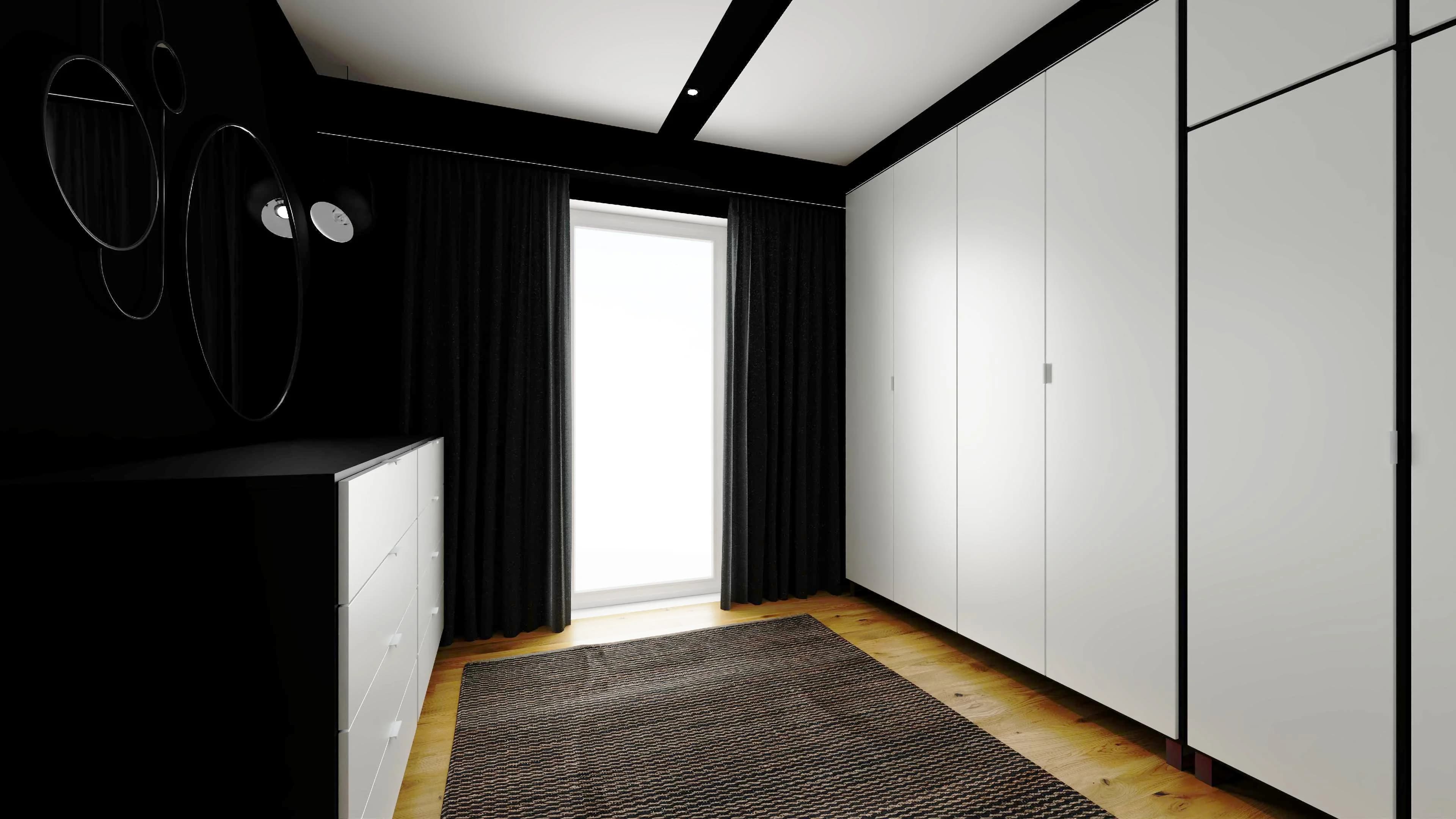 This wardrobe is a kingdom of order. Thanks to the tall, packable wardrobes, you can organise all your clothes and have your favourite accessories within easy reach. The organisation of accessories is facilitated by dressers with drawers and a shoe cabinet. Two large mirrors provide a comfortable view and optically enlarge the interior. The space is warmed by a wooden floor with a large carpet.