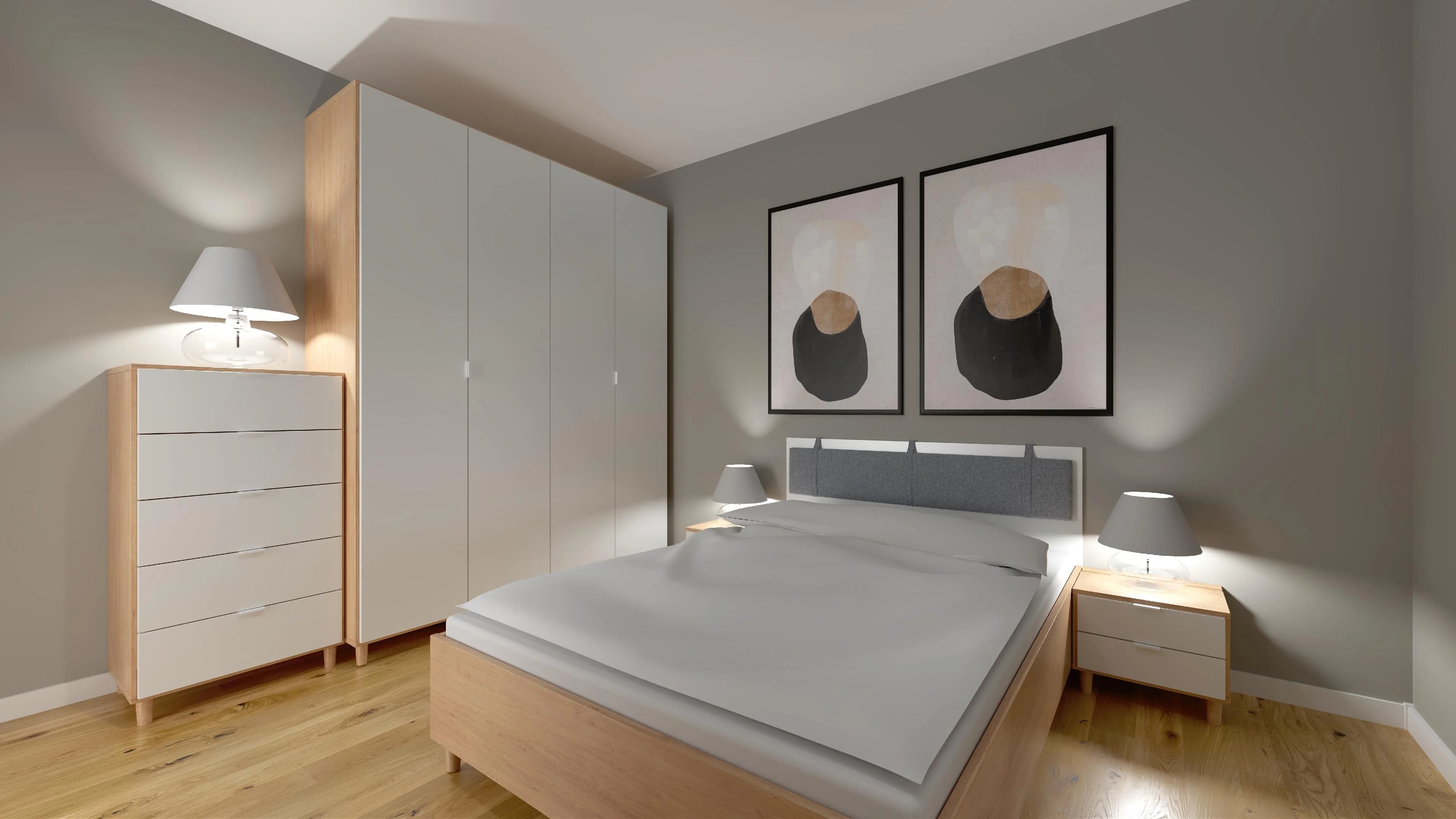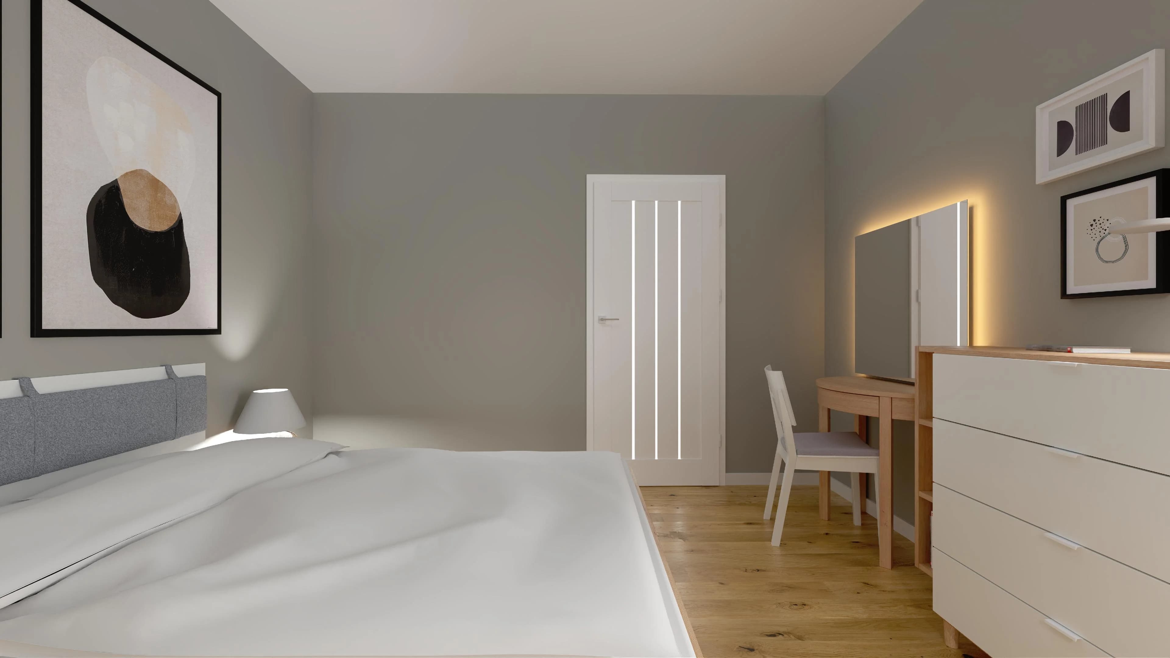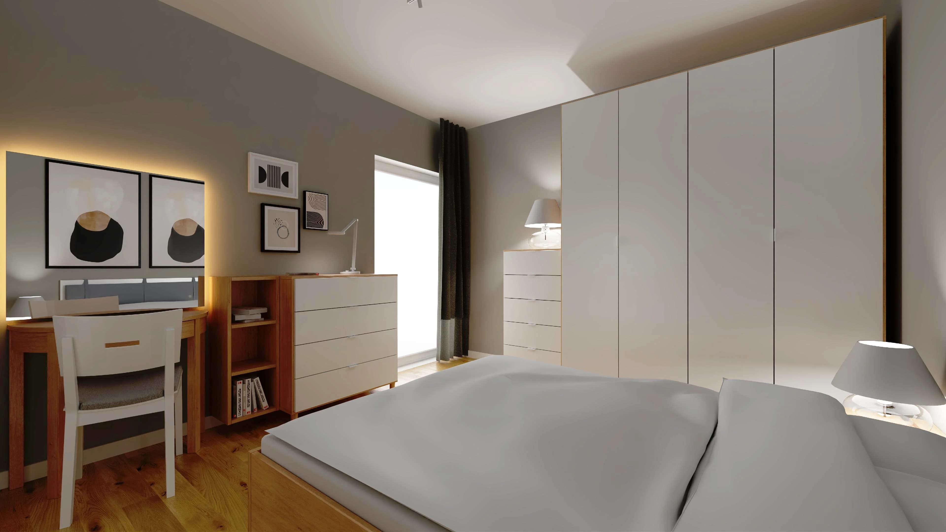 Ta nowoczesna sypialnia jest jasna i bardzo przytulna. Ustawione w centrum łóżku wyznacza strefę odpoczynku dla dwojga. Dzięki czterodrzwiowej szafie można uporządkować ubrania i zadbać o porządek. Niewielka toaletka w razie potrzeby może zamienić się w domowe biuro. Sprzyjające relaksowi jasne barwy harmonijnie korespondują z podłogą w kolorach drewna.