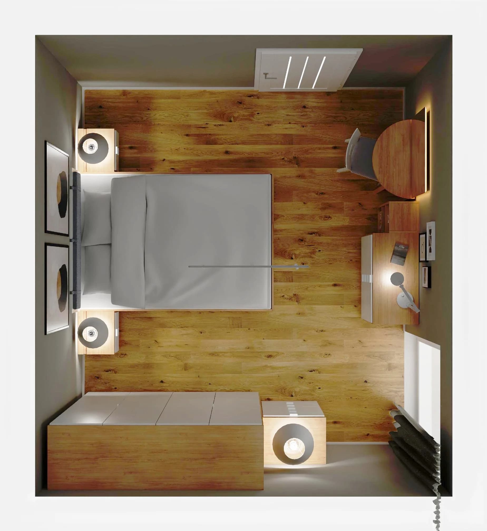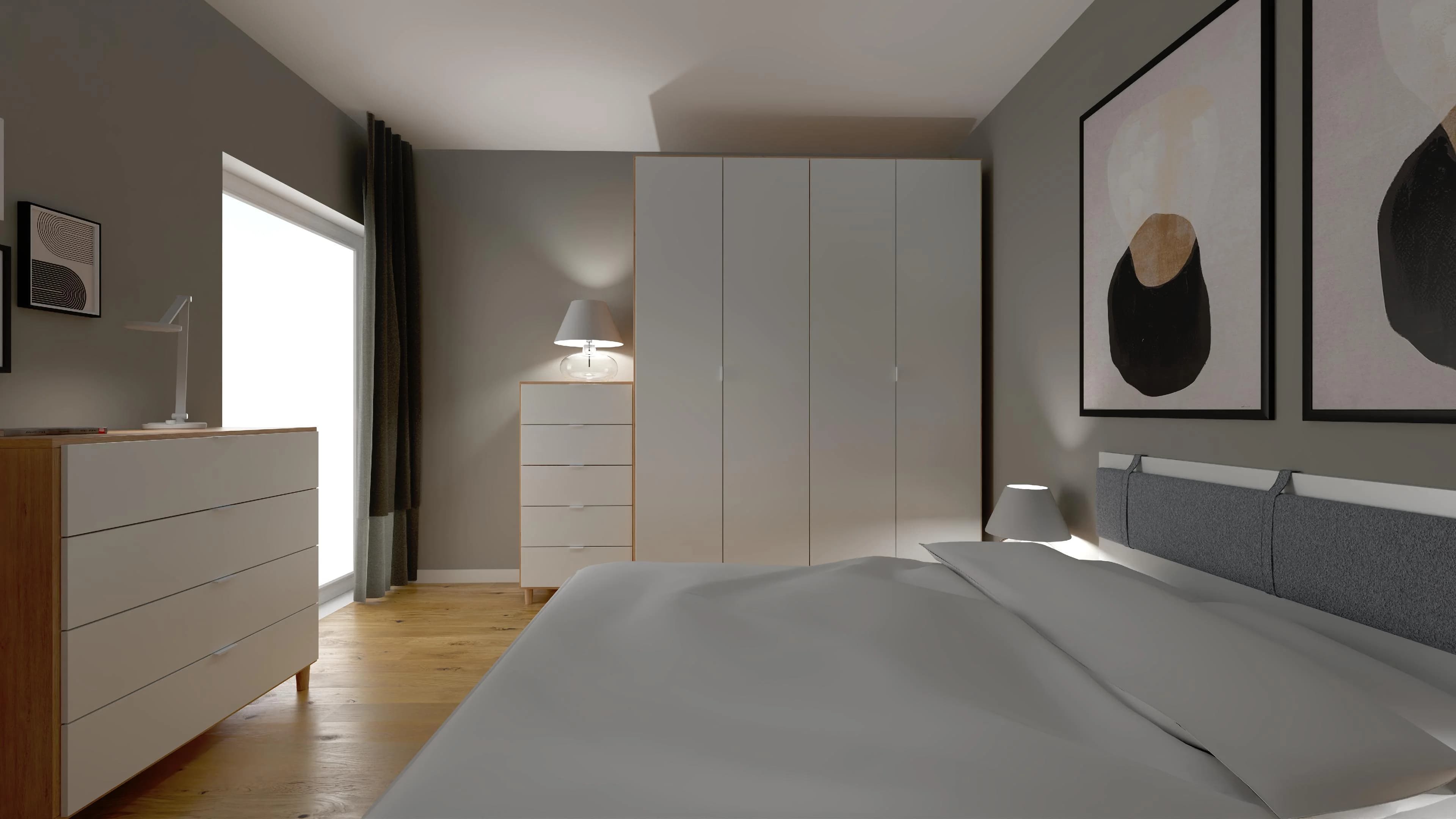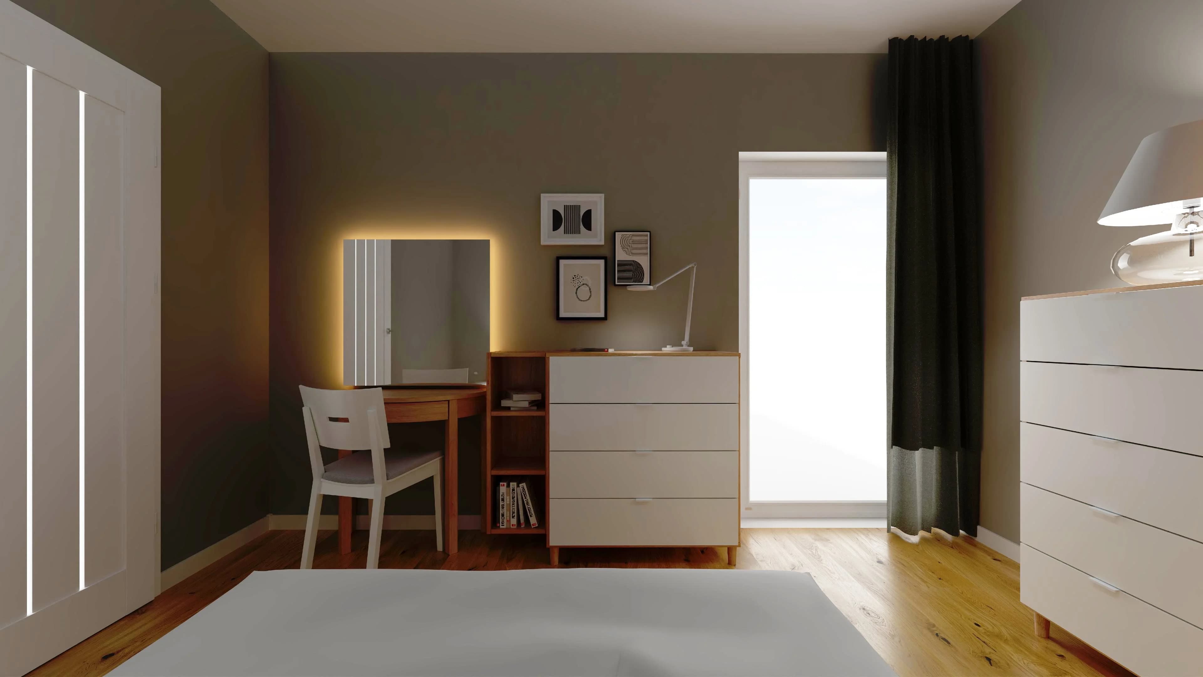 Ta nowoczesna sypialnia jest jasna i bardzo przytulna. Ustawione w centrum łóżku wyznacza strefę odpoczynku dla dwojga. Dzięki czterodrzwiowej szafie można uporządkować ubrania i zadbać o porządek. Niewielka toaletka w razie potrzeby może zamienić się w domowe biuro. Sprzyjające relaksowi jasne barwy harmonijnie korespondują z podłogą w kolorach drewna.