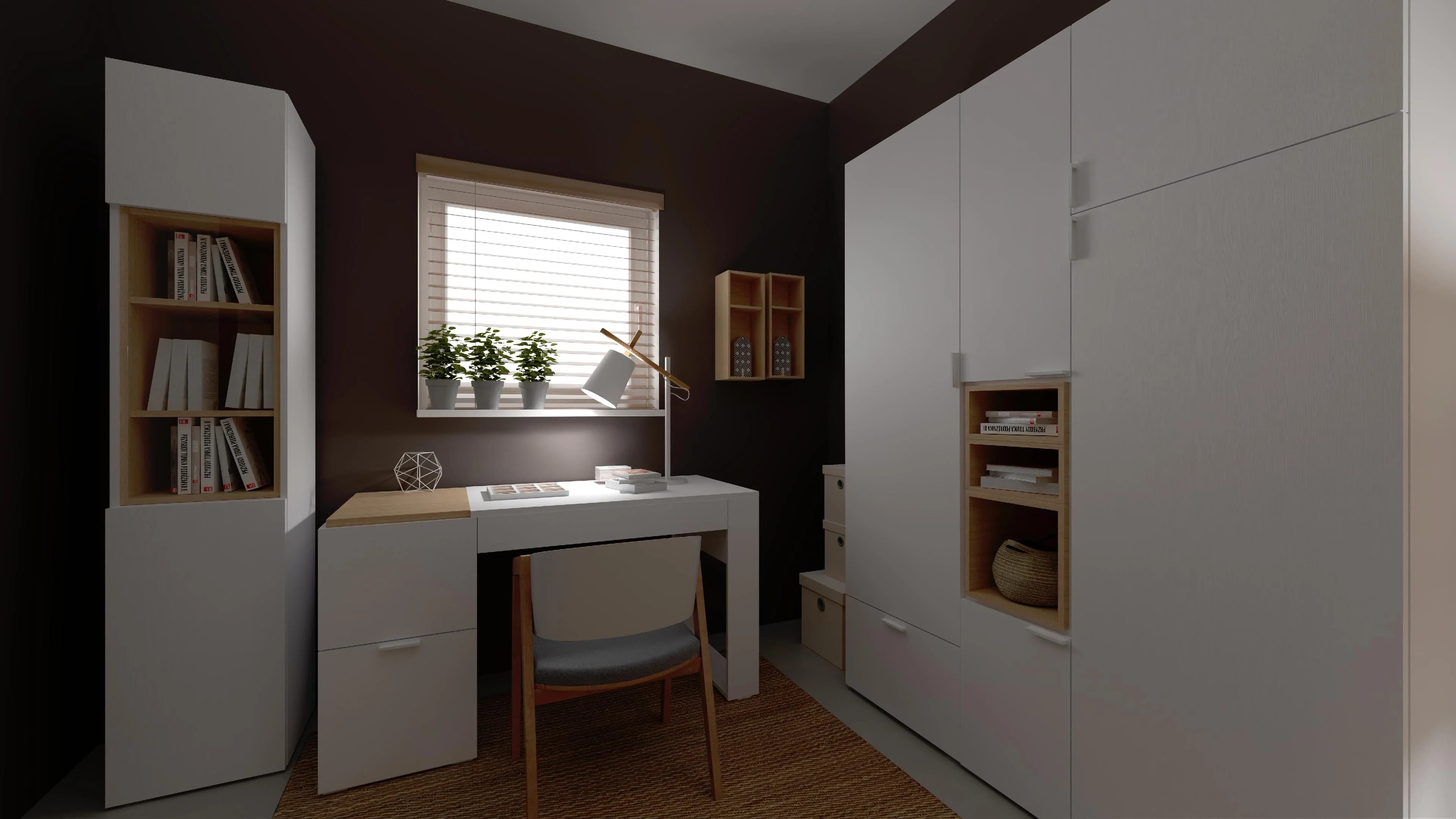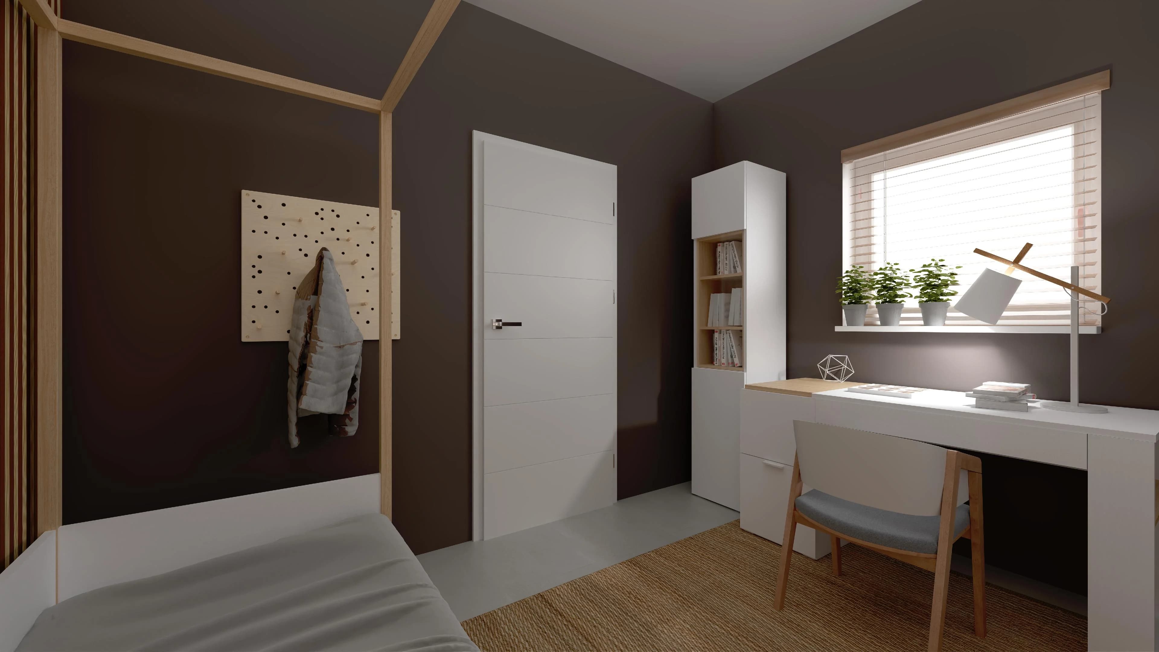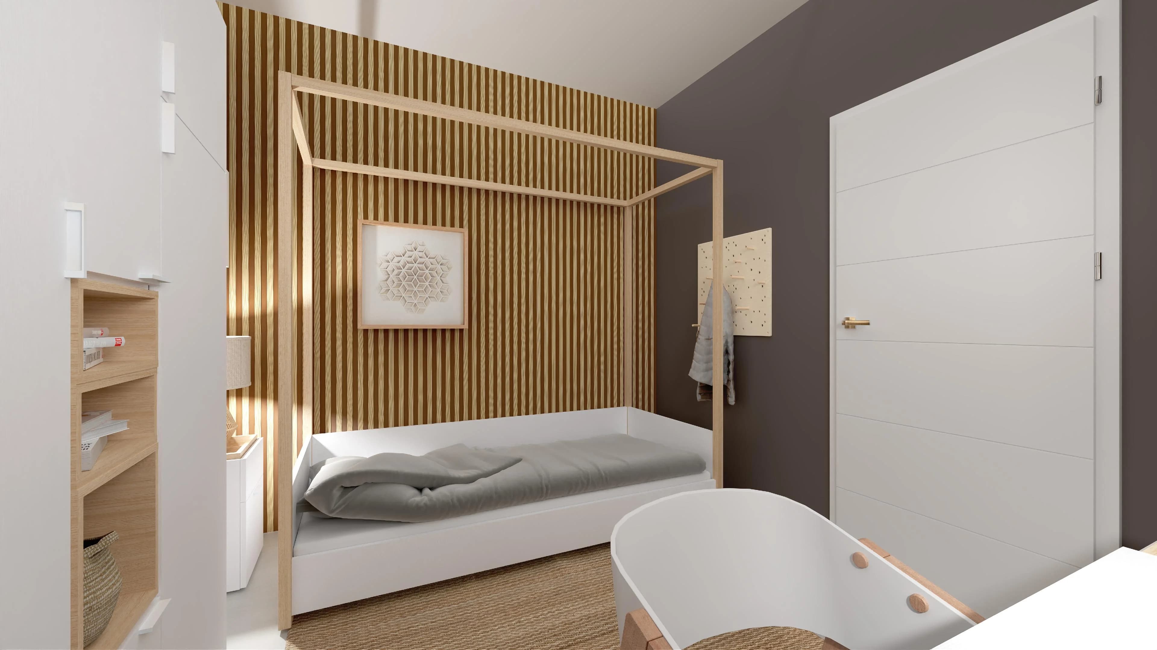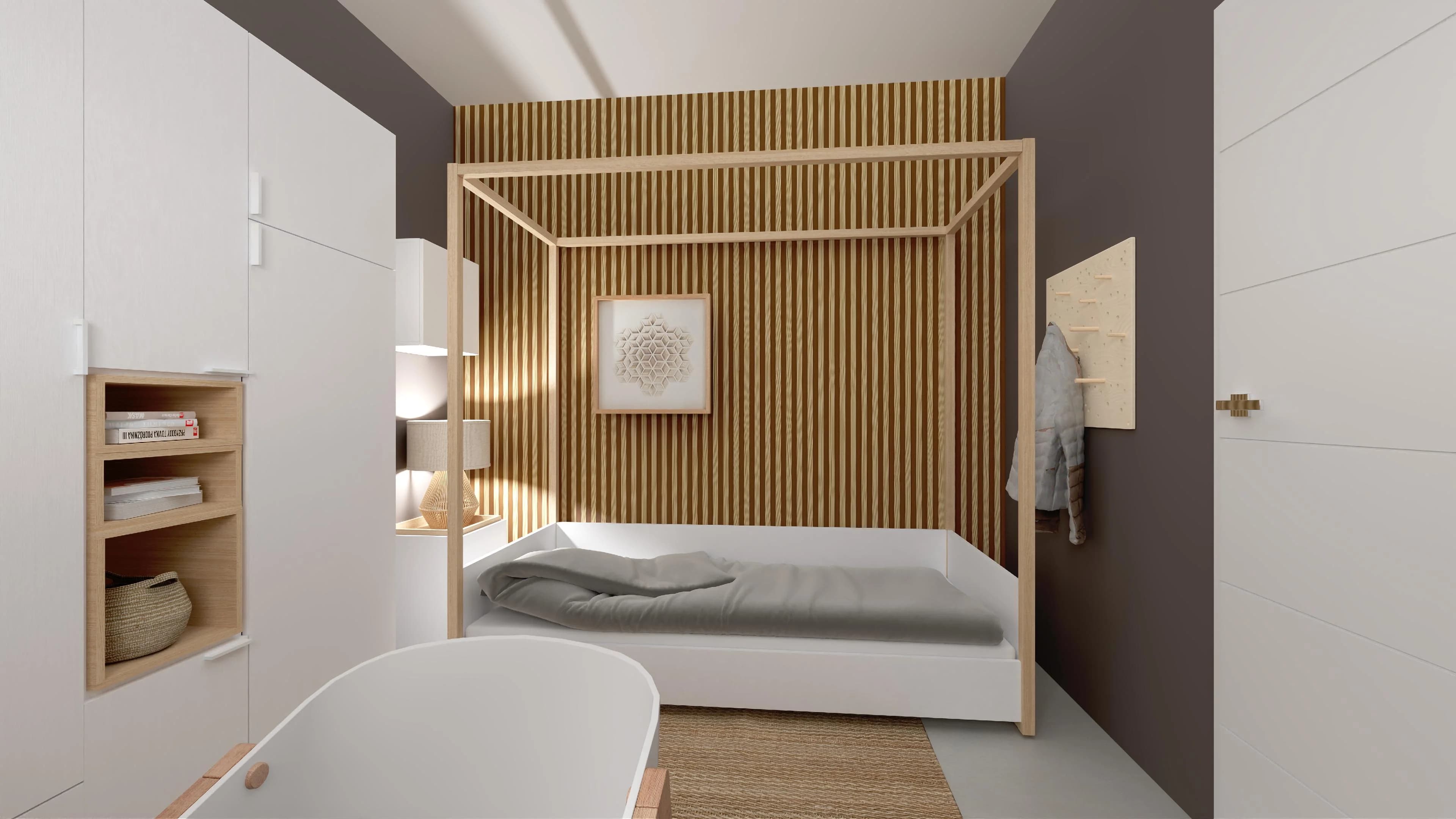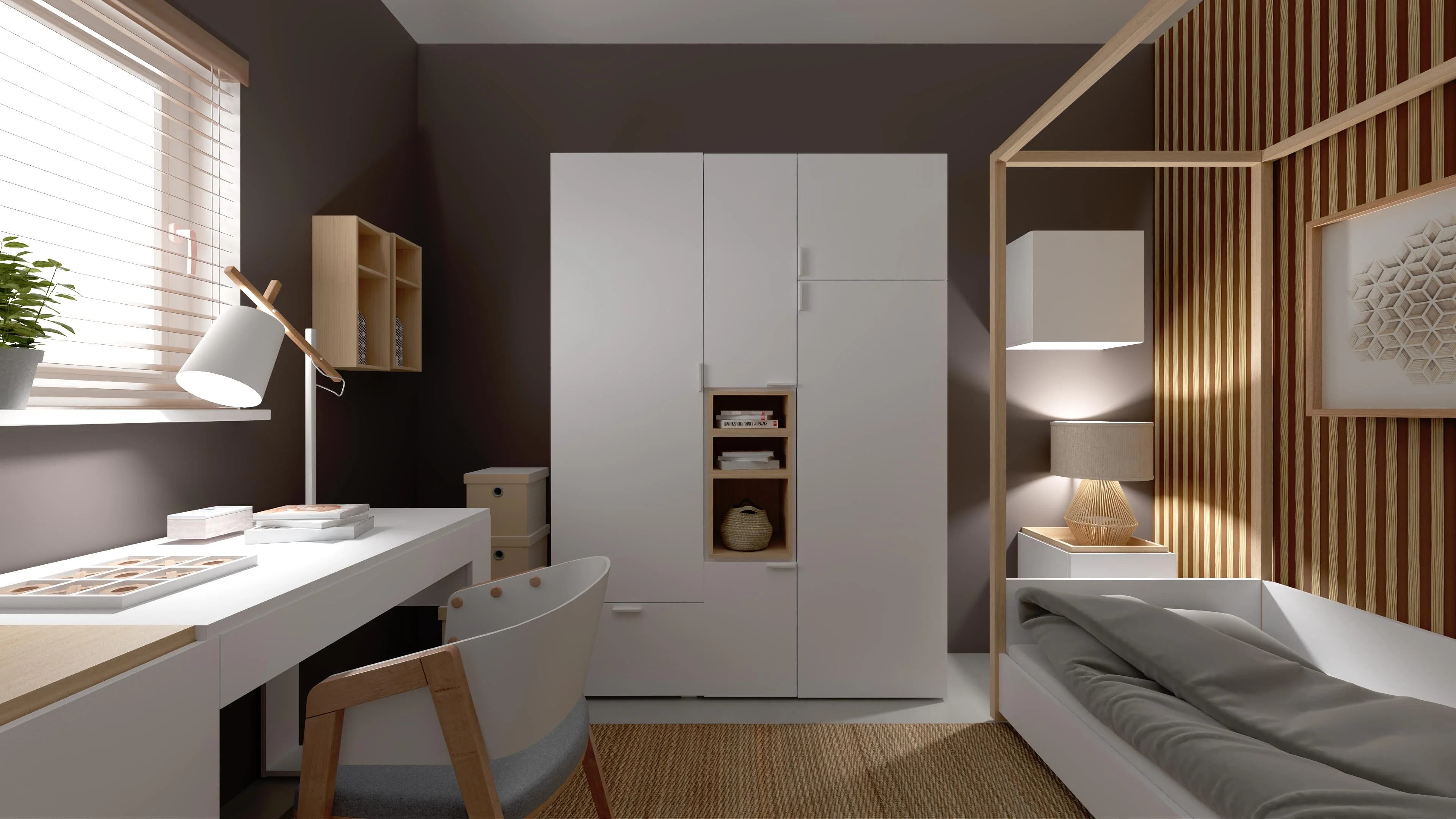 This room, despite its small size, meets all the needs of a teenager. The white furniture offers plenty of storage space. The bed equipped with a canopy allows you to rest comfortably, and the desk placed by the window allows you to prepare for lessons. A wall of wooden slats makes the interior appear taller. Together with the carpet, it creates a cosy atmosphere.