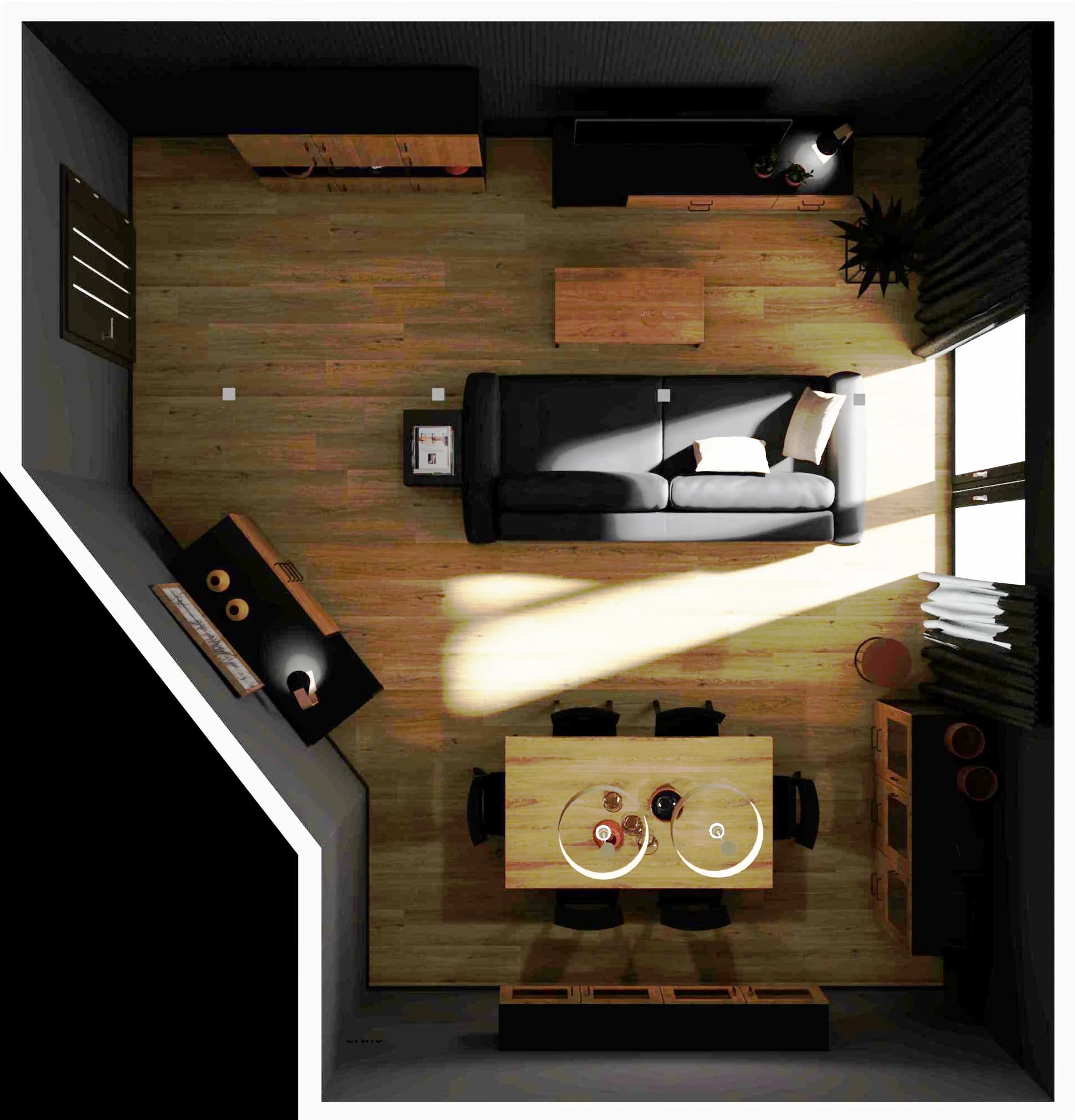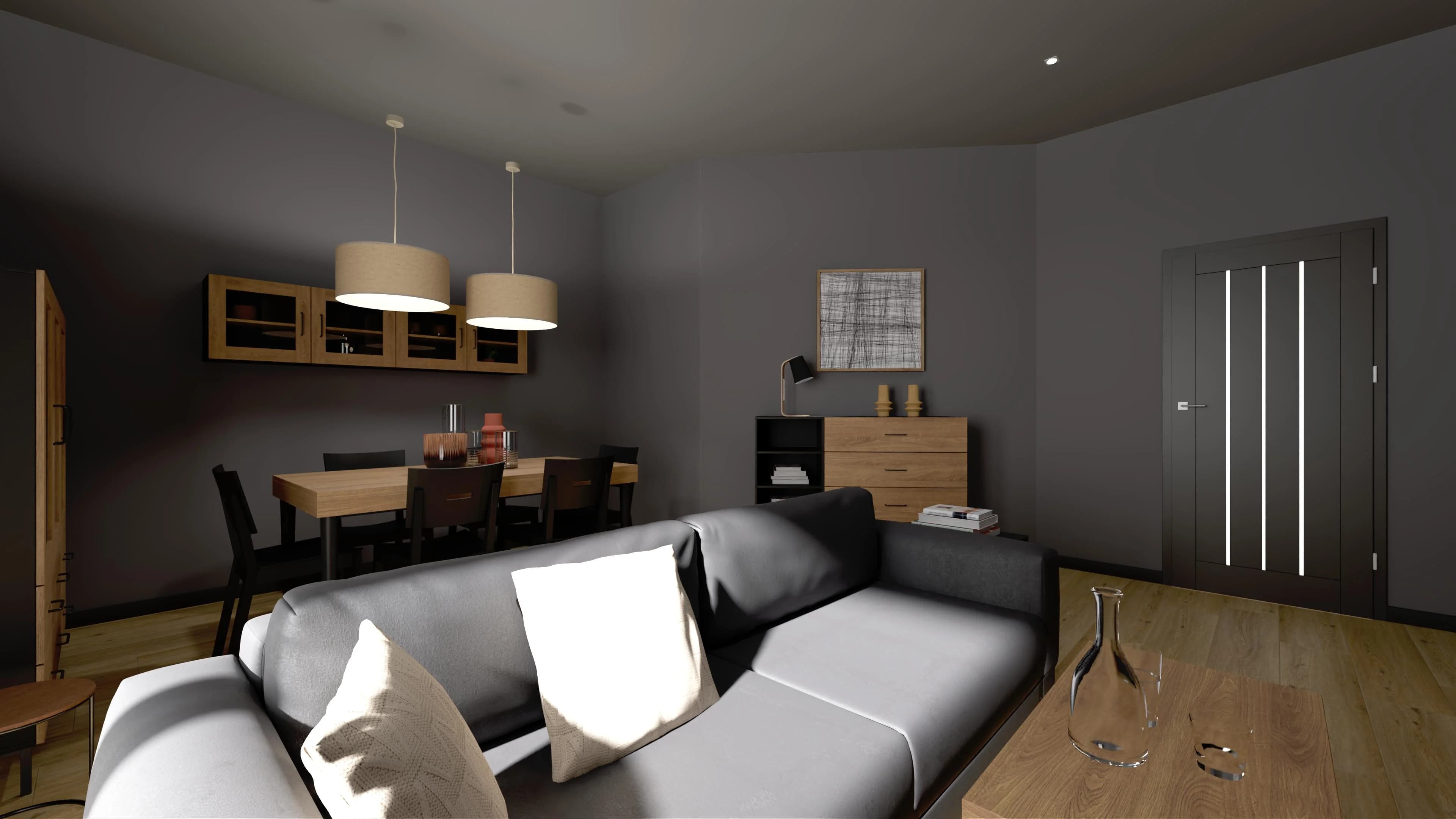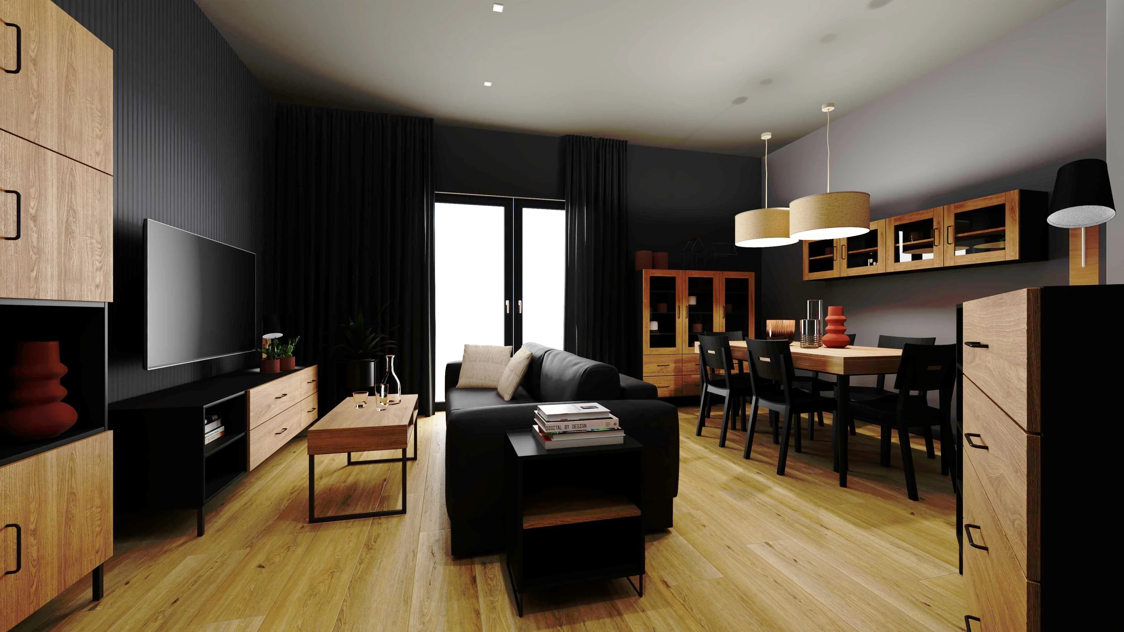 The multifunctional interior is decorated in wood and graphite colours. There is room for a timeless table with a set of beech chairs and a comfortable sofa with a TV wall. The diagonal wall, problematic in the arrangement, has been functionally used. It serves as a background for a large chest of drawers and graphics, which gives the living room expression. The space is illuminated by a large window.