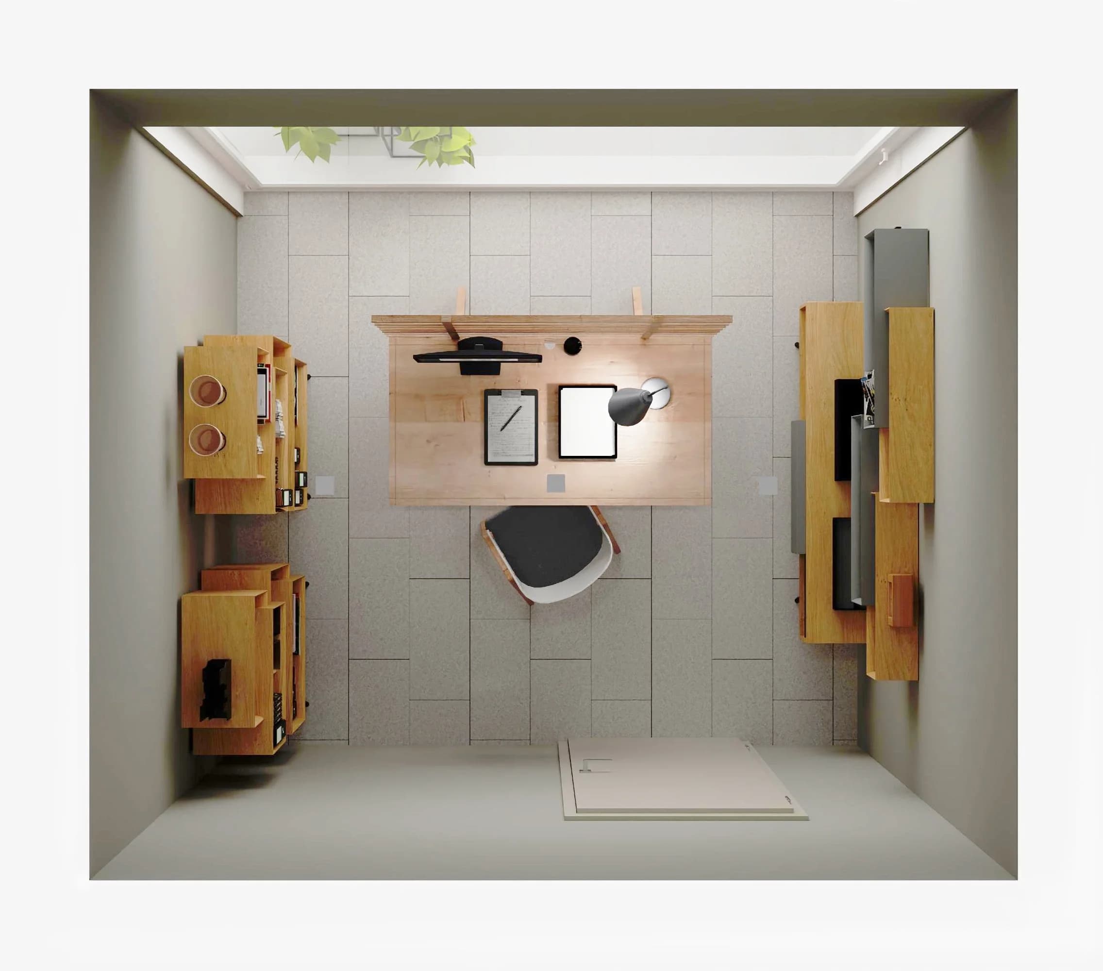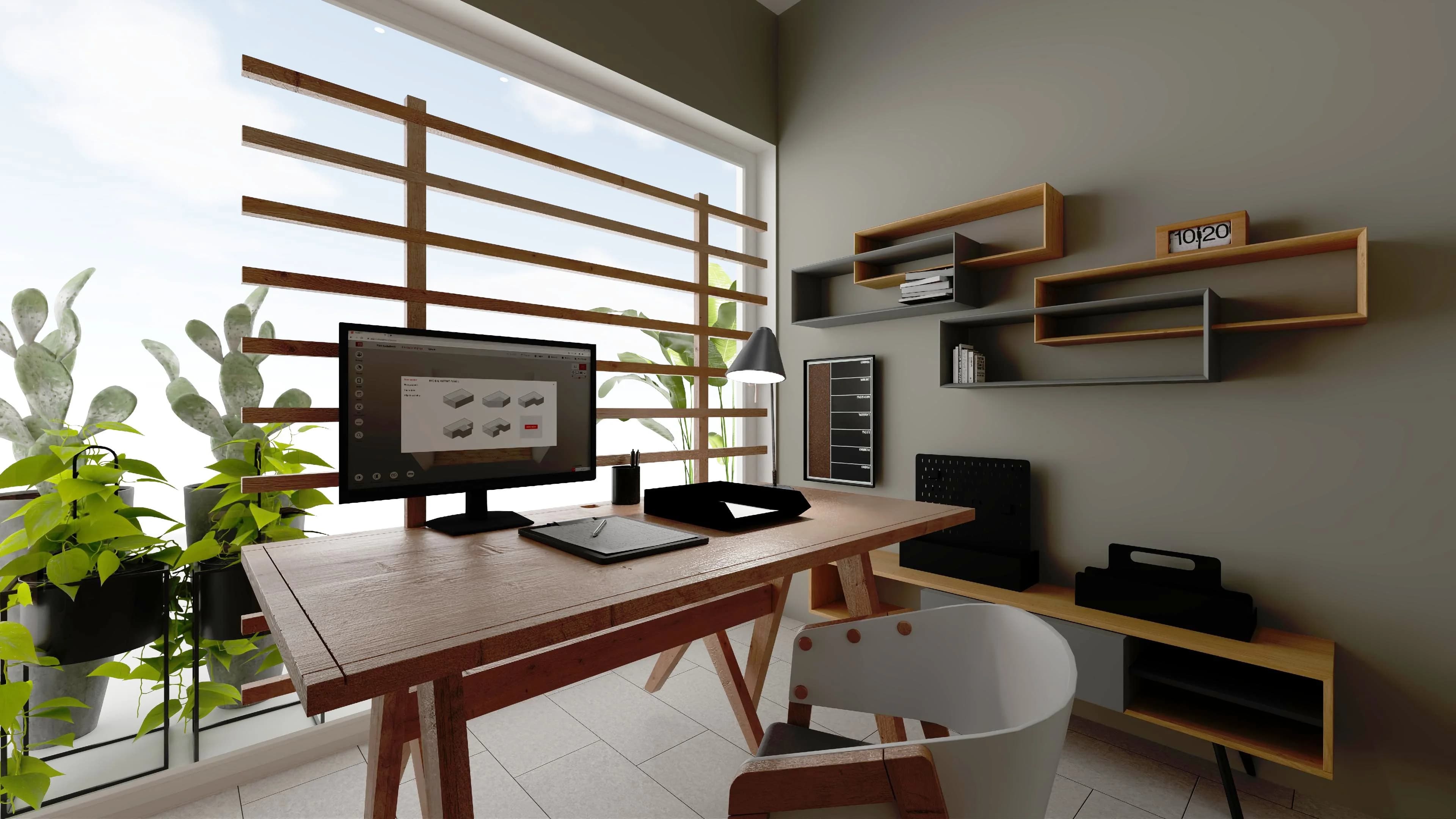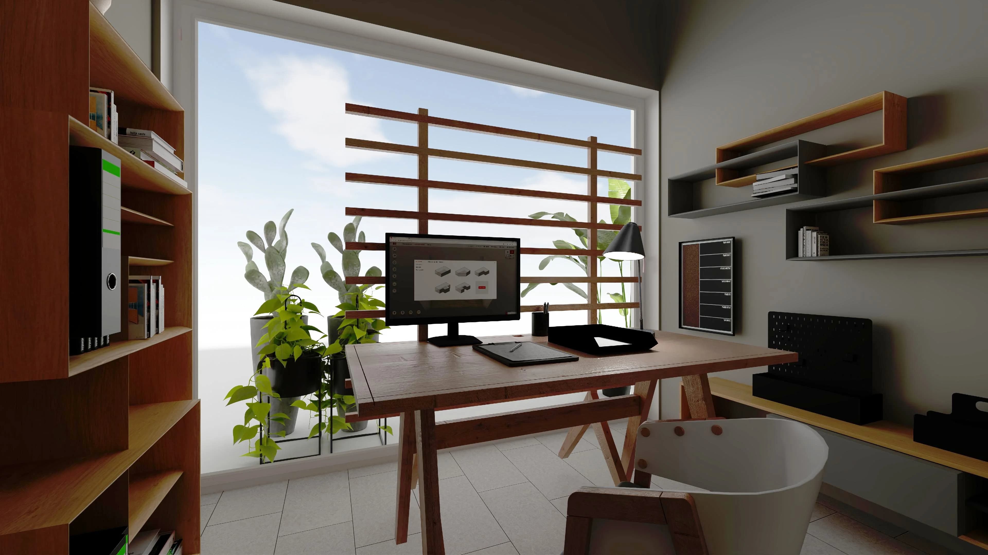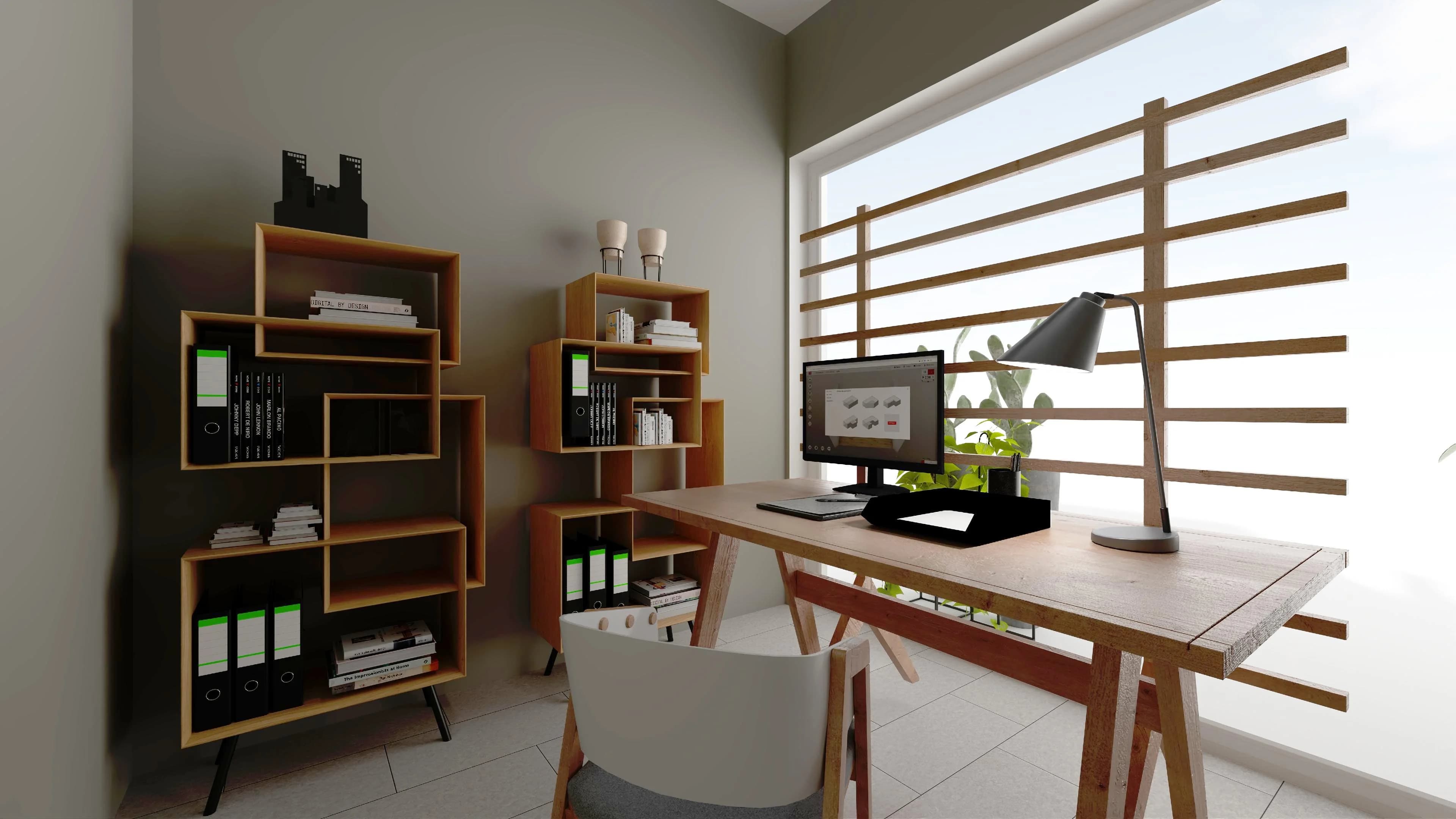 Kwadratowe biuro z dużym oknem