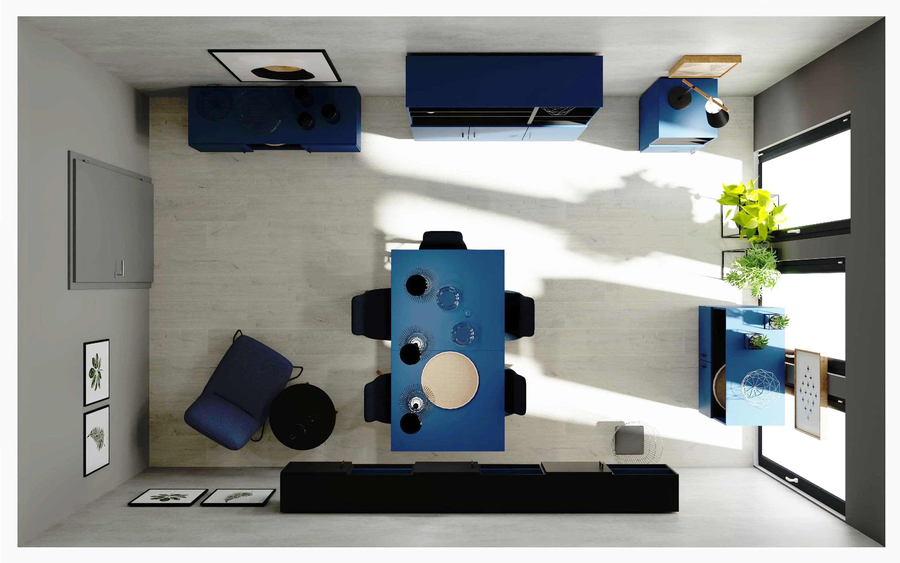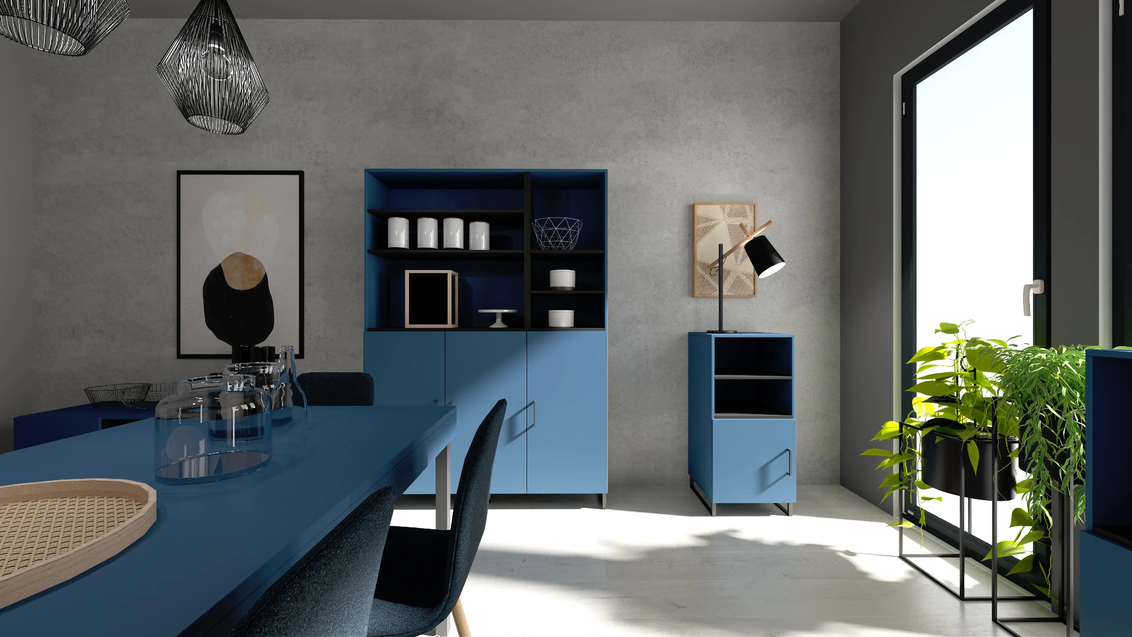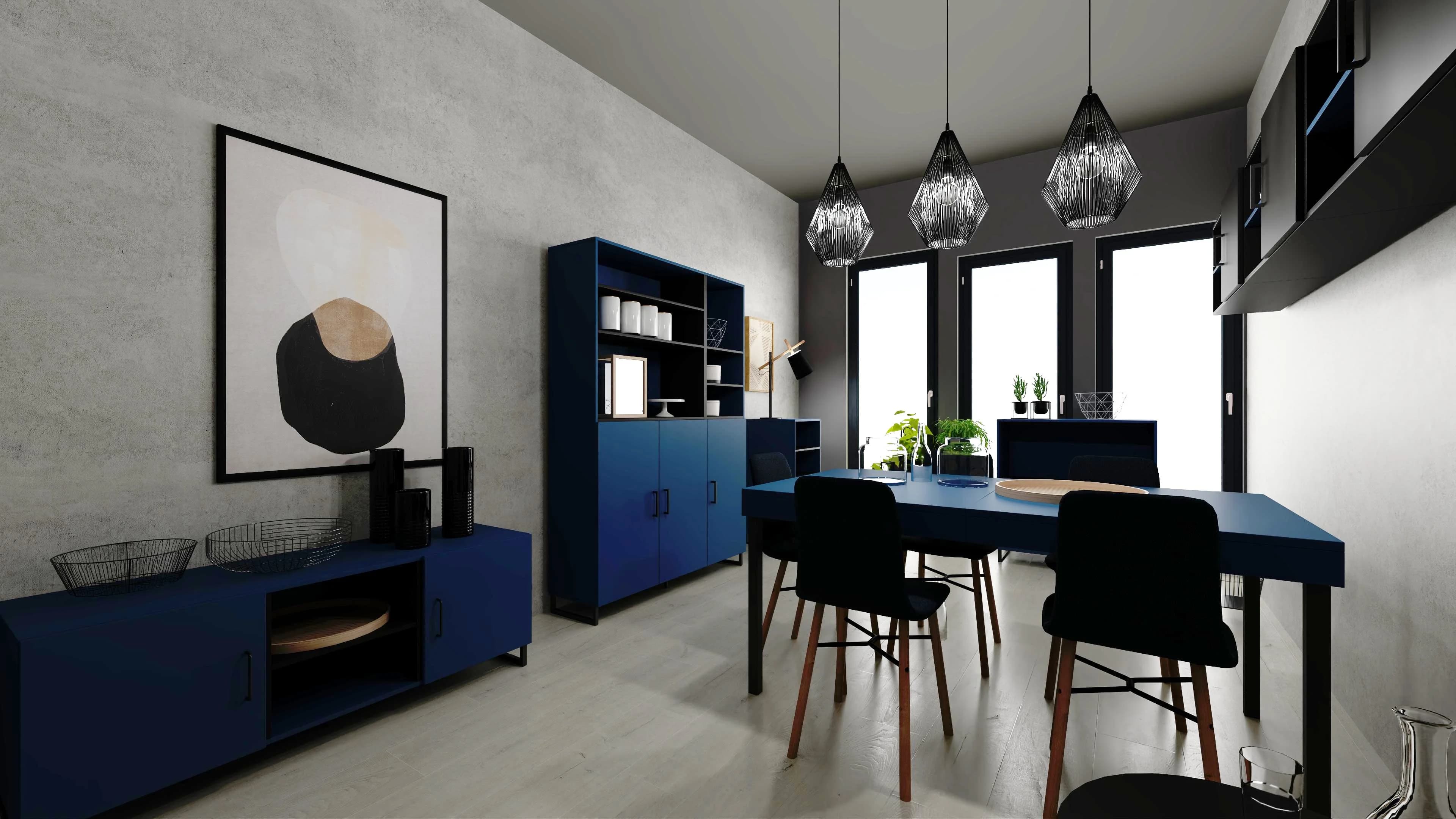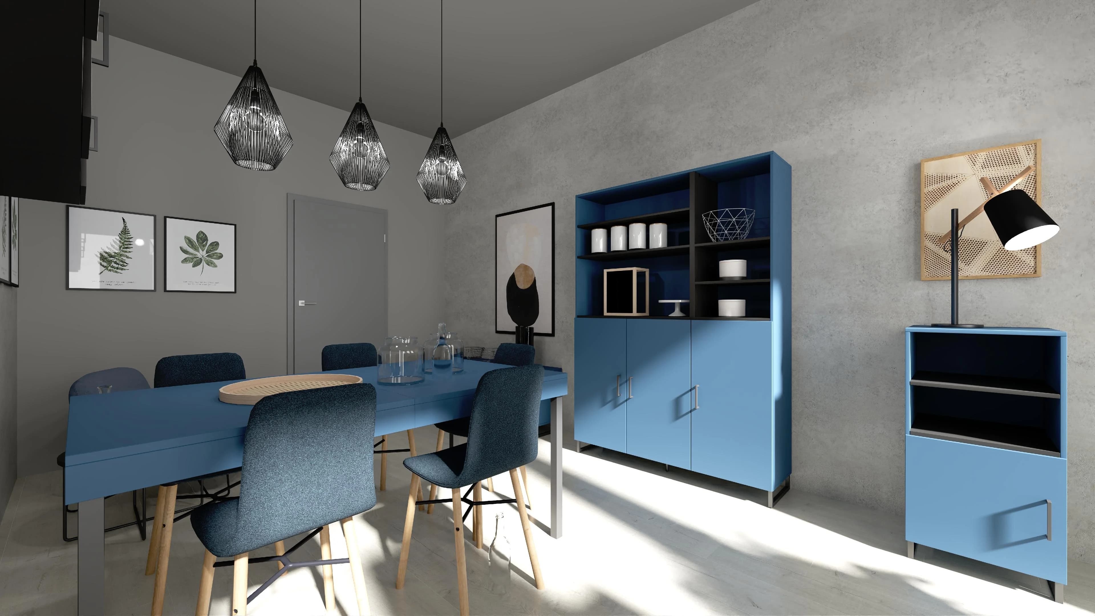 The minimalist design of this dining room means that blue furniture plays a central role in it. The indigo colour is striking and breaks up the grey colour scheme of the walls in an interesting way. The modern style of the space is accentuated by wall graphics and decorations. At the table, you can find a comfortable place to enjoy a meal together and, if necessary, sit down to work for a while.