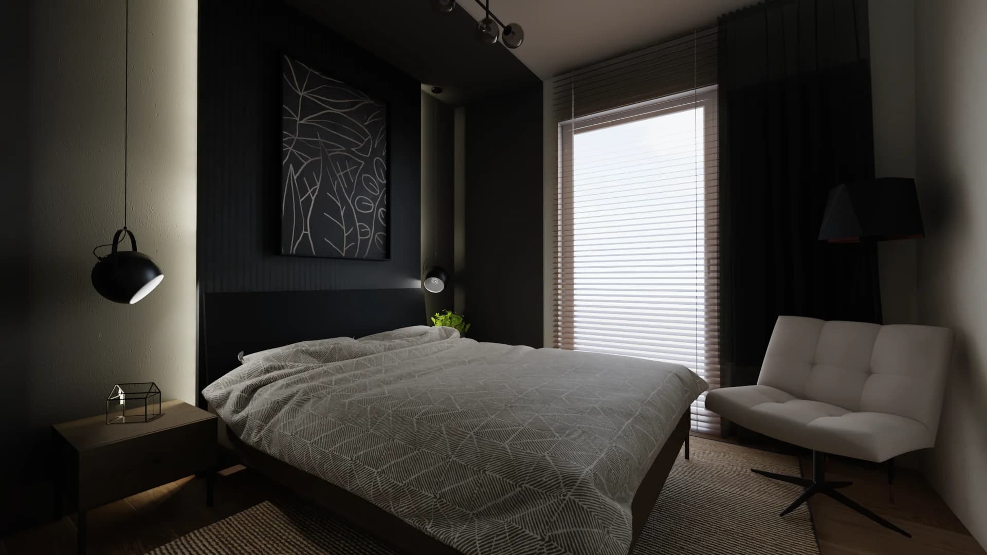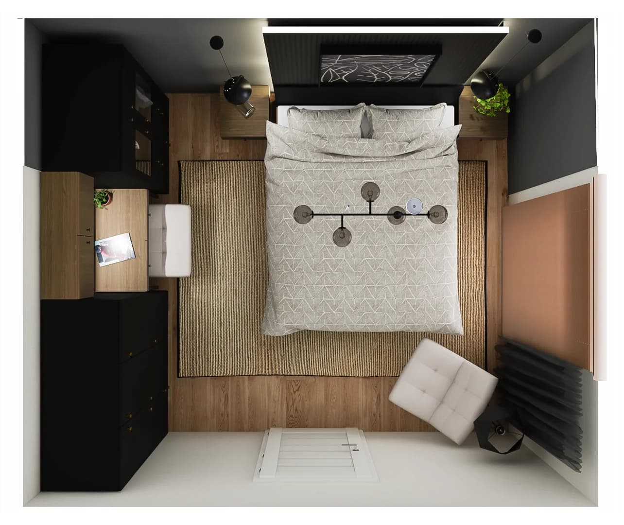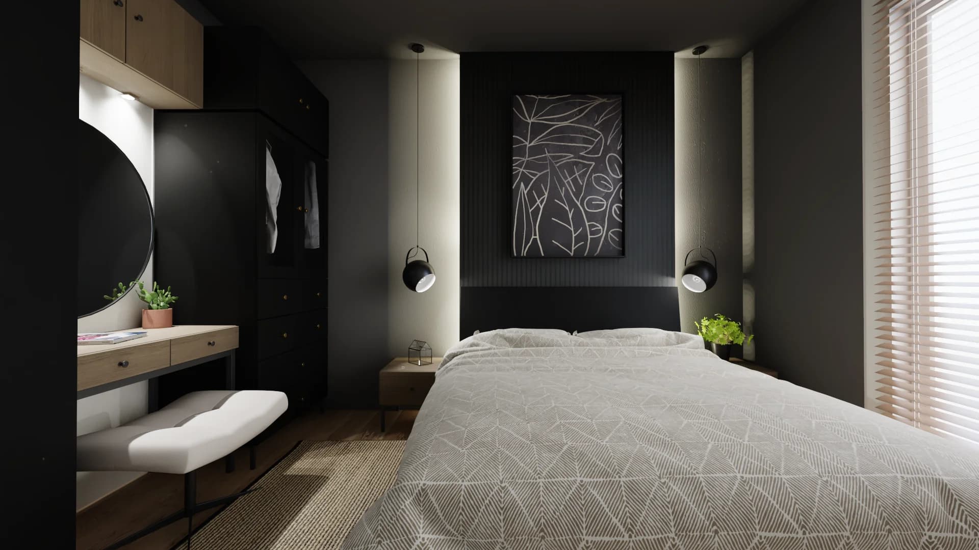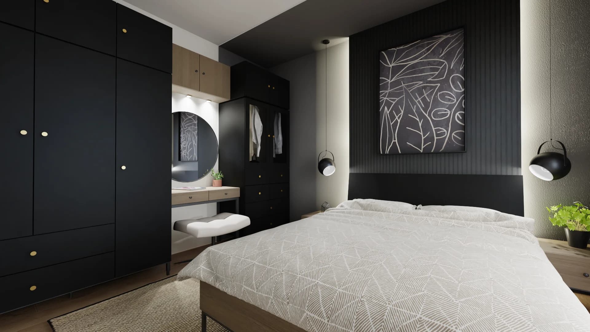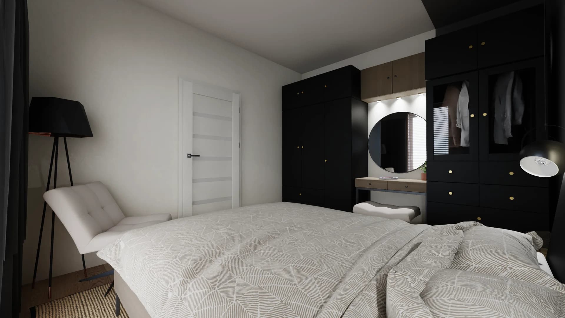 The small bedroom in a monochromatic colour scheme offers a comfortable space to sleep and be together. Two people can sleep comfortably on the wide bed. Tall wardrobes with gold handles replace a separate wardrobe. Thanks to the dressing table, space can be found for evening grooming and, if necessary, turned into a workspace.