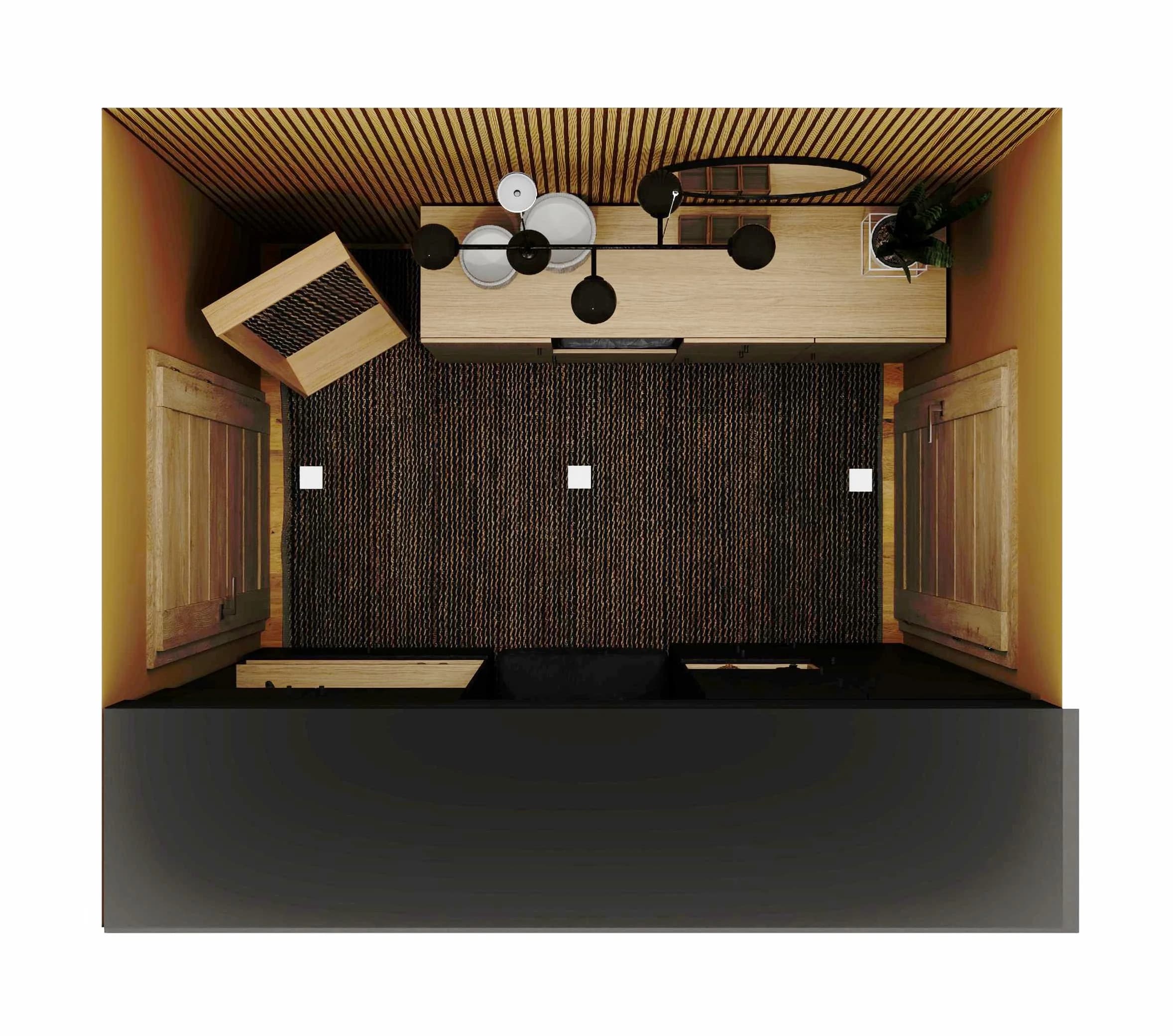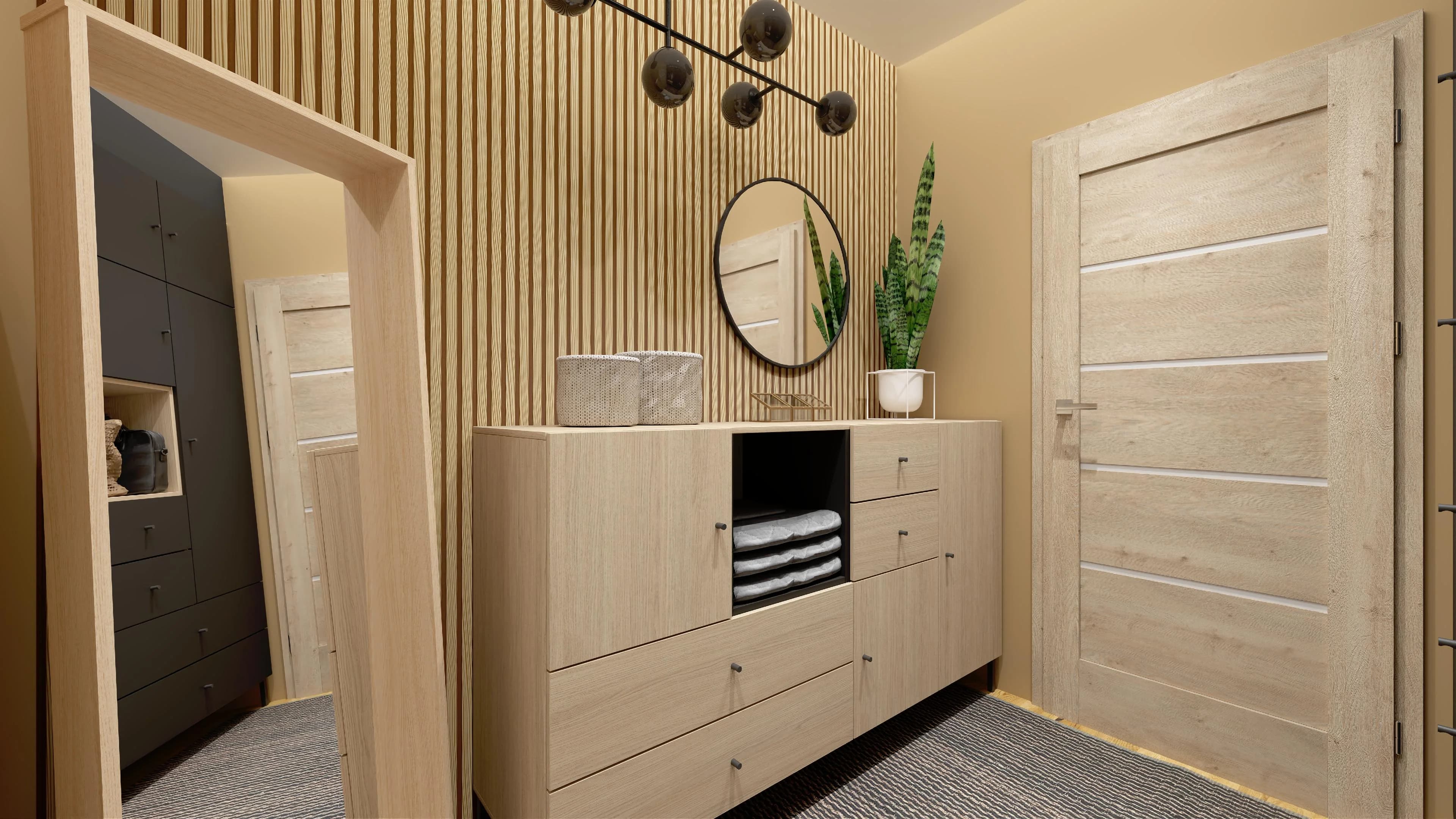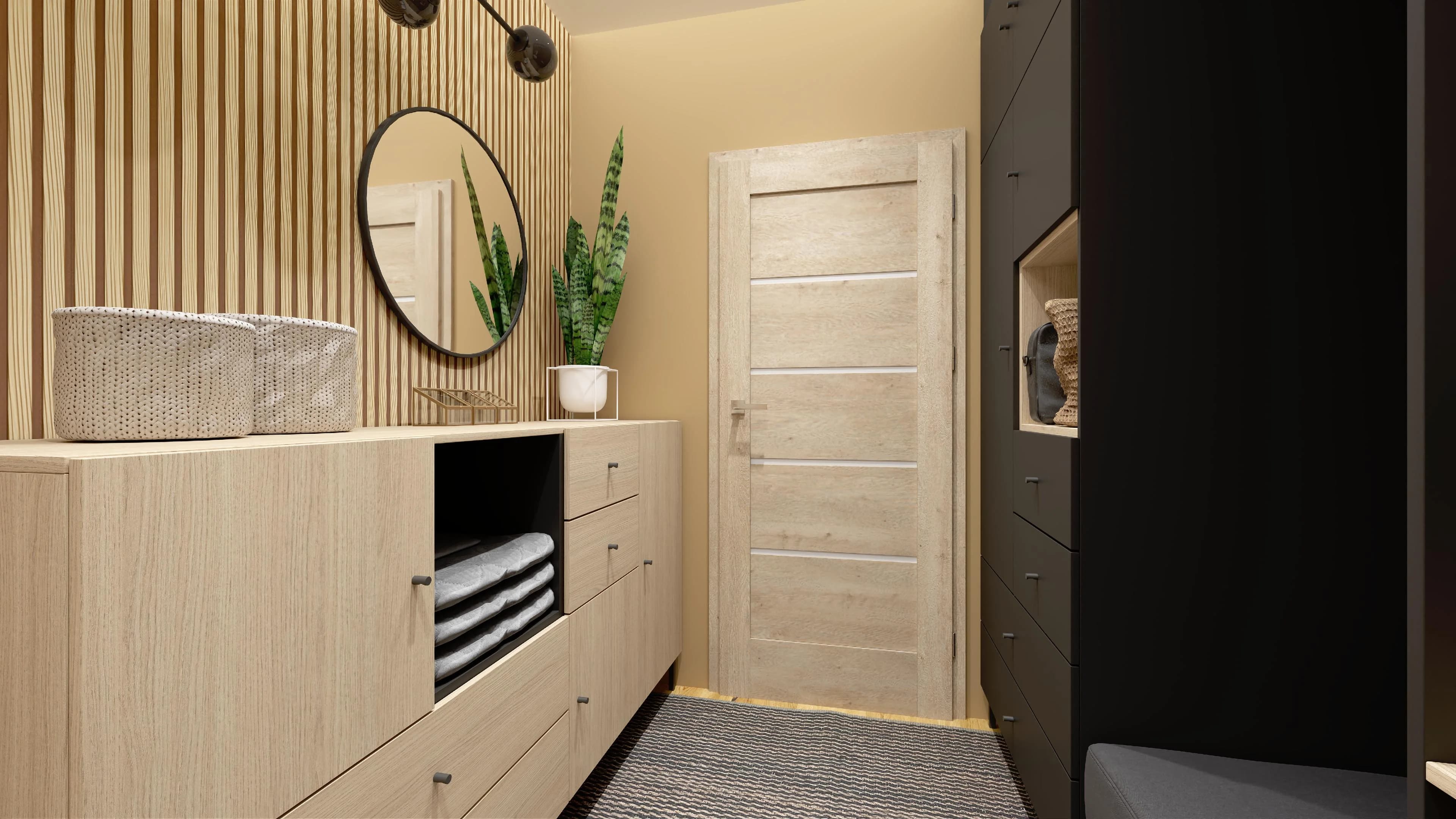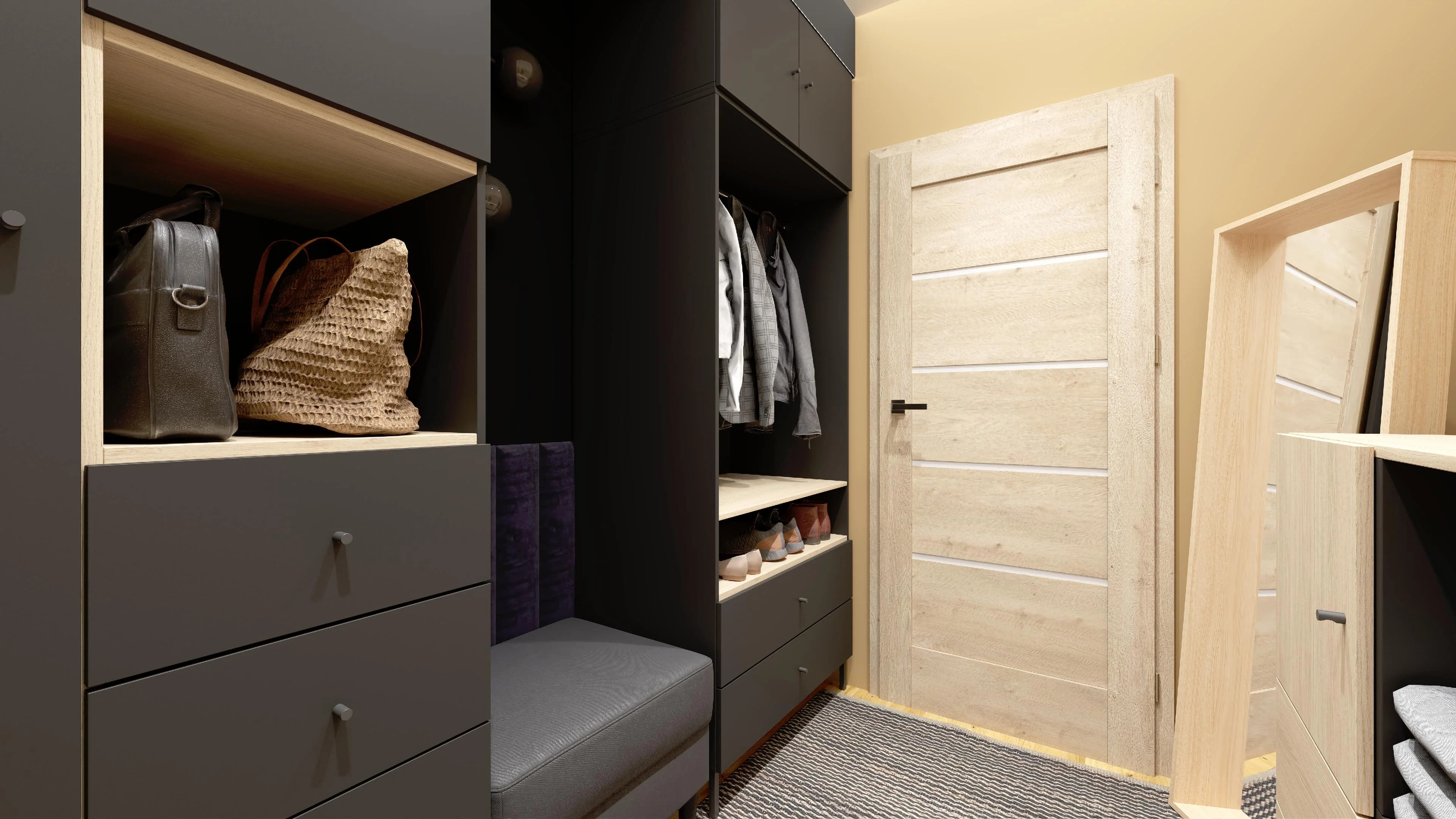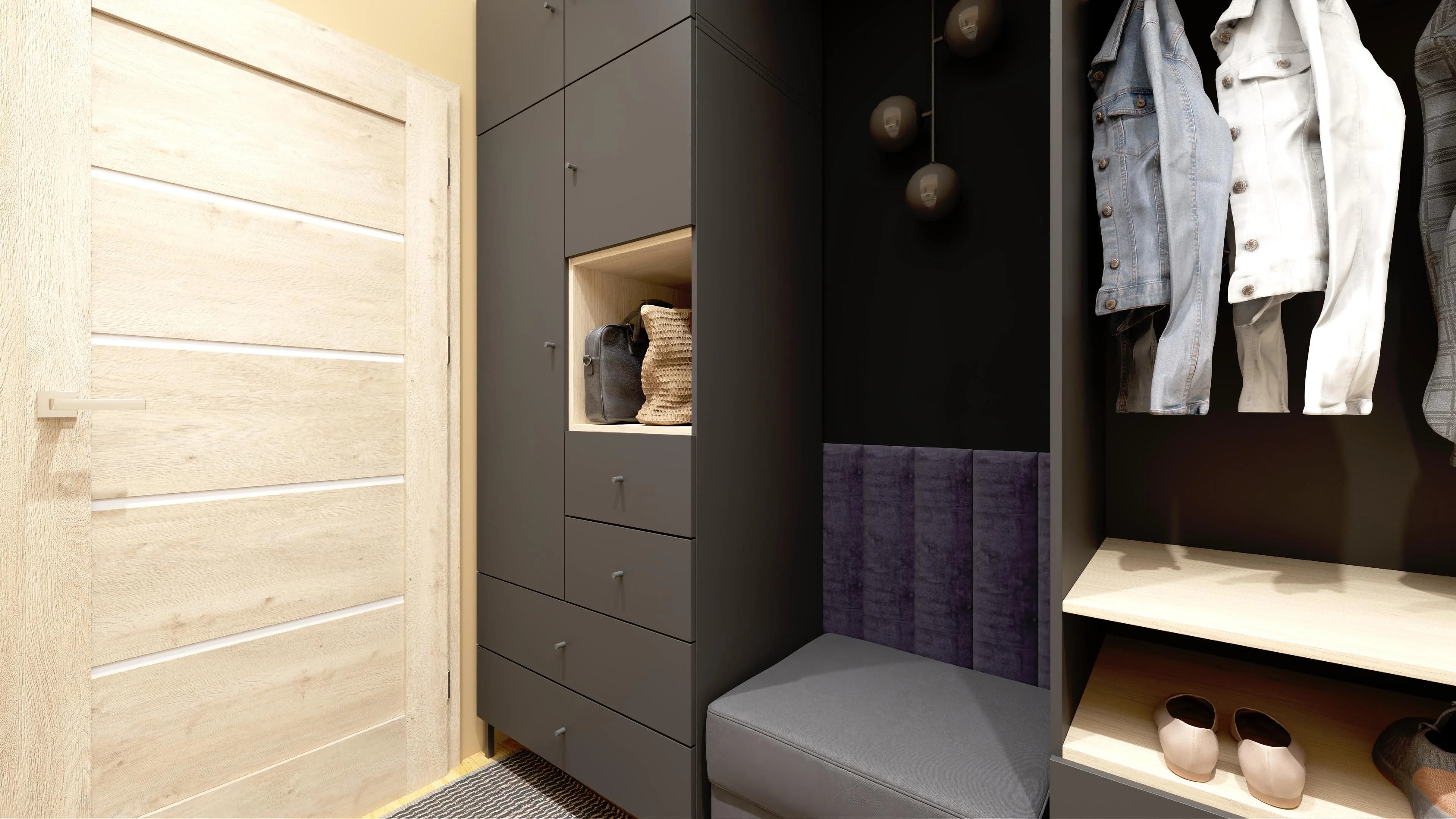 The tiny interior features clever solutions to promote organisation. With drawers, hanging rails and lockable shelves, the ceiling-high furniture accommodates various items of clothing. A spacious chest of drawers helps to keep everything tidy. A large mirror makes it easy to look at oneself and a soft pouf in the recess between the pieces of furniture makes it convenient to put on shoes.
