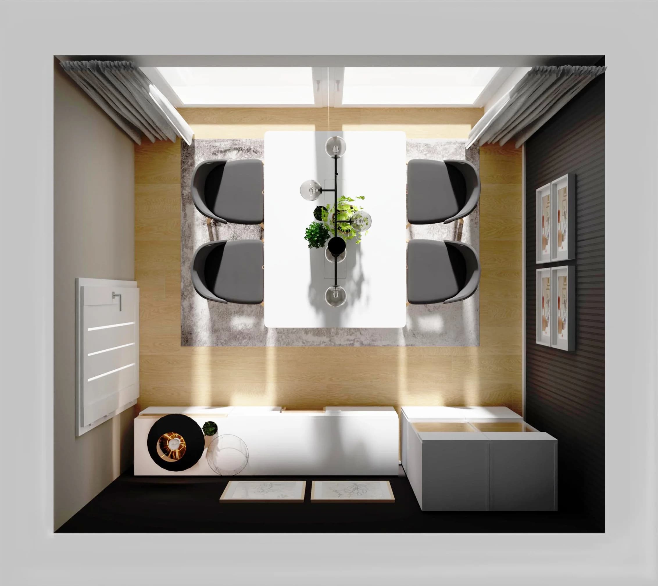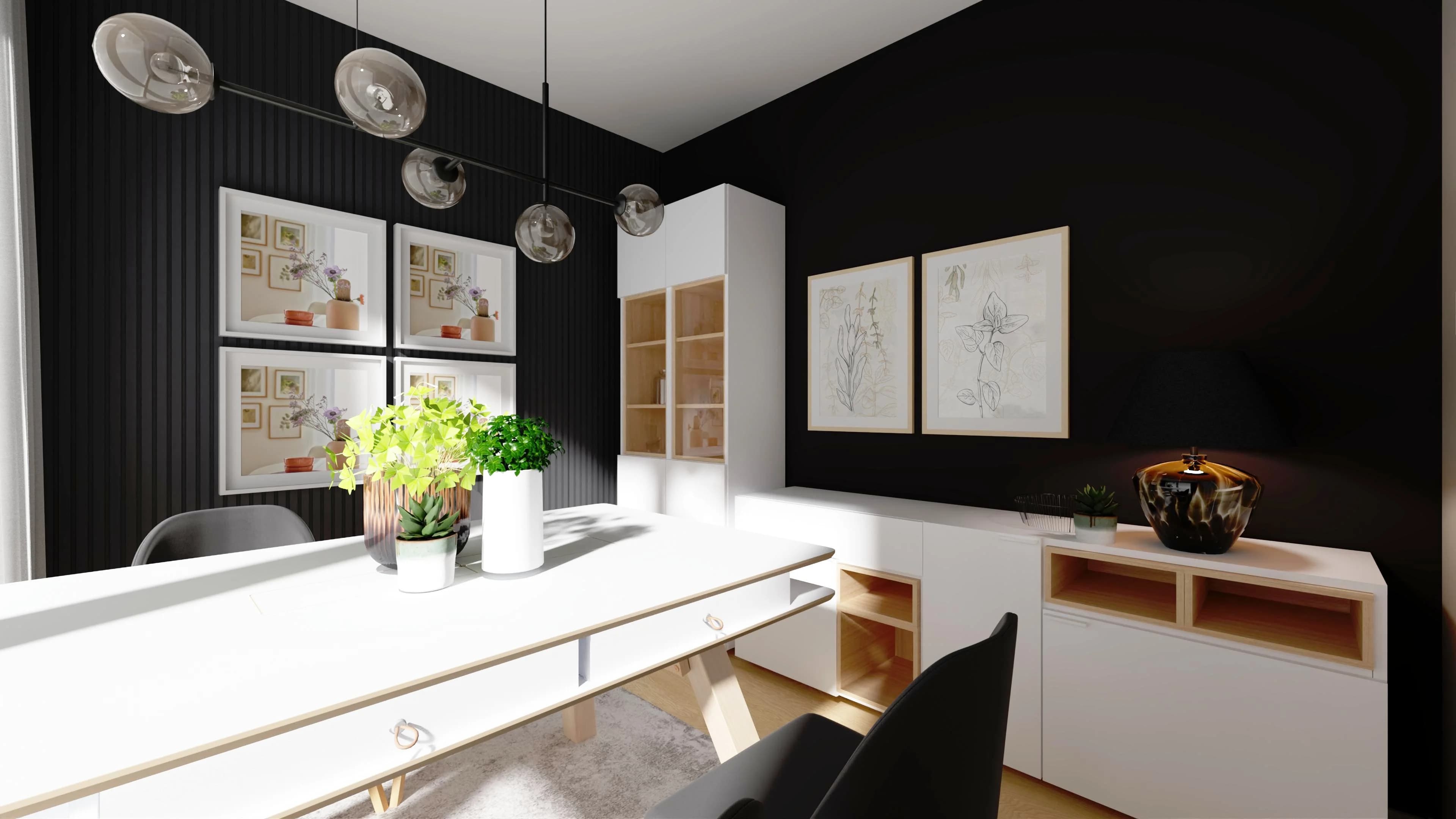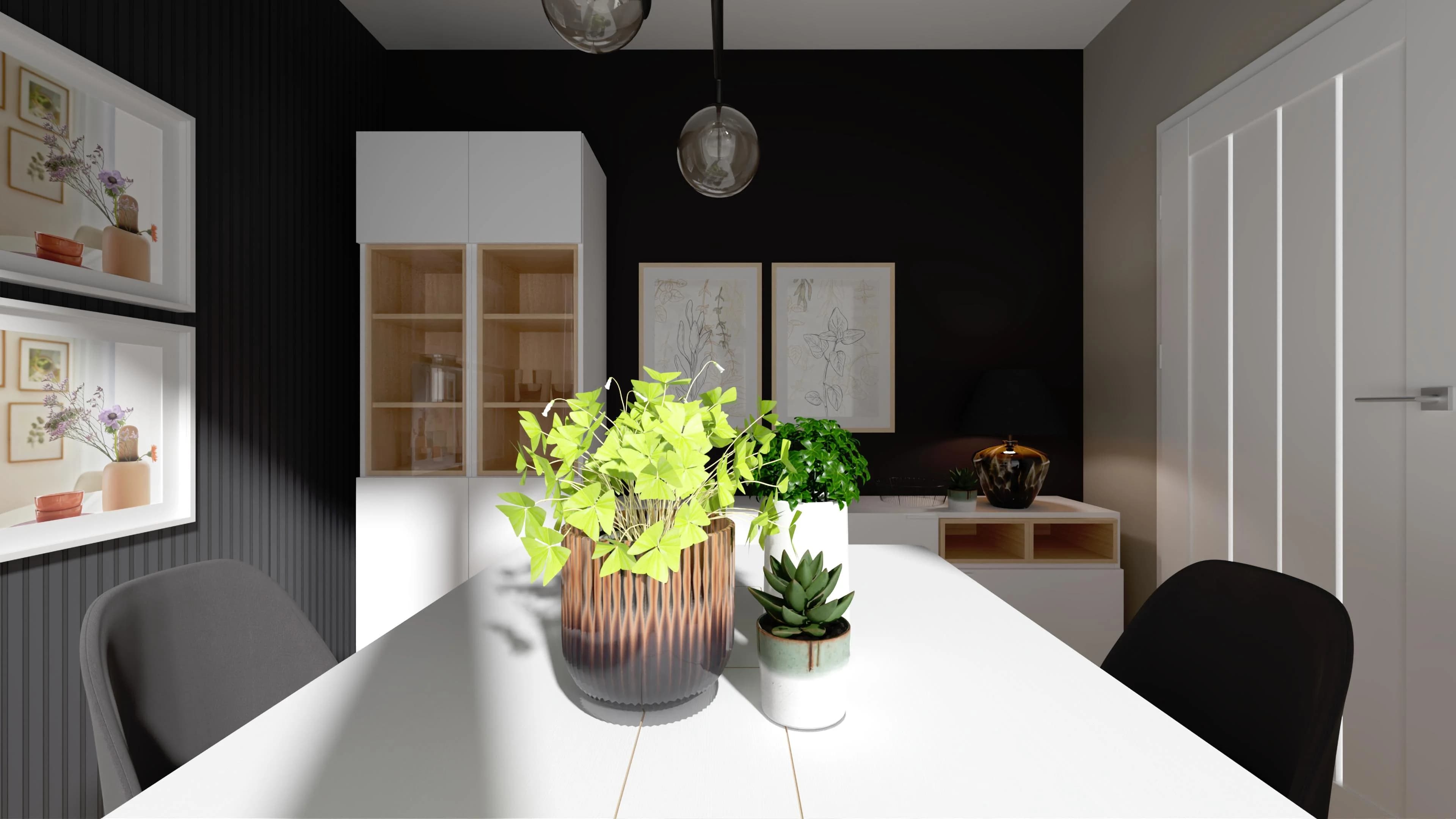 Minimalistyczna jadalnia zaaranżowana na zaledwie 8 m2 zachwyca spokojem i harmonią. Biały stół wyróżnia się na tle ciemnych krzeseł, tworząc wyrazisty kontrast, a pojemne meble nie tylko przechowują, lecz także eksponują ulubione przedmioty. Nowoczesny charakter wnętrza podkreślają grafiki na ścianach i efektowne lampy z dymionymi kloszami, które nadają przestrzeni wyrafinowanego sznytu.