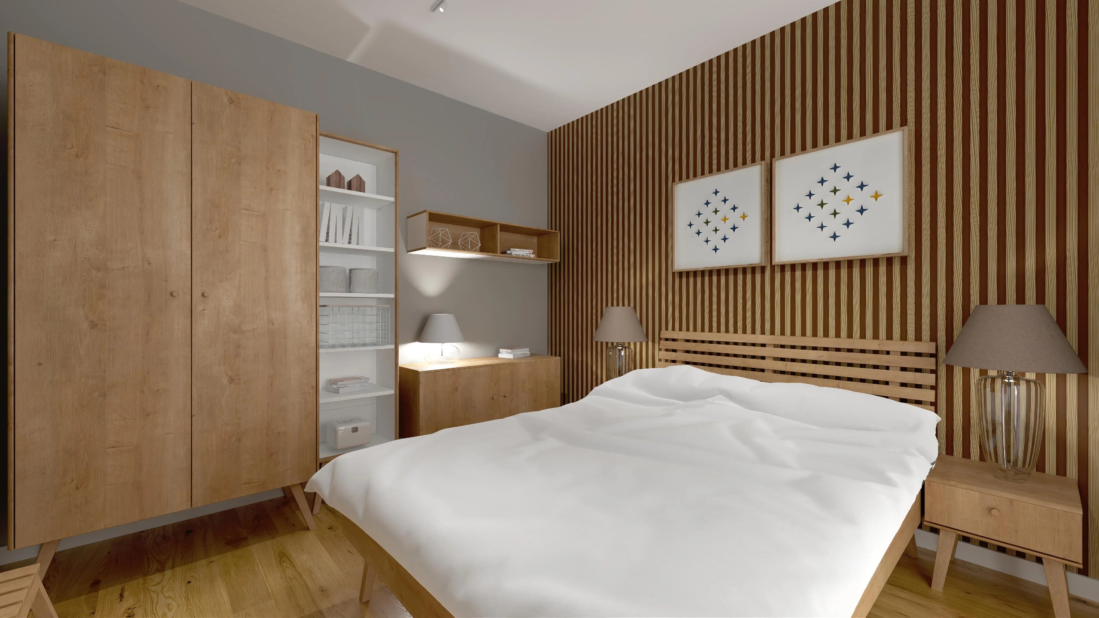 Dzięki praktycznym rozwiązaniom mała przestrzeń nabiera funkcjonalności. Sprytnie zaprojektowana szafa i komoda stanowią wygodną garderobę, a małe szafki nocne porządkują podręczne przedmioty. Na dębowym łóżku z wezgłowiem można zapaść w głęboki sen albo poczytać książkę. Chłodny odcień szarości na ścianach koi wszechobecna barwa drewna.
