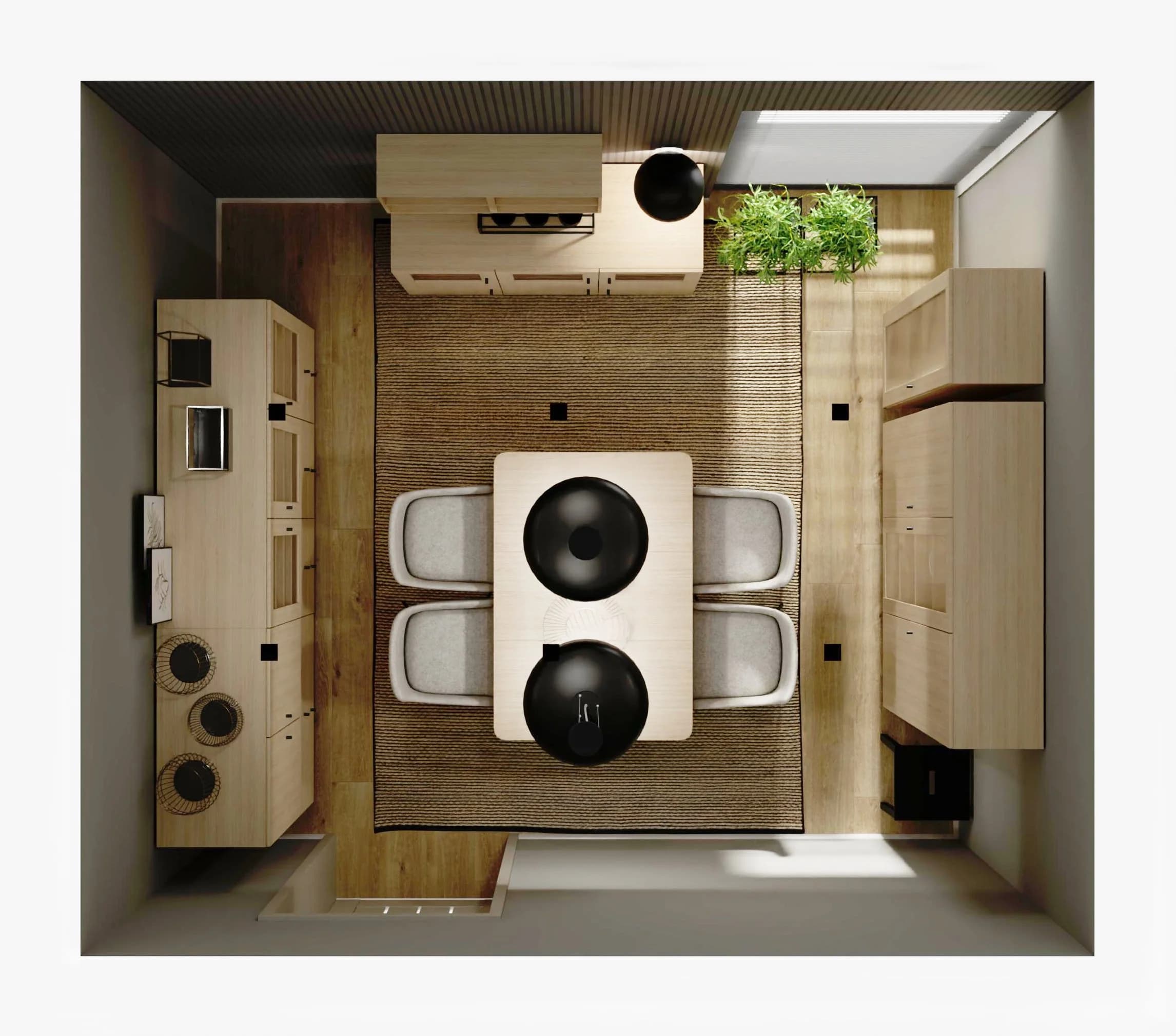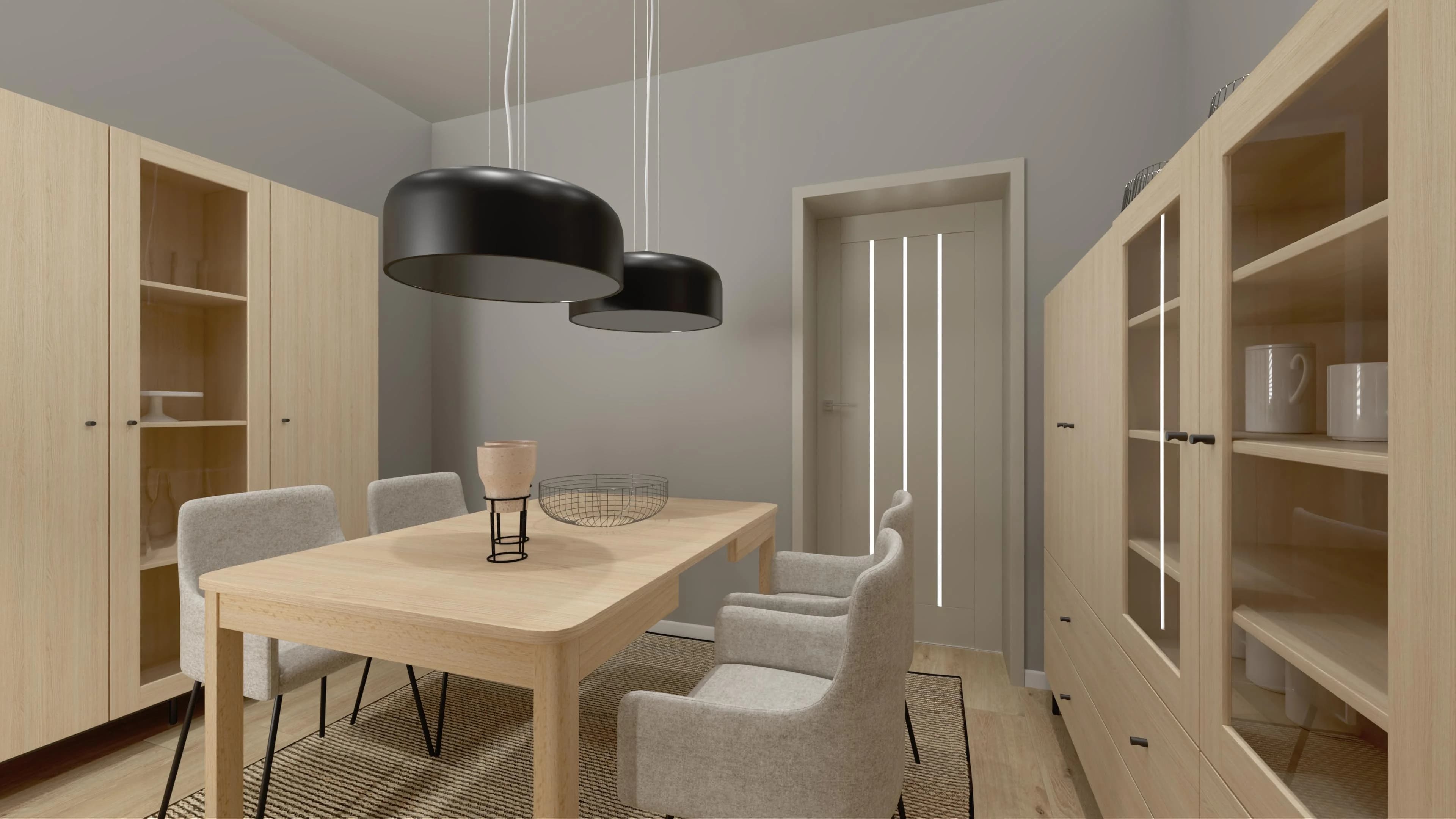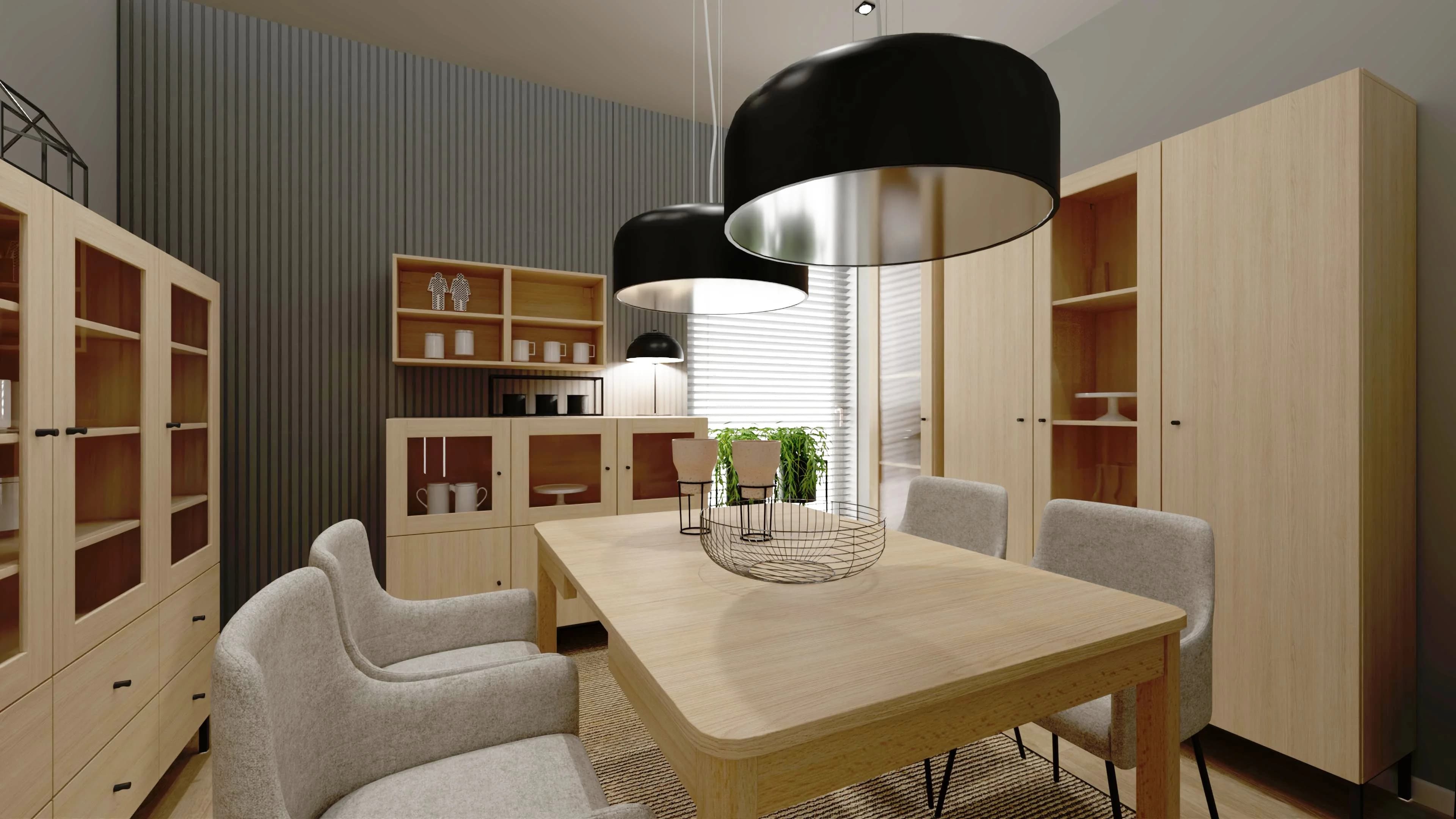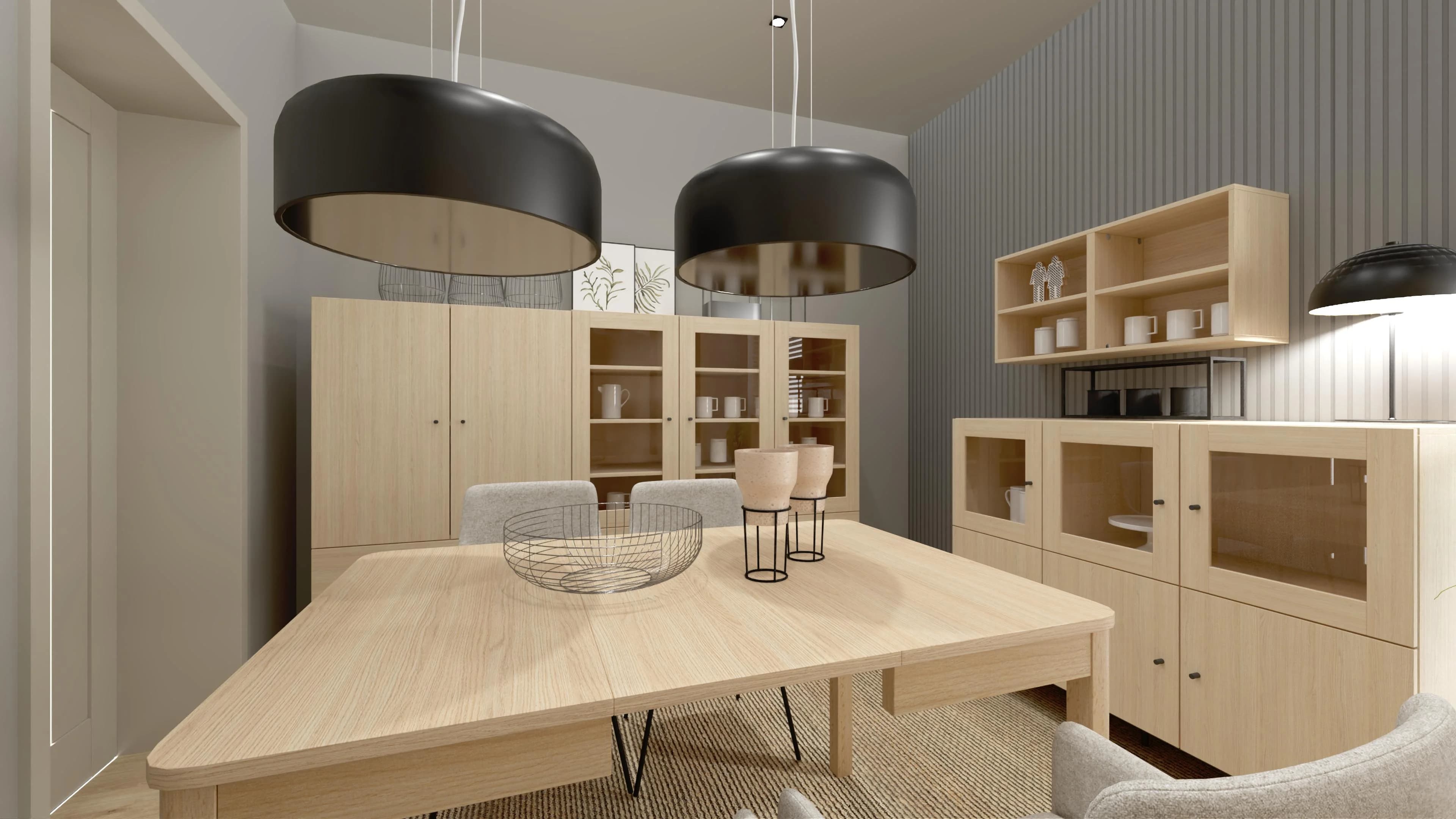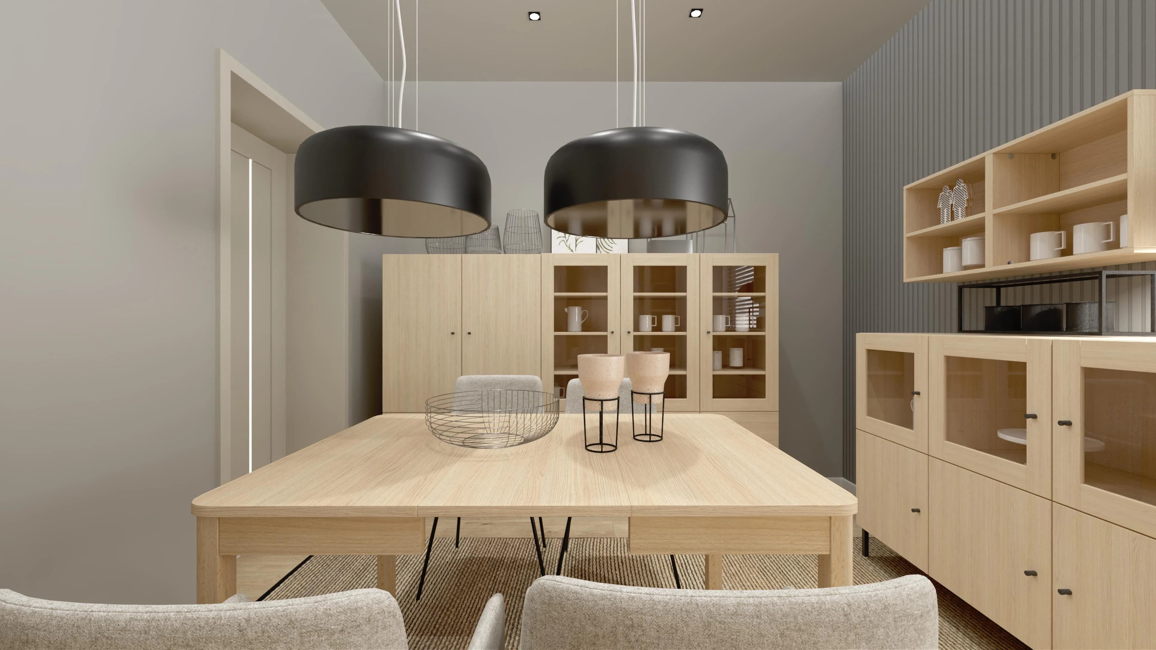 W tej jadalni meble w odcieniach ciepłego drewna harmonijnie korespondują z szarymi ścianami. Ustawiony w centrum stół zapewnia przestrzeń do bycia razem, a zawieszone nisko lampy budują nastrojowy klimat. W pojemnych meblach można znaleźć wiele miejsca do przechowywania. Duży dywan wycisza przestrzeń i sprawia, że staje się przytulniejsza.