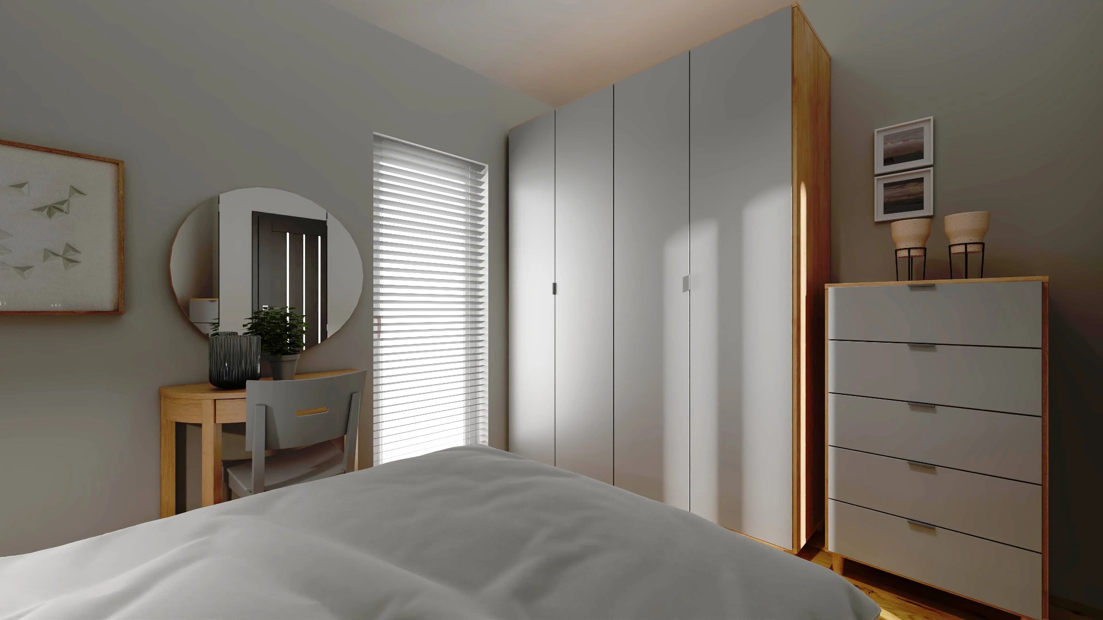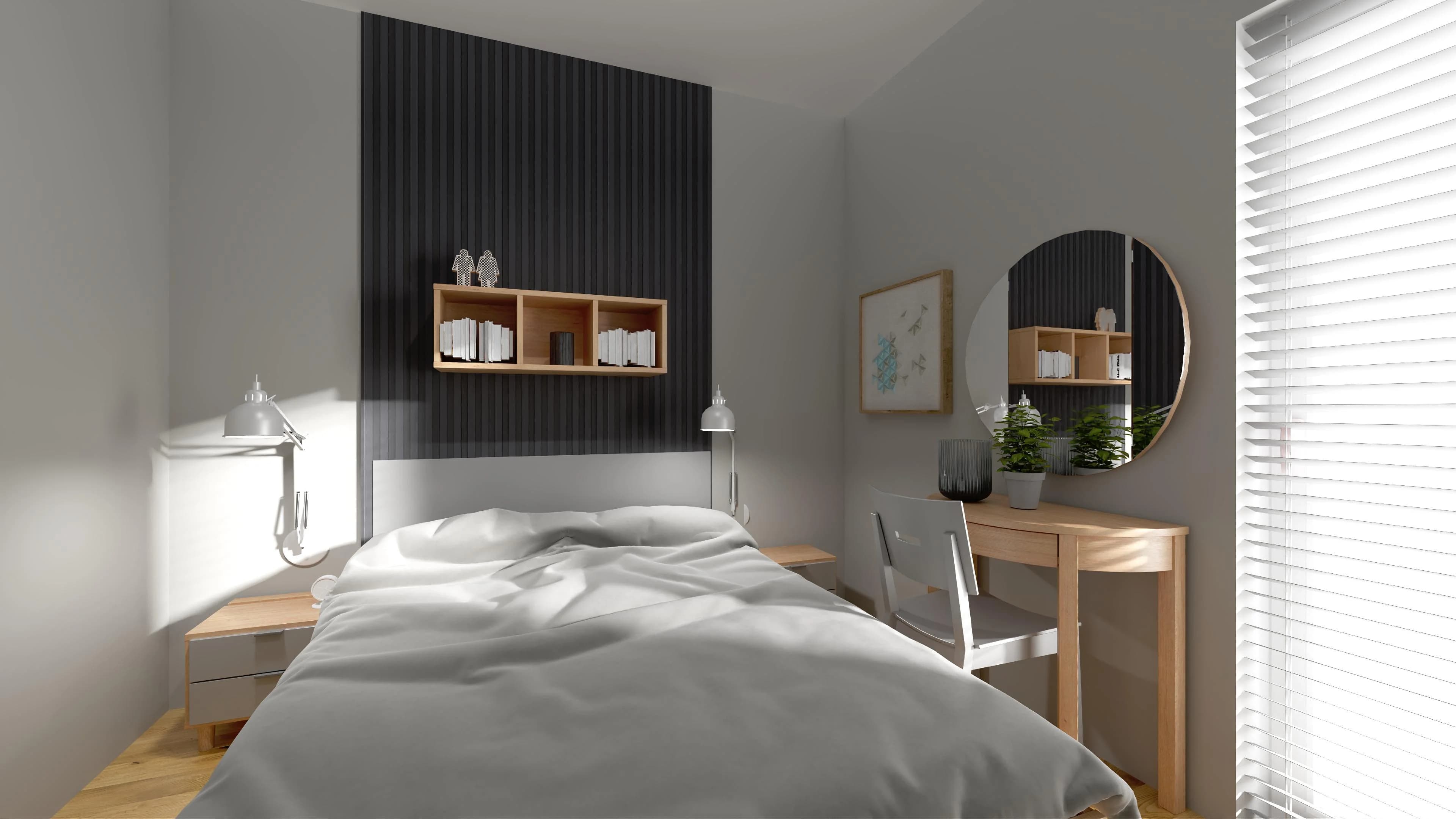 Sypialnia w chłodnych kolorach szarości i drewna emanuje spokojem. Wygodne łóżko z wezgłowiem to idealne miejsce do odpoczynku. Podręczne przedmioty porządkują praktyczne szafki nocne i kompaktowa toaletka w formie półkola. Dzięki pakownym meblom można łatwo uporządkować elementy garderoby. Niewielką przestrzeń optycznie powiększa okrągłe lustro.