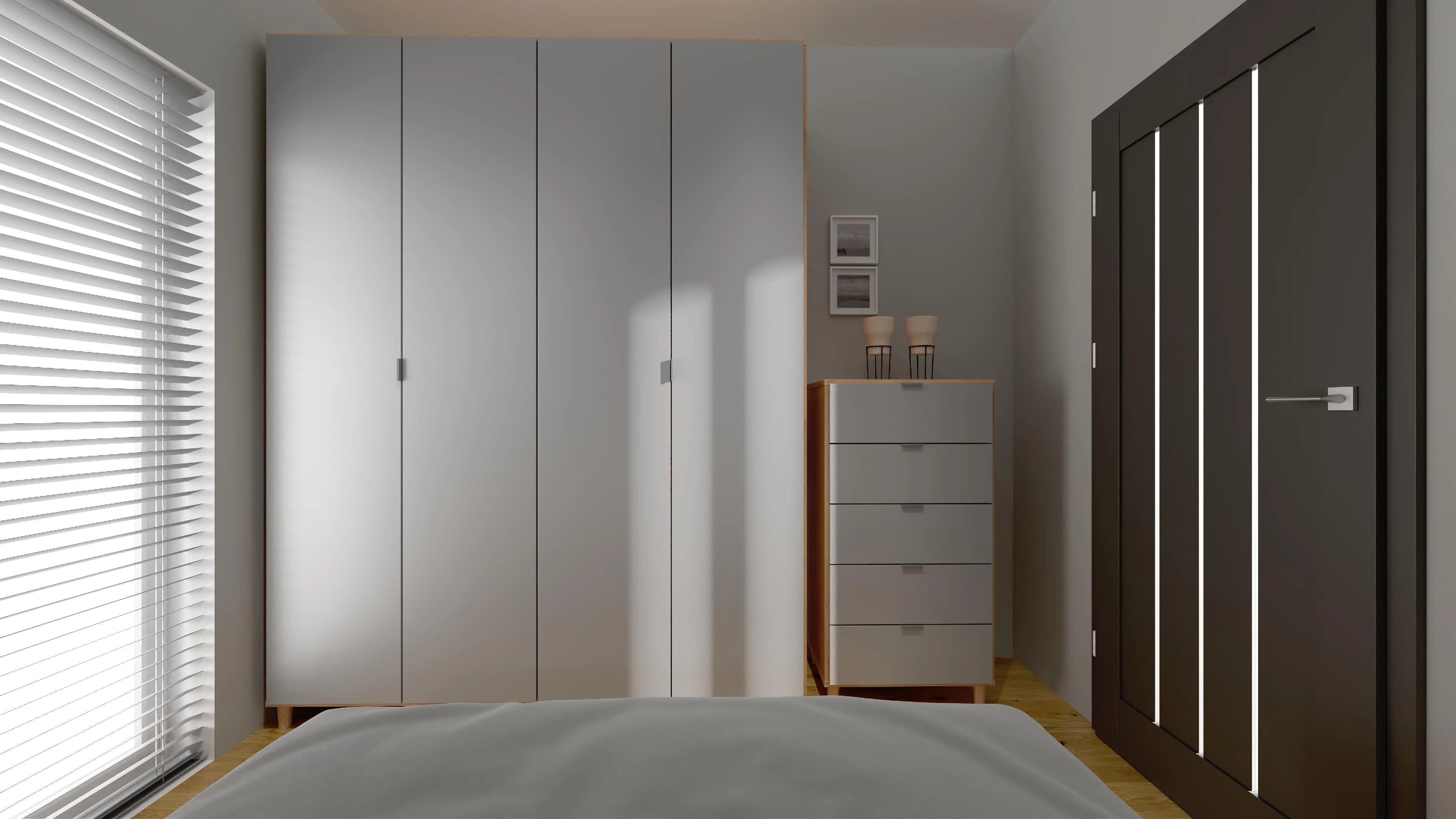 Mała szara sypialnia z drzwiami balkonowymi