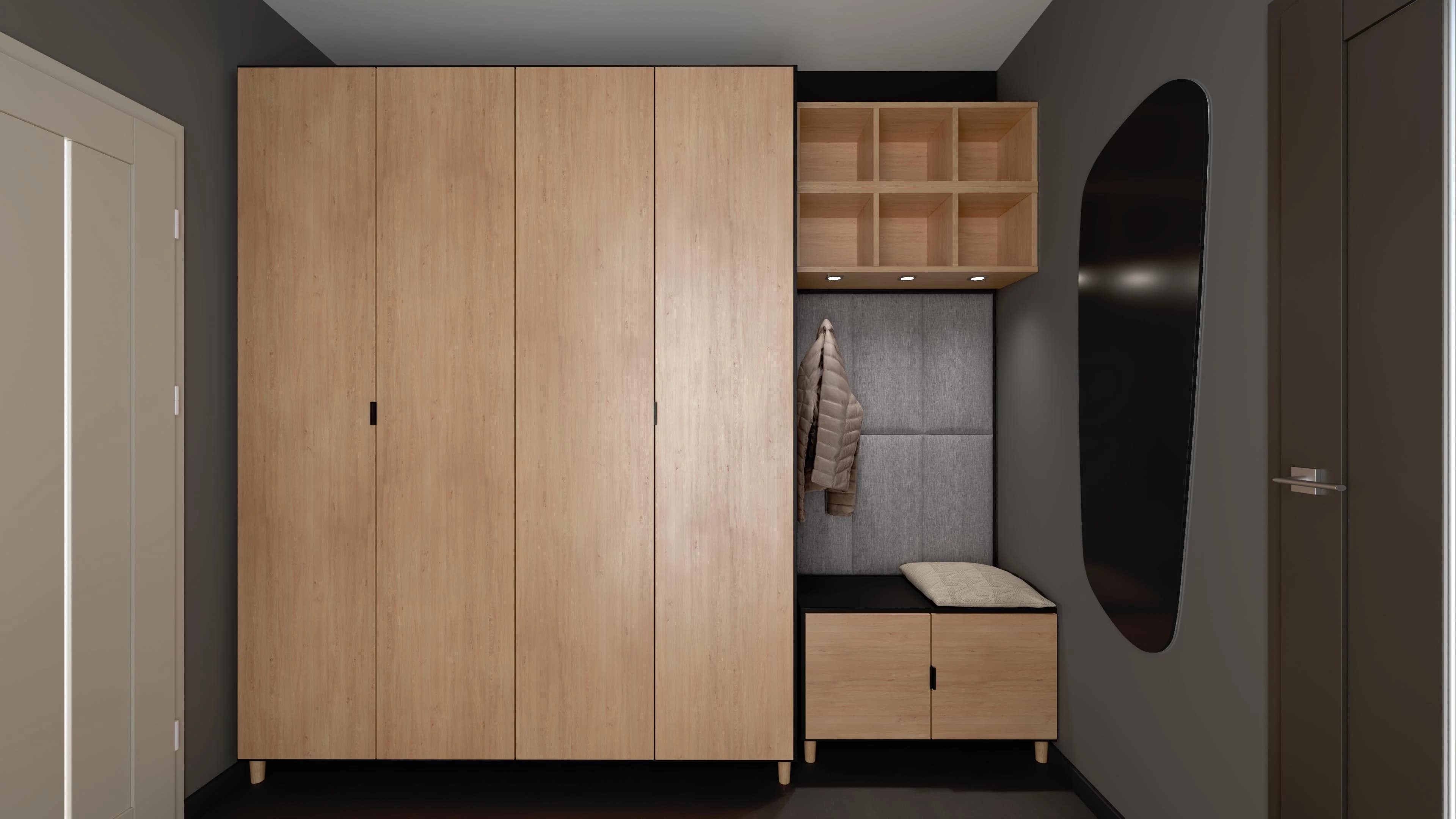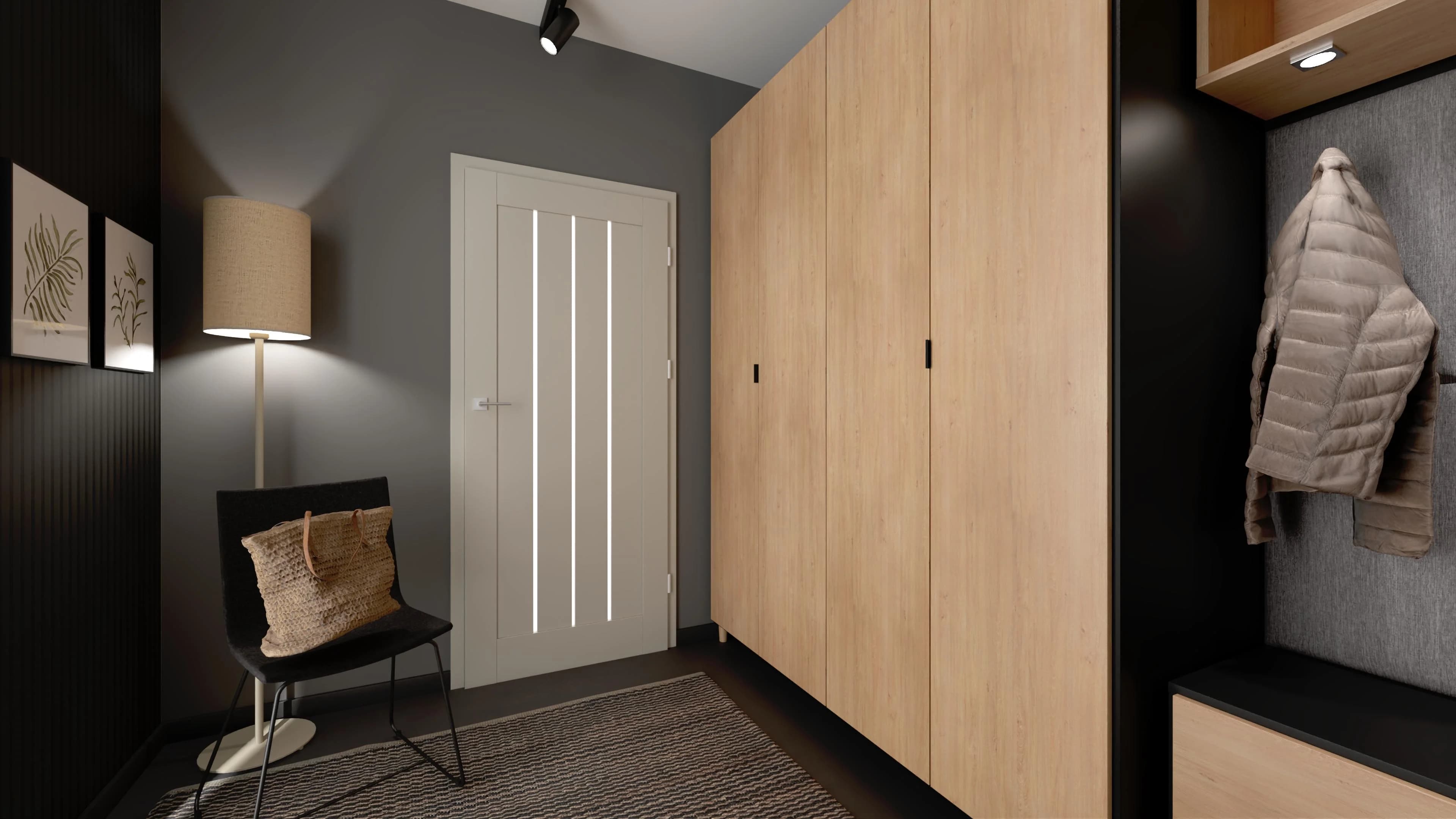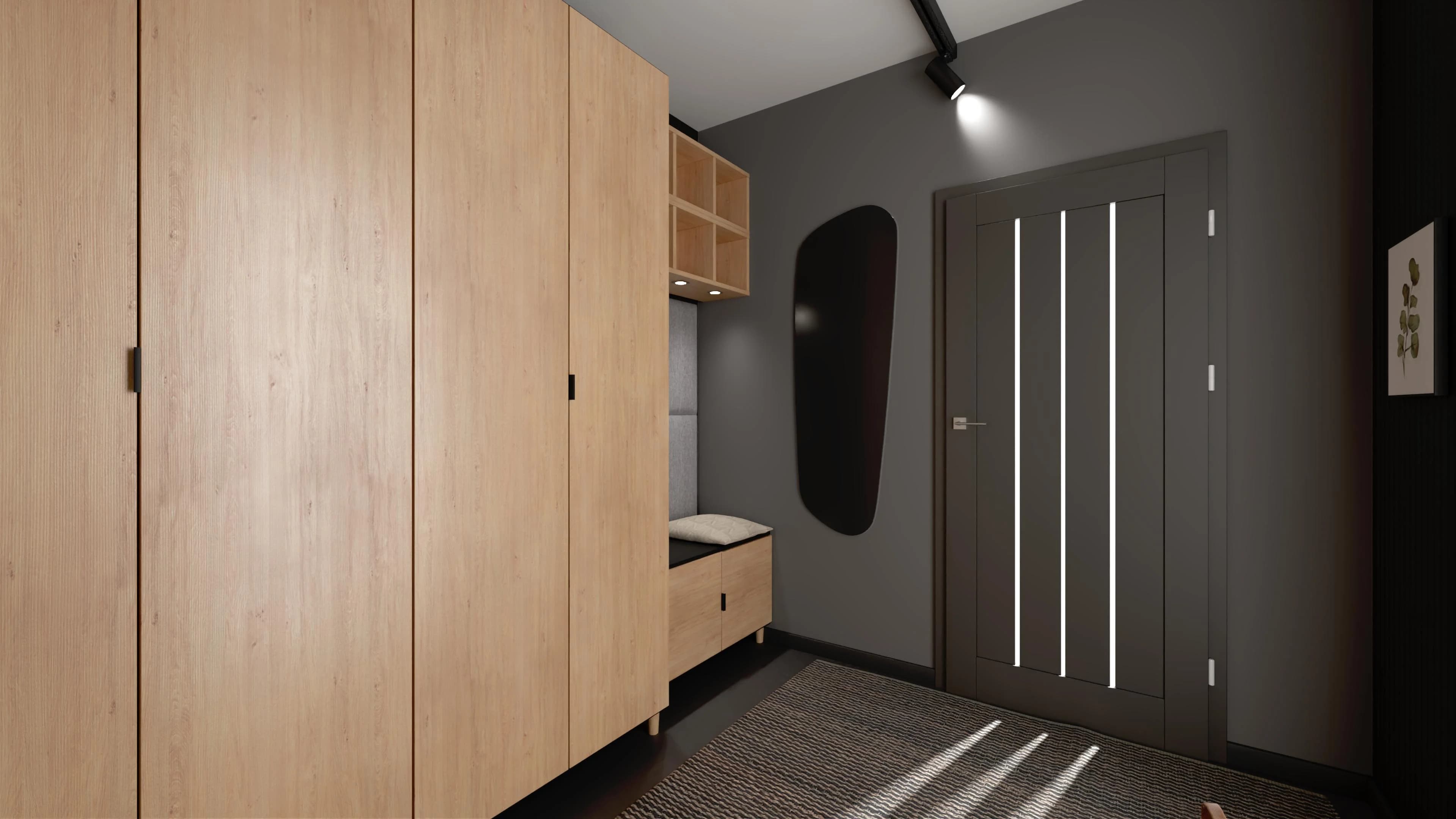 Przytulny i pełen praktycznych schowków przedpokój jest wizytówką domu. W trzydrzwiowej szafie można zorganizować odzież wierzchnią wszystkich domowników, a na krześle wygodnie przysiąść, by włożyć buty. Dzięki dużemu lustru o nieregularnym kształcie łatwo też poprawić fryzurę. Ciepły klimat wprowadzają meble w kolorze drewna i wytrzymały dywan na podłodze.