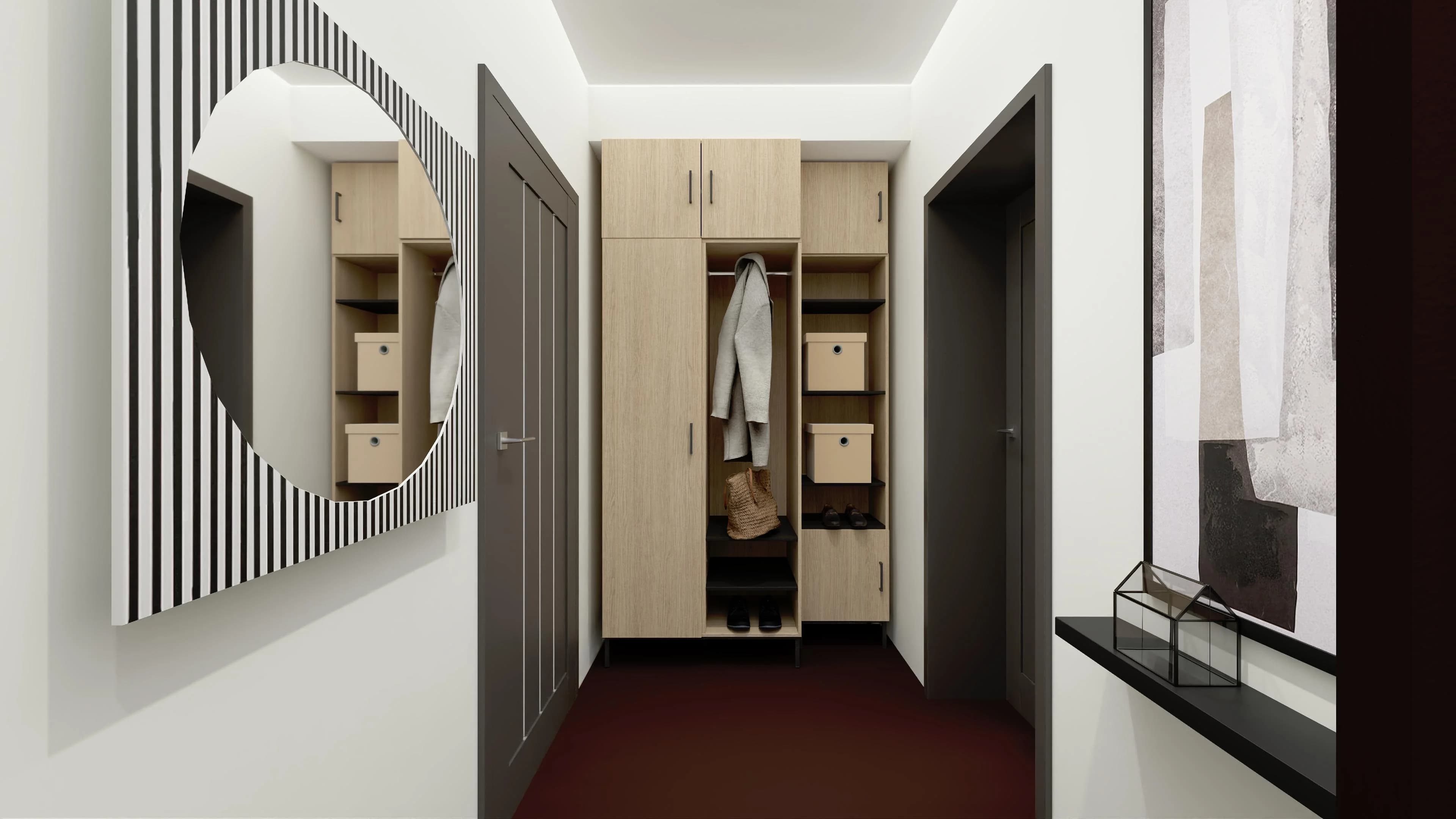 Dzięki pomysłowym rozwiązaniom ciasna przestrzeń tego przedpokoju stała się funkcjonalna, a przy okazji niebanalnie się prezentuje. Pakowne meble stwarzają wygodną przestrzeń, w której można przechować kurtki i płaszcze, obuwie oraz akcesoria. Niewielka ścienna półka pełni rolę blatu na dekoracje. Wygląd tuż przed wyjściem można sprawdzić przy dużym ściennym lustrze.