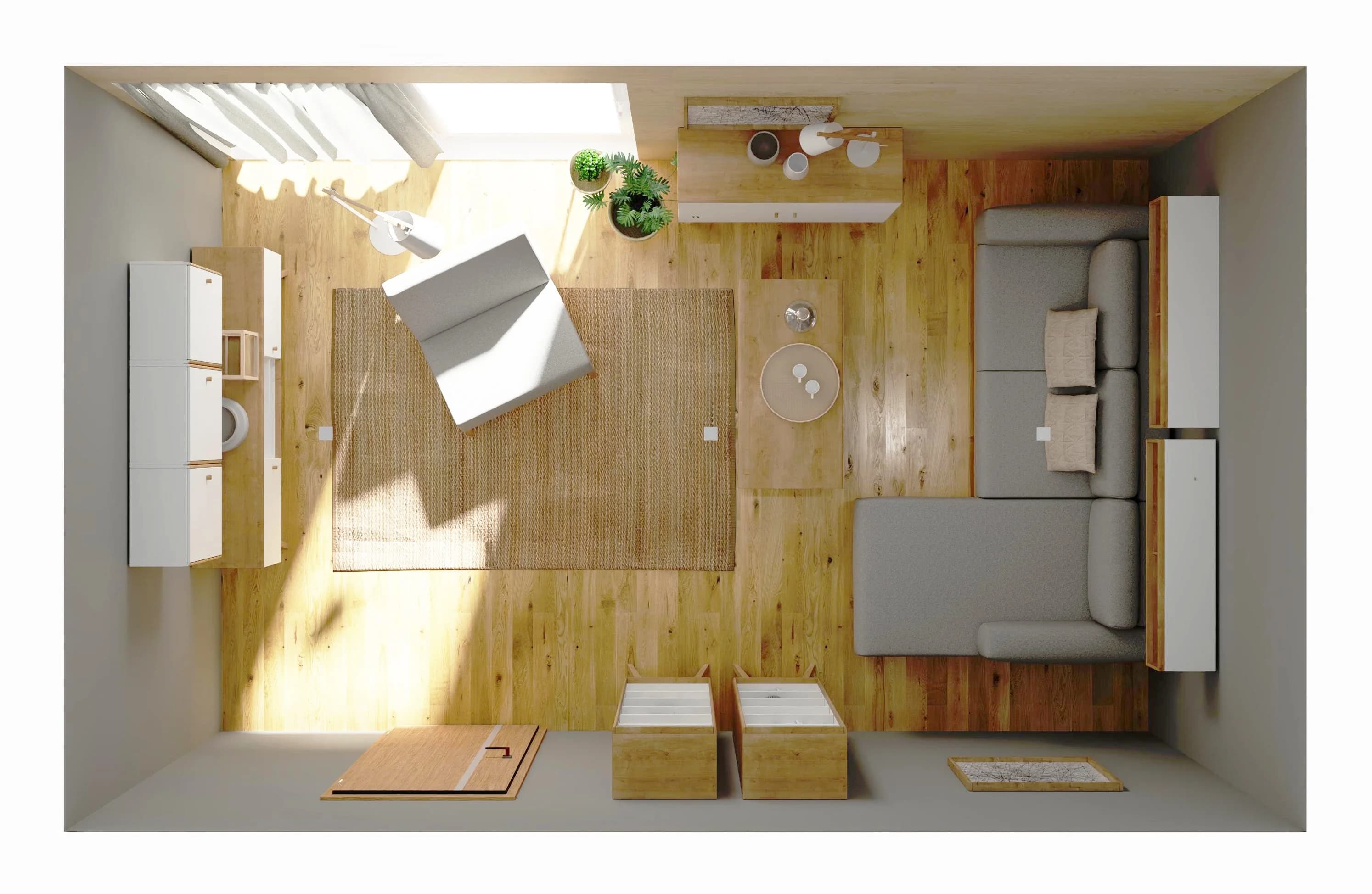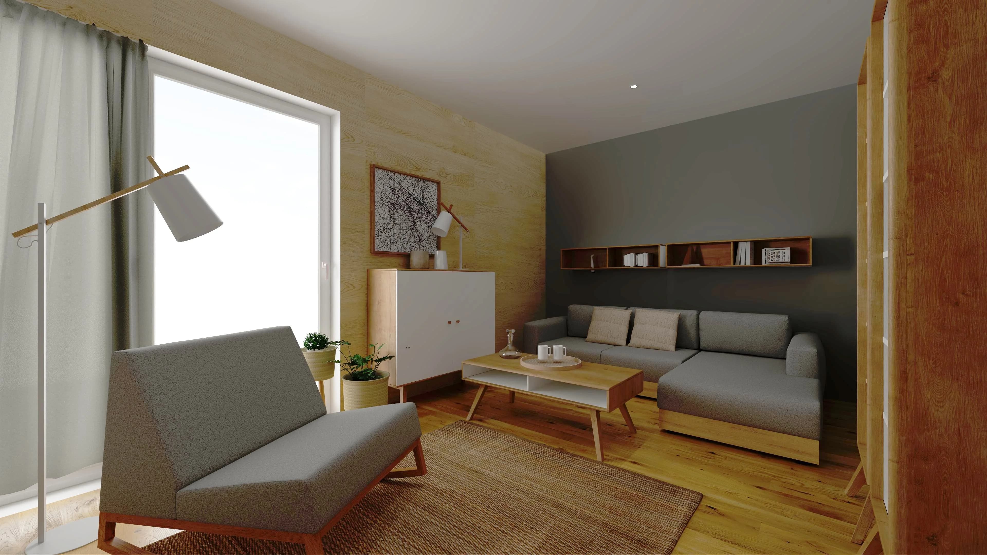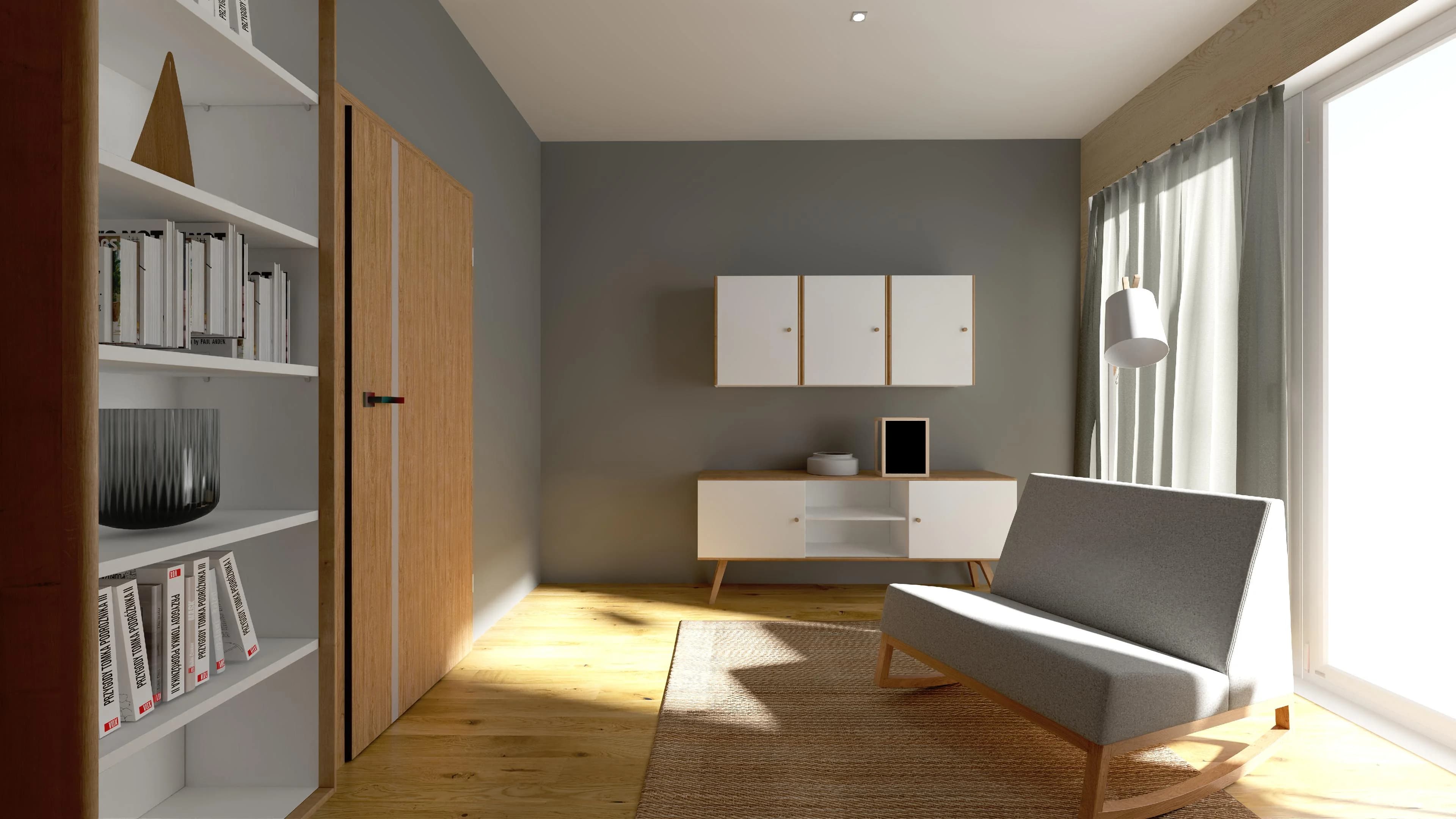 W niewielkim salonie znalazło się miejsce na przechowywanie, popołudniowy odpoczynek i poranną kawę. Wygodny narożnik pozwolił wykorzystać nieustawny kąt i zamienić go w przestrzeń relaksu. Pojemne regały i komoda ułatwiają organizację rozmaitych drobiazgów i książek. Miękkie tekstylia i kolor drewna sprawiają, że wnętrze zyskuje na przytulności.