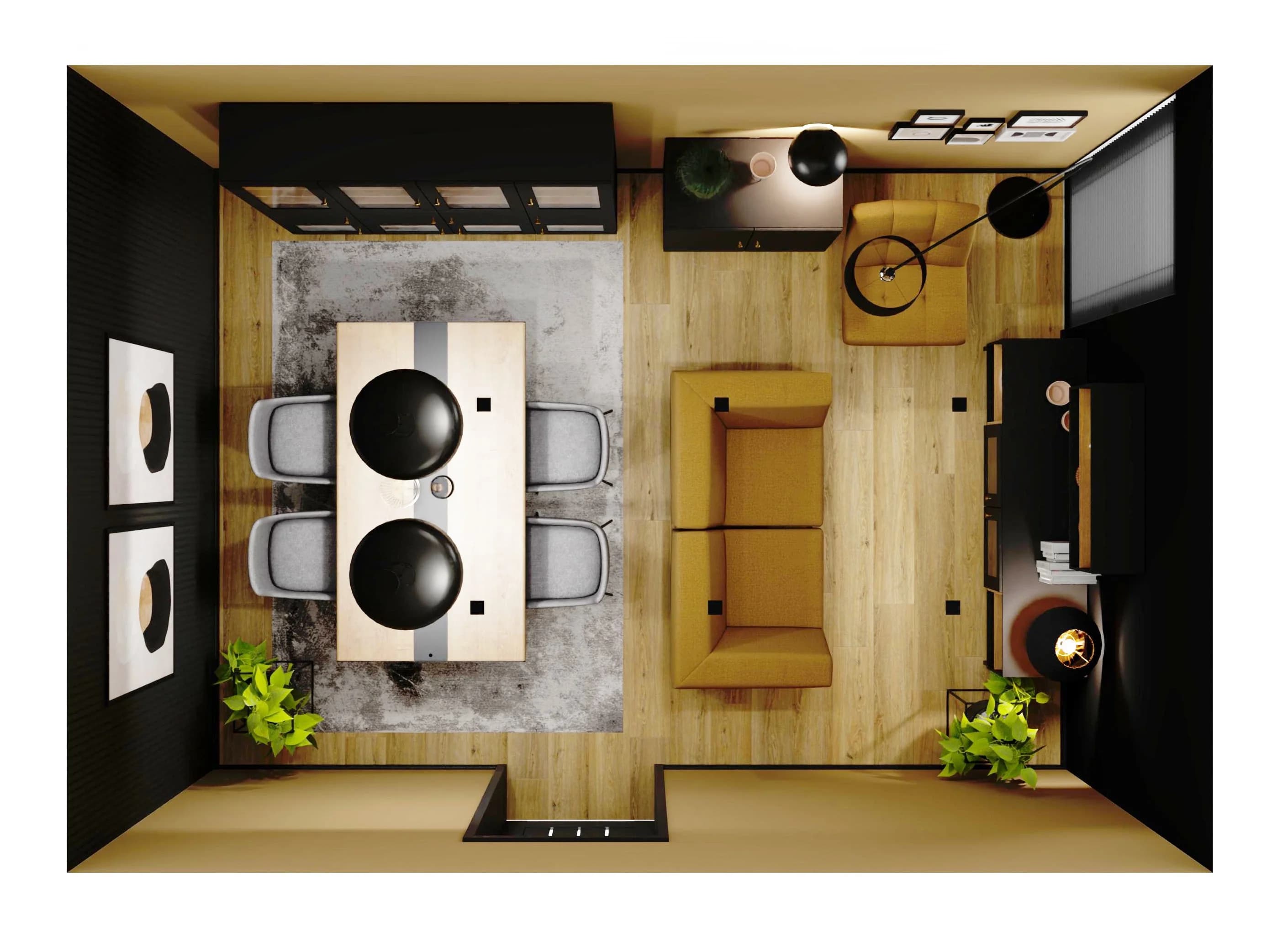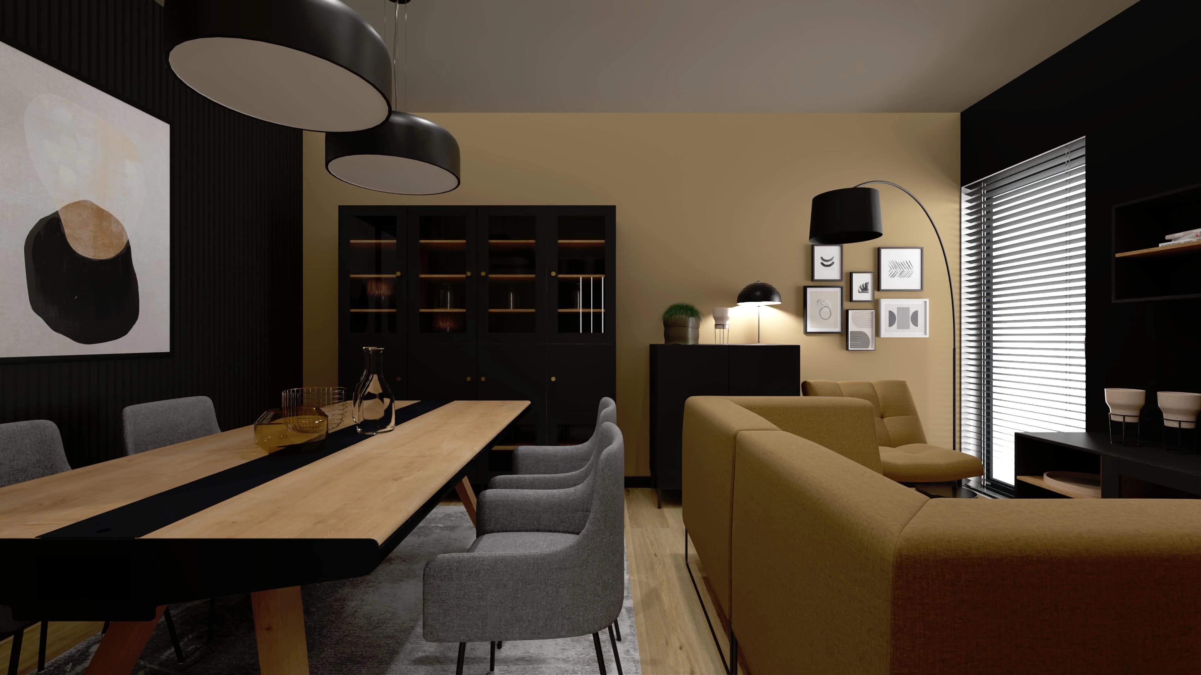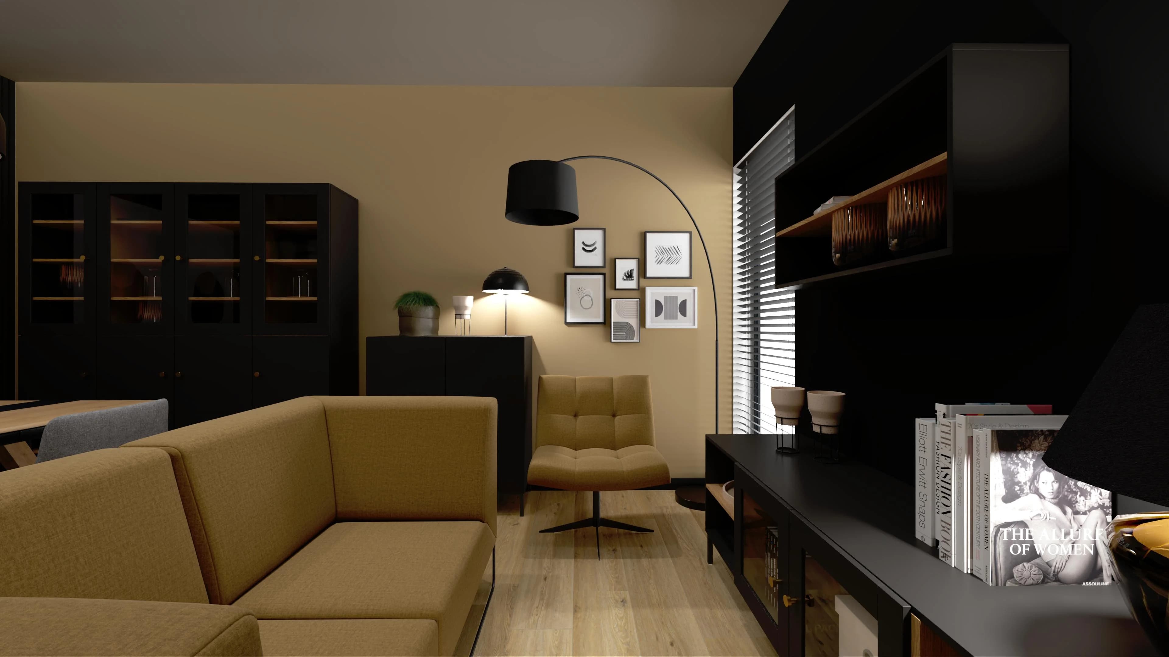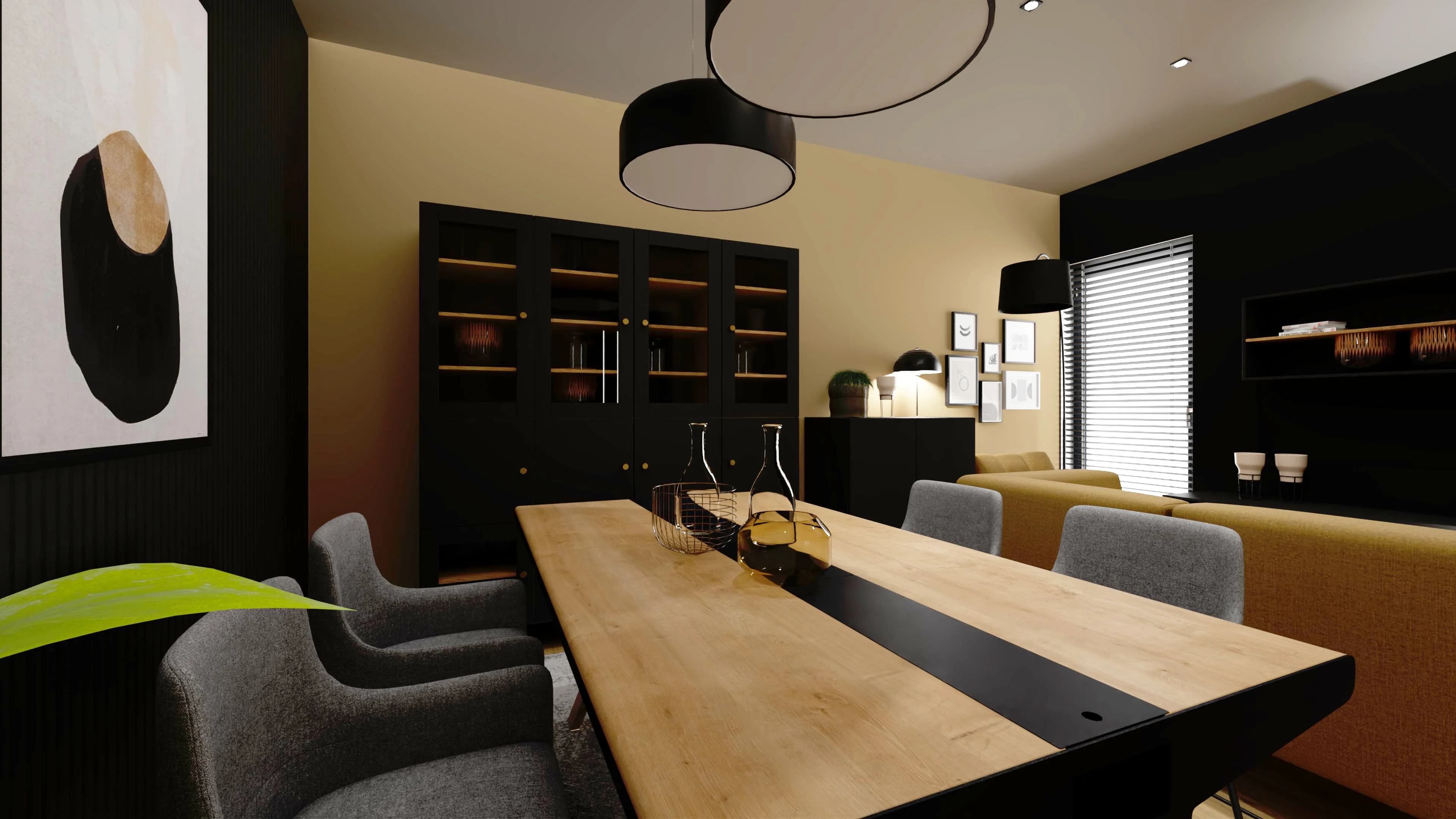 Mały salon z jadalnią – harmonia beżu, szarości i czerni