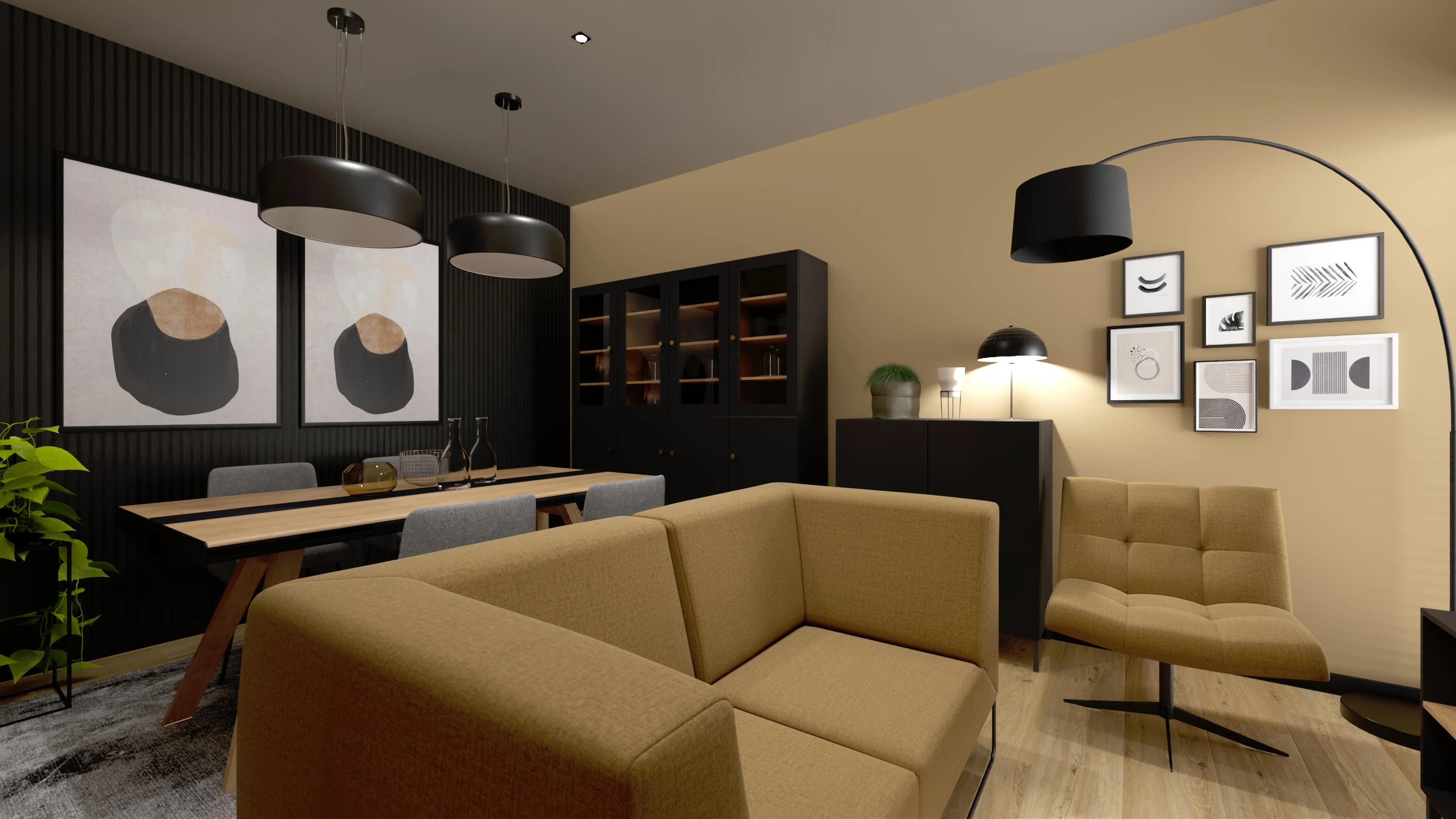 Ten salon z jadalnią to przestrzeń, w której nowoczesny design spotyka przytulny komfort. Jasne obicia kanapy i fotela wprowadzają ciepło, a ciemne meble nadają wnętrzu wyrafinowanej harmonii. Estetycznie wykończona sofa wydziela strefę relaksu, podczas gdy stół płynnie łączy funkcję spotkań i miejsca do pracy. Artystycznego charakteru dodaje galeria grafik na ścianie.