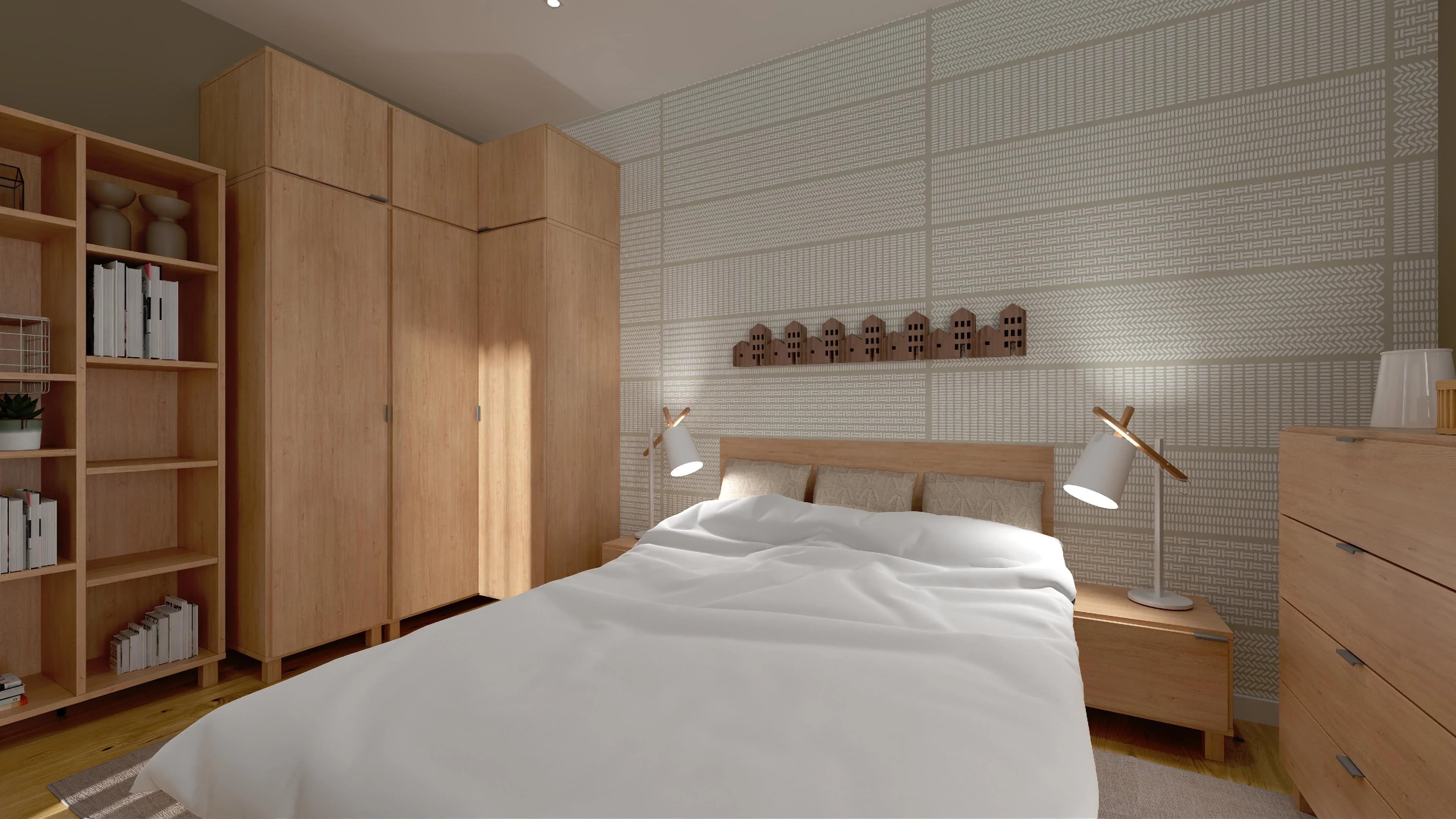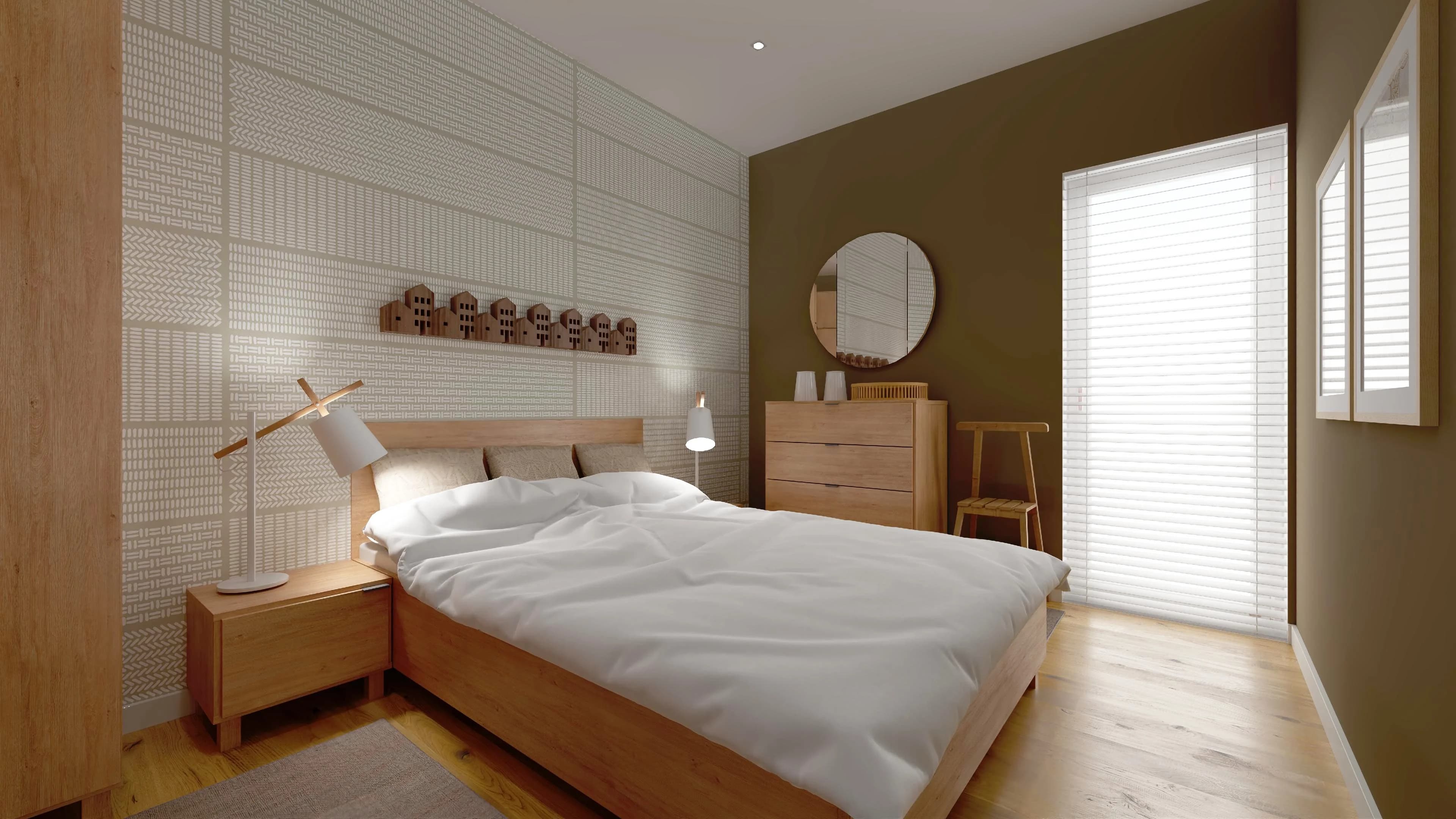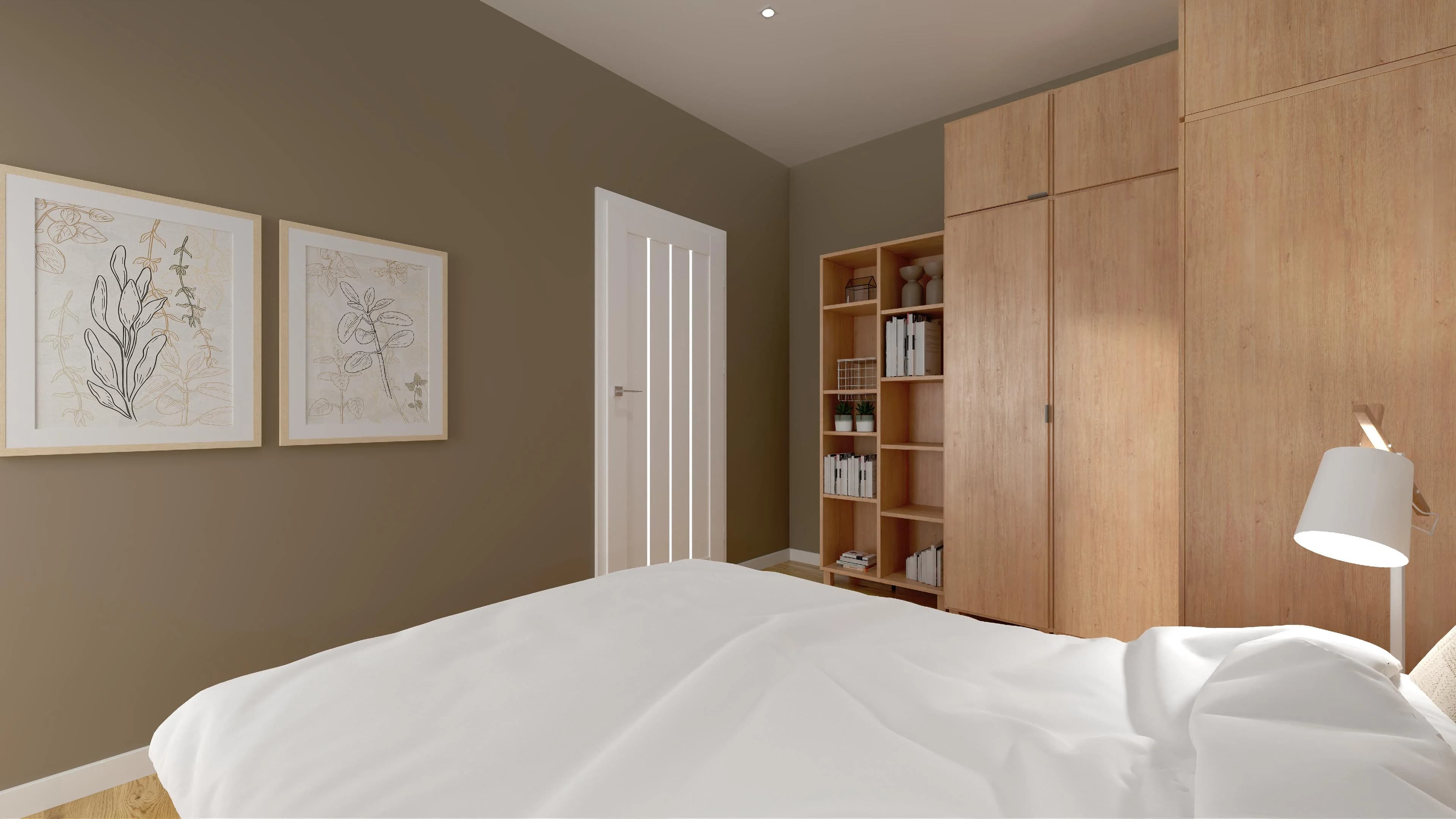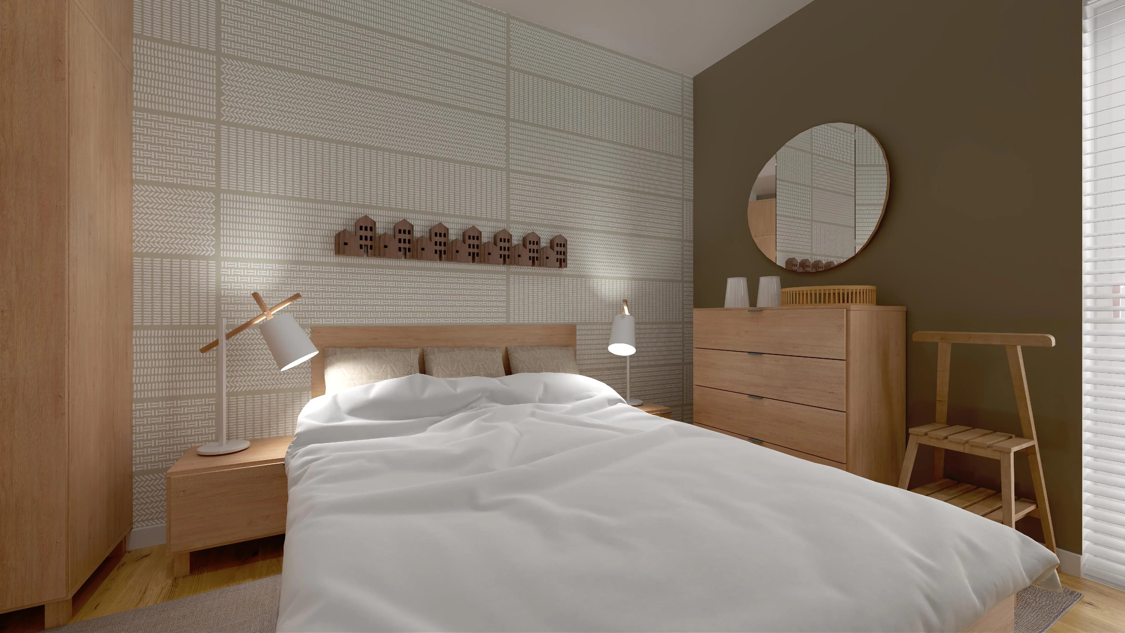 Przytulna i pozbawiona zbędnych dekoracji sypialnia sprzyja odpoczynkowi. W centralnym punkcie stoi przestronne łóżko z wysokim wezgłowiem i szafkami nocnymi na podręczne drobiazgi. W wysokiej narożnej szafie zmieszczą się wszystkie elementy garderoby i akcesoria. Wyłożona panelami dekoracyjnymi ściana ociepla przestrzeń i nadaje jej ciekawego wyrazu.