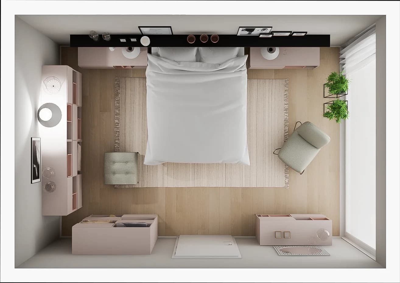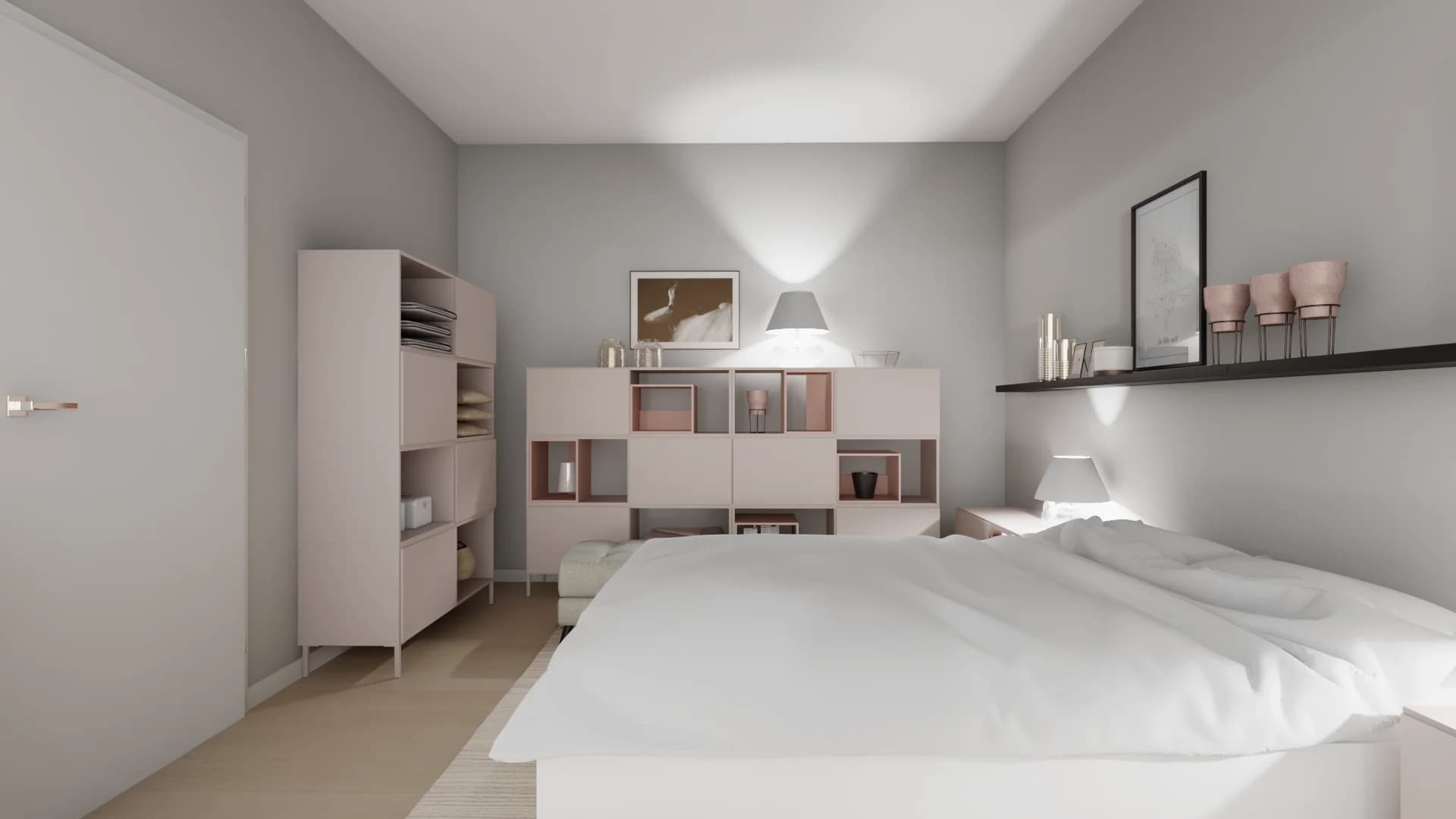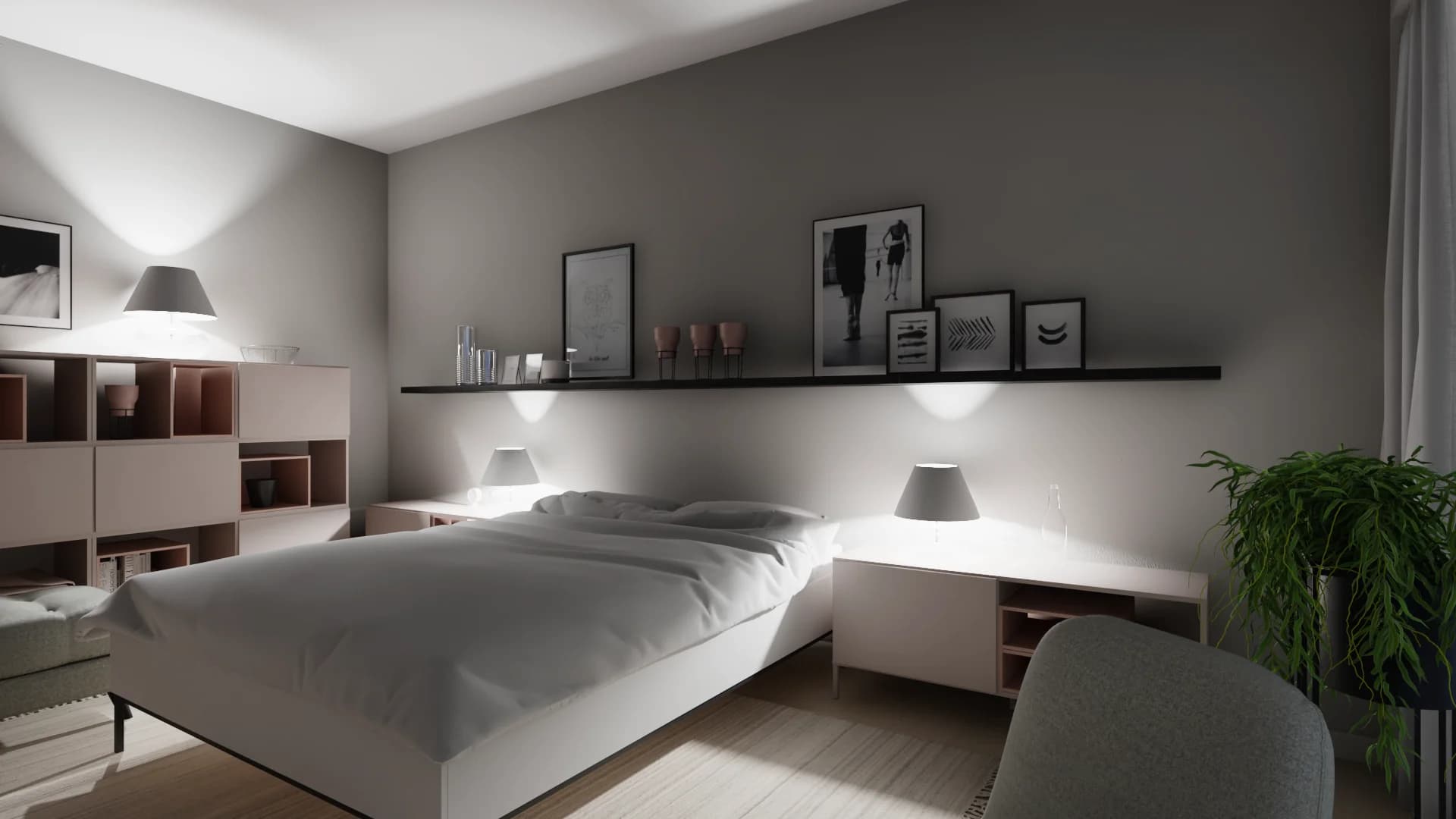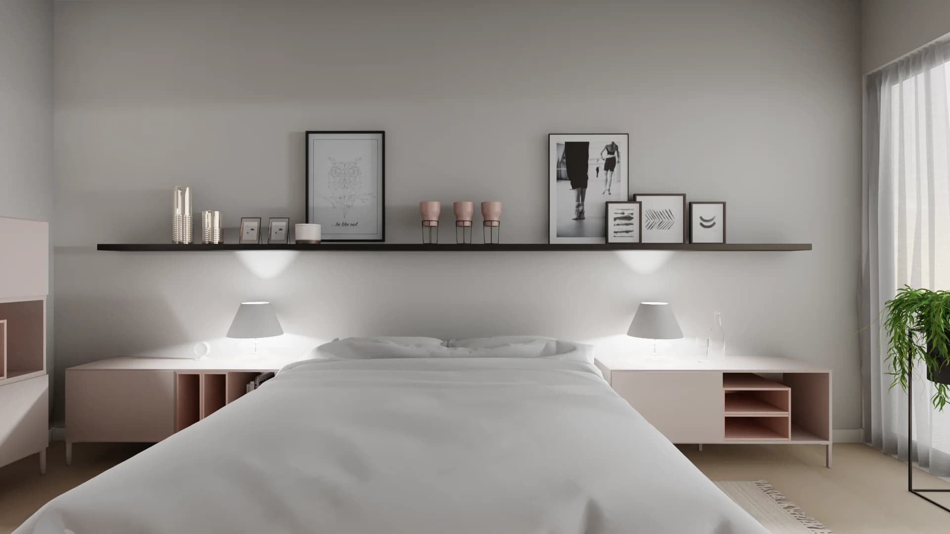 Minimalist bedroom with long wall shelf