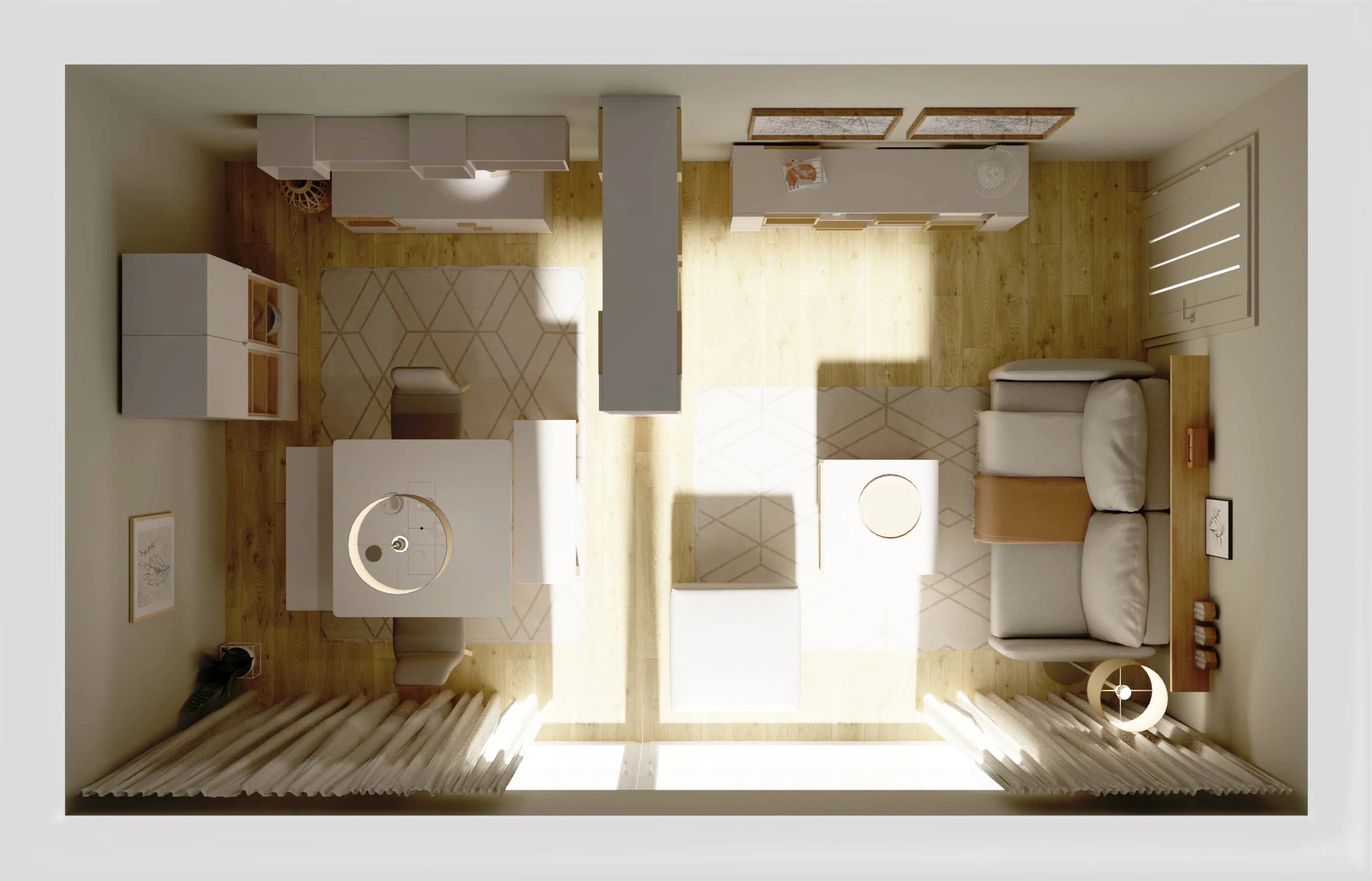 Każdy centymetr tego wnętrza został sprytnie zagospodarowany. Niewielki, rozkładany stół jest miejscem wspólnych posiłków i wygodnym biurem, a miękka sofa pozwala na chwilę relaksu. Ażurowy regał oddziela strefę jadalni od części wypoczynkowej, zapewniając prywatność oraz miejsce na książki i drobiazgi. Jasne kolory mebli i dodatków rozświetlają pokój, podkreślając poczucie przestronności.