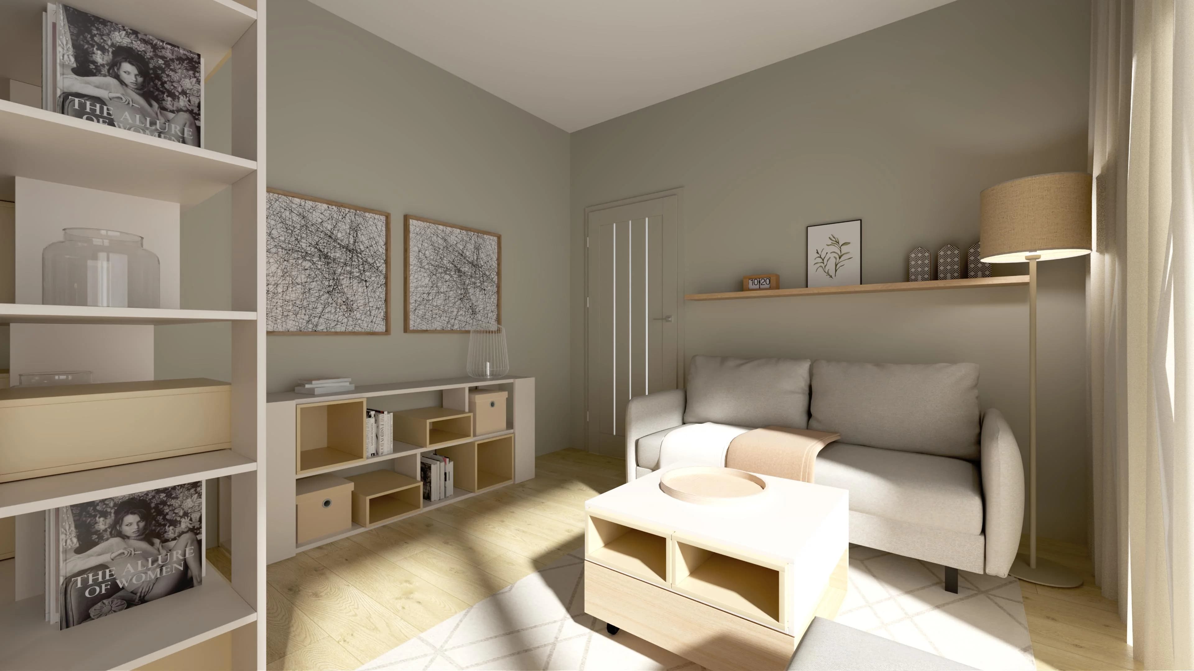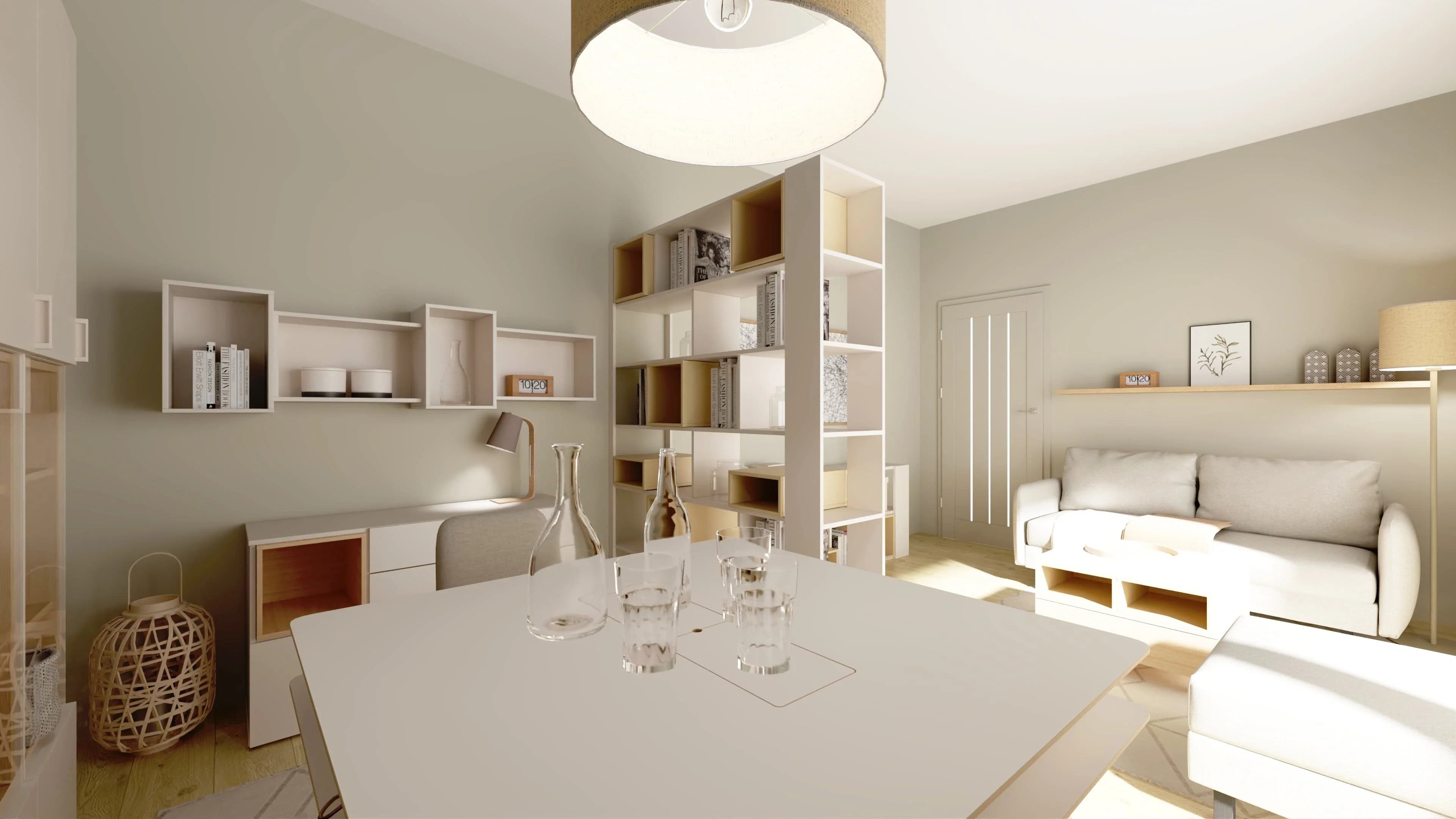 Multifunkcyjny salon z jadalnią i regałem dzielącym przestrzeń