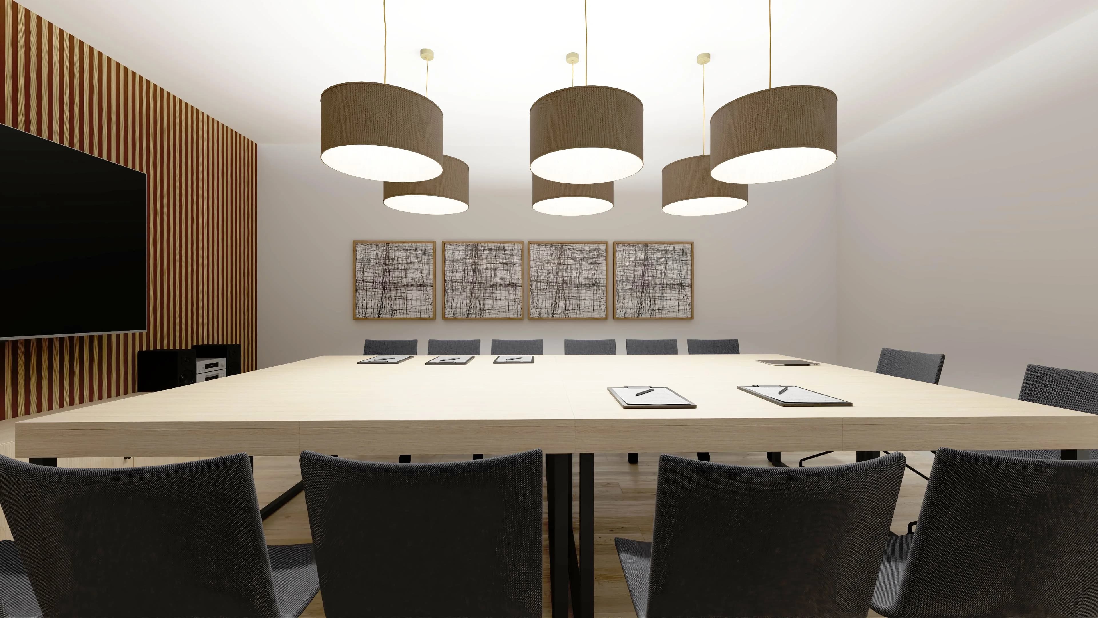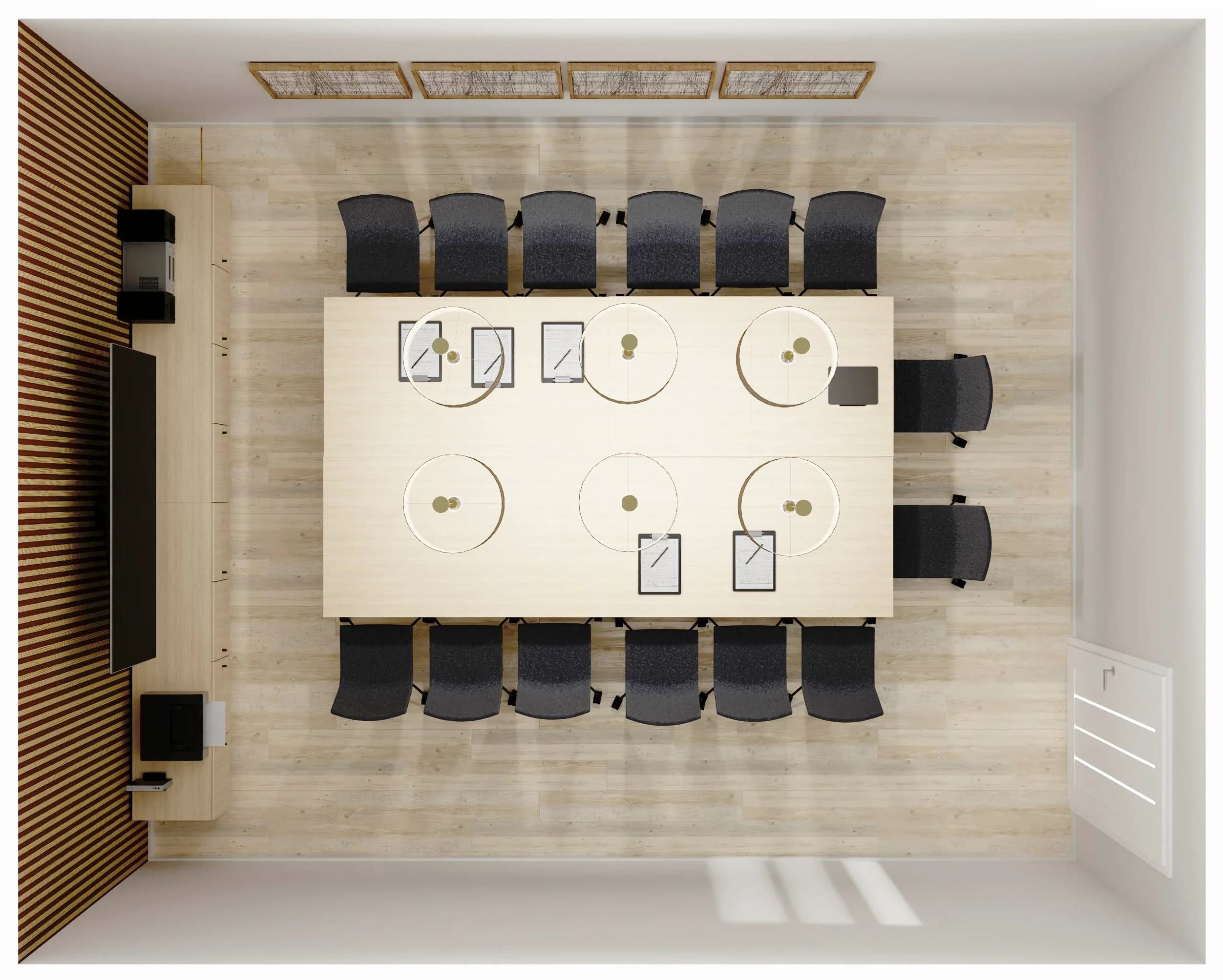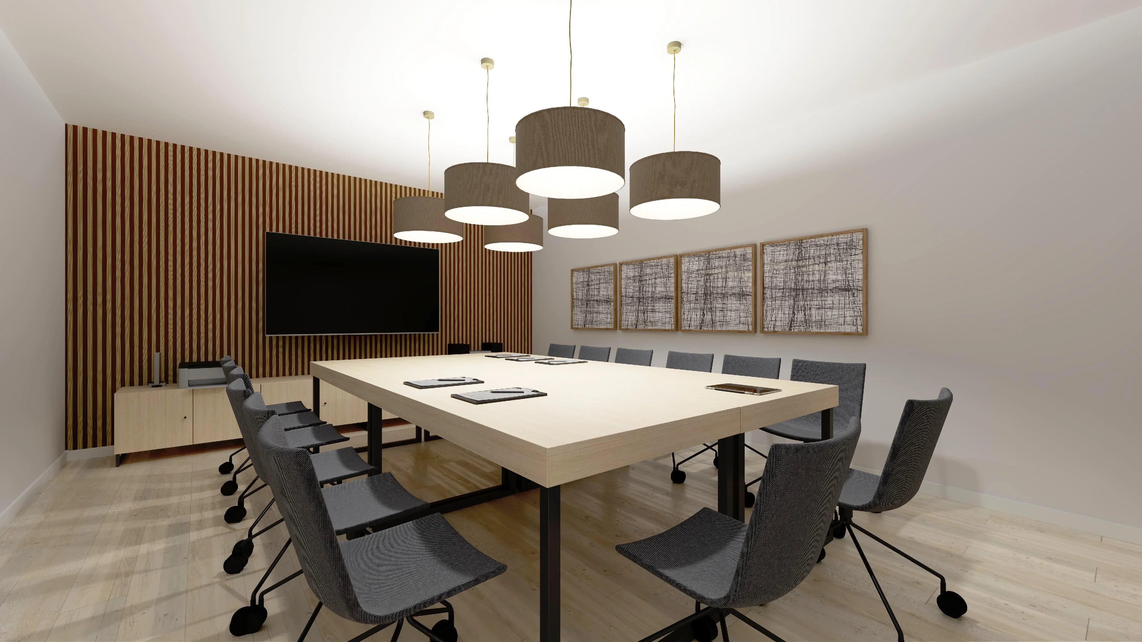 This large conference room is a modern and functional interior designed for team meetings. In the centre stands a large table surrounded by 14 upholstered armchairs to ensure comfort during long meetings. A large TV and a practical cabinet allow for multimedia presentations and easy access to equipment.