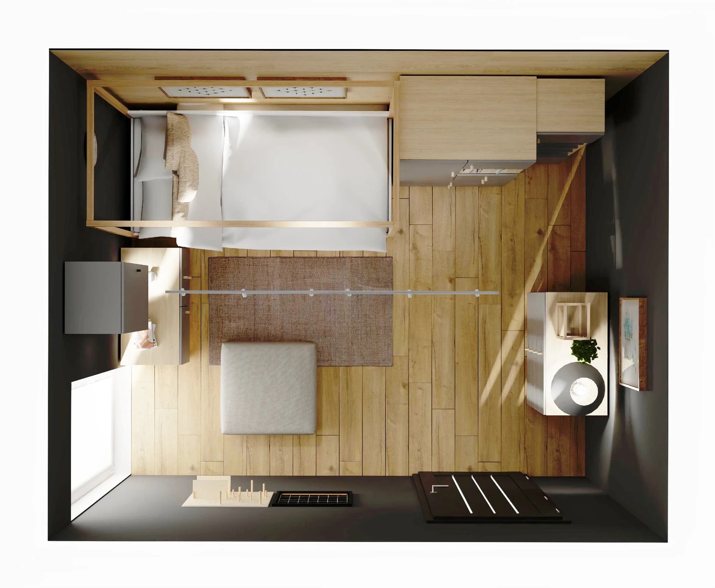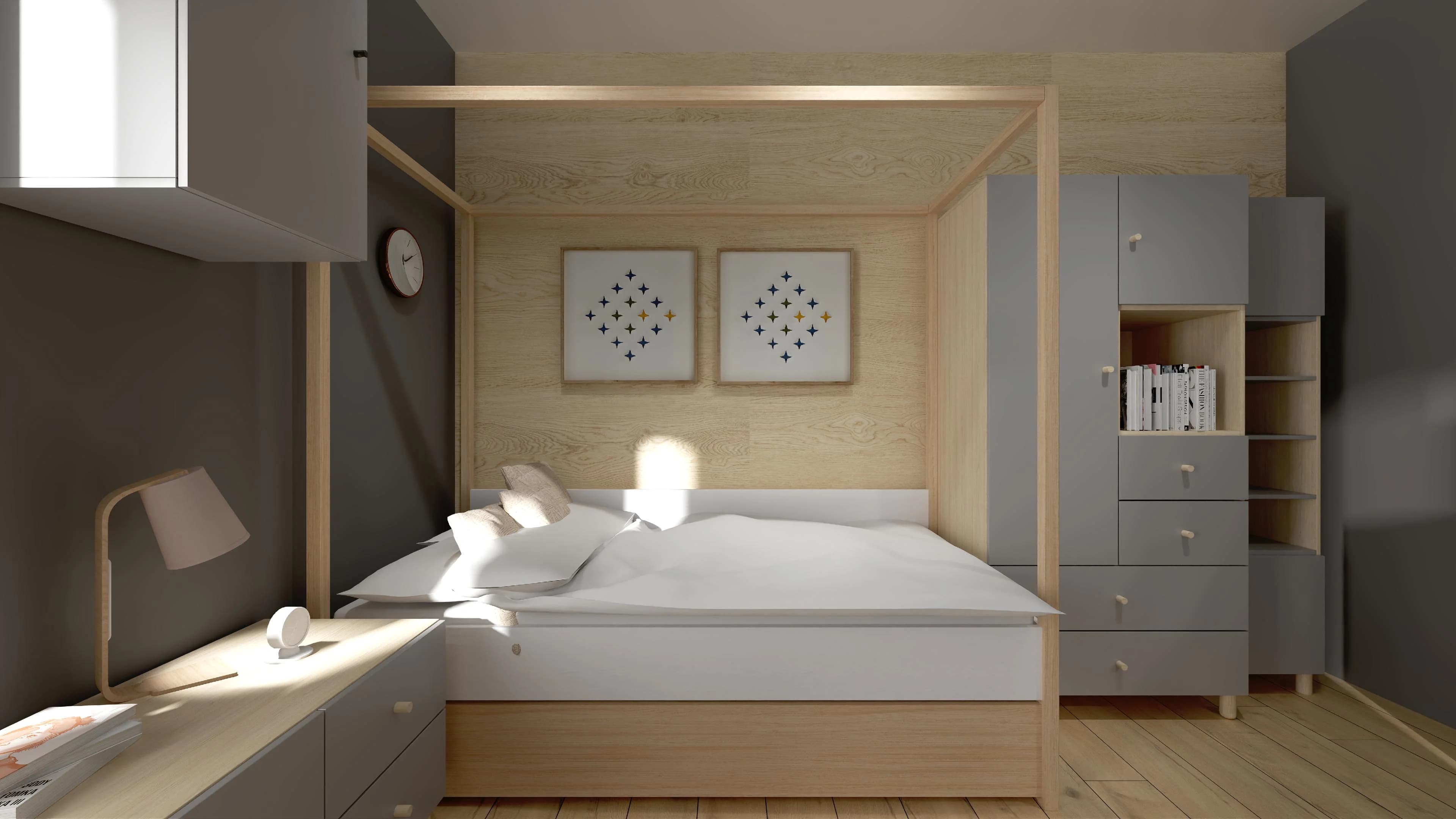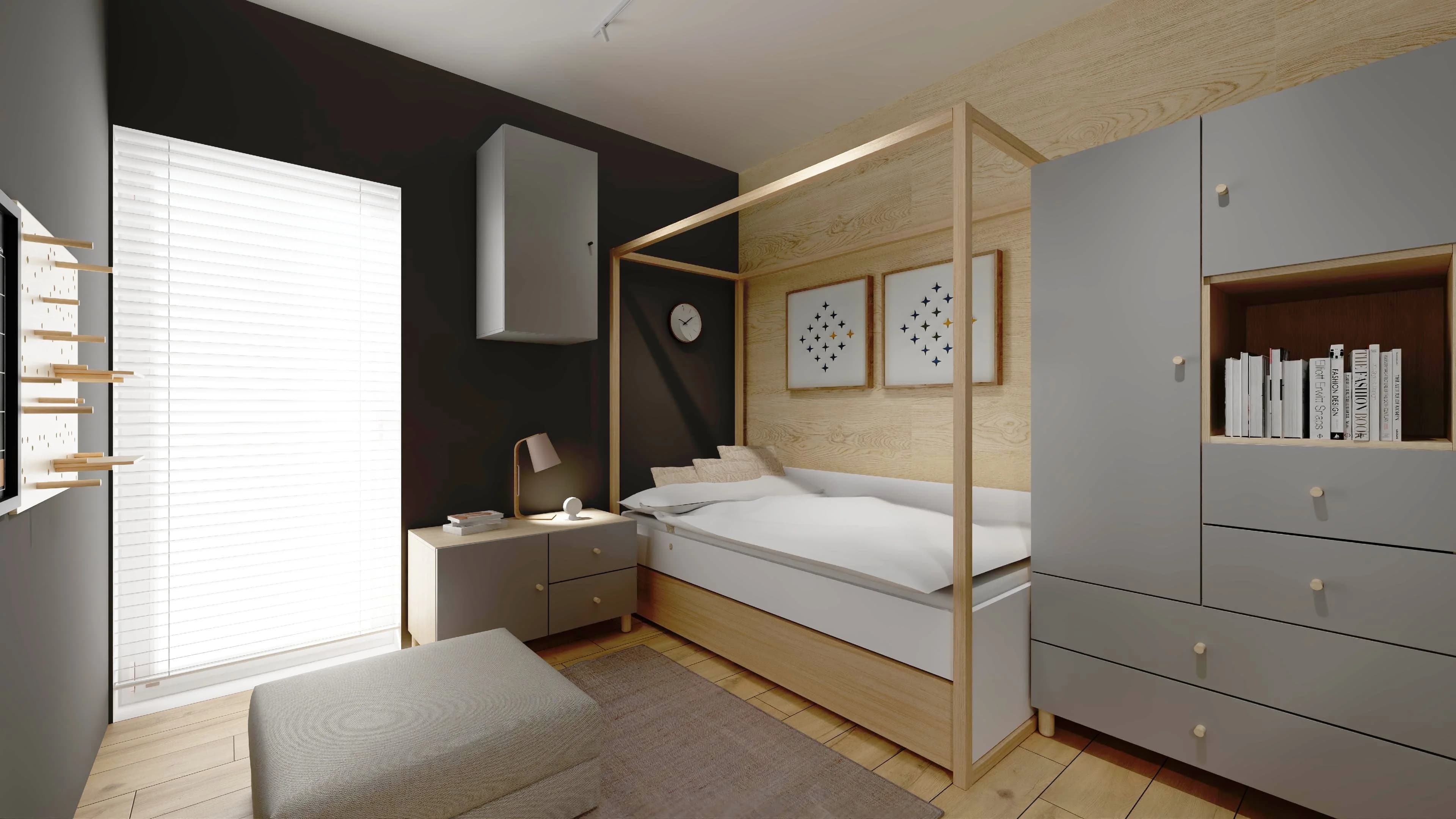 Przytulny pokój, mimo niewielkich rozmiarów, jest funkcjonalny i komfortowy. Pojedyncze łóżko z baldachimem i szufladą na pościel to prawdziwe centrum dowodzenia. W pakownych meblach o praktycznej konstrukcji można zmieścić wiele osobistych drobiazgów i książek. Odpoczynkowi sprzyjają stonowane odcienie szarości oraz jasnego drewna.