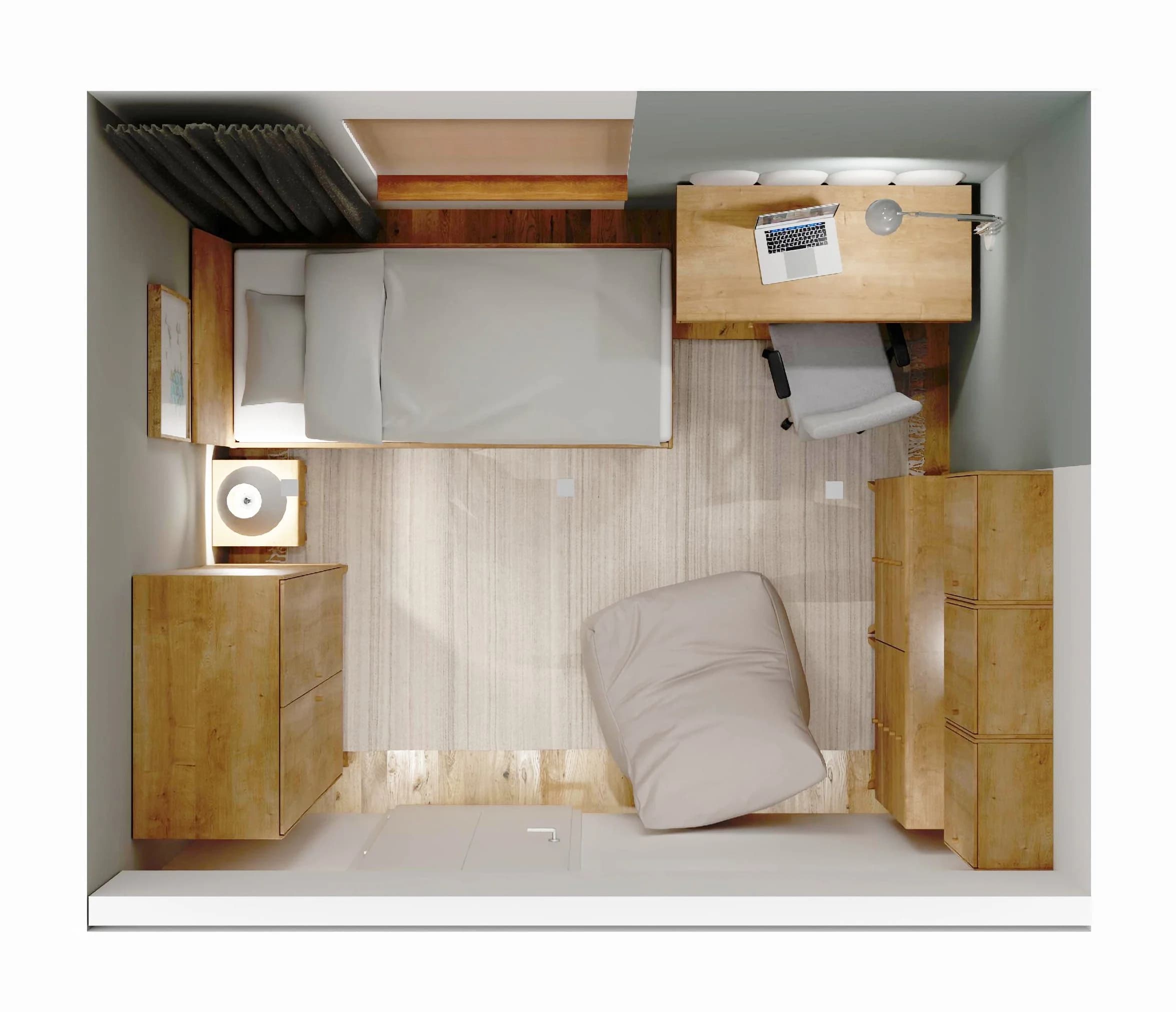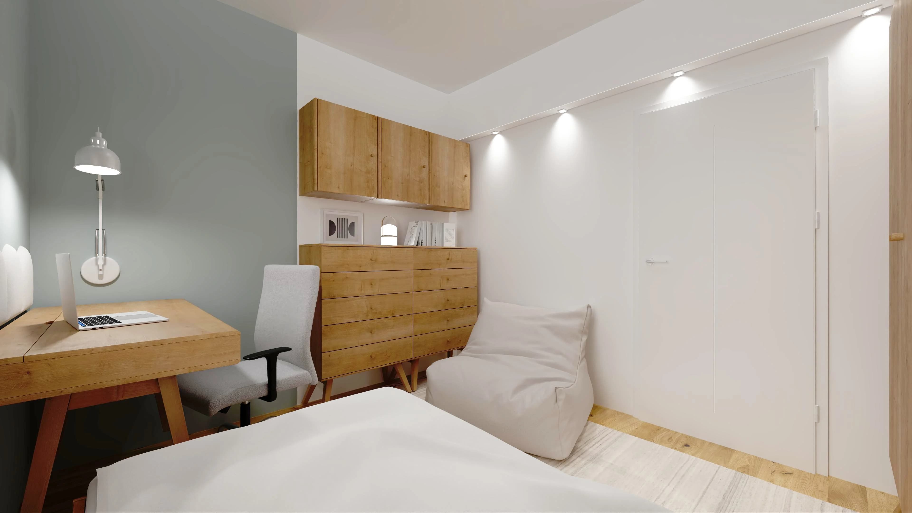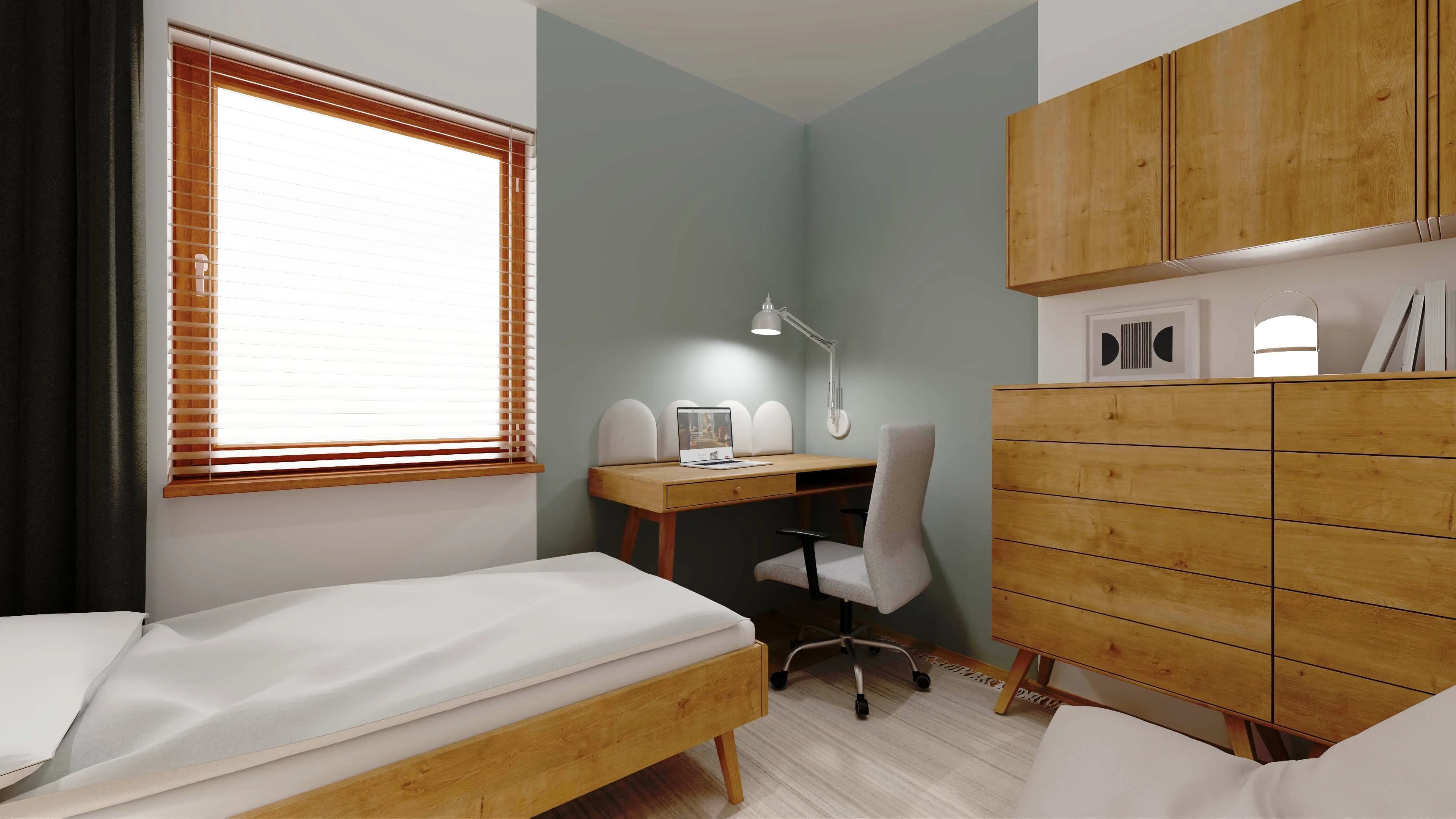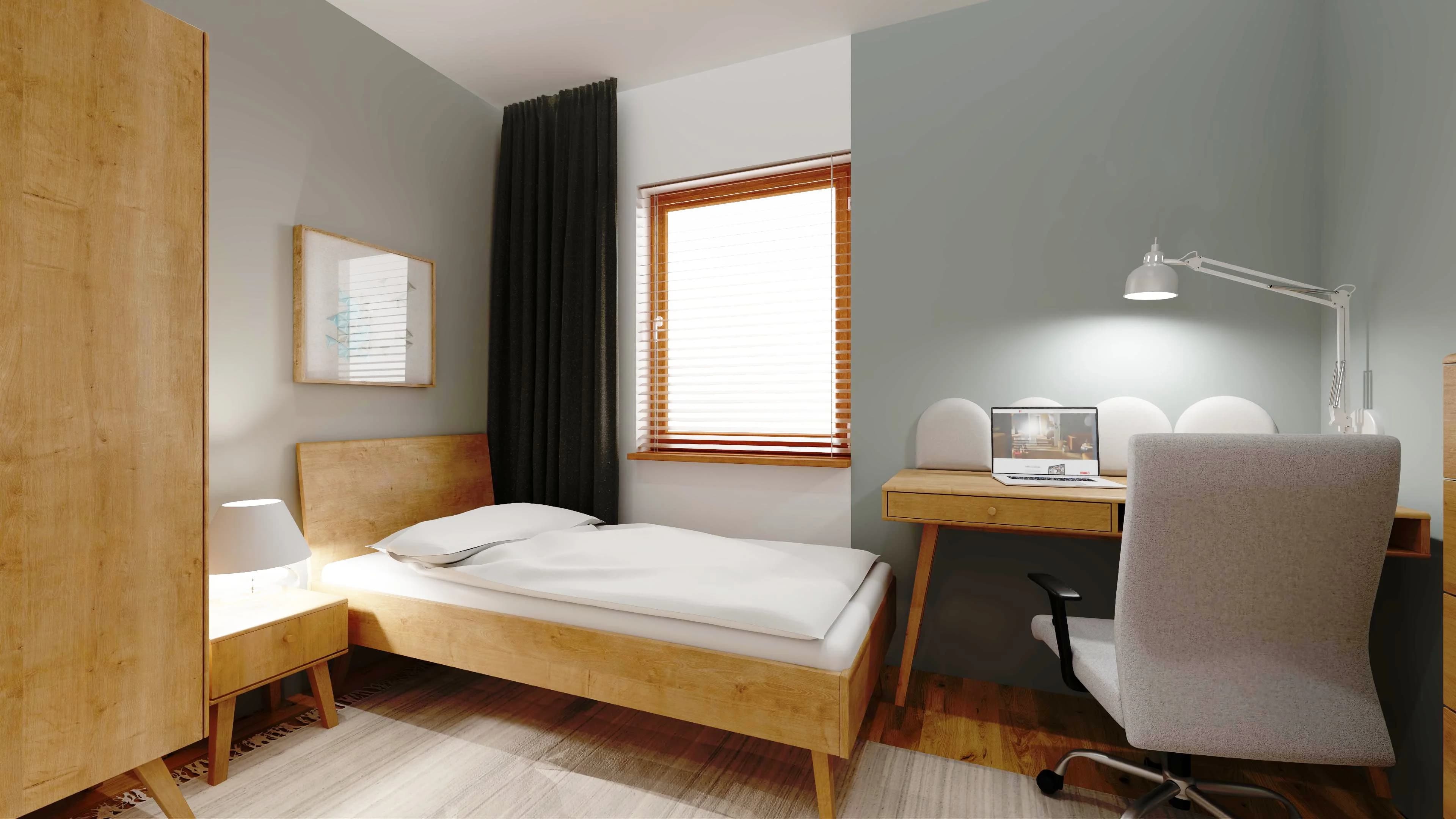 The nature-inspired room is cosy and practical. The small size of the interior is compensated for by the packable oak-coloured furniture, which offers plenty of storage space. A bed with a high headboard and a handy bedside table provide comfortable rest. Studying and pursuing one's passions is facilitated by a desk with a fence of upholstered panels along the wall.