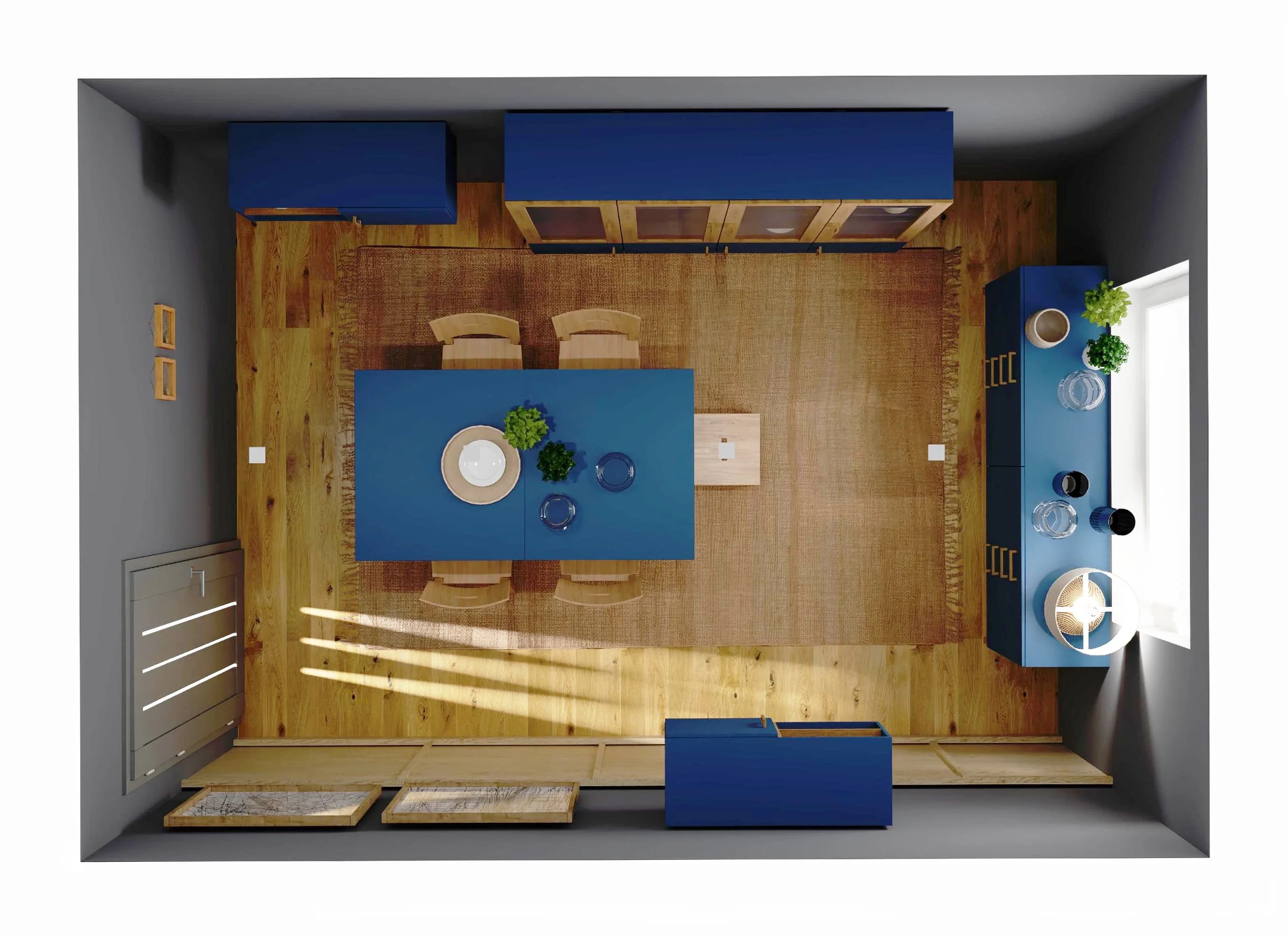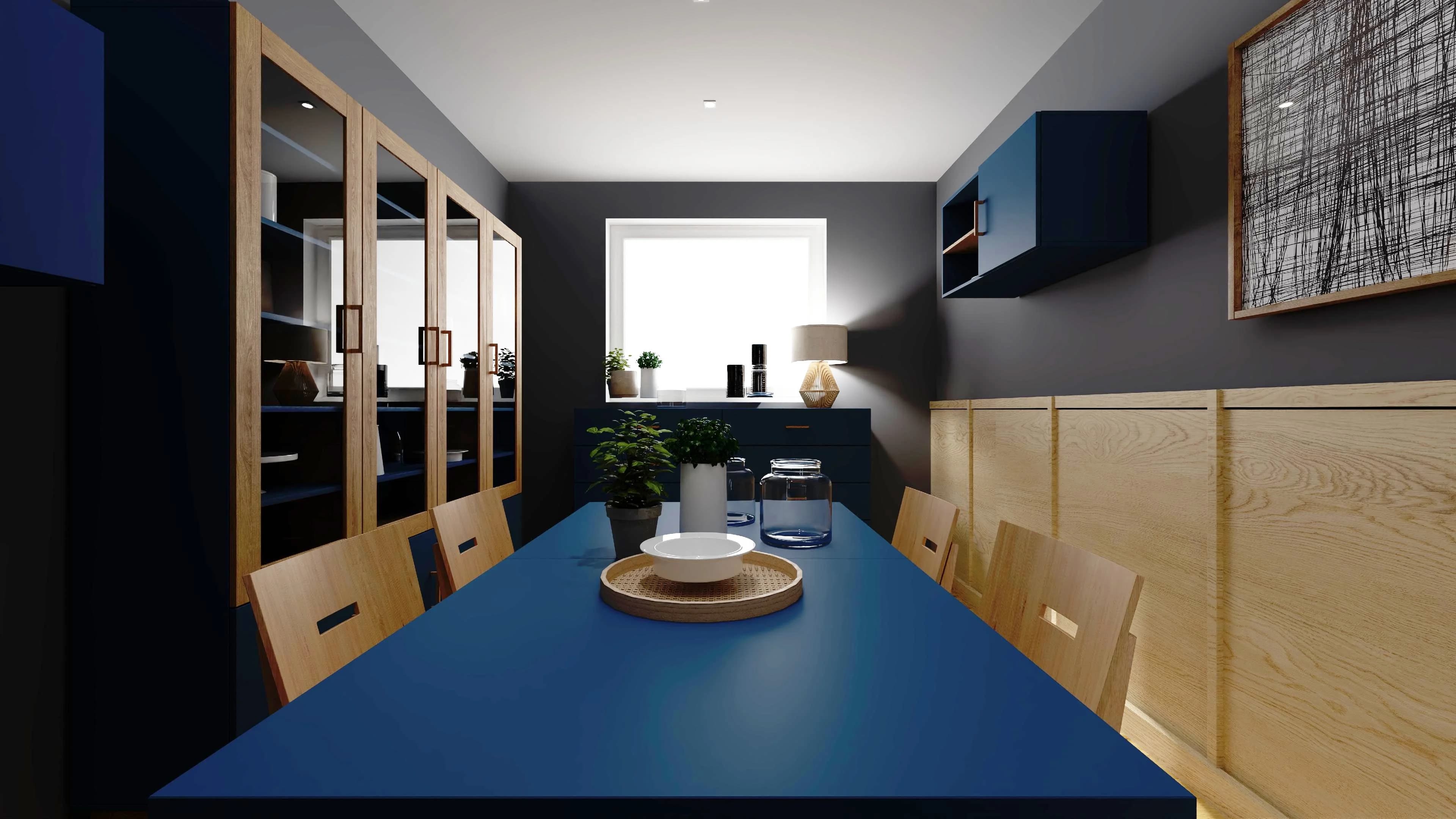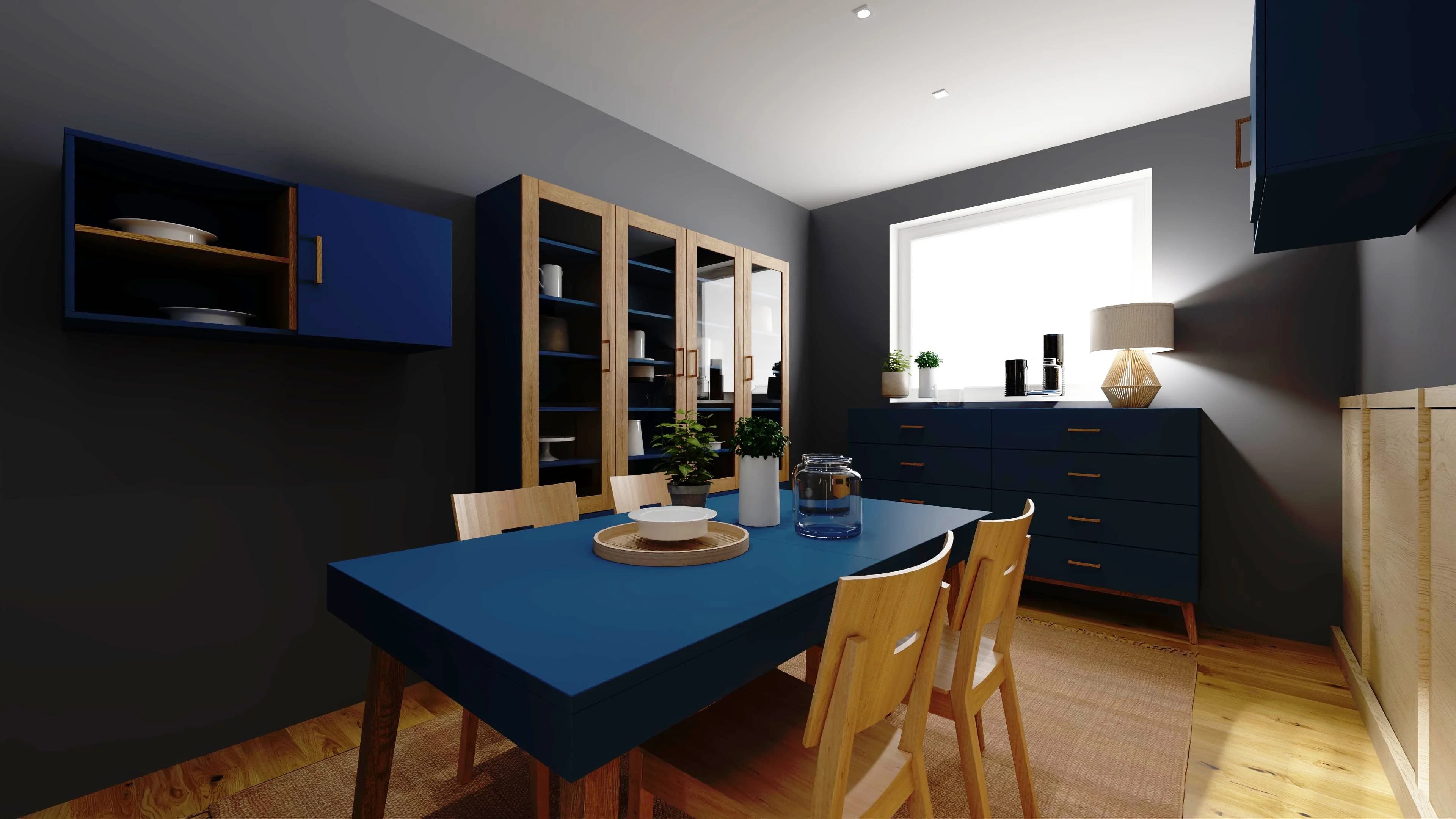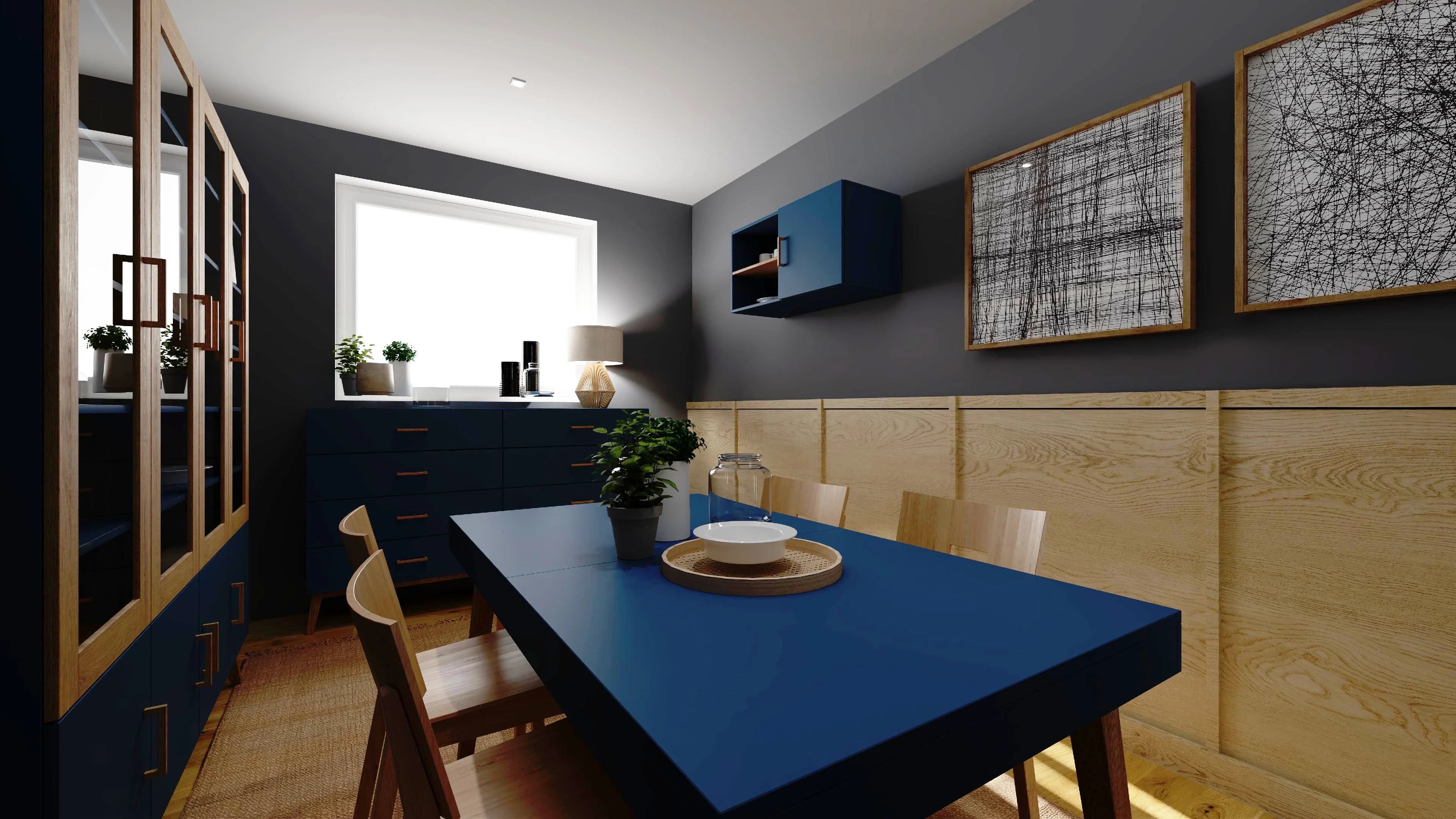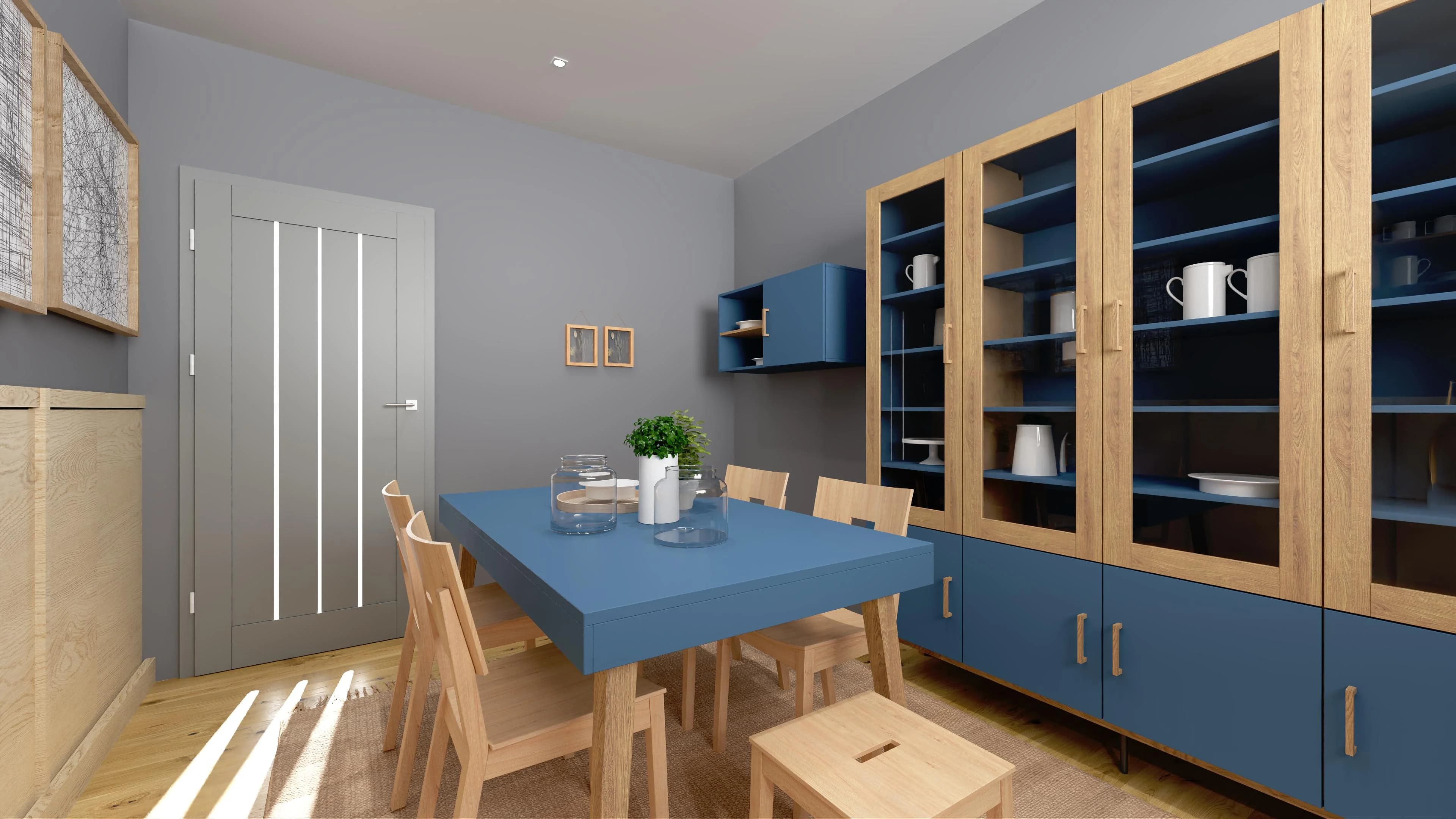 Niewielka jadalnia w stylu marynistycznym przyciąga uwagę nieszablonowym zestawieniem kolorów. Niebieskie meble dodają wnętrzu uroku i pięknie komponują się z barwą drewna oraz naturalnymi dodatkami. Pojemne witryny pozwalają jednocześnie eksponować i przechowywać, a dzięki wiszącym szafkom udało się zaoszczędzić miejsce na podłodze.