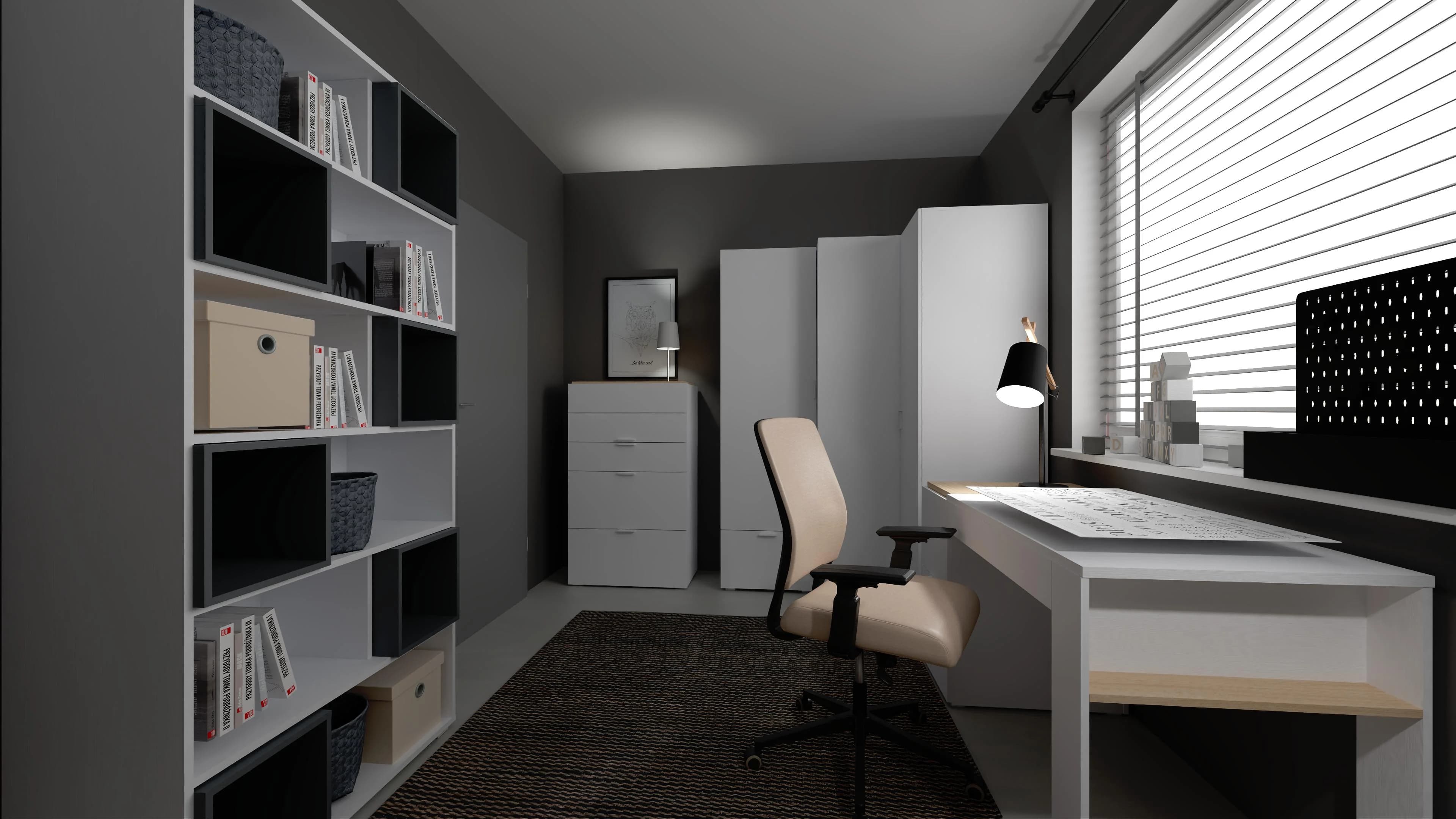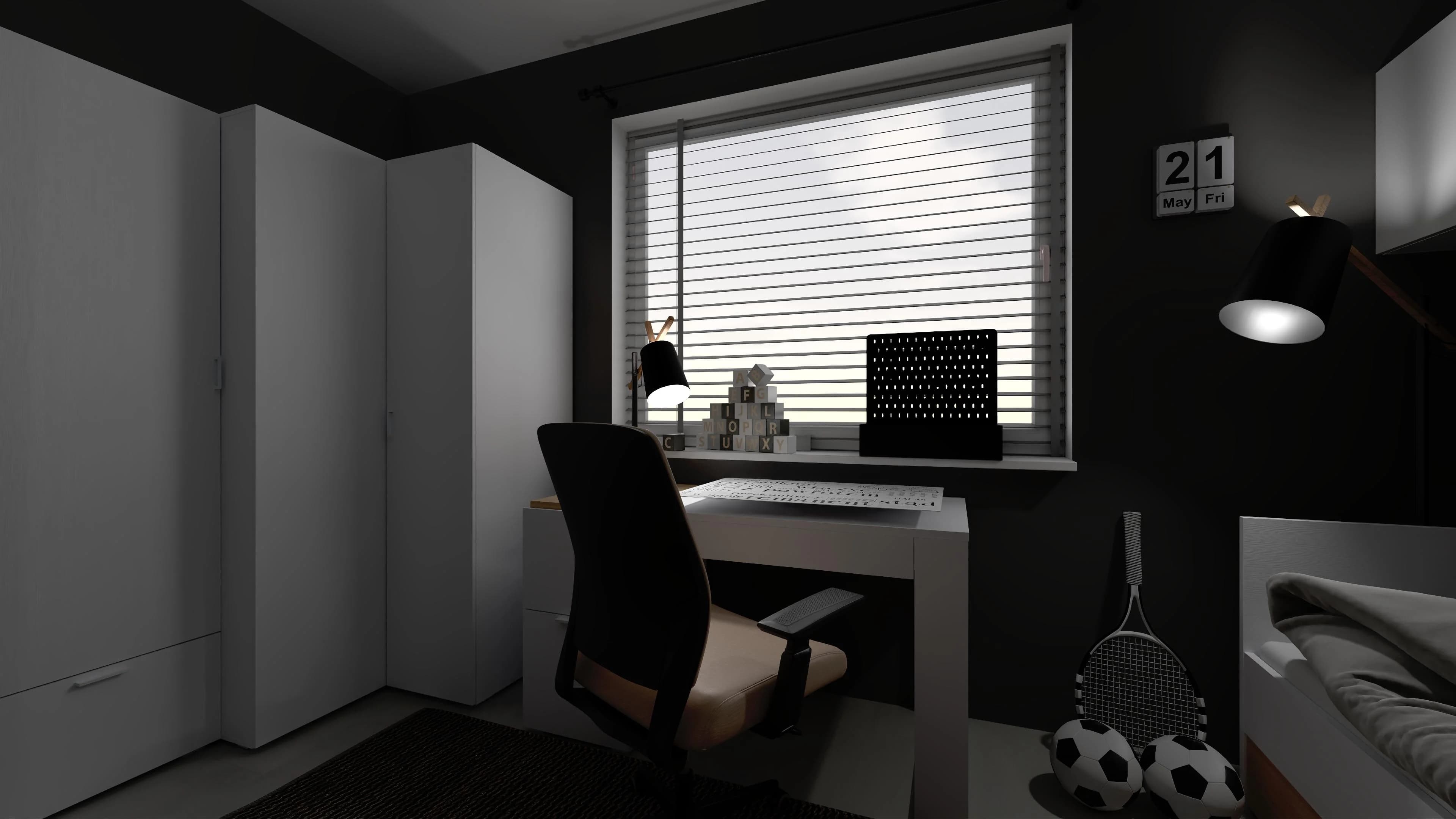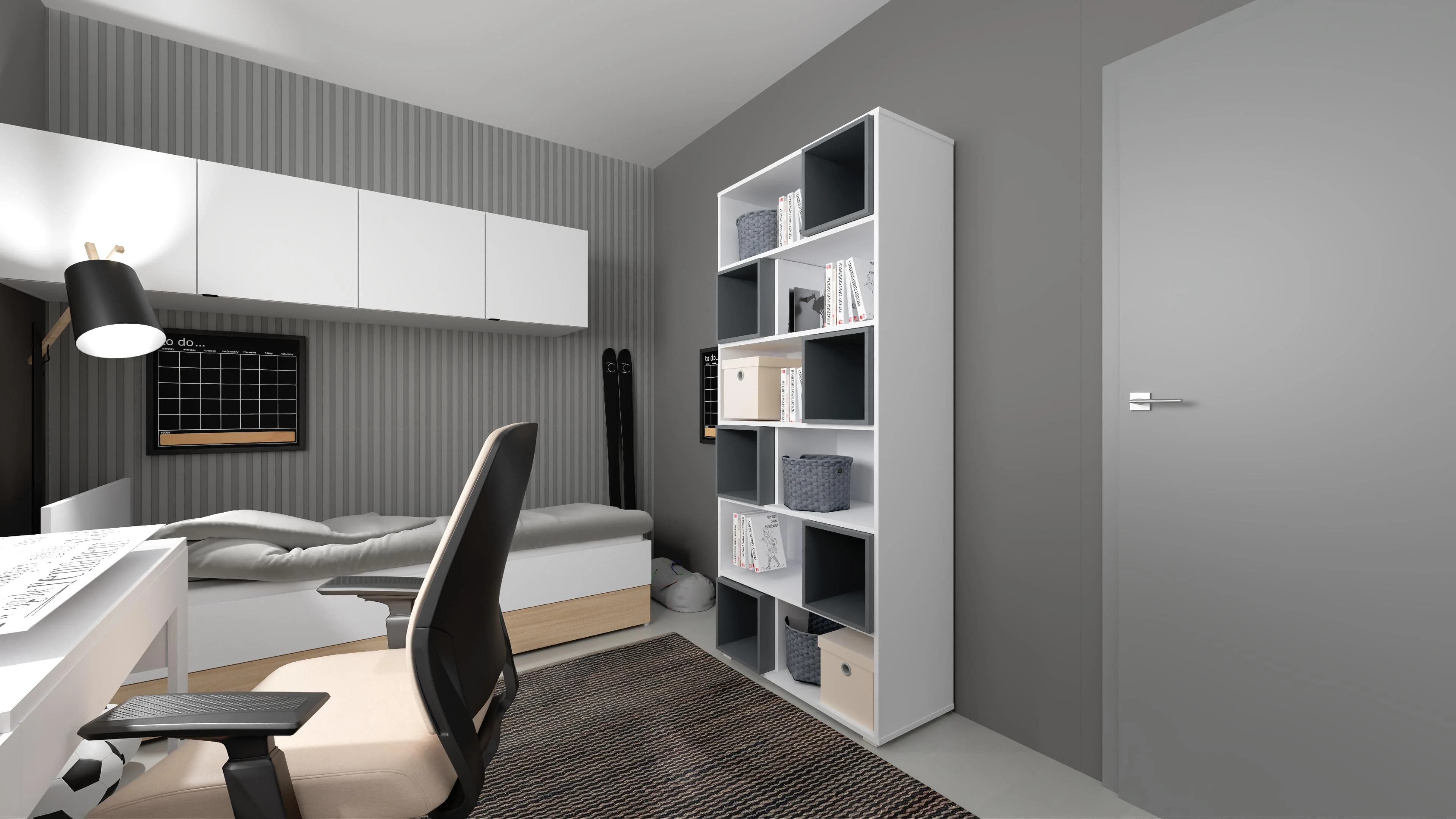 Monochromatic colours of black, grey and white lead the way in this practical room, which is broken up by warm wood tones. Space for clothes, books and gadgets can be found in the corner wardrobe, bookcase and cupboards. The desk set by the window provides a comfortable space for studying and developing one's passions. A large carpet provides warmth underfoot.
