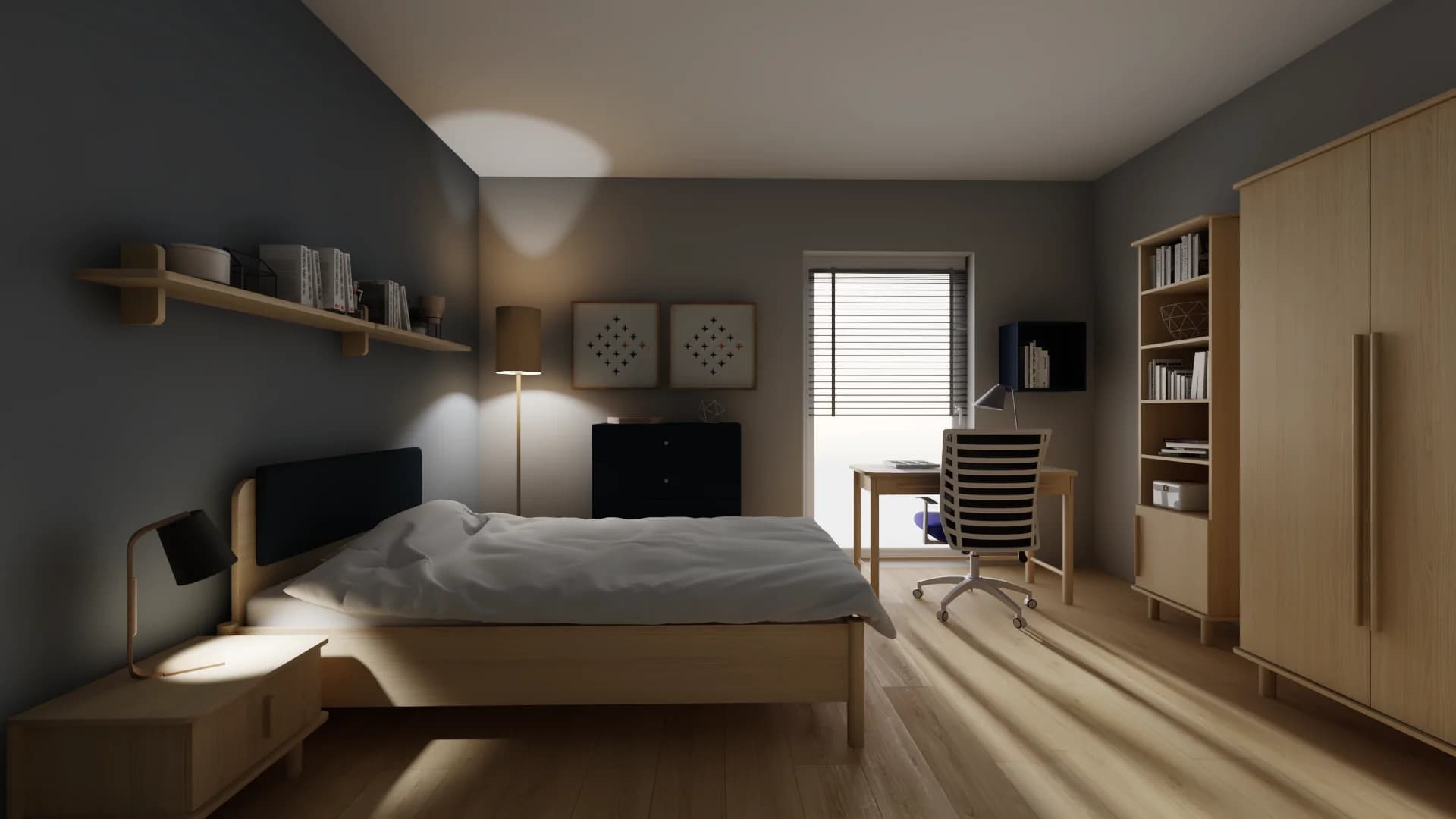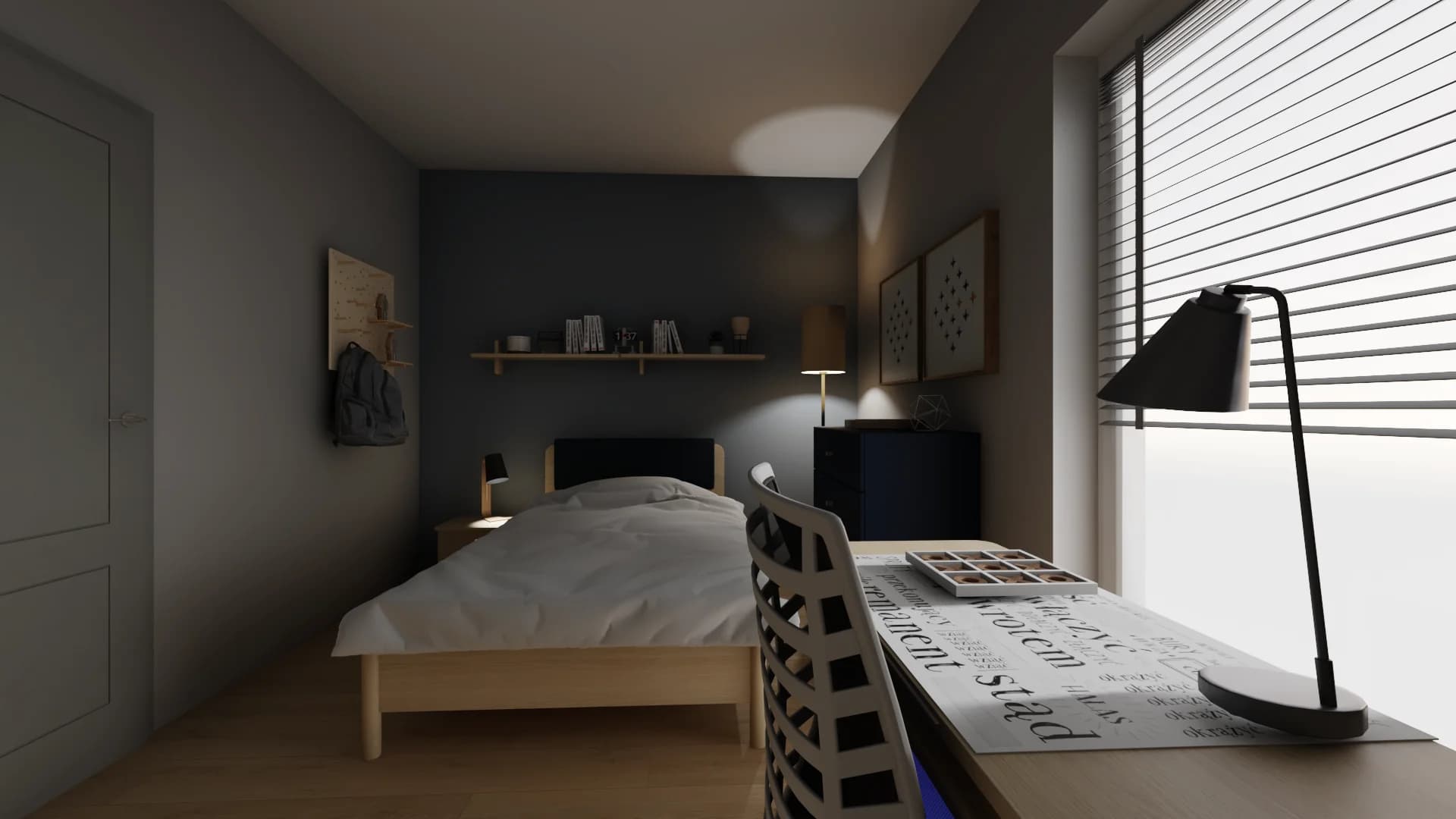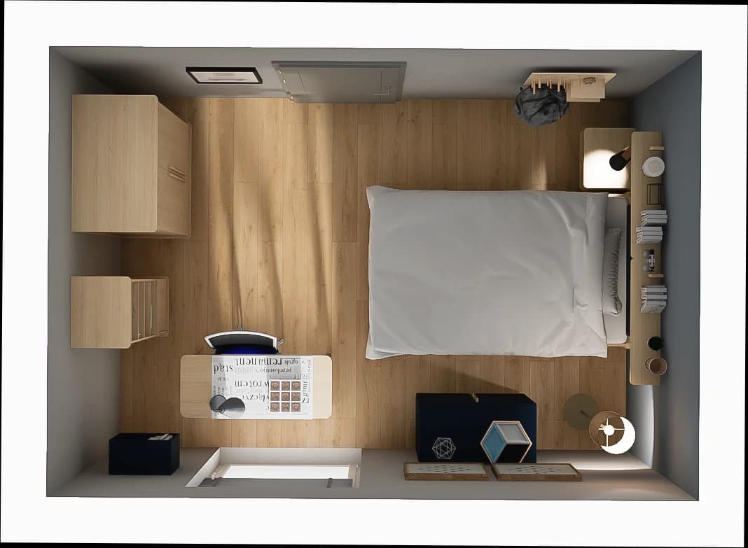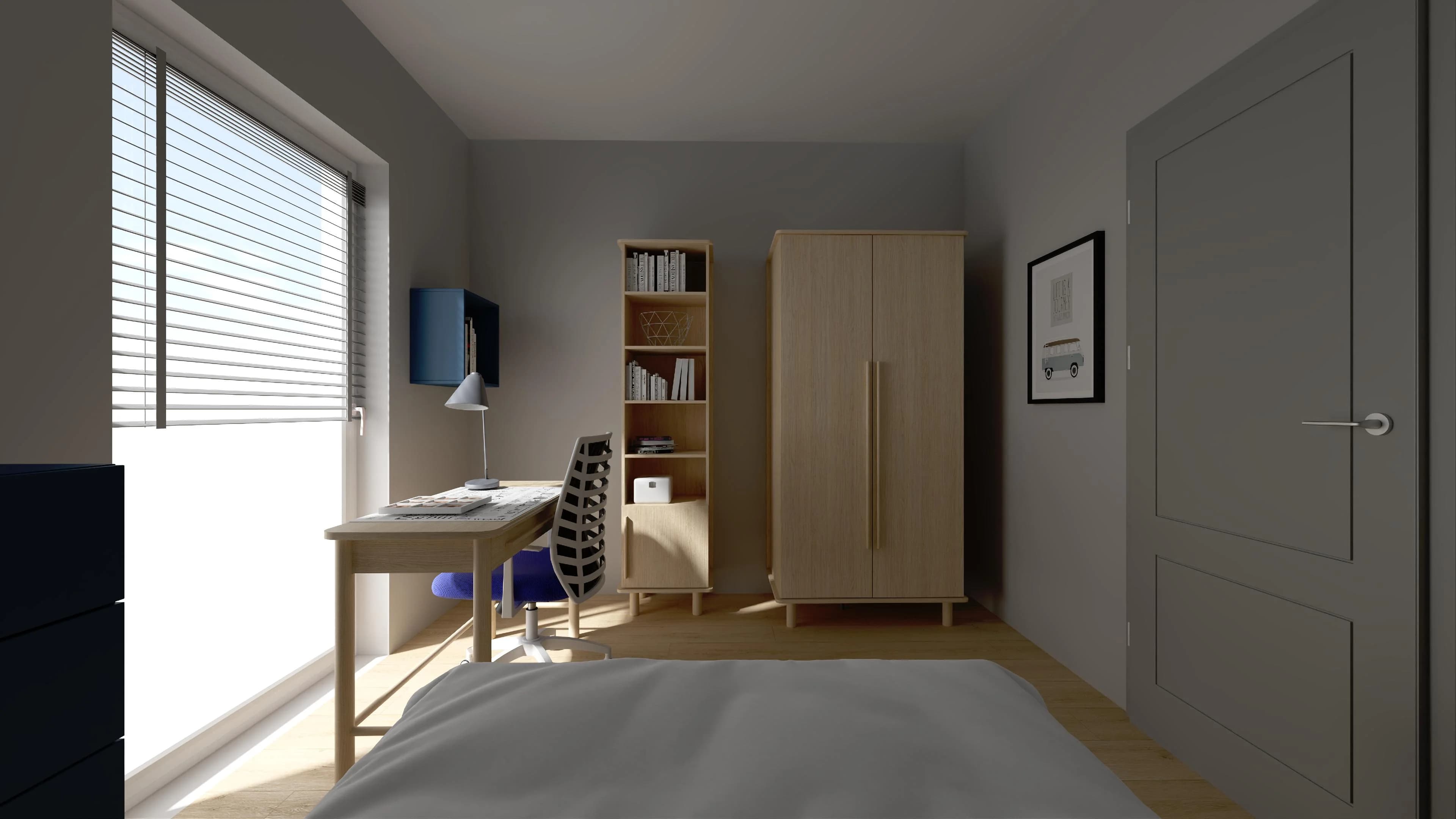 The minimalist room, despite its small dimensions, surprises with its functionality. A comfortable rest is provided by a bed with an upholstered cushion on the headboard and a handy bedside table. A desk with a swivel chair stands right next to the balcony window, creating a comfortable place to study. The roomy wardrobe with lighting has space for all your clothes.