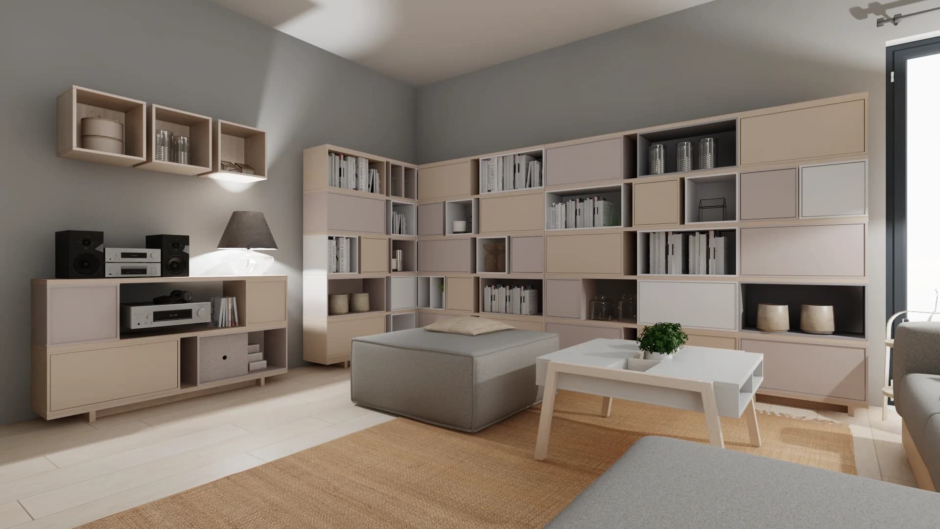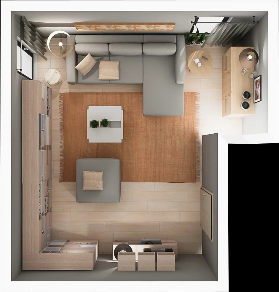 This living room has many clever features. The modern built-in shelving provides plenty of storage space. The spacious corner sofa offers a comfortable space for relaxation. The comfort of rest is enhanced by the handy tables. The cosy atmosphere of the interior is ensured by spot lighting and a large carpet, giving a pleasant warmth underfoot.