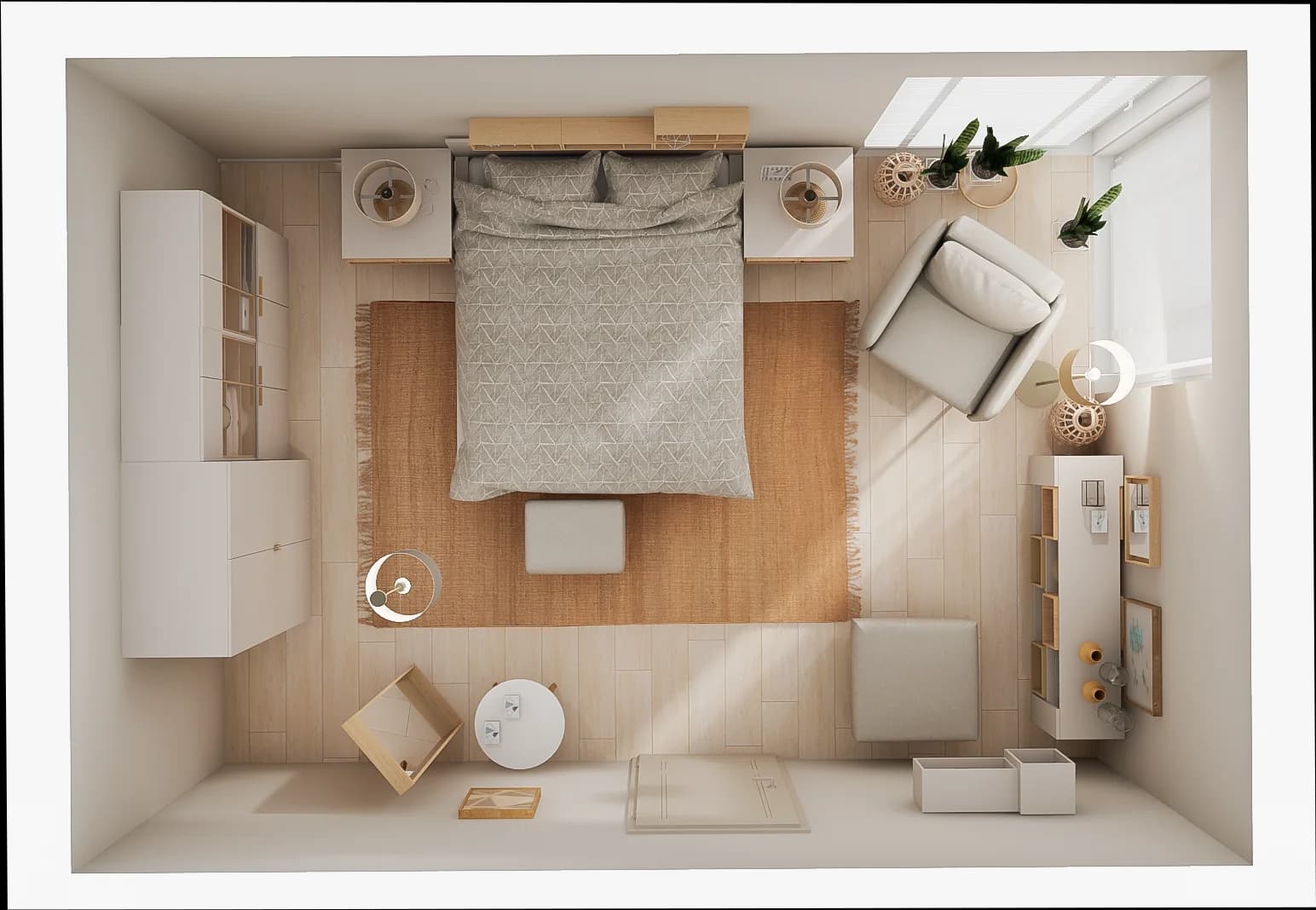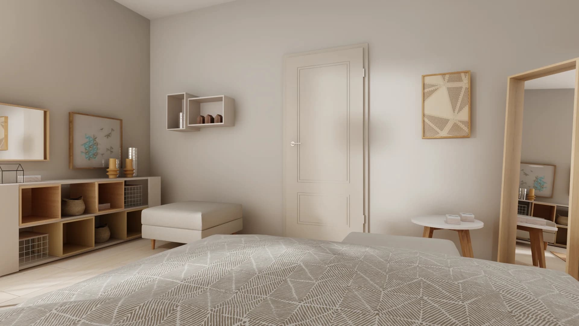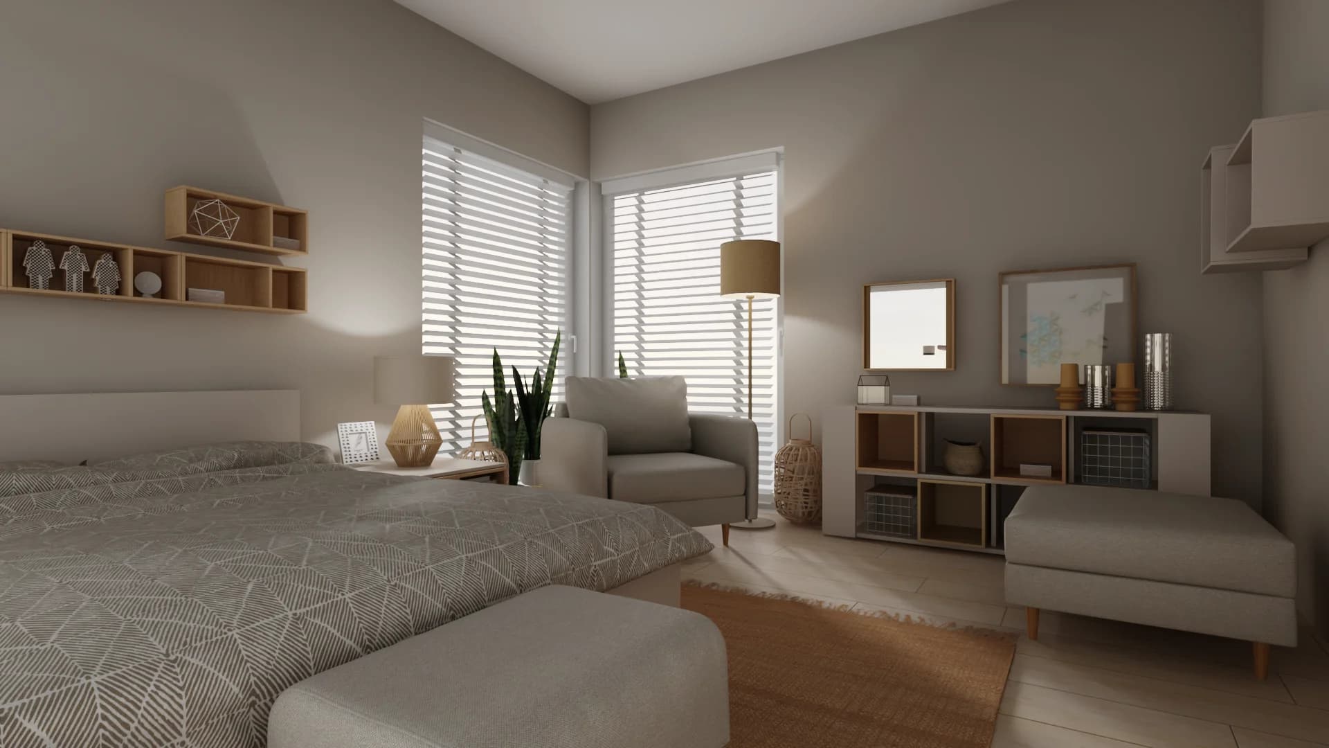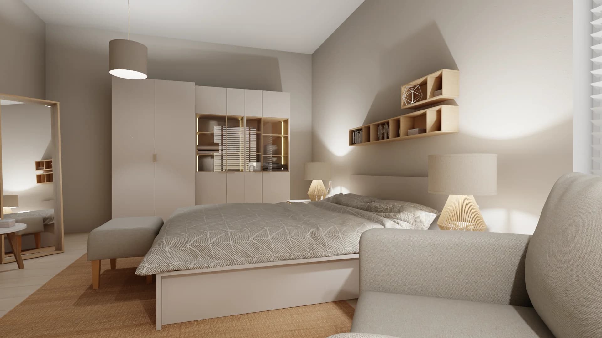 In this cosy bedroom, relaxation comes on its own. It is fostered by the soothing beige colours on the walls, furniture and in the accessories, which together form a harmonious whole. At the centre of the interior is a bed for two with a functional headrest and a company of practical bedside tables. Right next to it is a comfortable armchair on which you can sit with a book in hand.