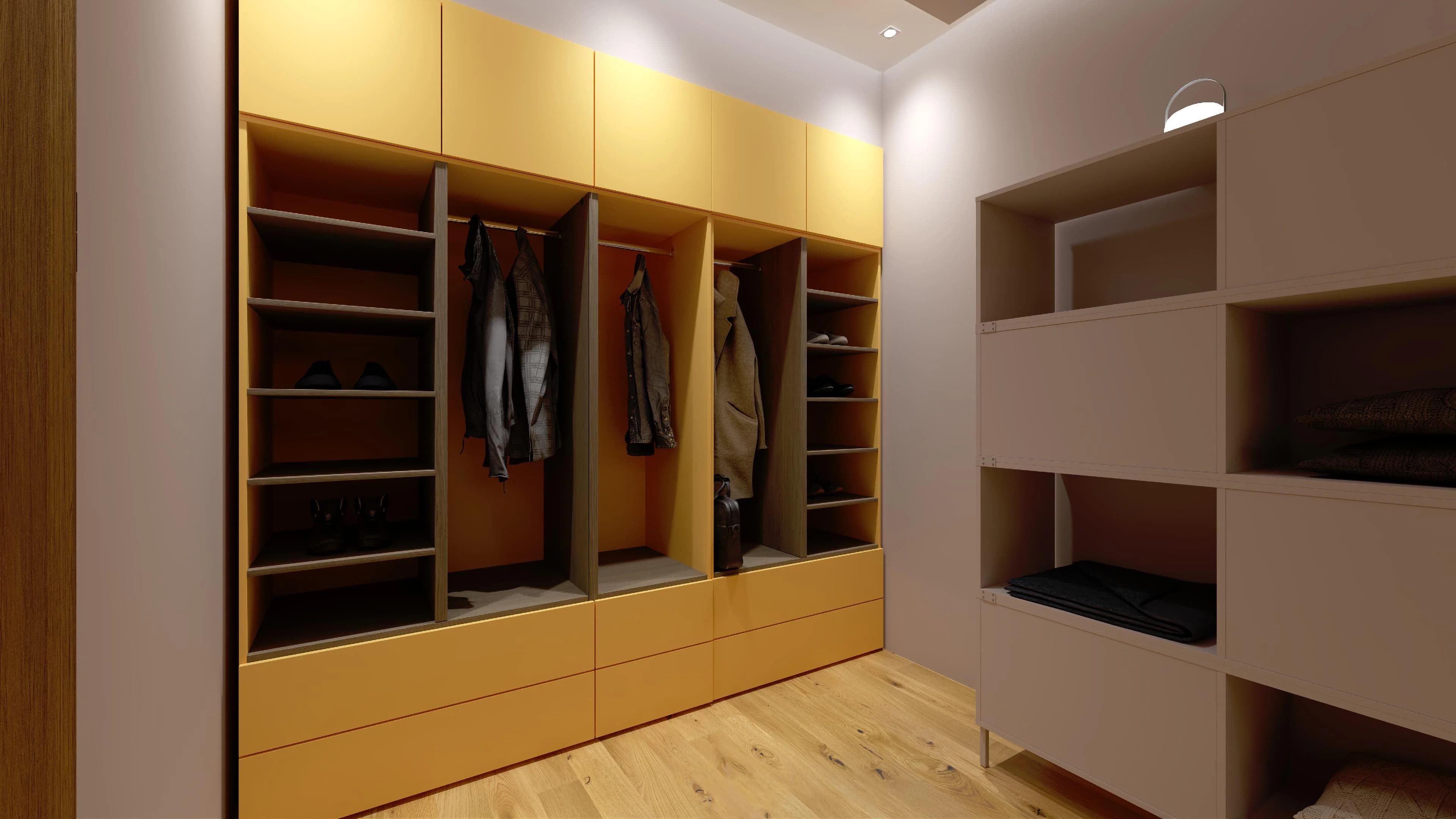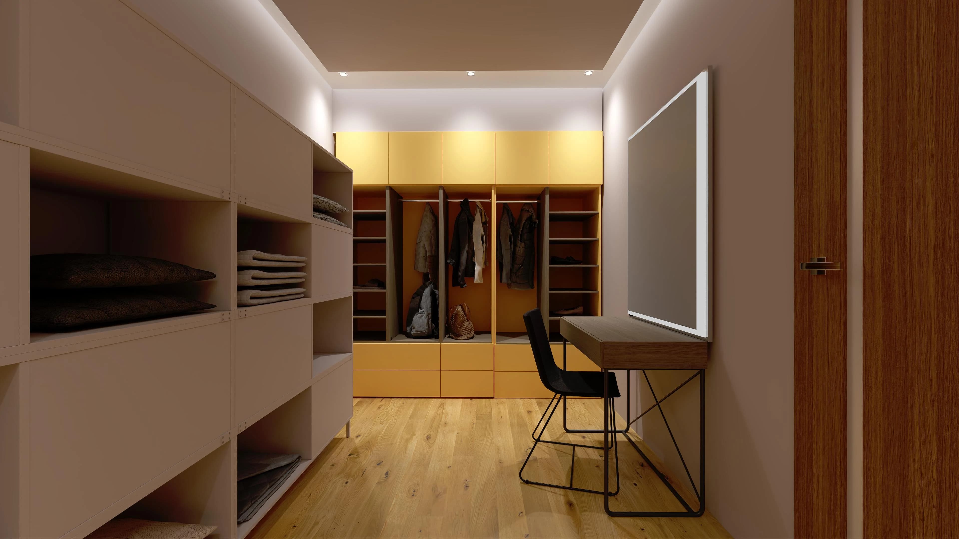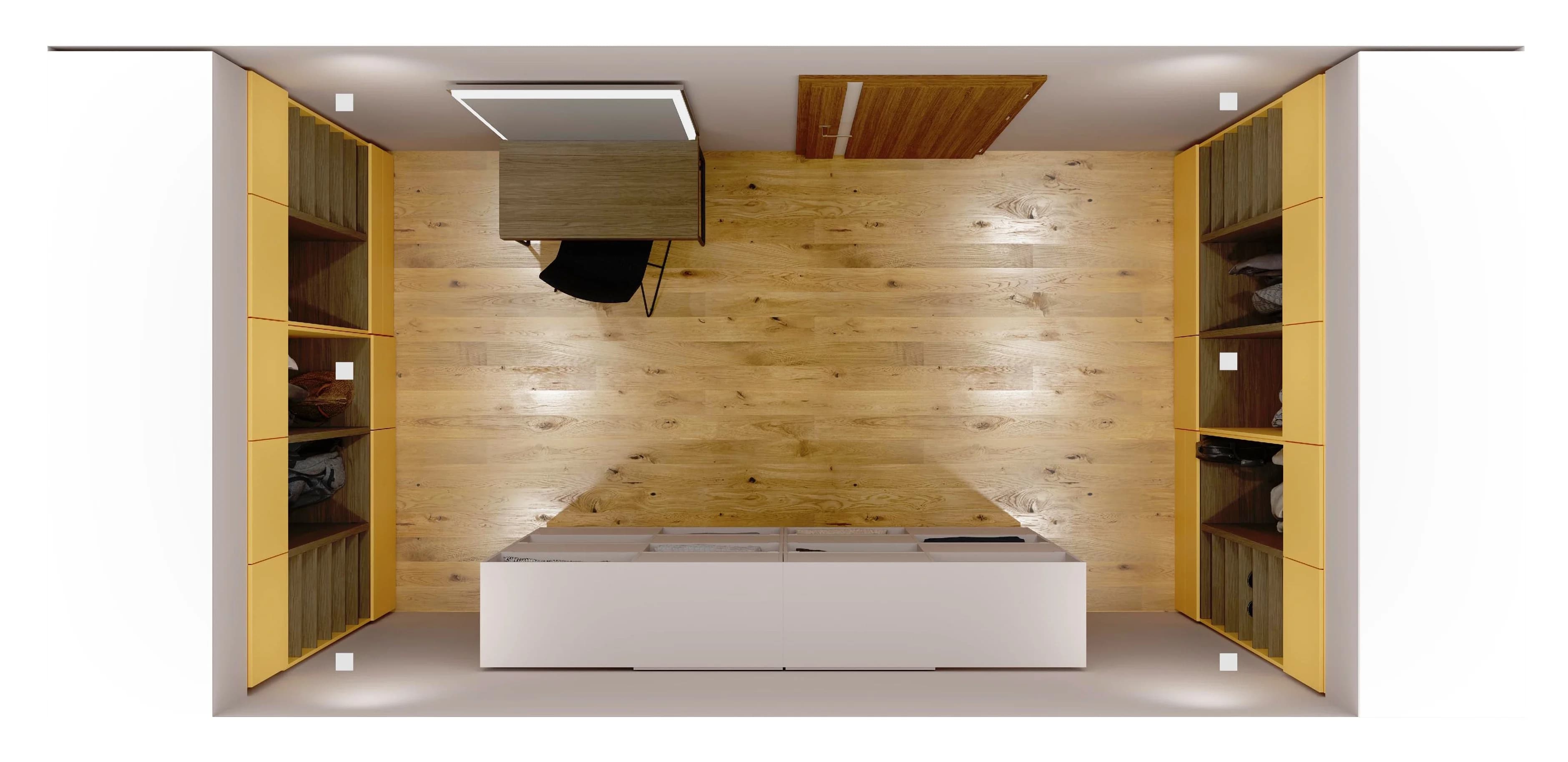 In this small room, furniture designed for storing clothing and accessories takes the lead. Spacious wardrobes with drawers and bookcases with open shelves offer plenty of space for organising wardrobe items. You can sit comfortably at the tasteful dressing table with wall-mounted mirror. The cosy feel of the interior is provided by the warm wood floor.