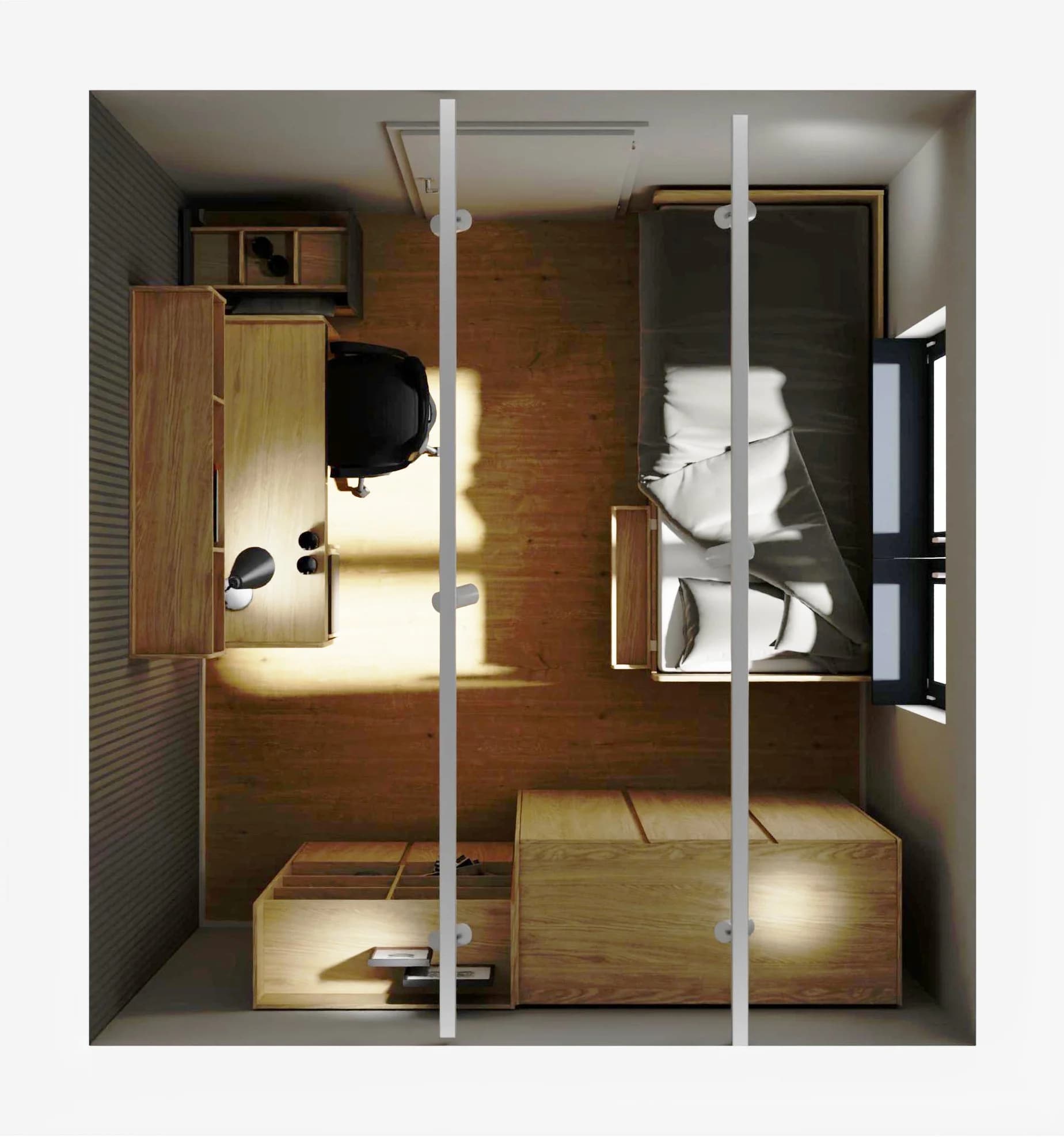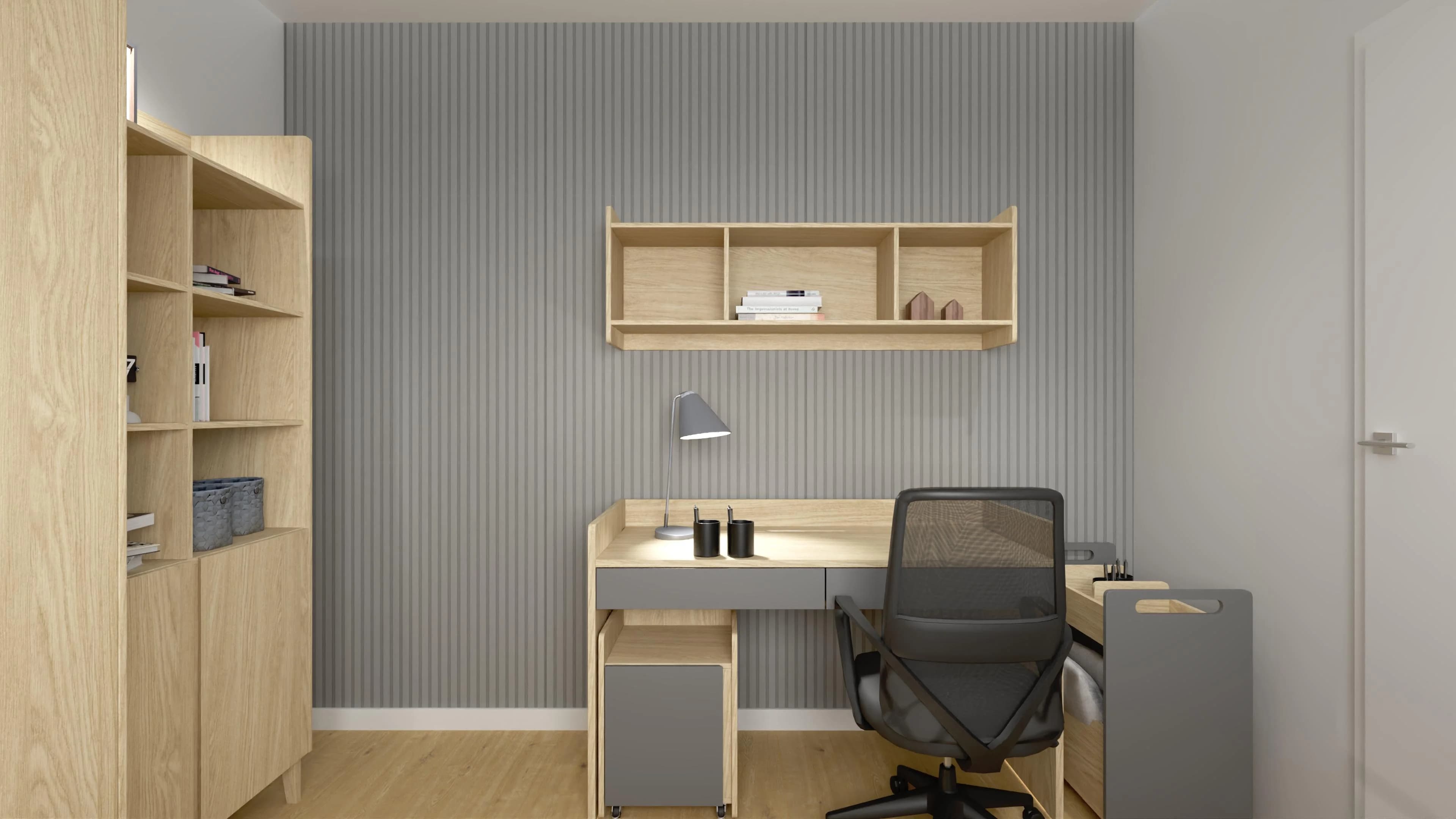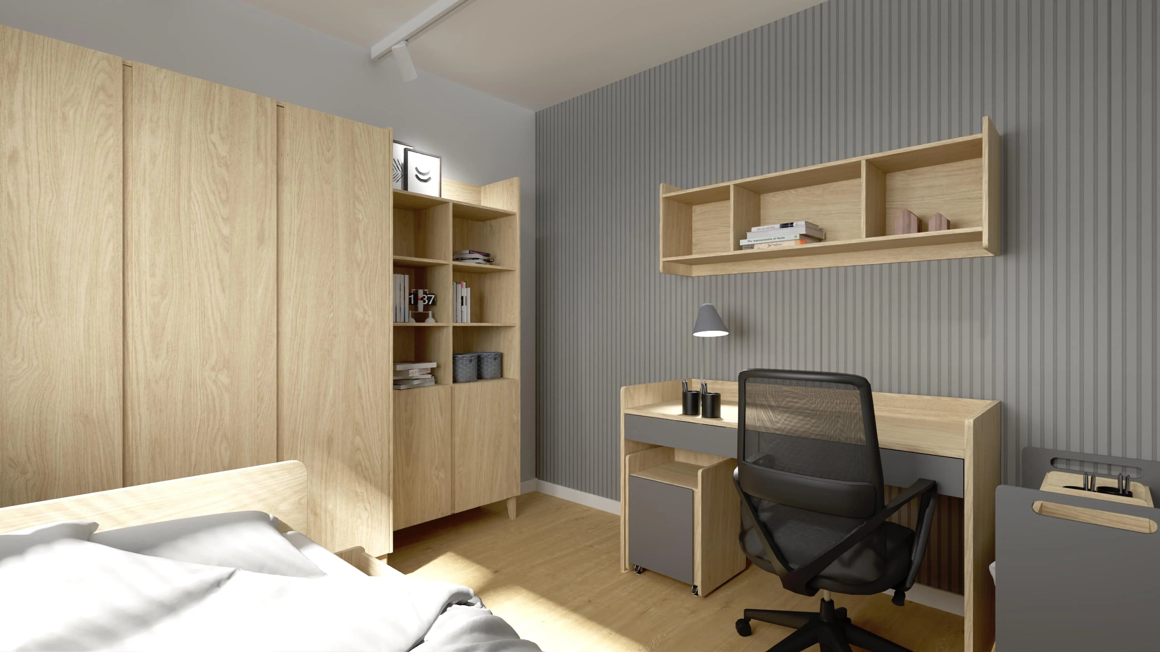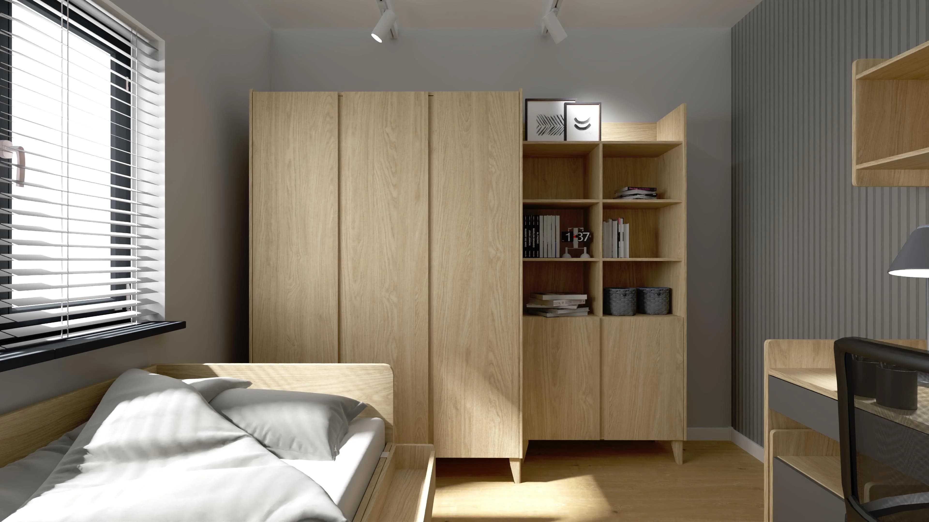 Pokój młodzieżowy, czerpiący inspirację z natury, łączy w sobie przytulność i funkcjonalność. Mimo niewielkiego metrażu, pojemne meble w dekorze drewna i grafitu zapewniają sporo miejsca do przechowywania. Za komfort snu odpowiada łóżko z podręczną szufladą. Do nauki i rozwijania zainteresowań służy biurko z wygodnym fotelem i mobilnym stolikiem na gadżety.