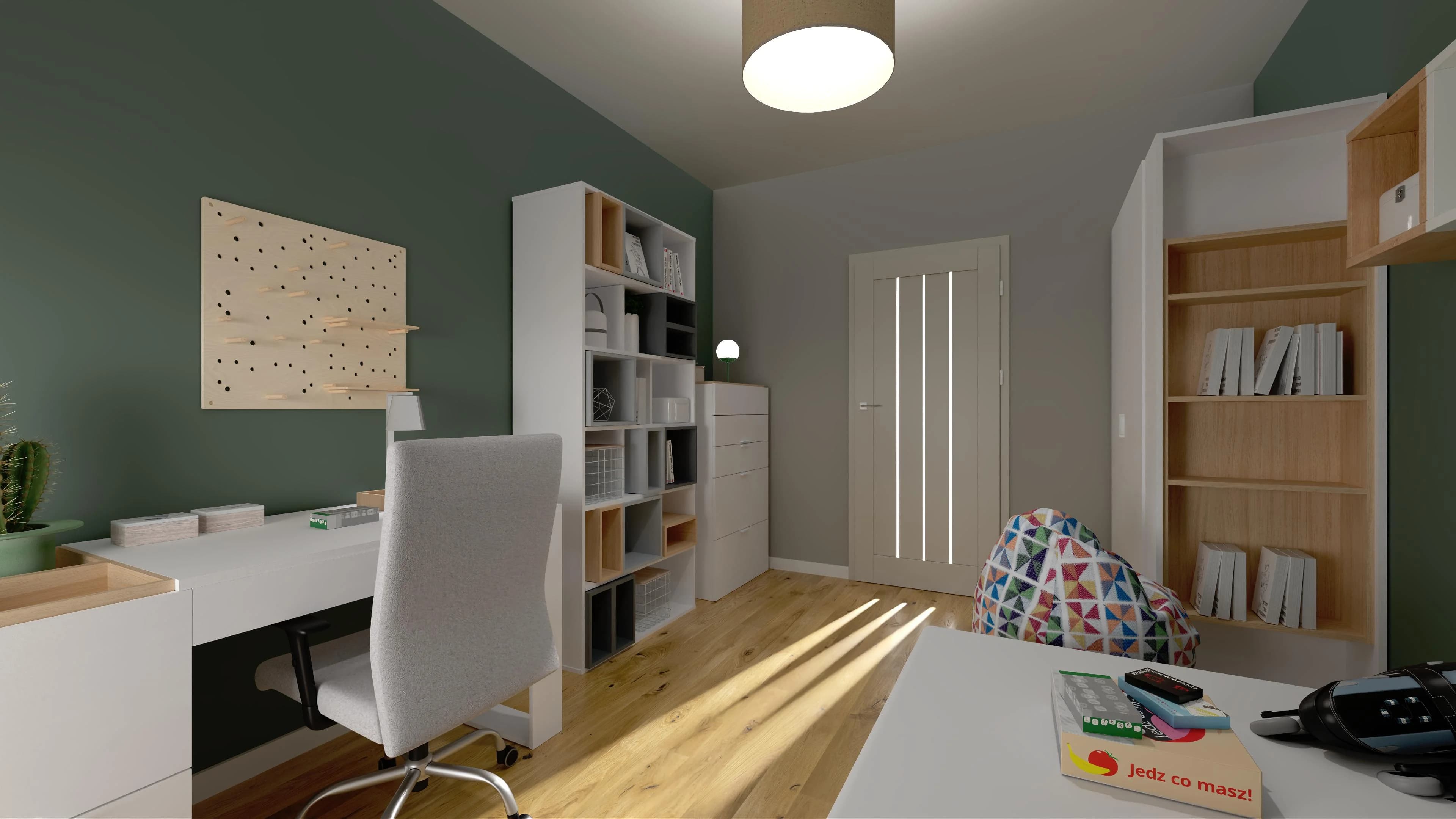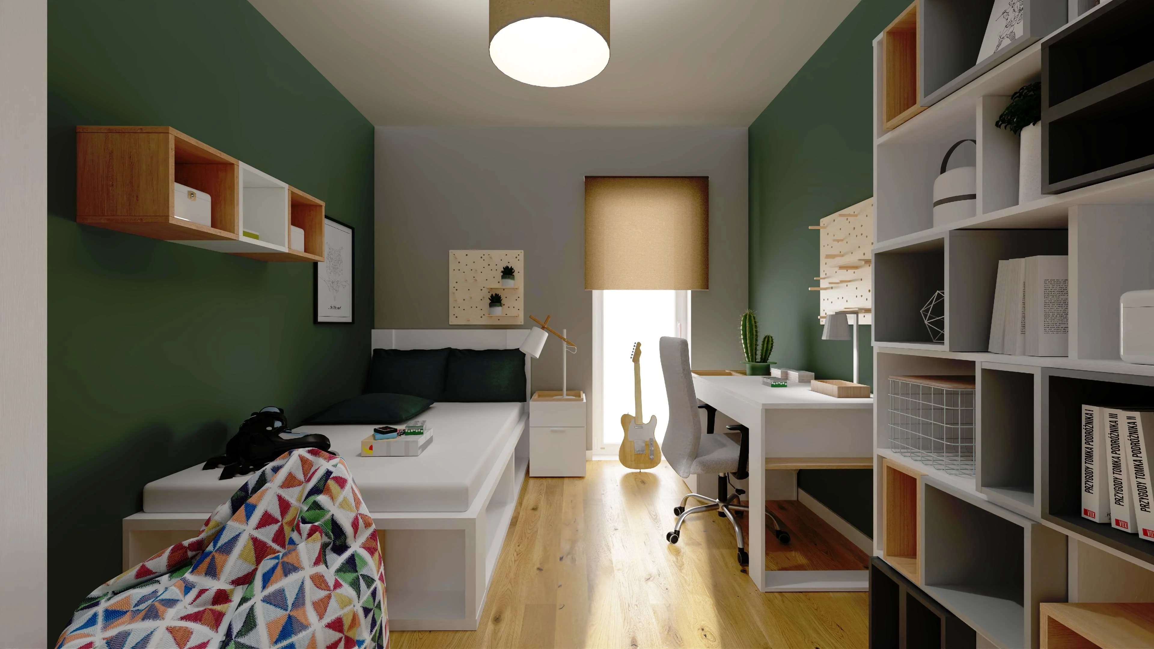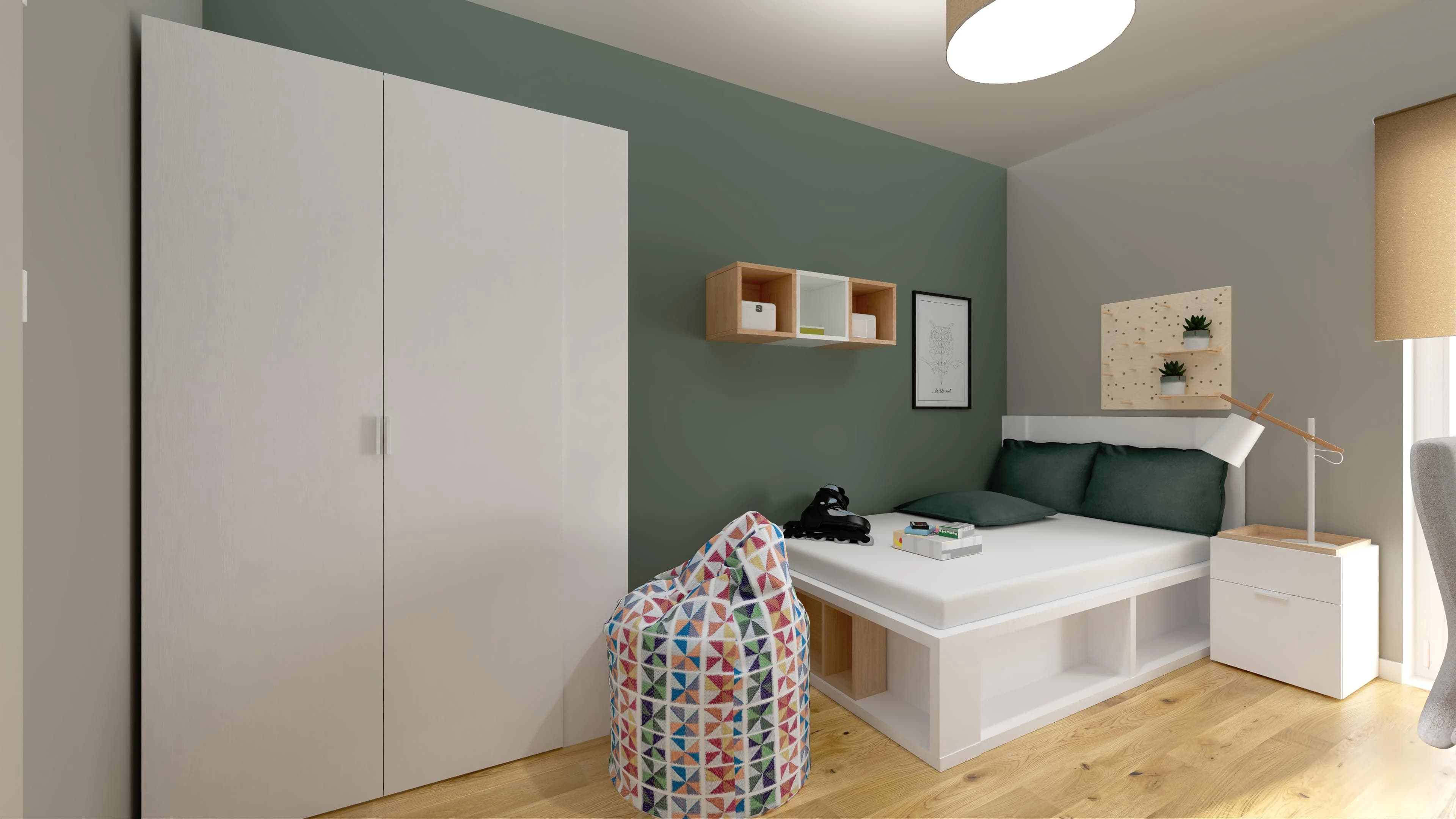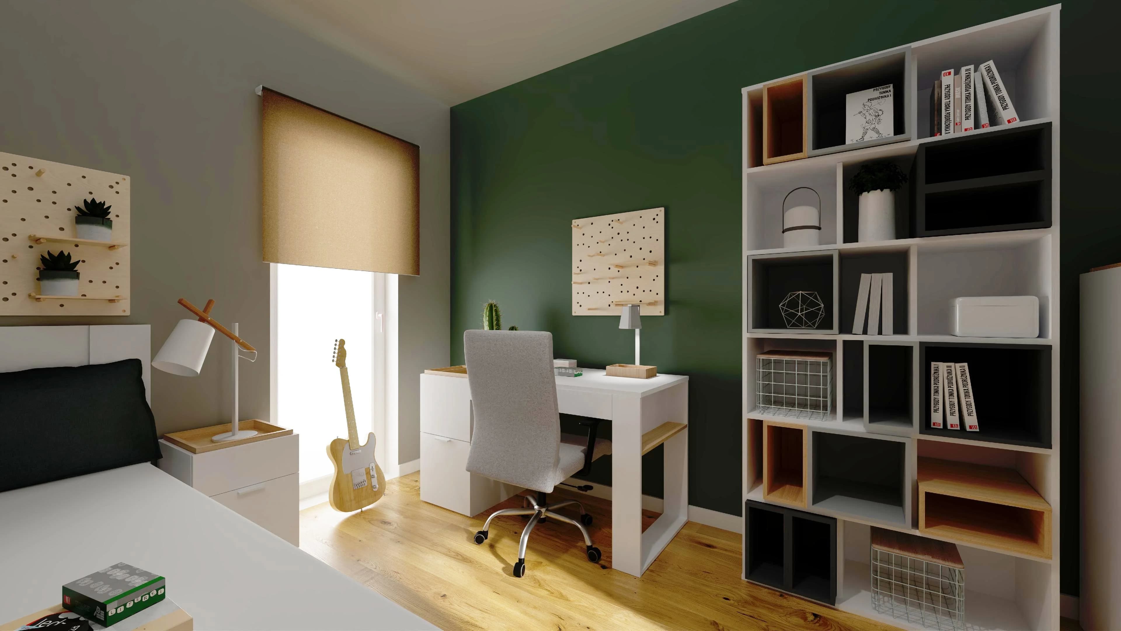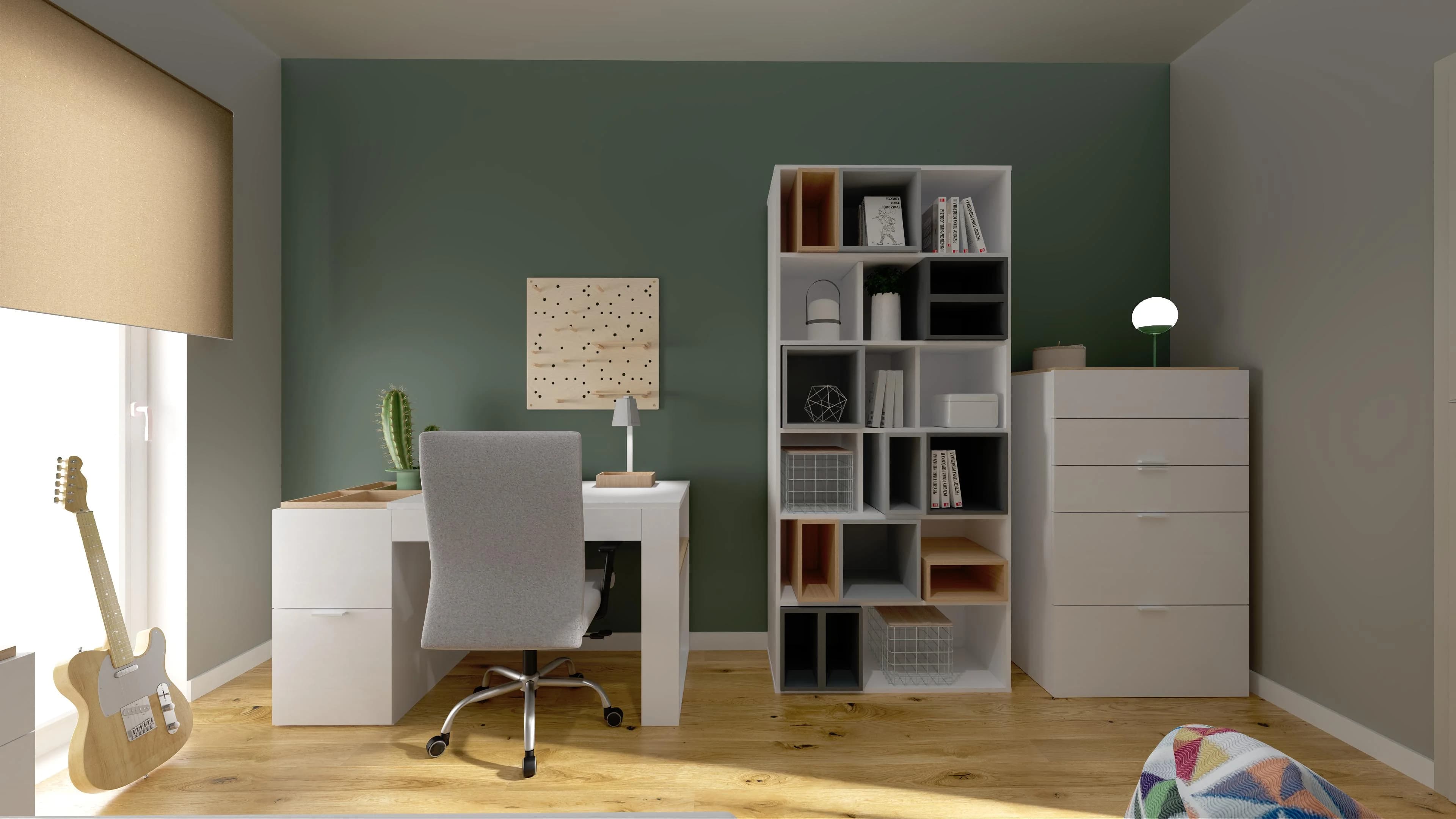 W tej wygodnej przestrzeni dla nastolatka znajduje się wszystko co niezbędne, by odpoczywać, uczyć się i oddawać własnym pasjom. Łóżko z półkami w podstawie to miejsce snu i praktyczny organizer w jednym. Solidne biurko ułatwi mierzenie się z pracami domowymi, a zawieszona na ścianie tablica z kołkami posłuży do uporządkowania przyborów.