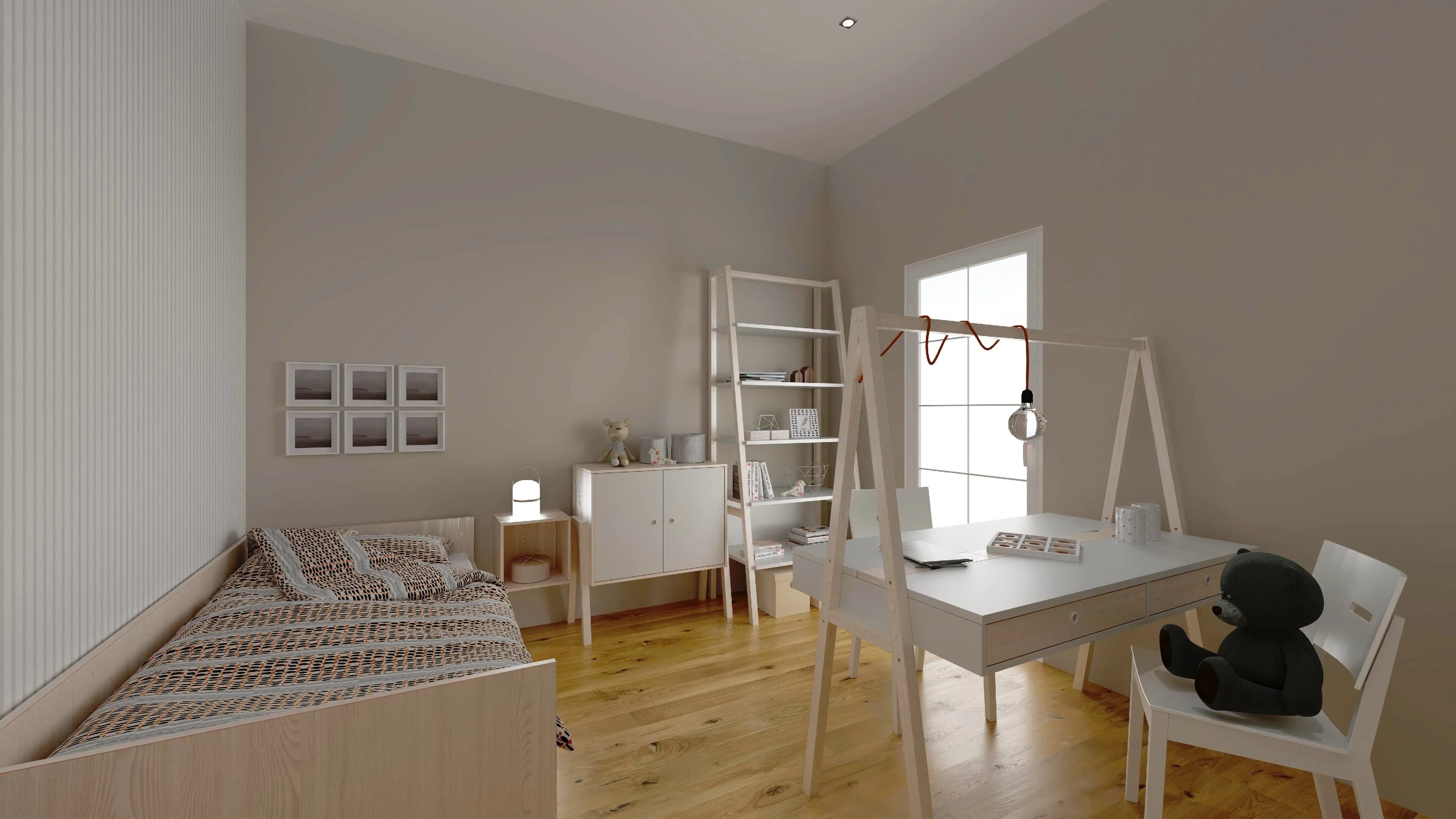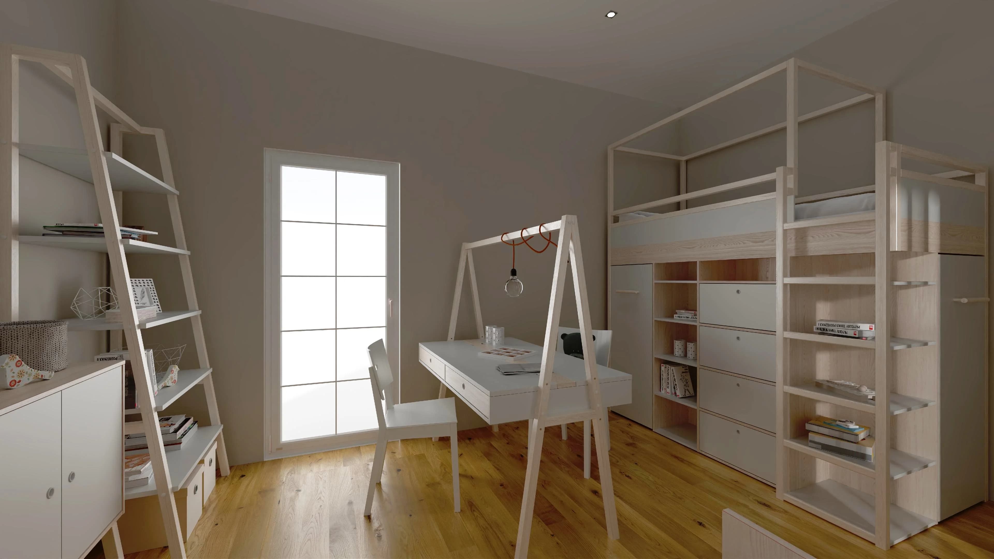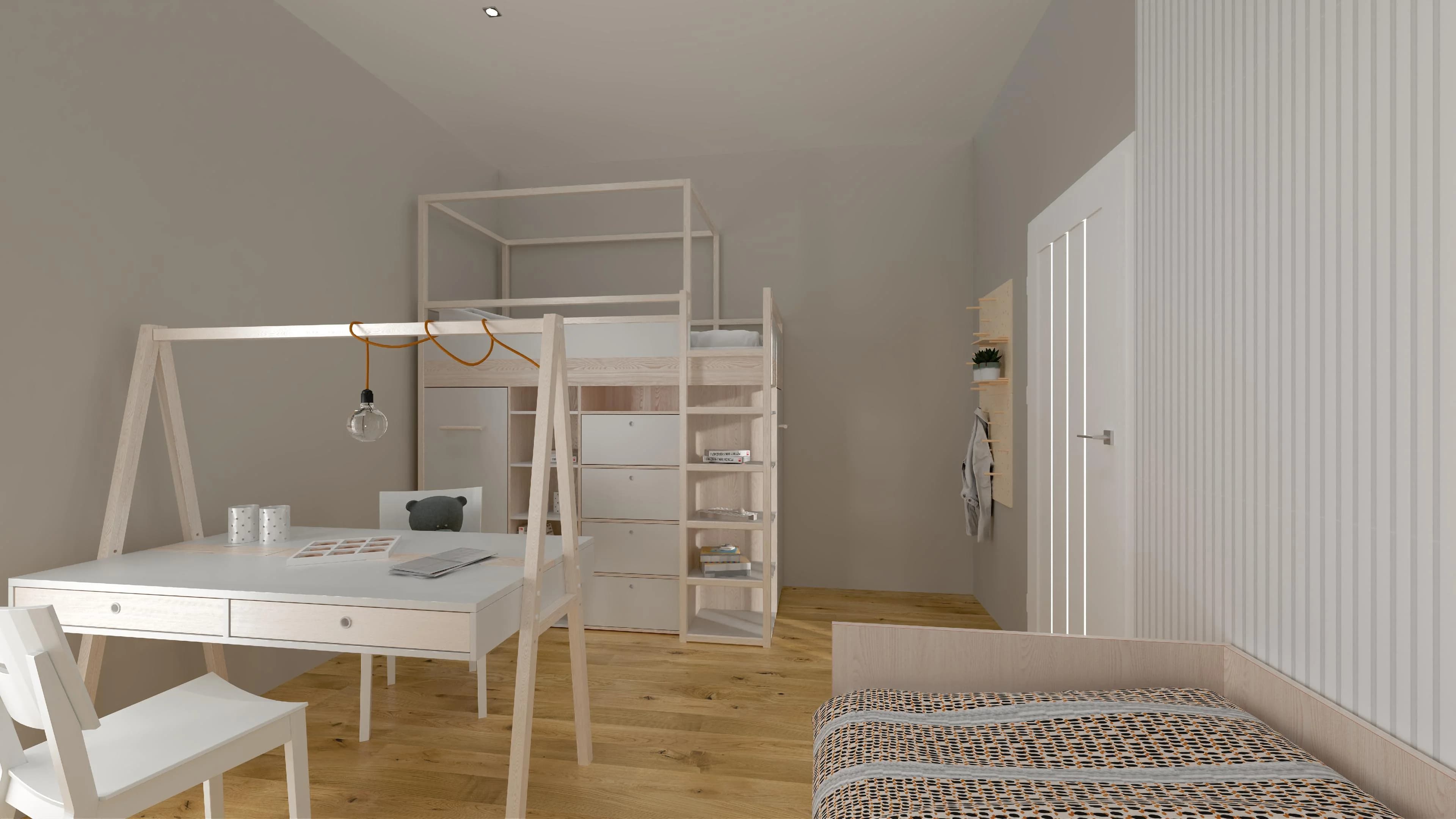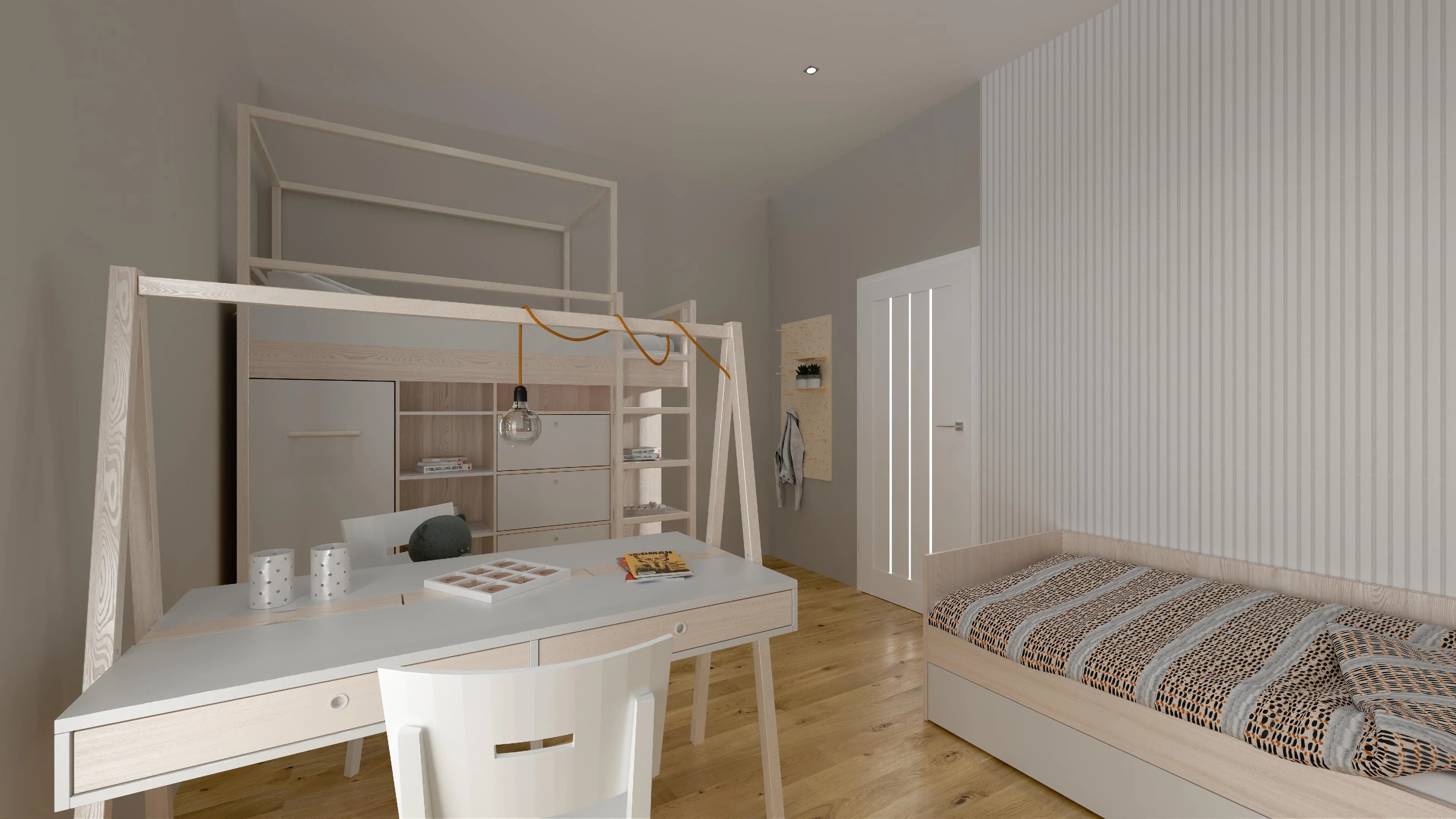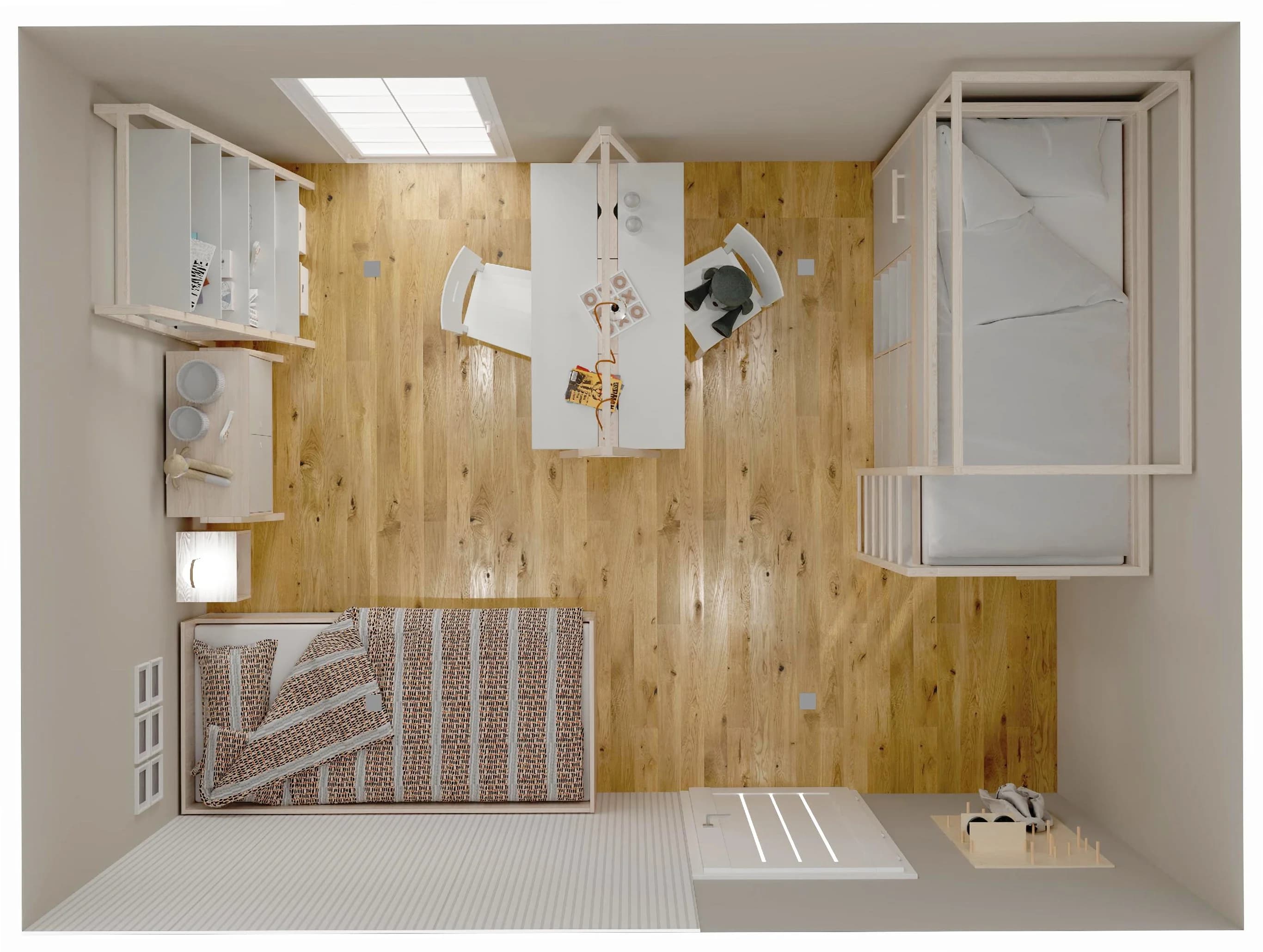 Pokój, choć niewielki, odpowiada na potrzeby dwojga dzieci. Są w nim dwa łóżka – jedno klasyczne z szufladą na pościel, a drugie piętrowe, łączące funkcje spania, regału, komody i szafy. Ustawione w centrum biurko ma duży blat roboczy – jednocześnie mogą korzystać z niego dwie osoby. Otwarte półki pomieszczą książki, a niska szafka – ulubione zabawki.
