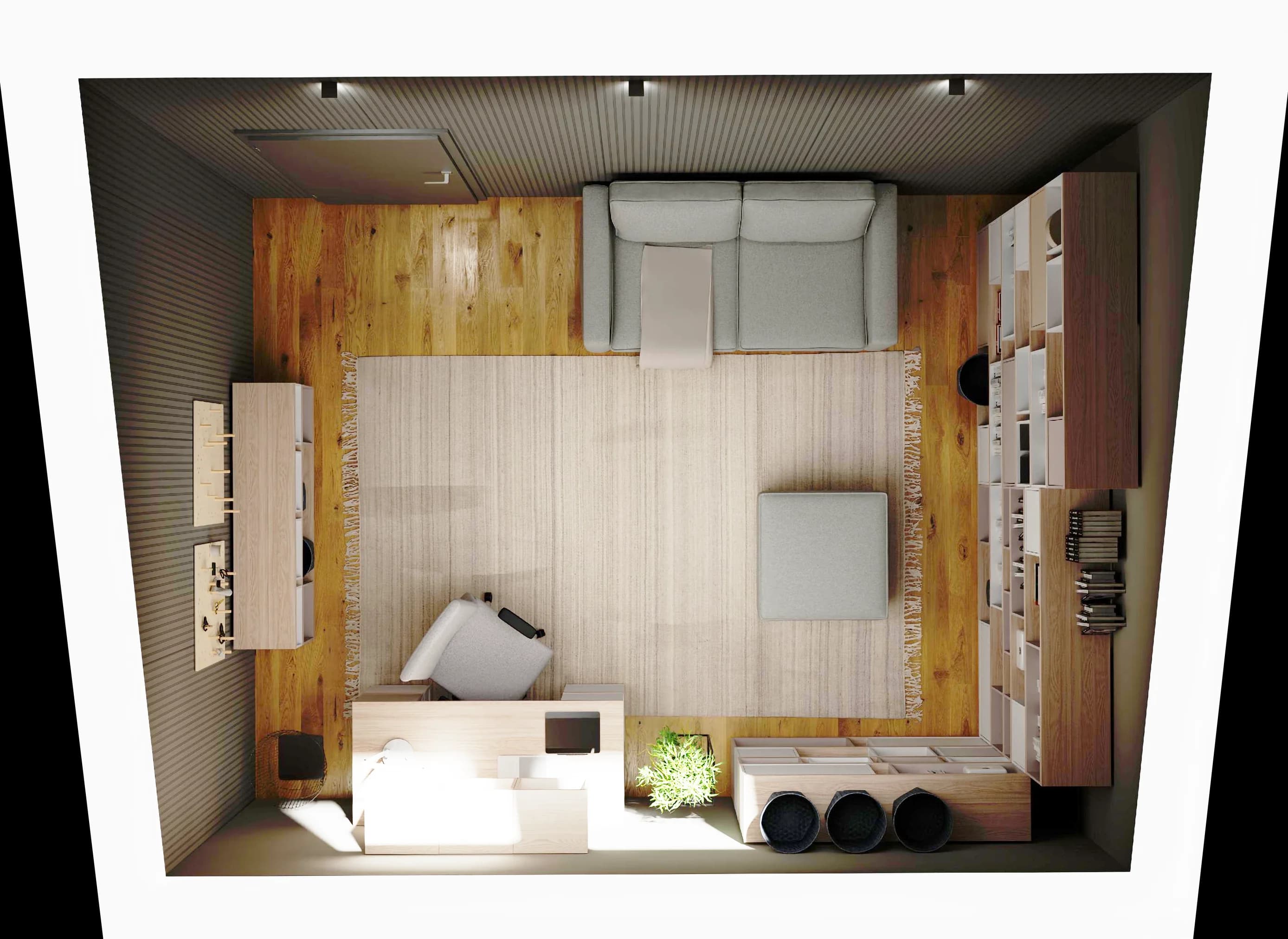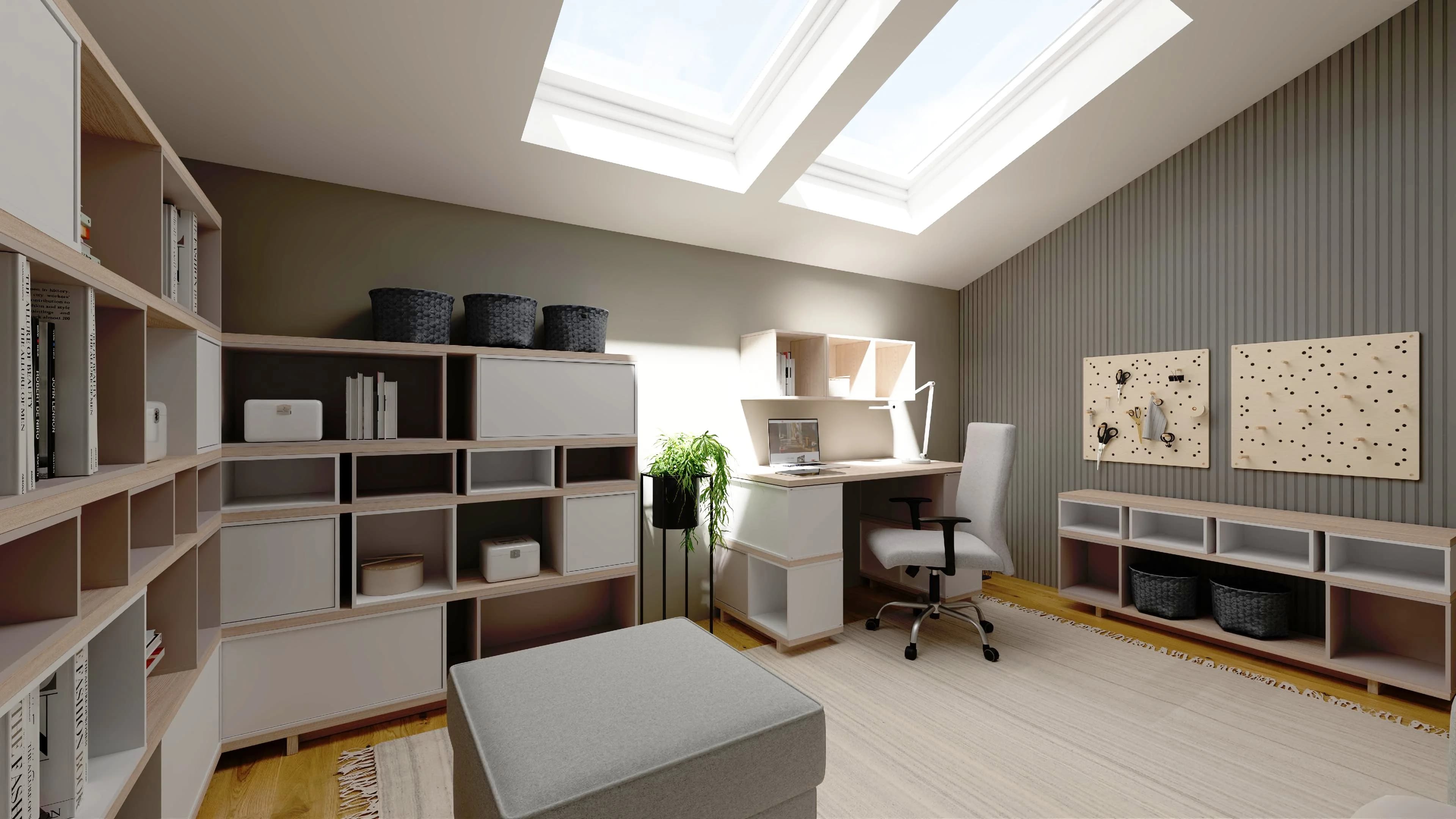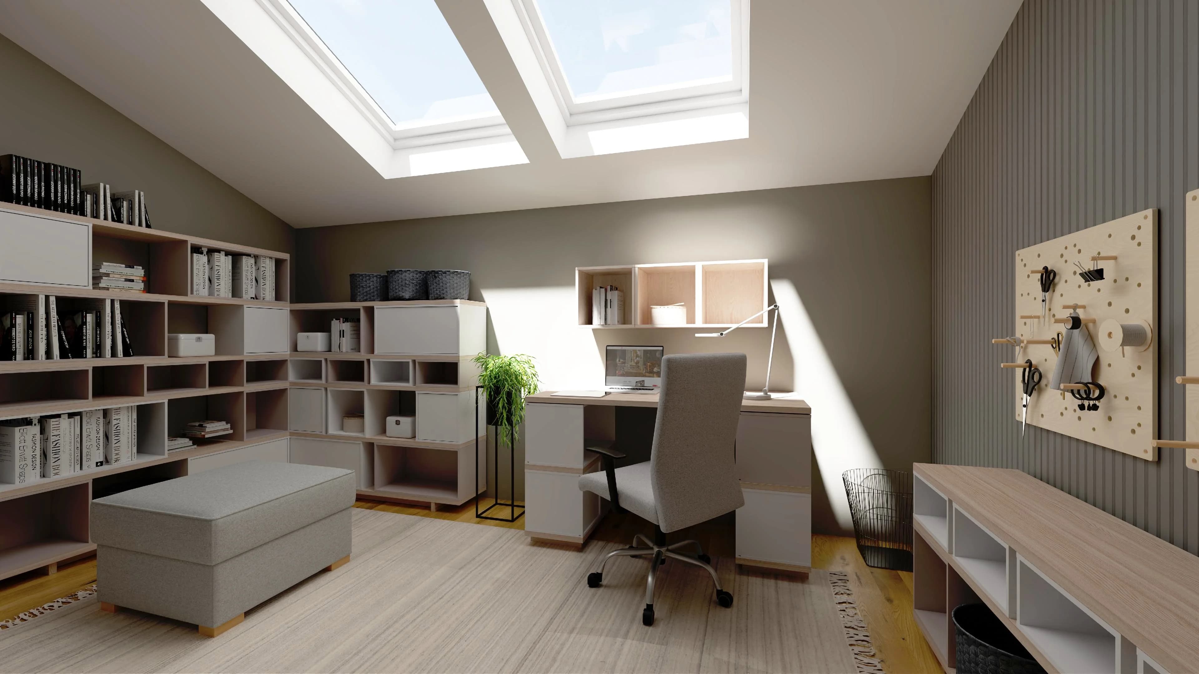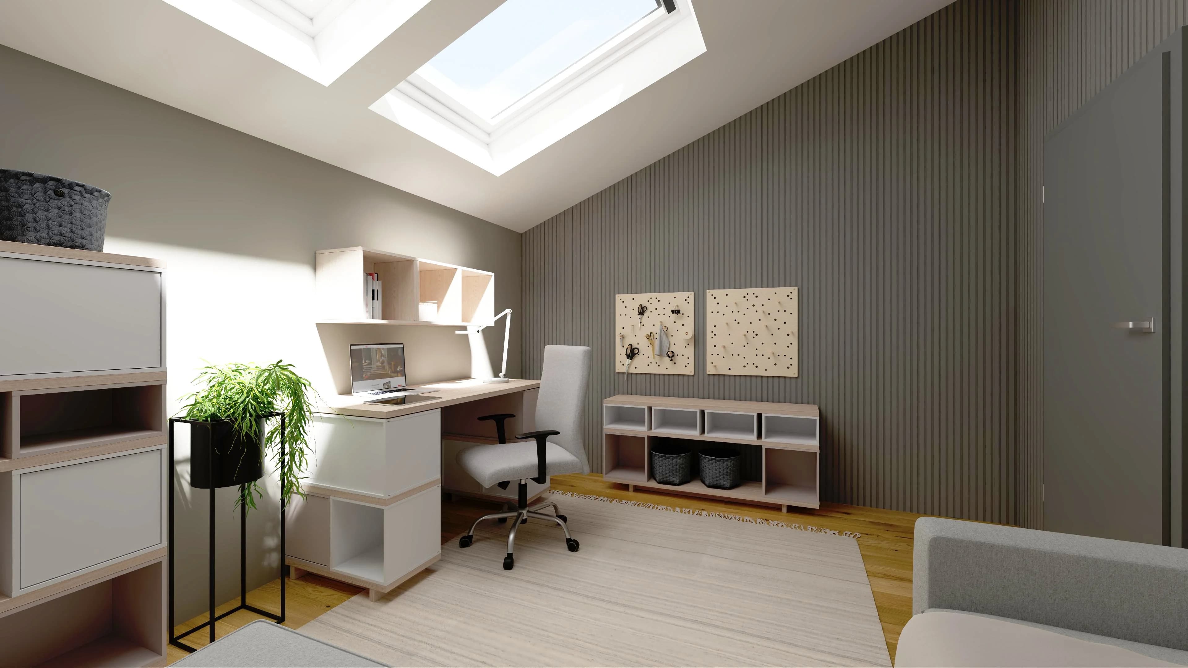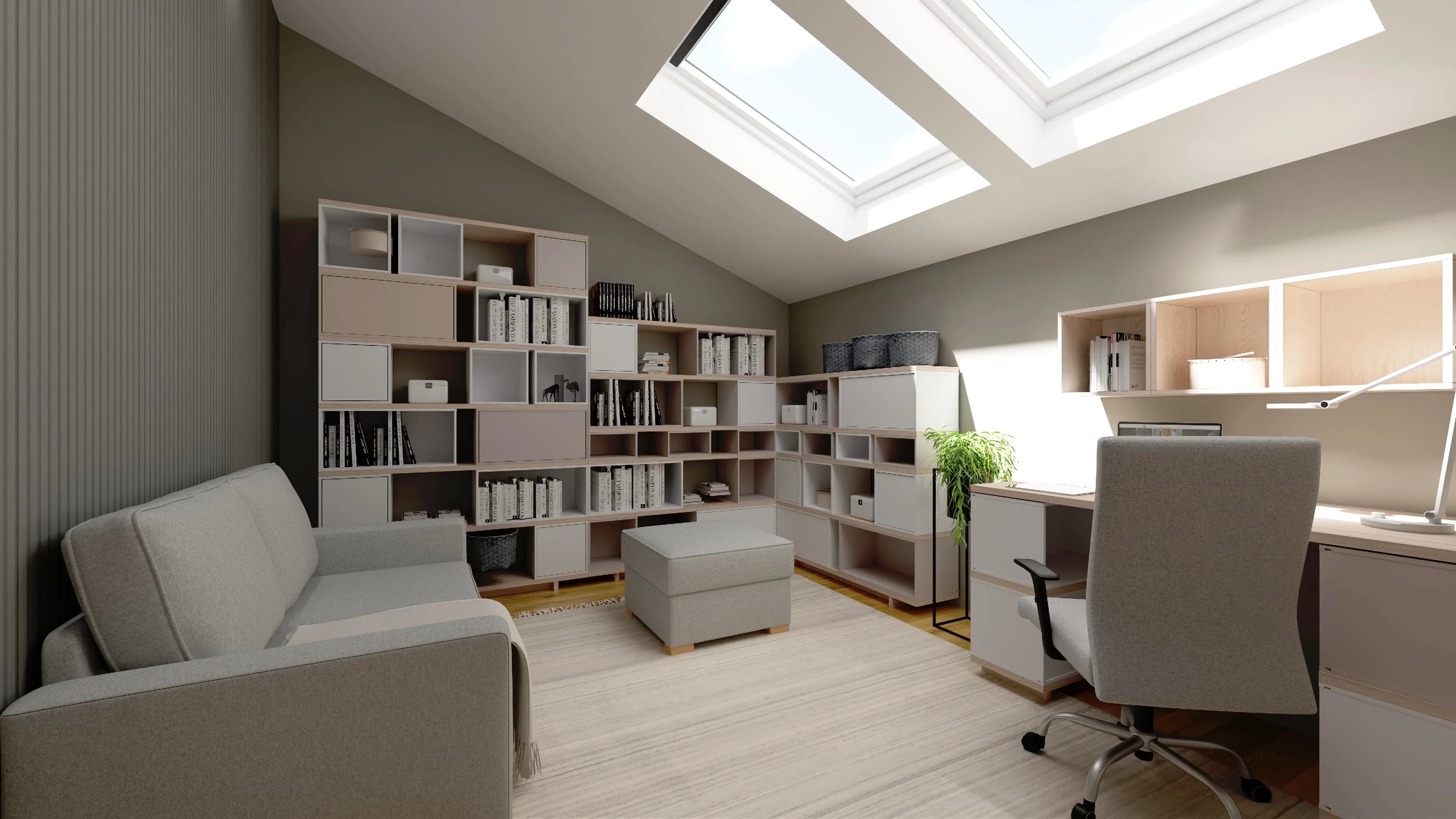 Dzięki sprytnym rozwiązaniom praca w tym gabinecie będzie przyjemnością. Podstawę aranżacji stanowi zabudowa z pakownych regałów oraz ustawione tuż pod oknem dachowym biurko z tapicerowanym fotelem. Na szarej sofie z miękkim pufem można przysiąść w przerwie od obowiązków. Przytulny klimat budują wyciszające lamele i duży dywan na podłodze.