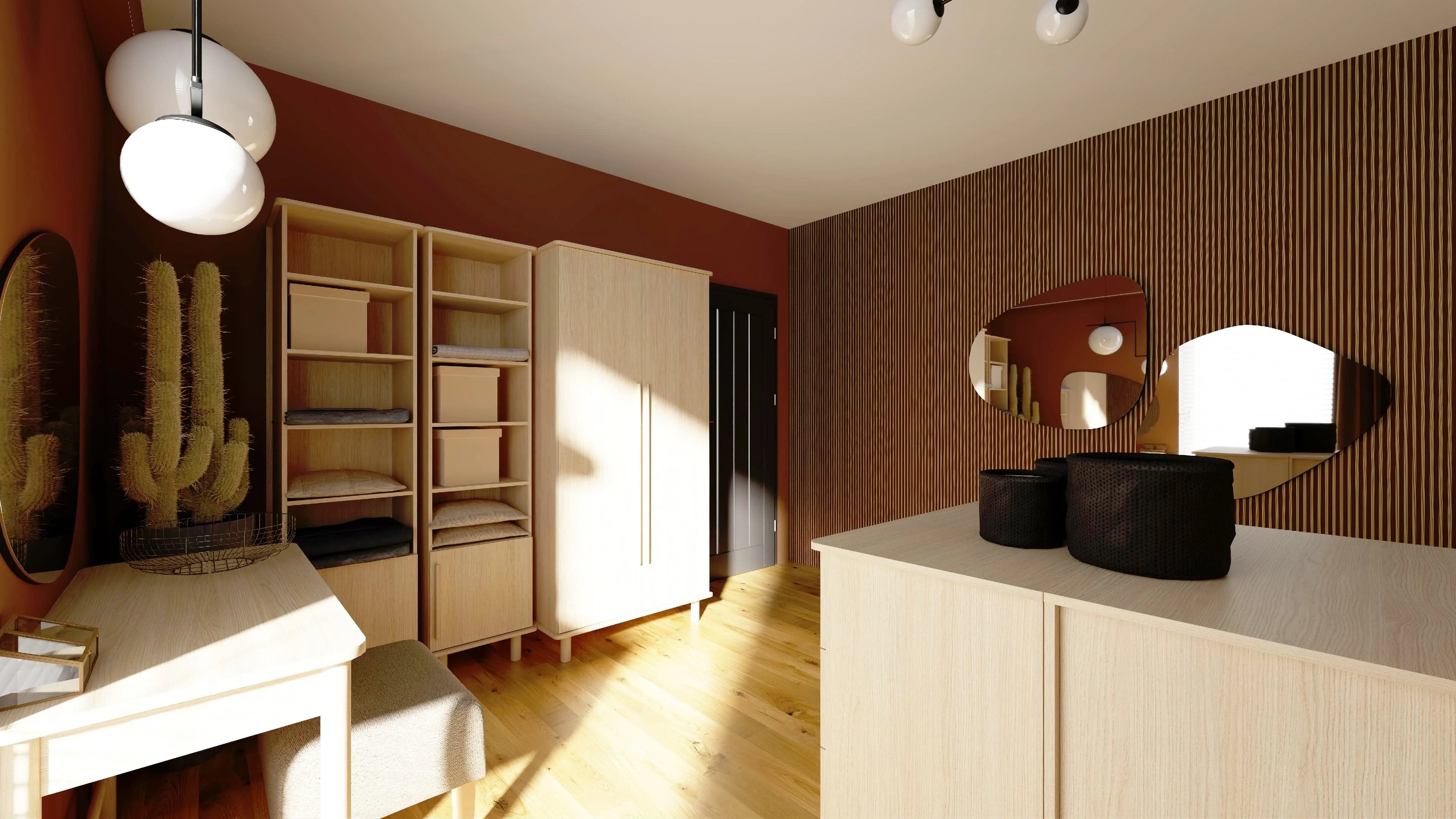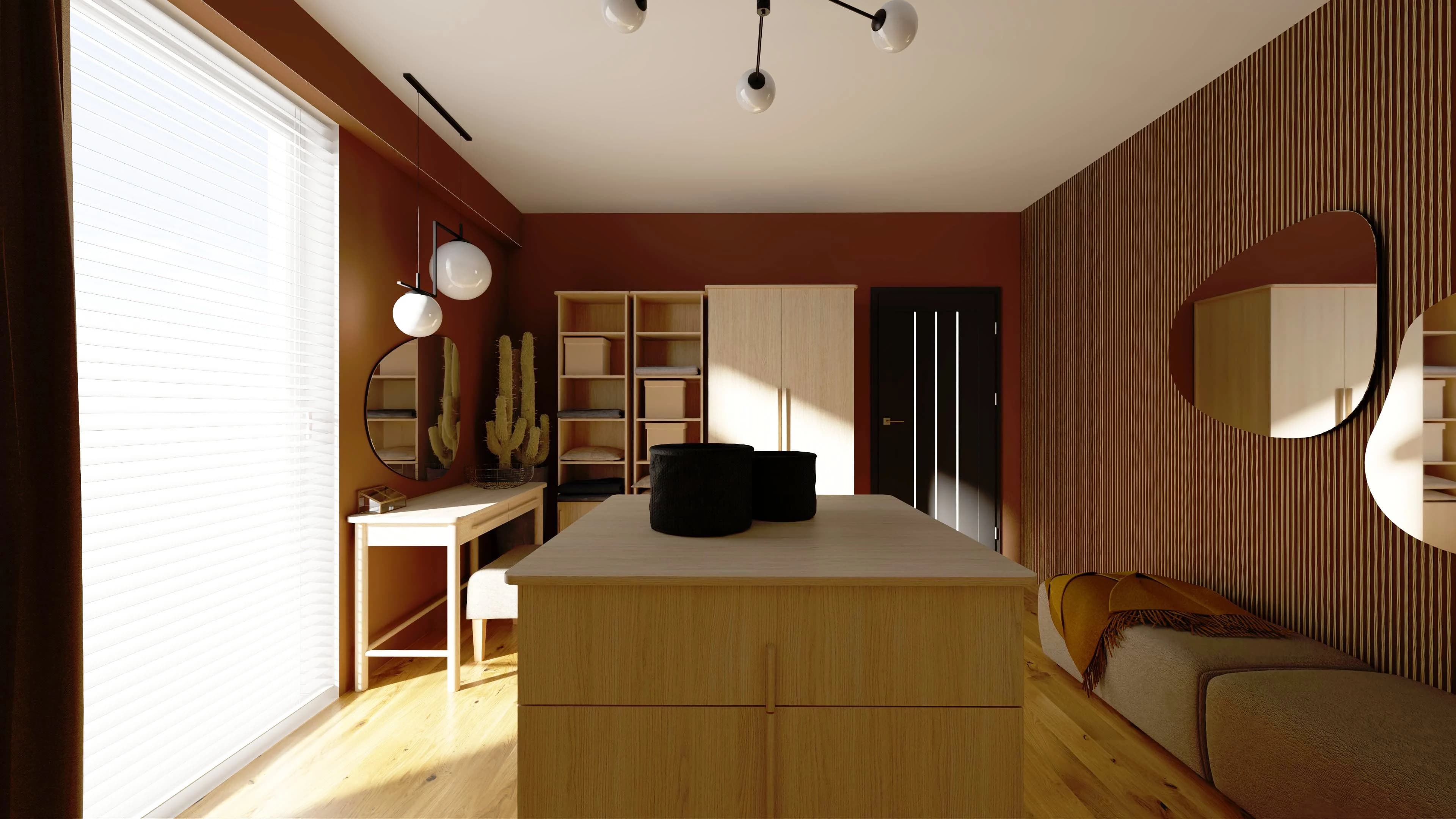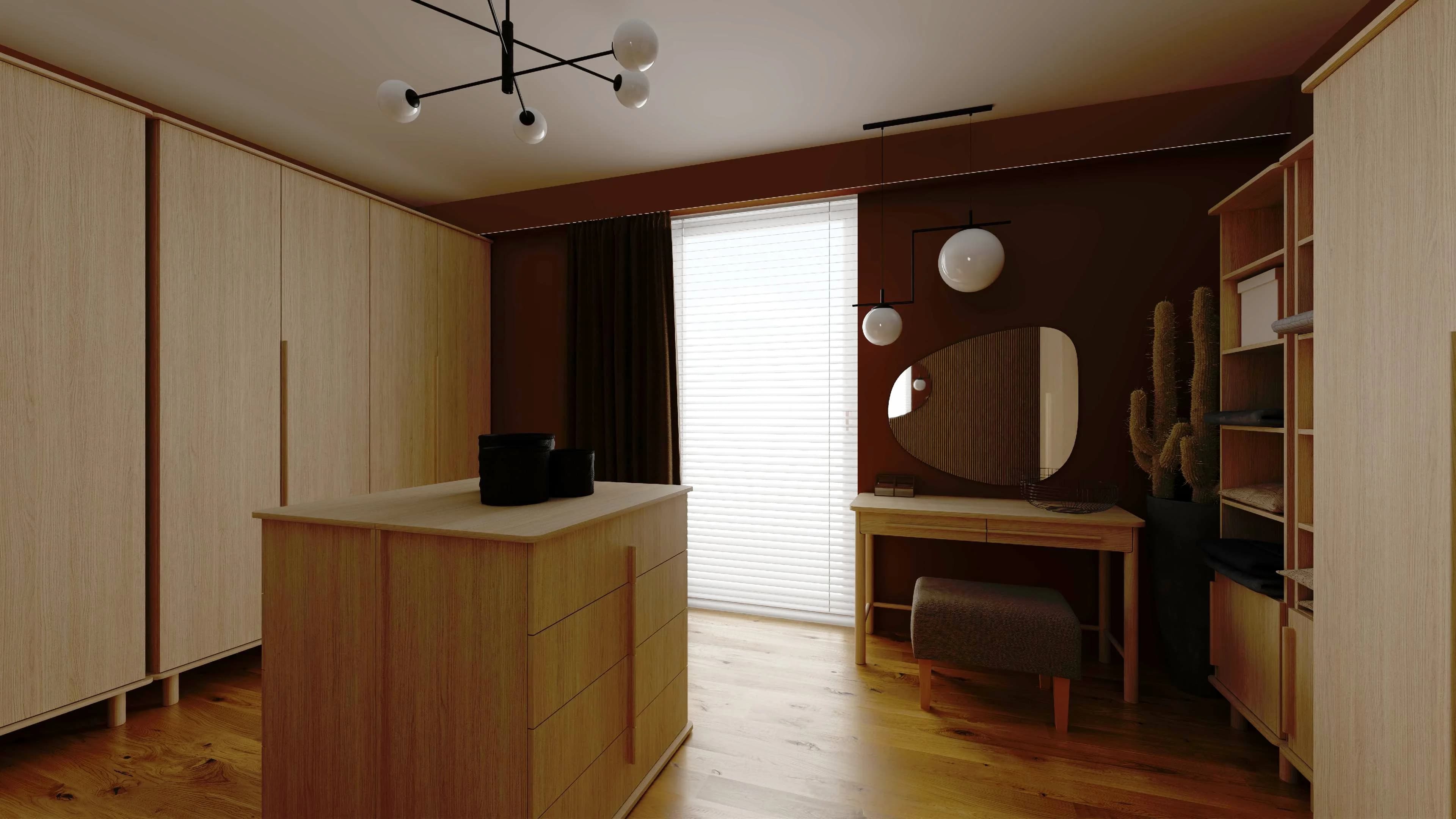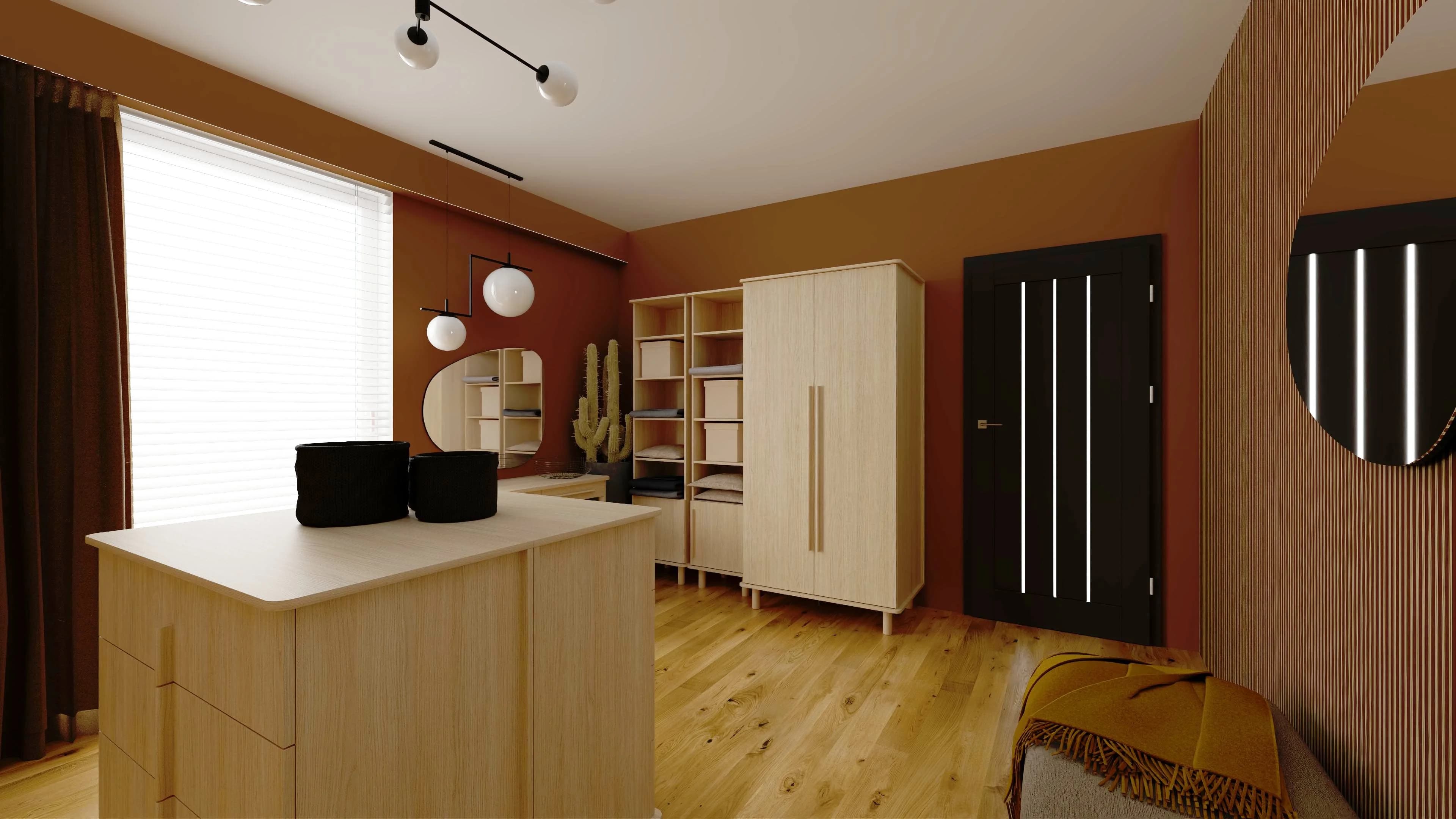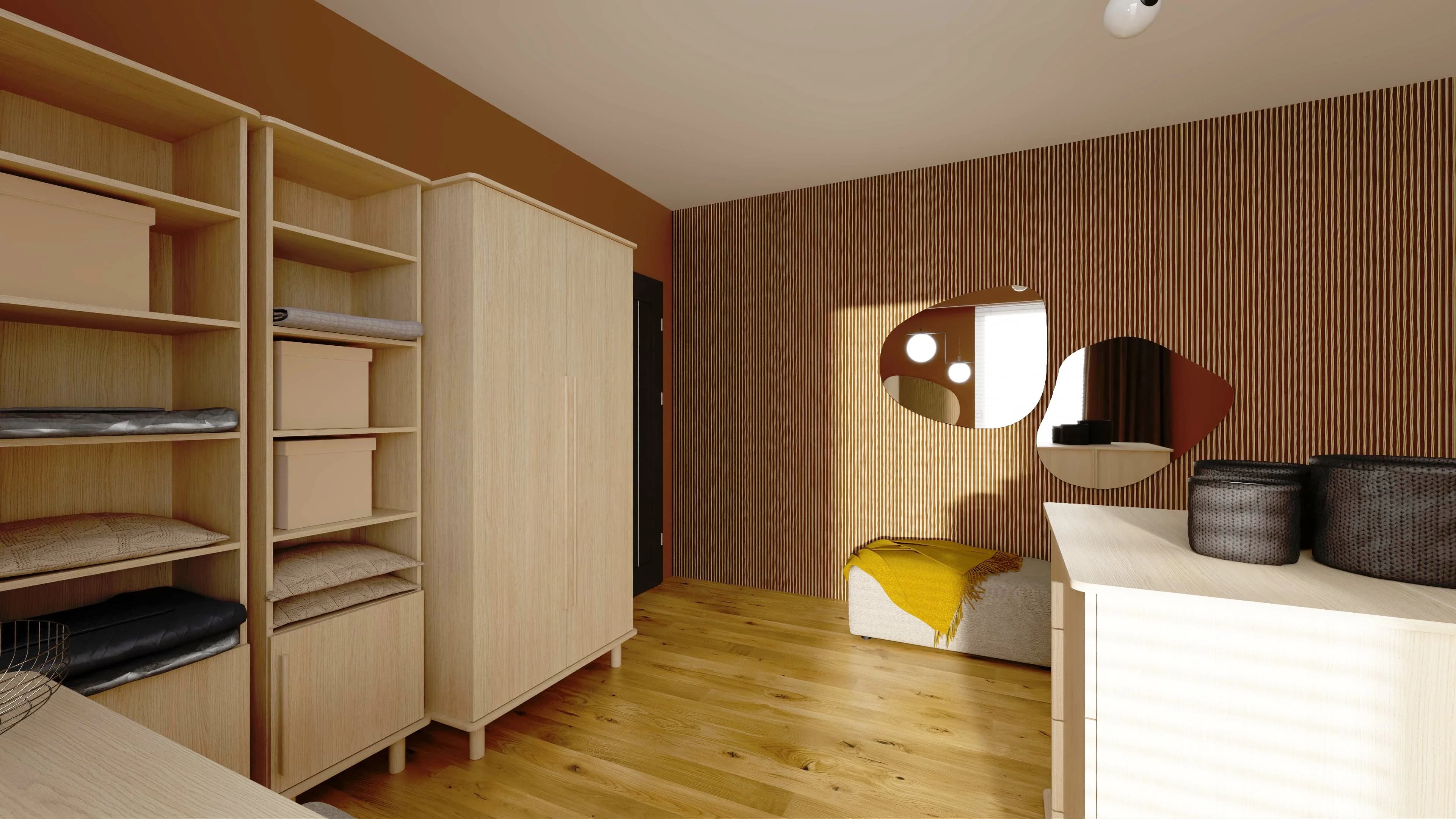 An extremely cosy and functional wardrobe will accommodate the clothes of all members of the household. Spacious wardrobes keep dresses, jumpers and coats in order, while open shelves store handbags and various small items. Two connected chests of drawers create a practical island for easy organisation of accessories. The interior walls are decorated with laths and mirrors in organic shapes.