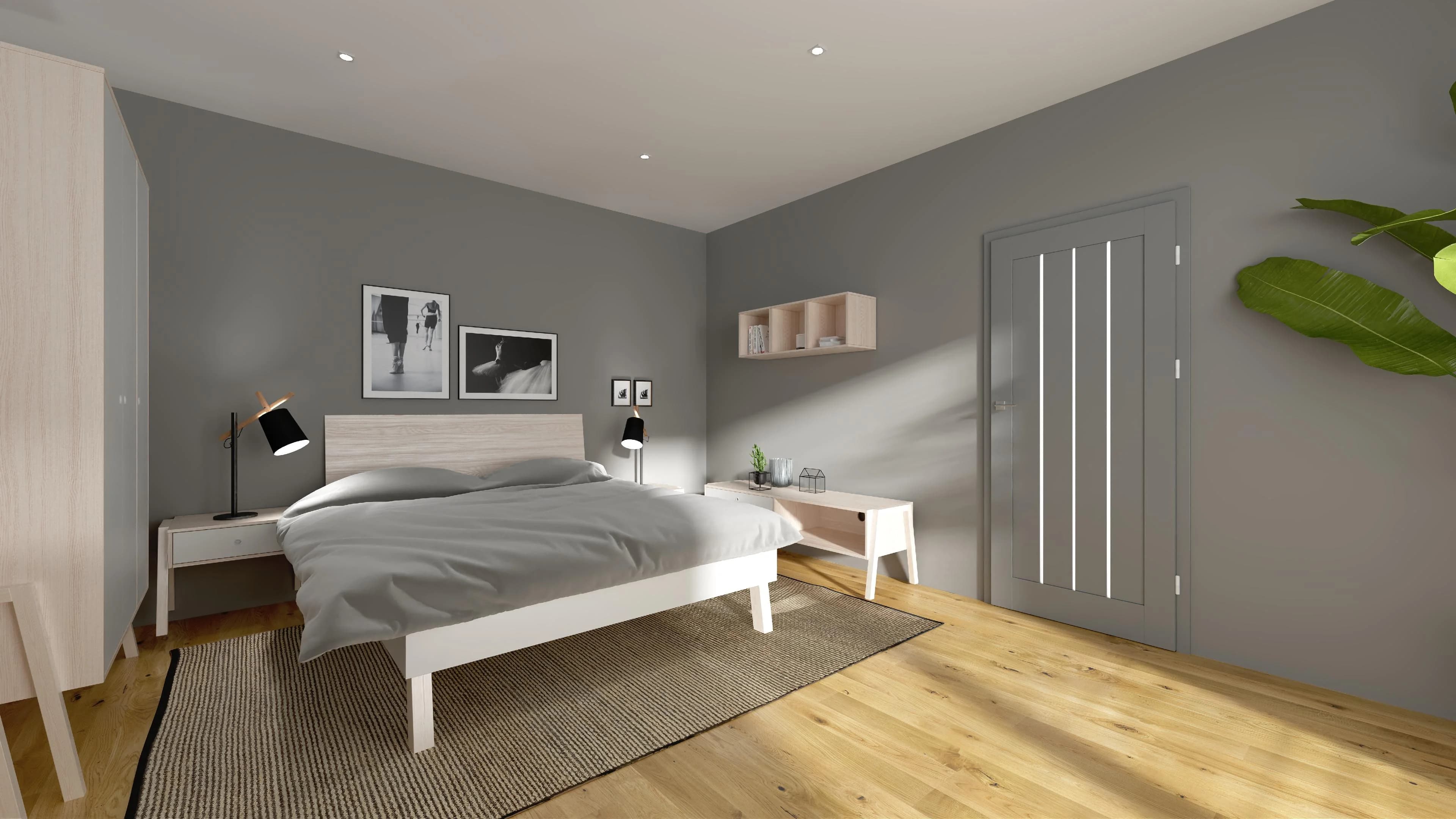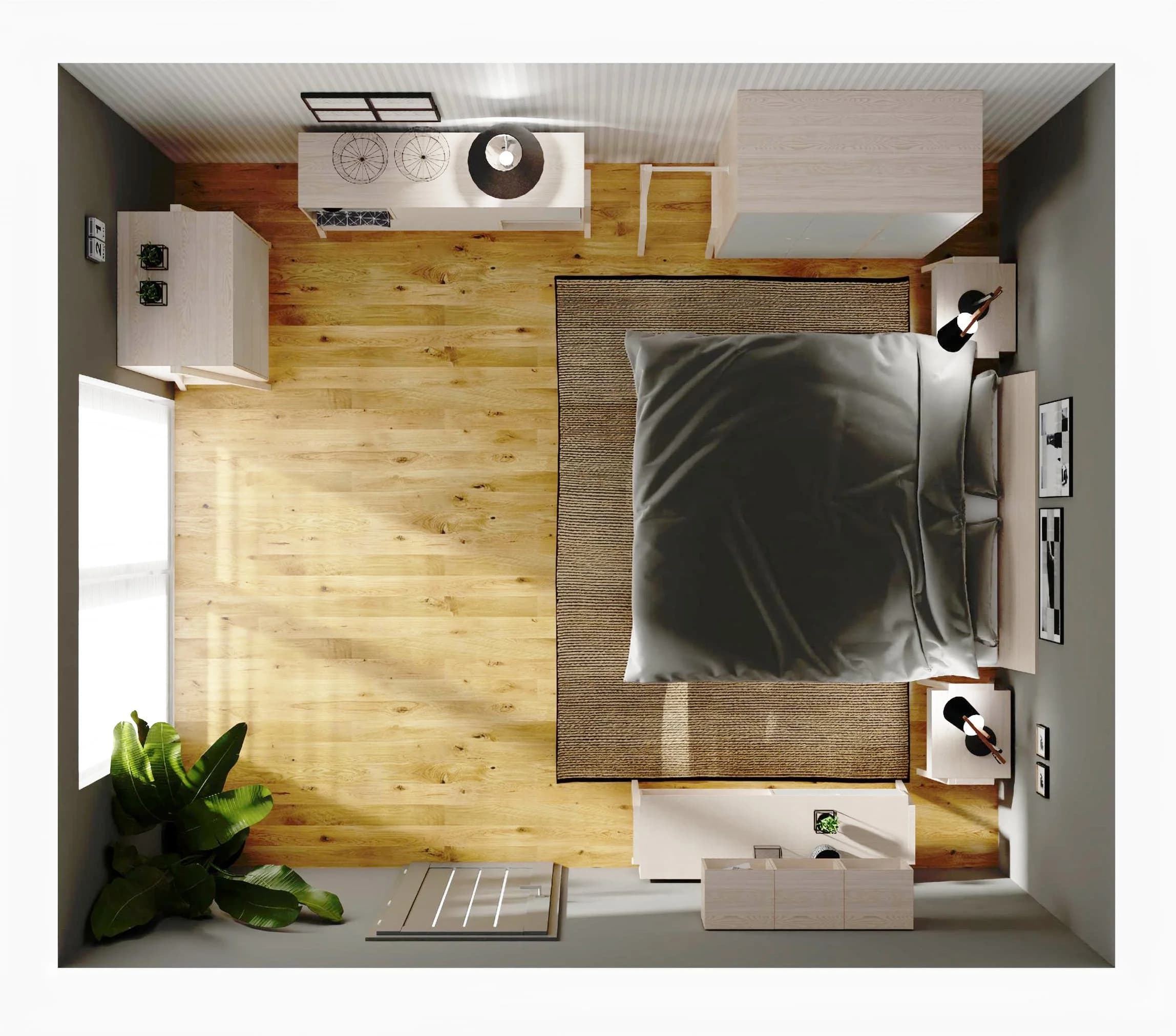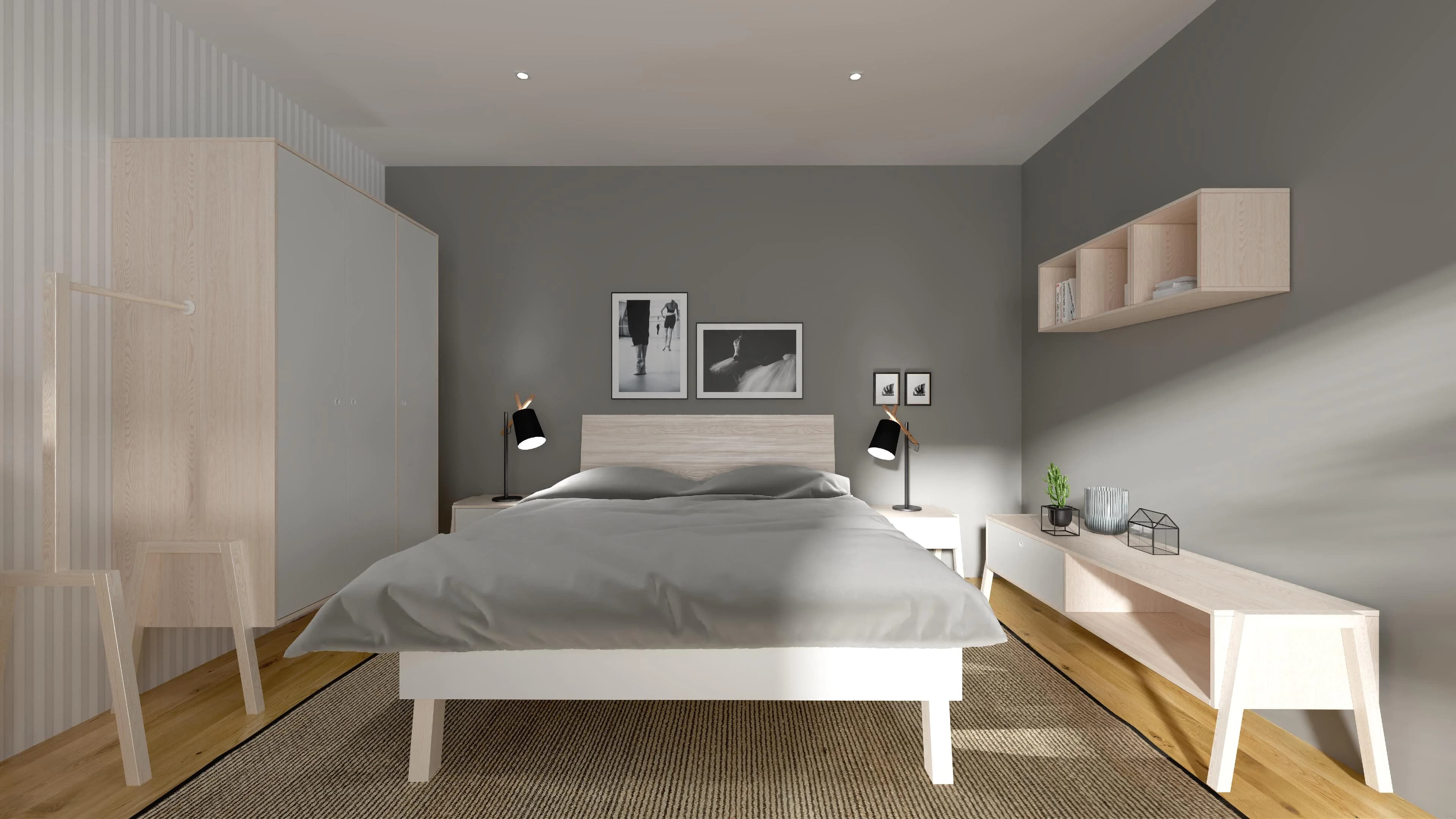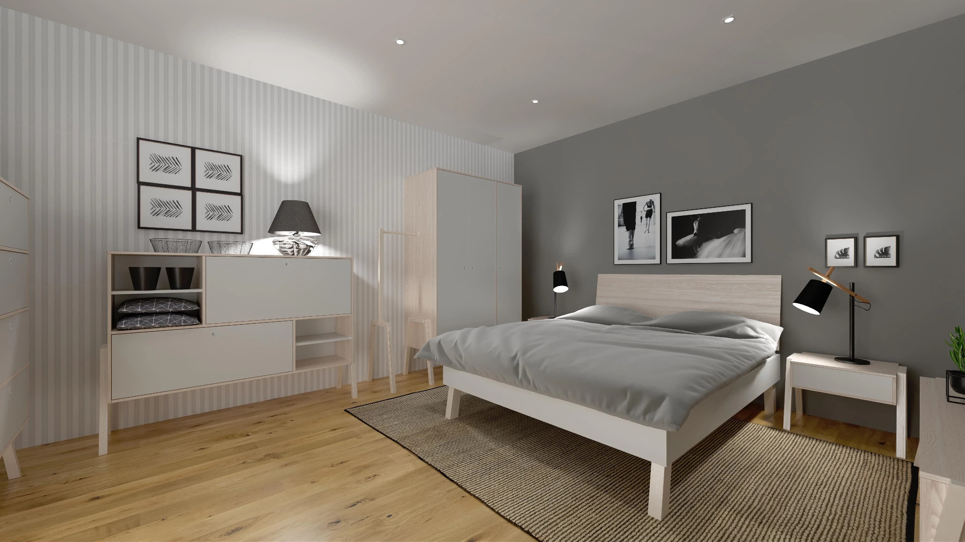Wnętrze dużej sypialni zostało podzielone na komfortowe strefy. Dzięki meblom na wysokich nóżkach przestrzeń zyskuje na lekkości i staje się funkcjonalna. Szafy i komody pełnią rolę garderoby i schowków na różne rzeczy. W centralnej części pokoju stoi łóżko z podwyższonym wezgłowiem. O przytulną stronę aranżacji dba ręcznie tkany dywan i lampki nocne.