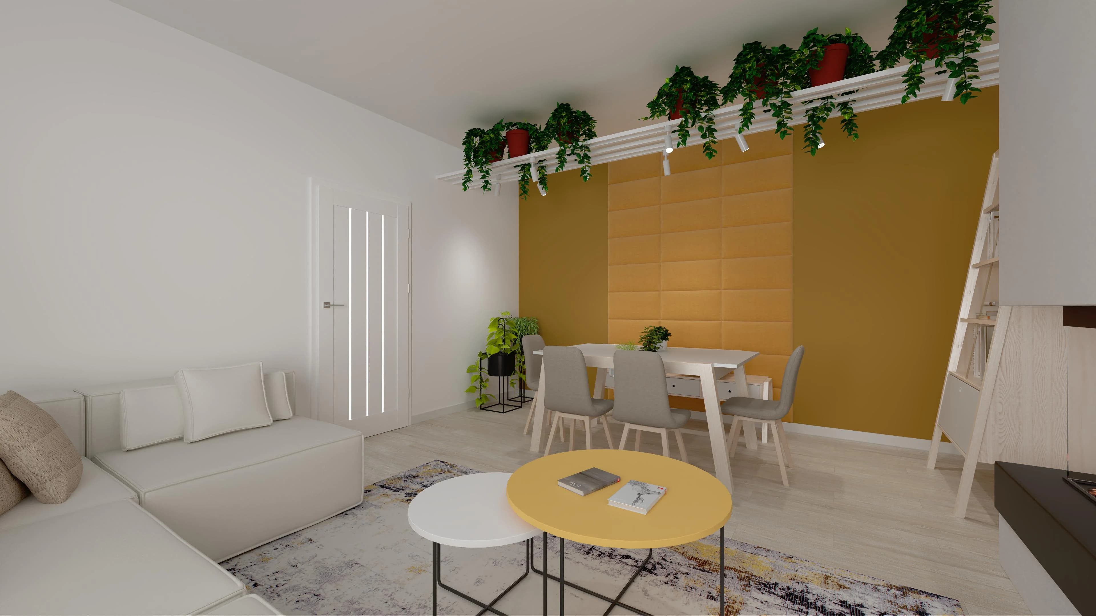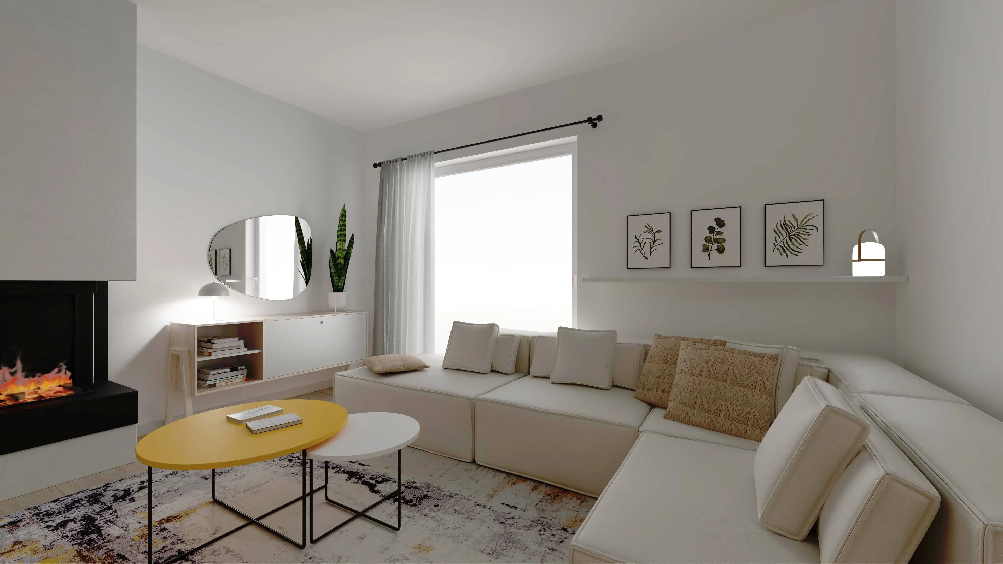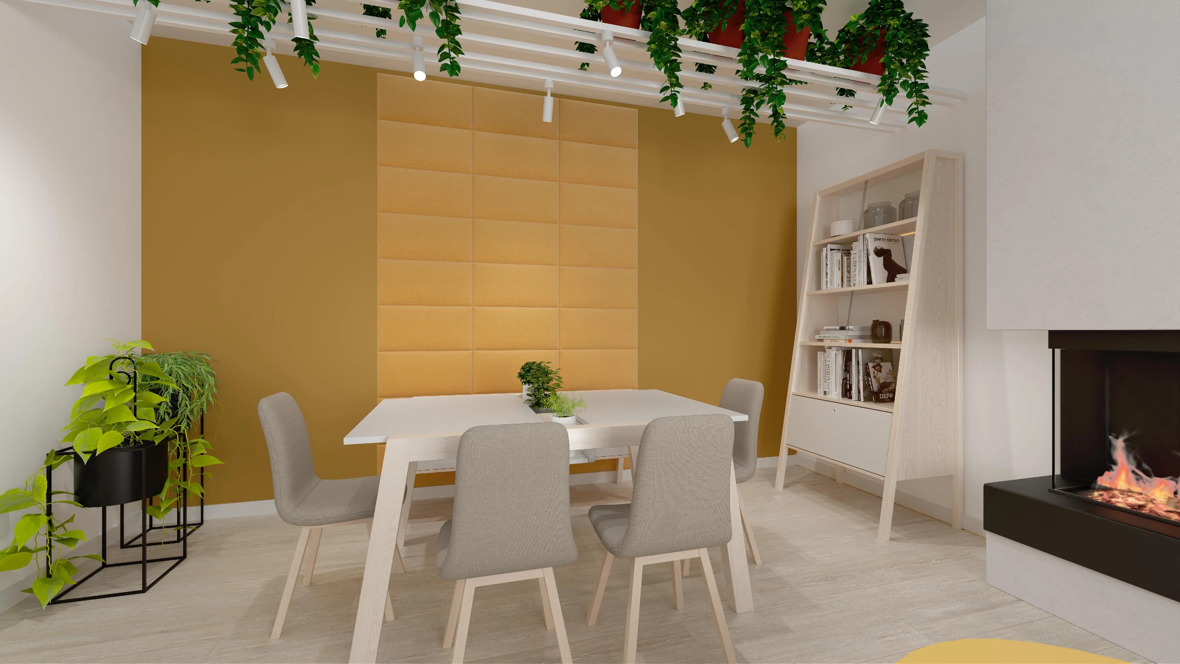 Harmonijnie zaaranżowana przestrzeń jest pełna światła i odcieni beżu. Strefę relaksu tworzy przestronny modułowy narożnik z miękkim dywanem i stolikami kawowymi. Duży stół z krzesłami służy do rodzinnych spotkań lub pracy, a organizację ułatwia otwarty regał. Przytulność zapewniają kominek i musztardowa ściana z kompozycją tapicerowanych paneli.