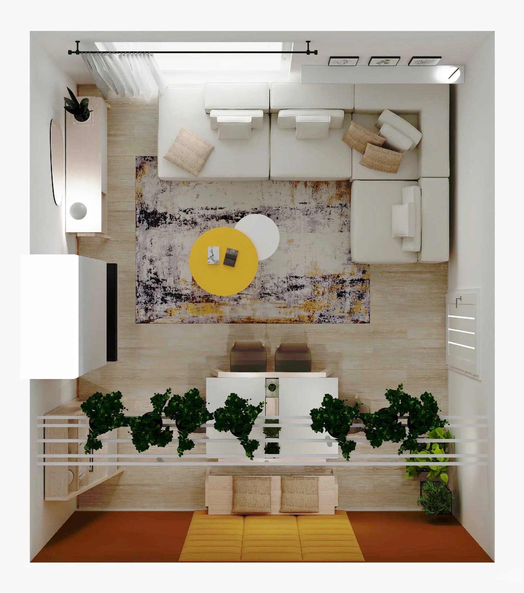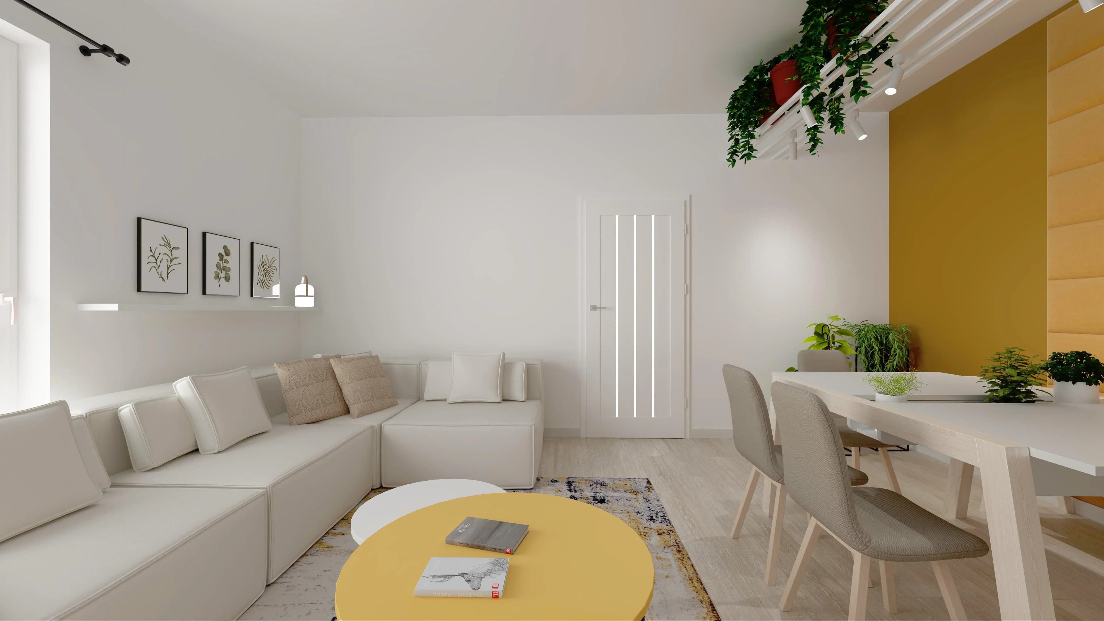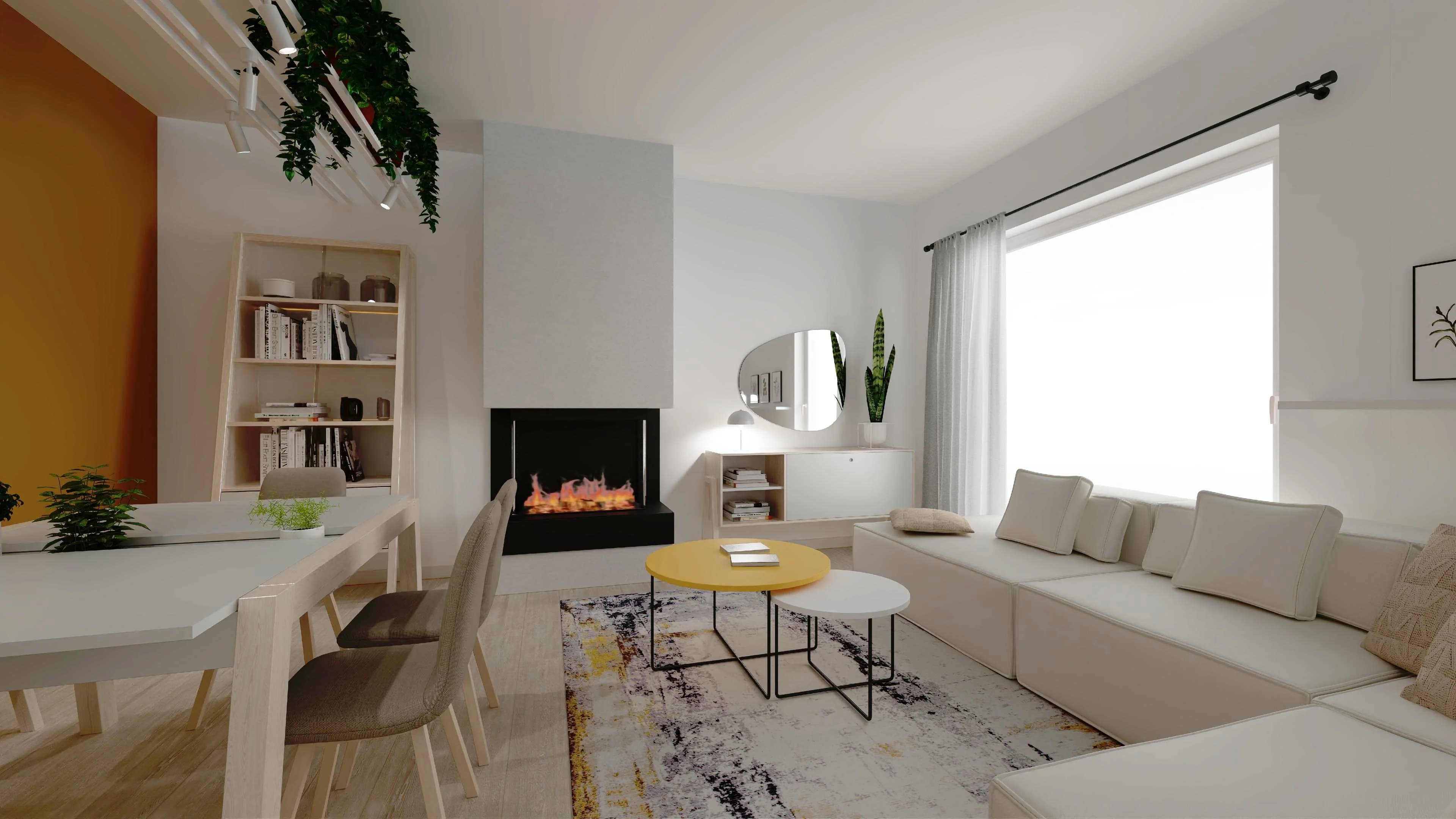 Harmonijnie zaaranżowana przestrzeń jest pełna światła i odcieni beżu. Strefę relaksu tworzy przestronny modułowy narożnik z miękkim dywanem i stolikami kawowymi. Duży stół z krzesłami służy do rodzinnych spotkań lub pracy, a organizację ułatwia otwarty regał. Przytulność zapewniają kominek i musztardowa ściana z kompozycją tapicerowanych paneli.