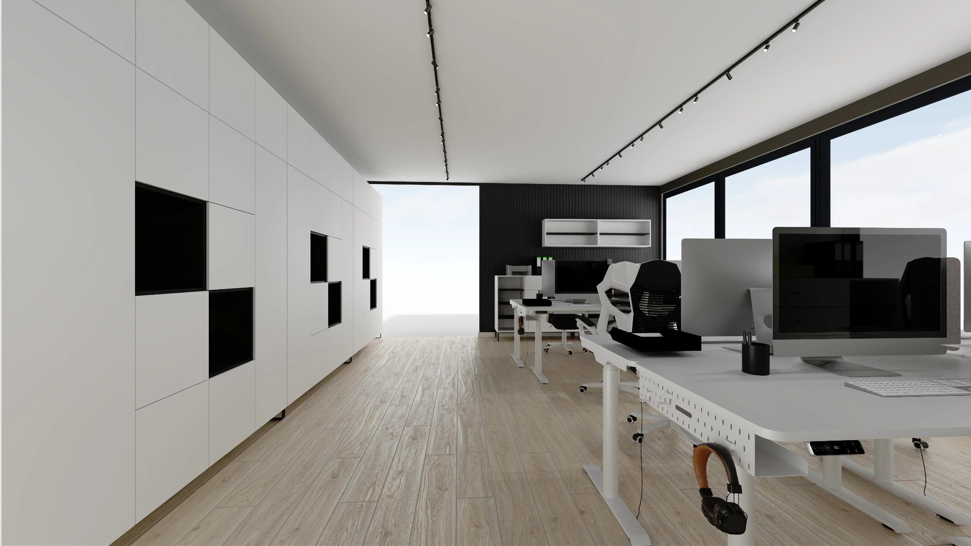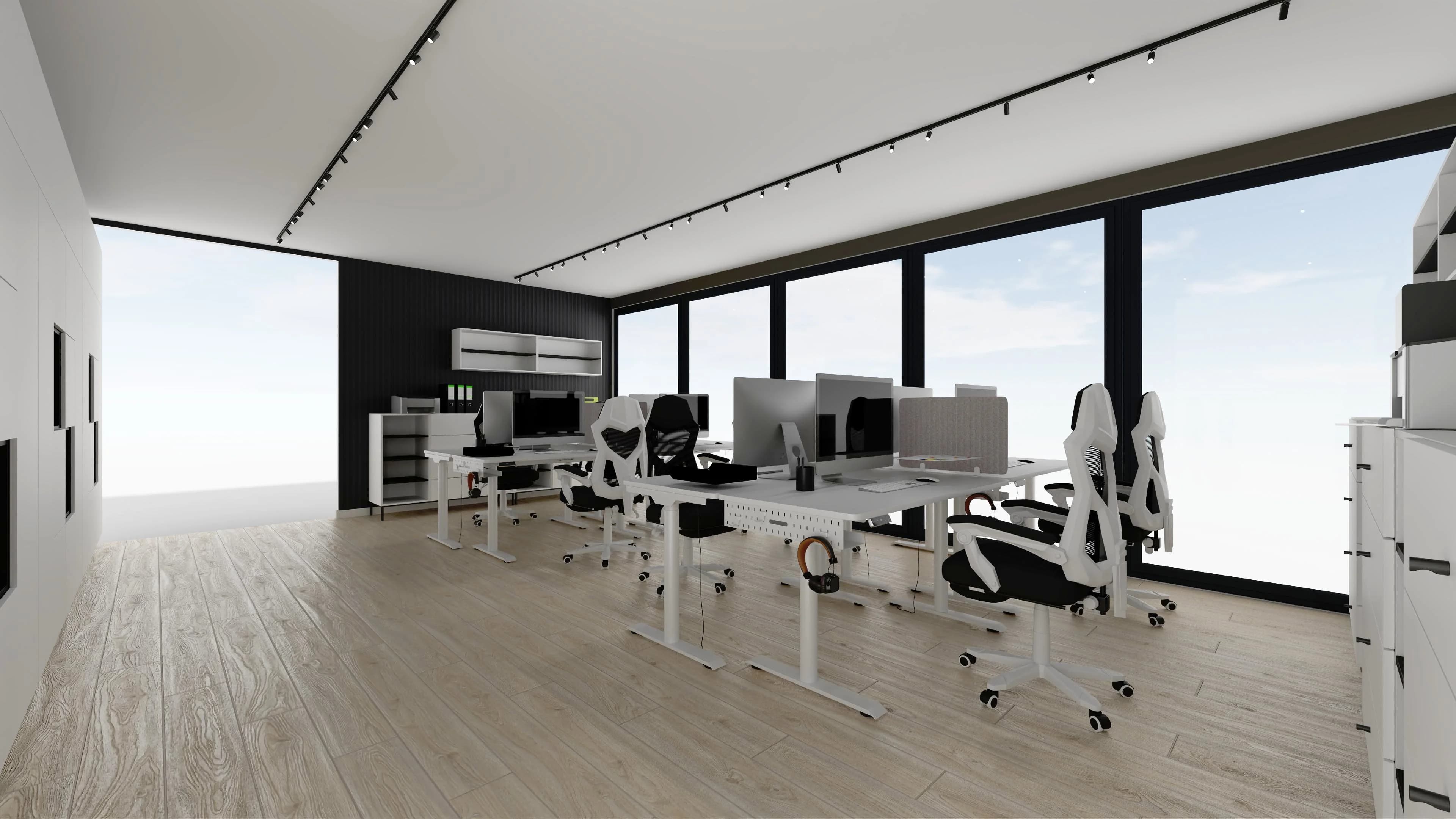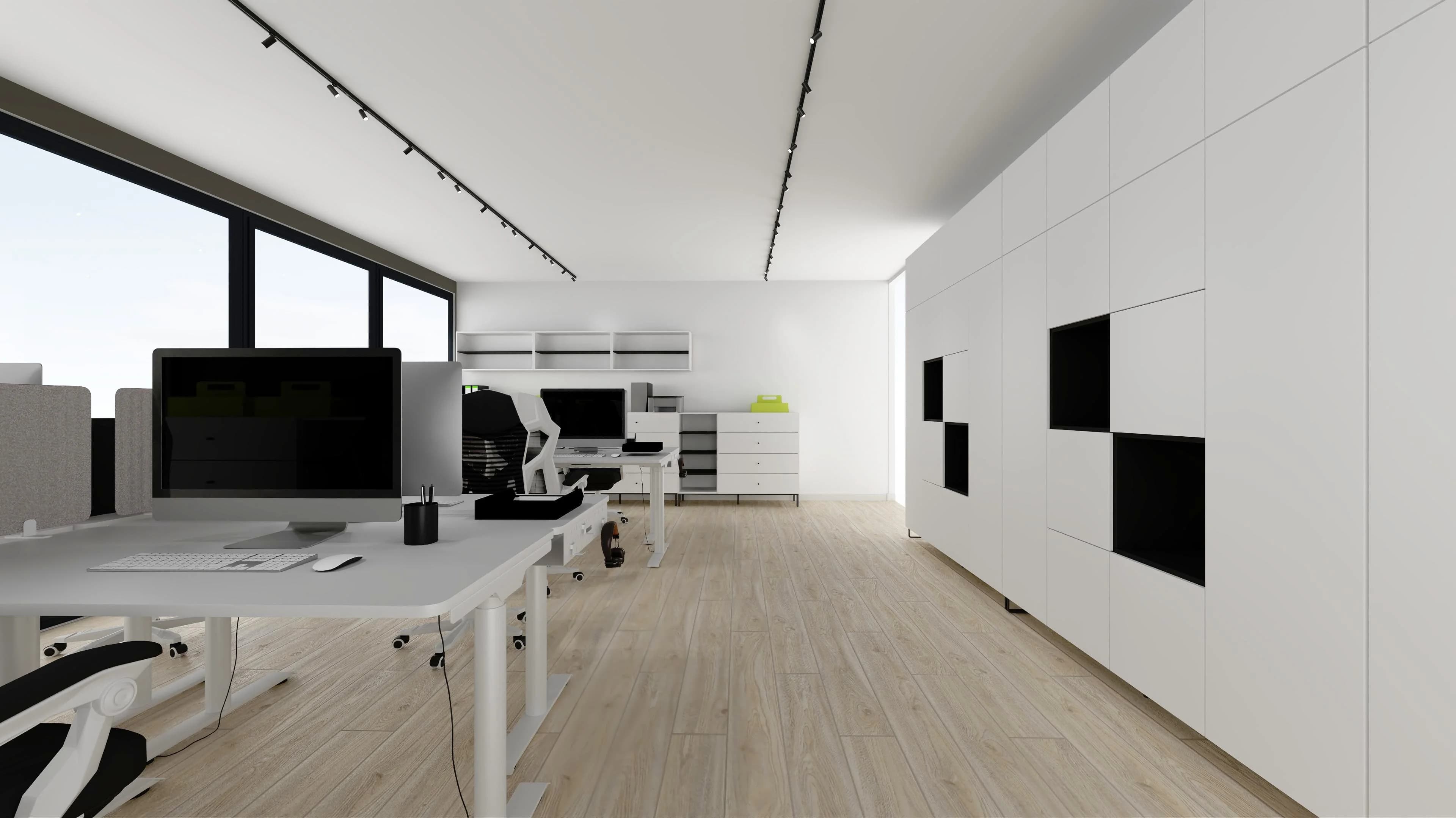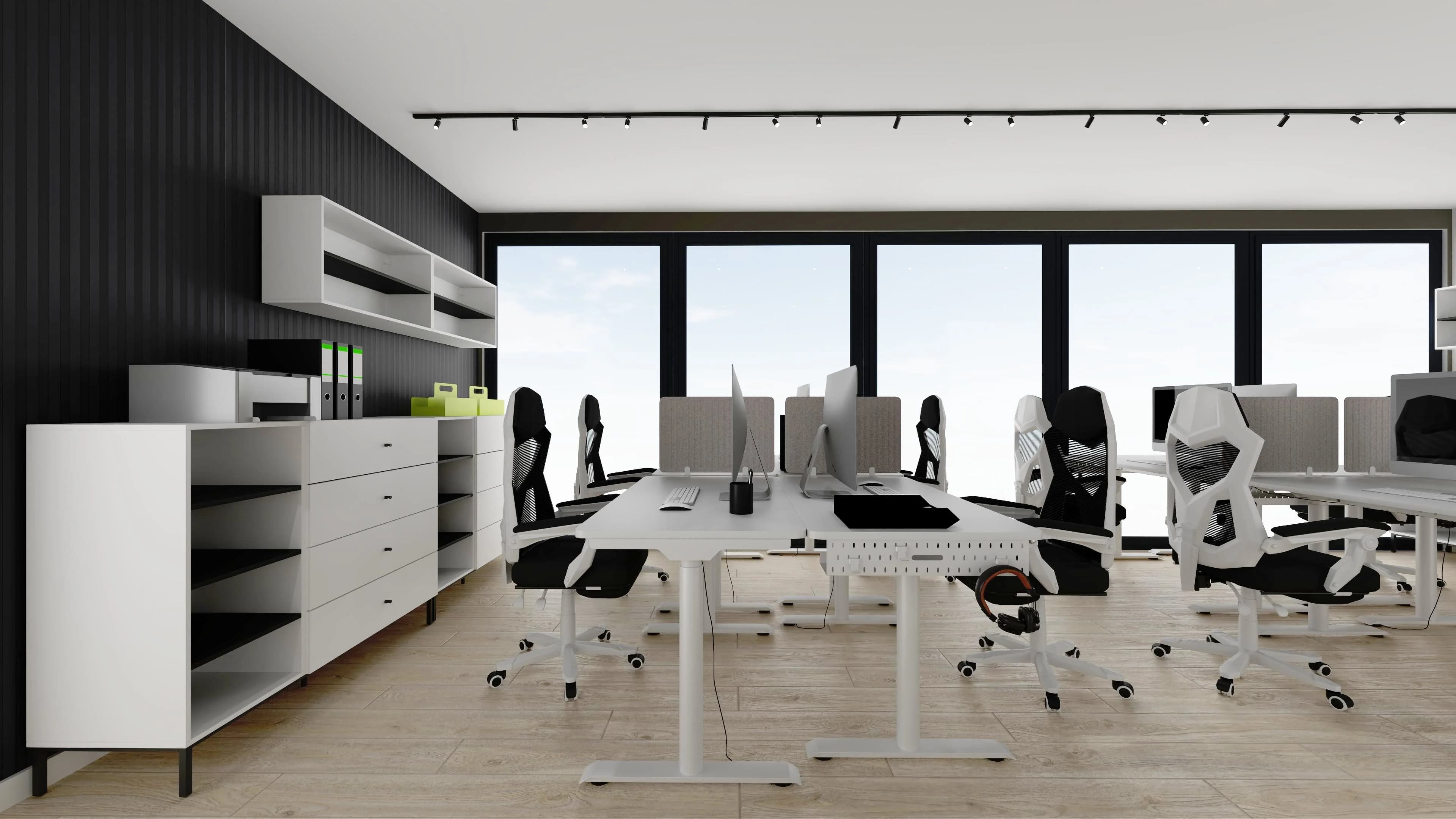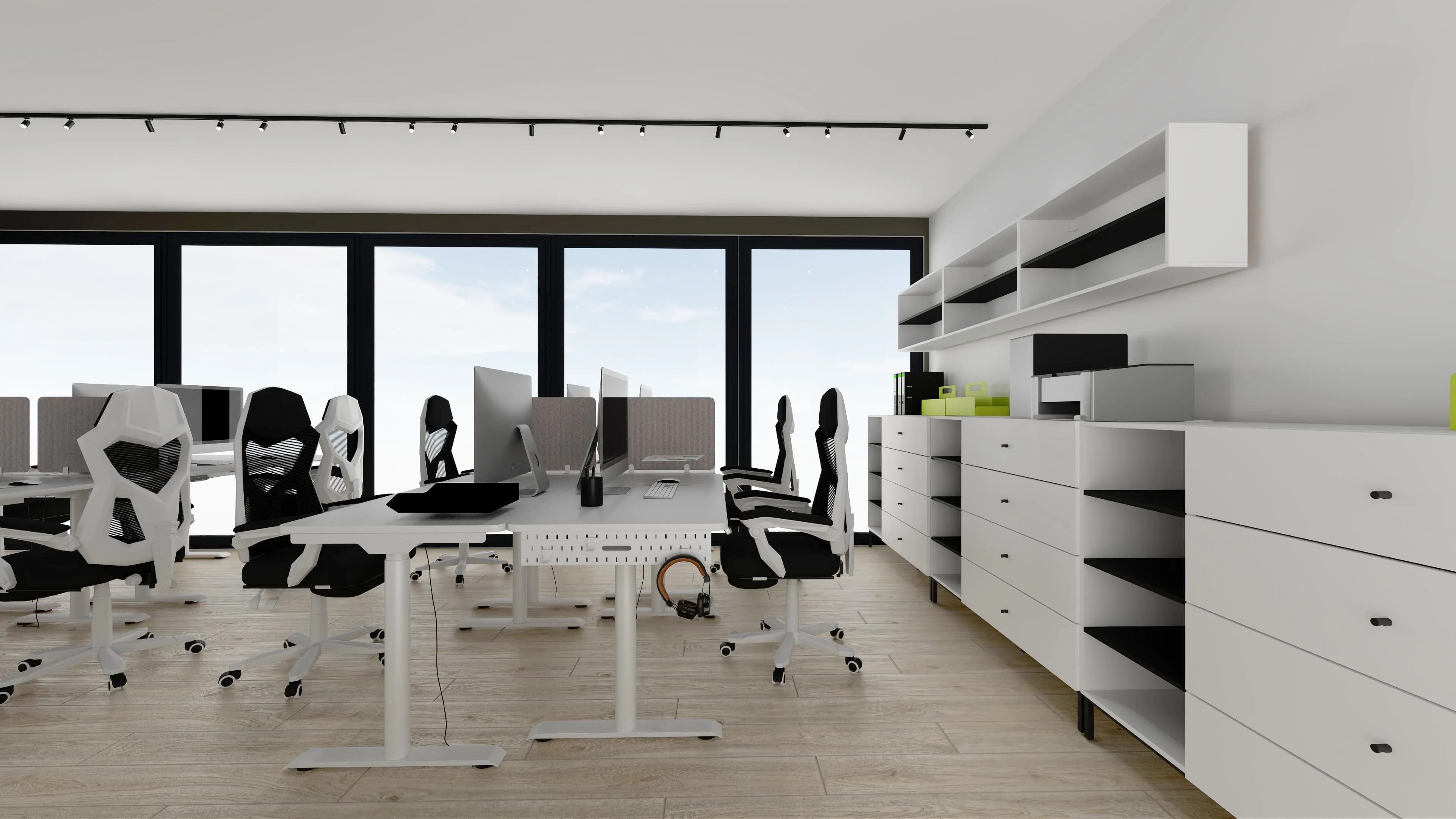 Praktyczne biuro typu open space łączy funkcjonalność z nowoczesnym stylem. Osiem ergonomicznych biurek z fotelami na kółkach zapewnia komfort i swobodę podczas codziennych zadań. Jasna, drewniana podłoga dobrze współgra z białymi meblami i ścianami, które optycznie powiększają przestrzeń. Porządek pomagają utrzymać liczne regały i schowki.