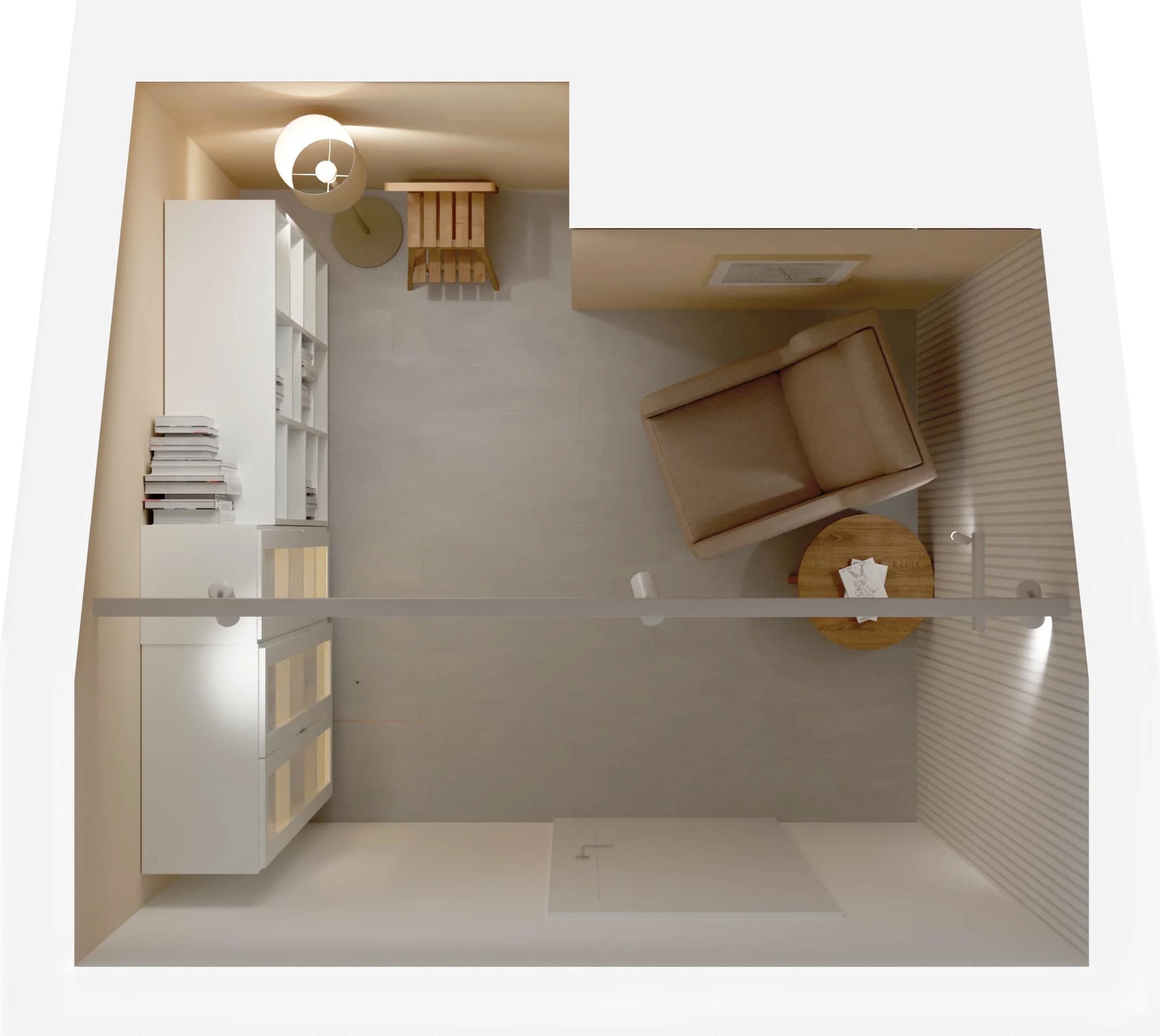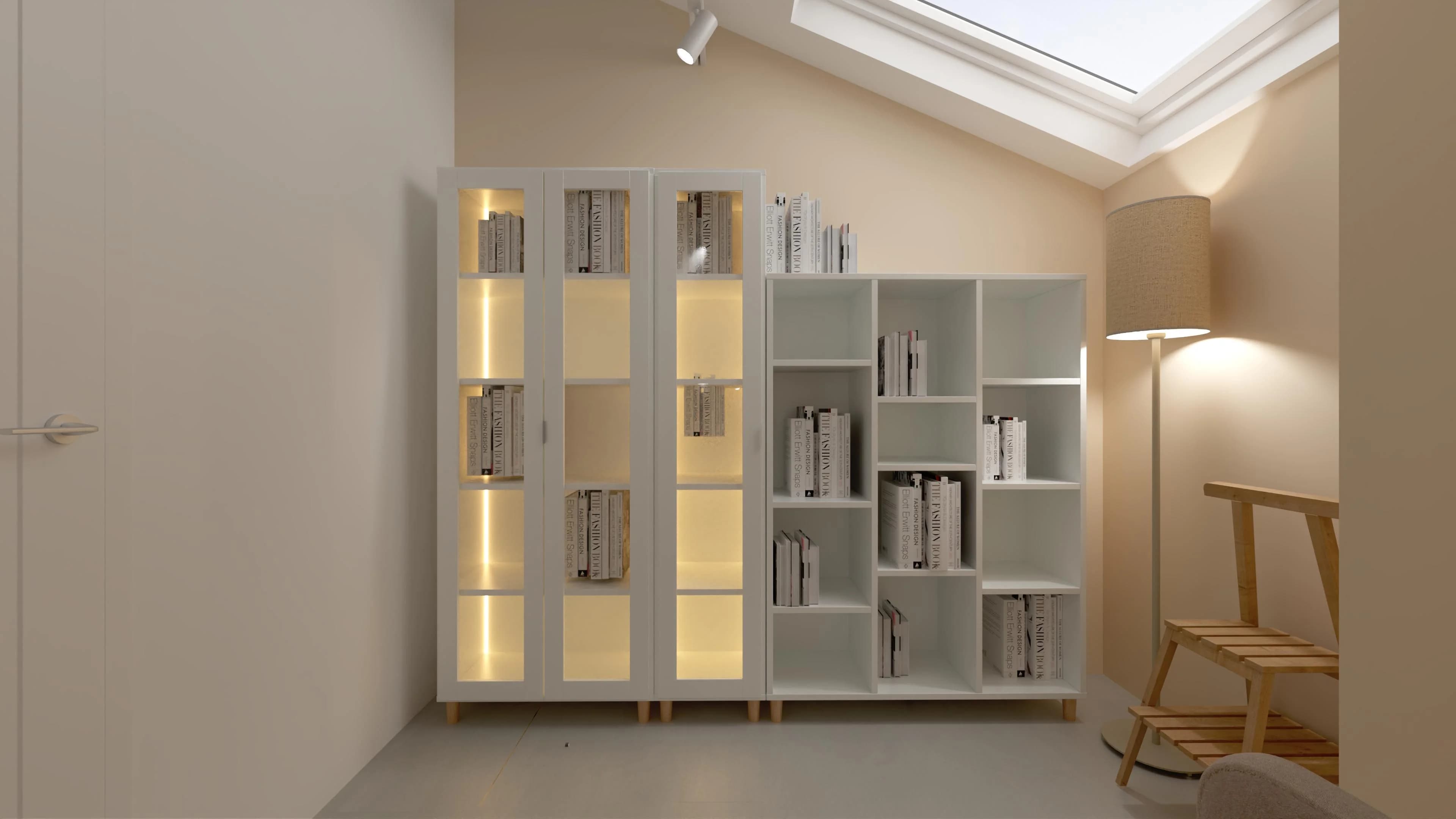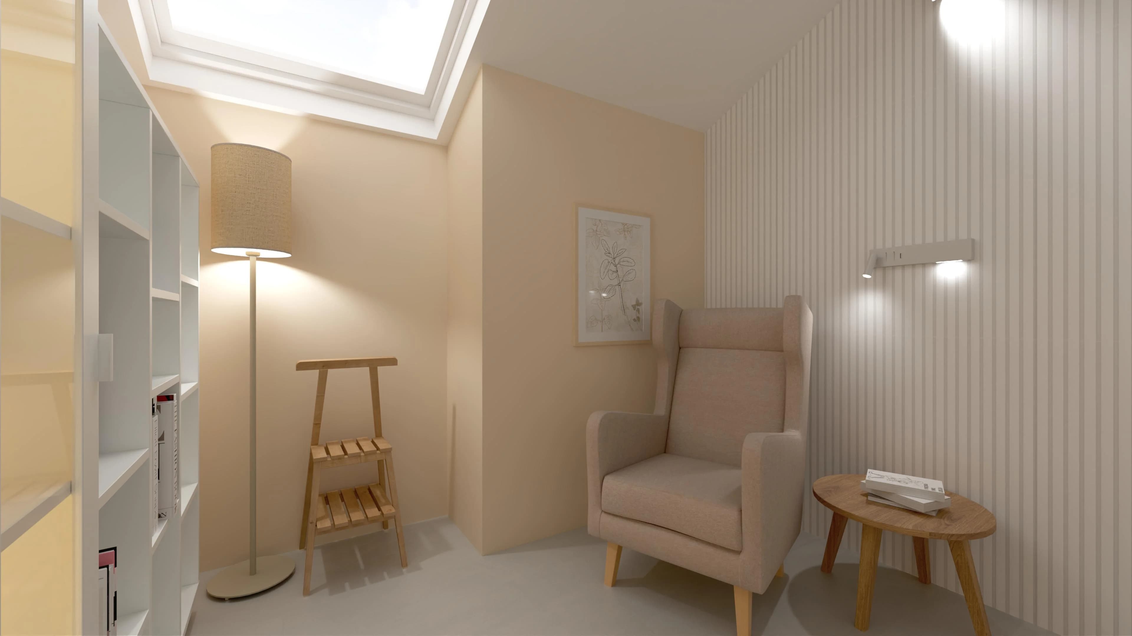 Ukryta na poddaszu biblioteka to prawdziwy azyl do chwil relaksu z książką w ręku. Wysoka, podświetlana witryna doskonale prezentuje książki, a jednocześnie chroni je przed zakurzeniem. Miękki fotel uszak, ustawiony tuż pod skosem dachu, zachęca do odprężenia w ciszy. Jasne odcienie beżu i bieli budują atmosferę spokoju i wyciszenia.