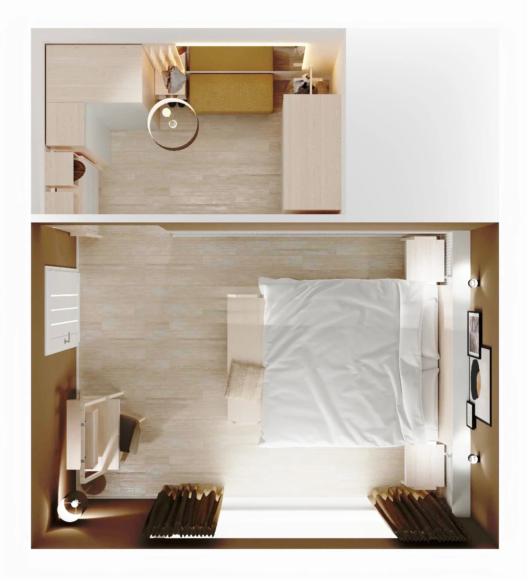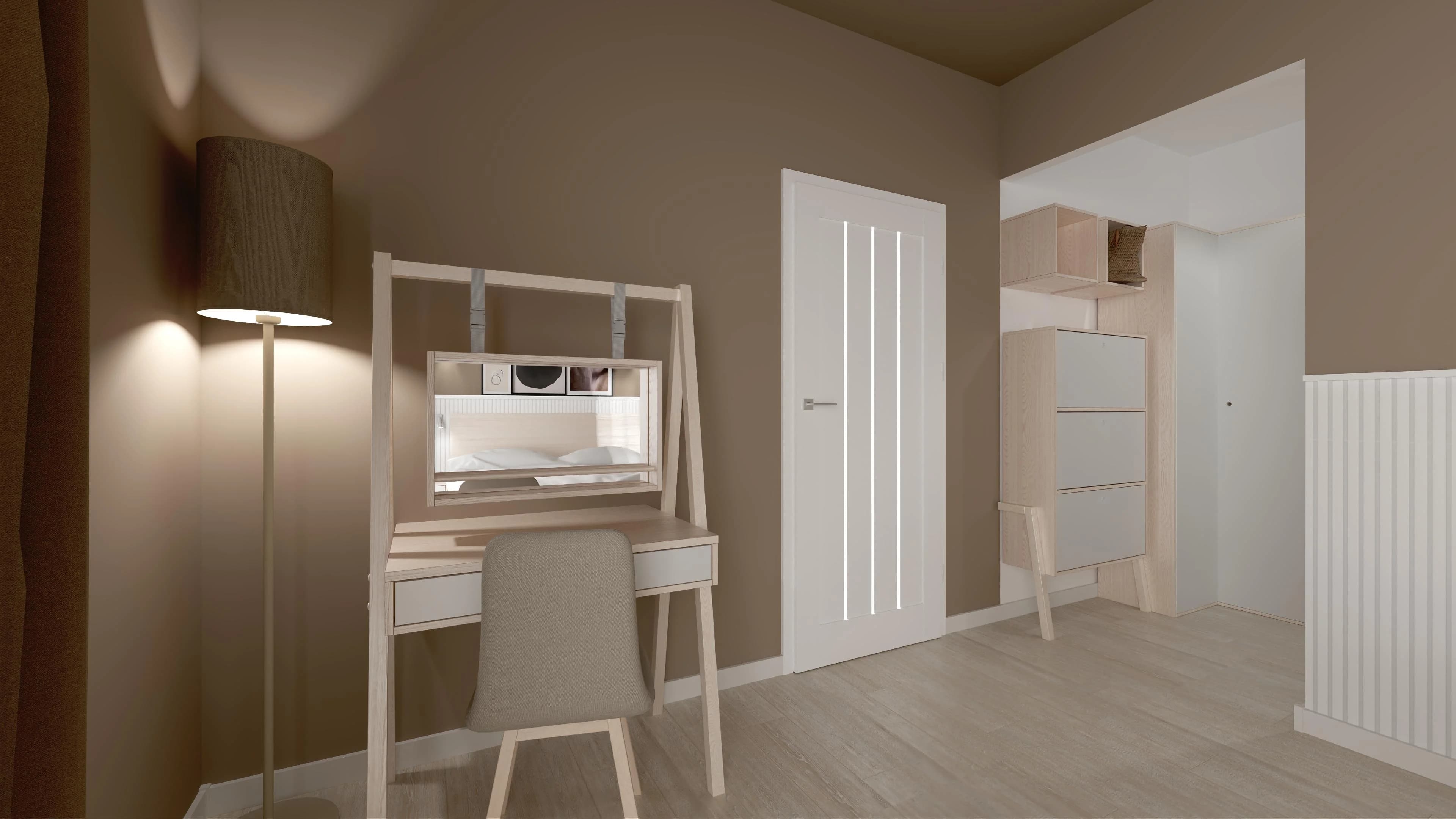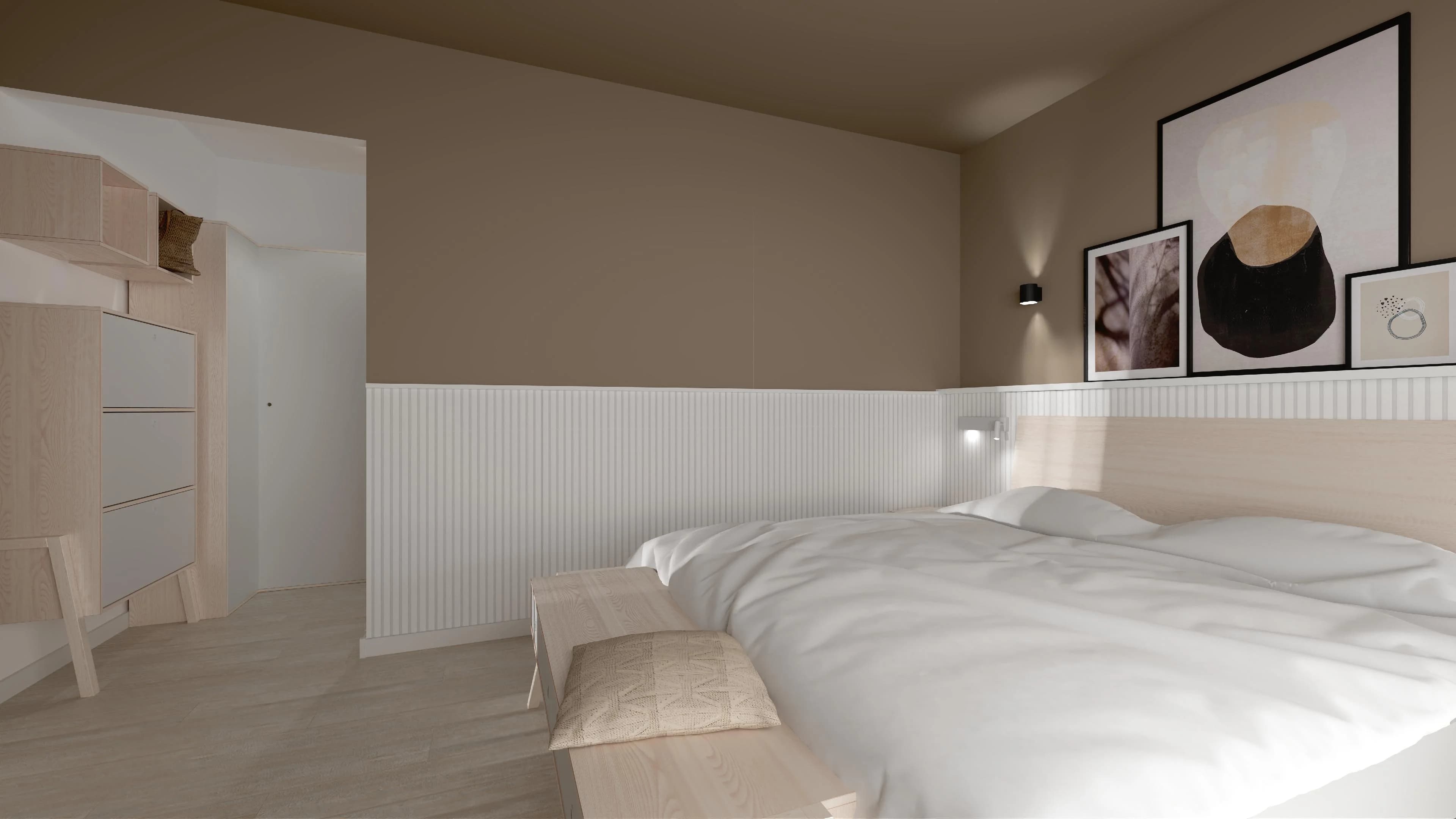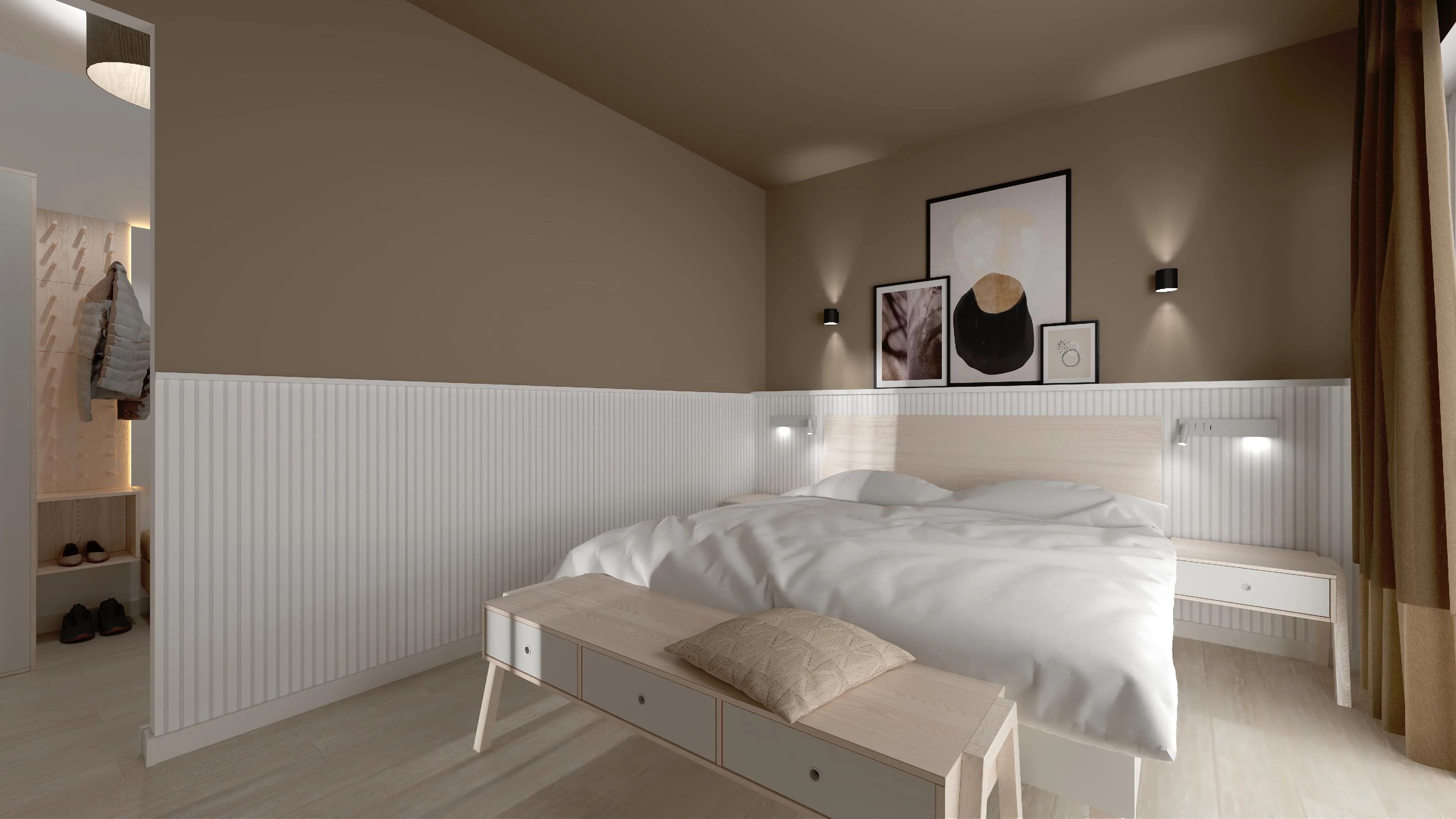 Sypialnia emanuje spokojem i harmonią, a jej styl wyznacza kolorystyka kawy z mlekiem oraz biała lamperia do połowy ścian. Lekkie, wysokie meble ułatwiają sprzątanie, a przed łóżkiem stoi praktyczna ławeczka z miejscem do przechowywania drobiazgów. Mimo niewielkiego metrażu udało się wydzielić małą garderobę, która pomaga w utrzymaniu porządku.