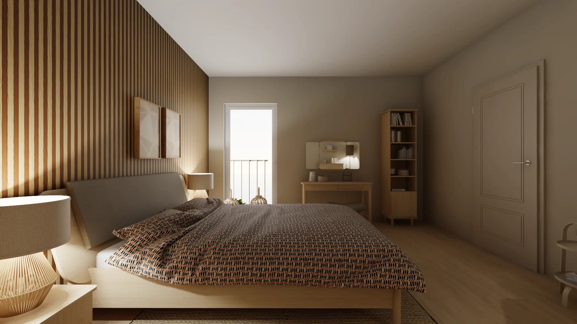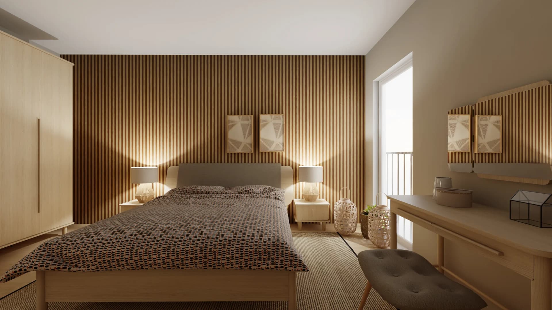 Cosy bedroom with a wall of lamellas