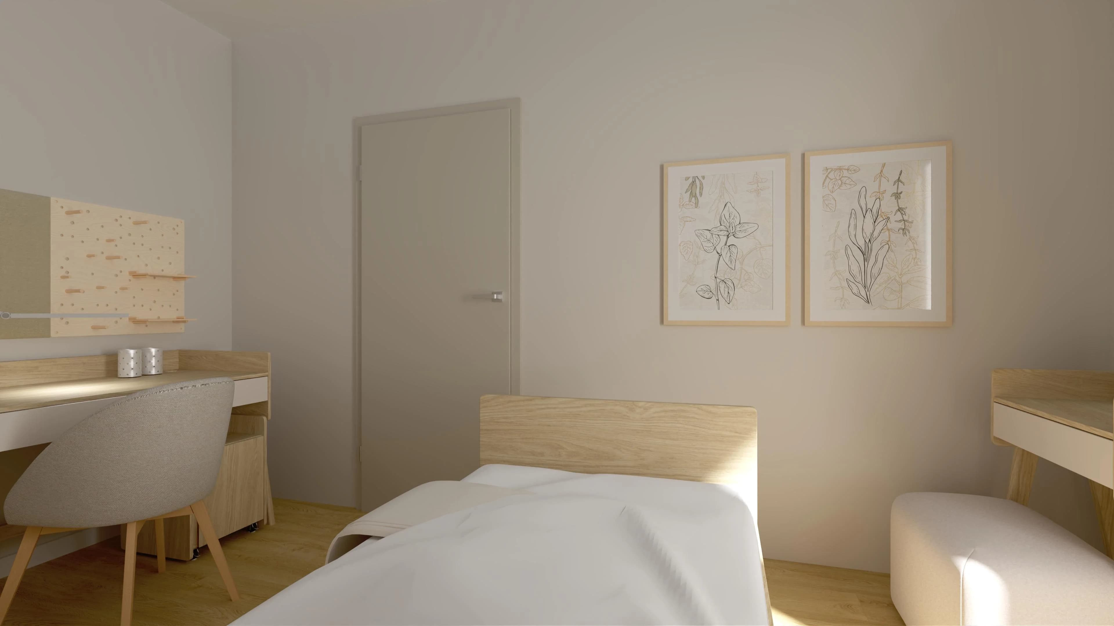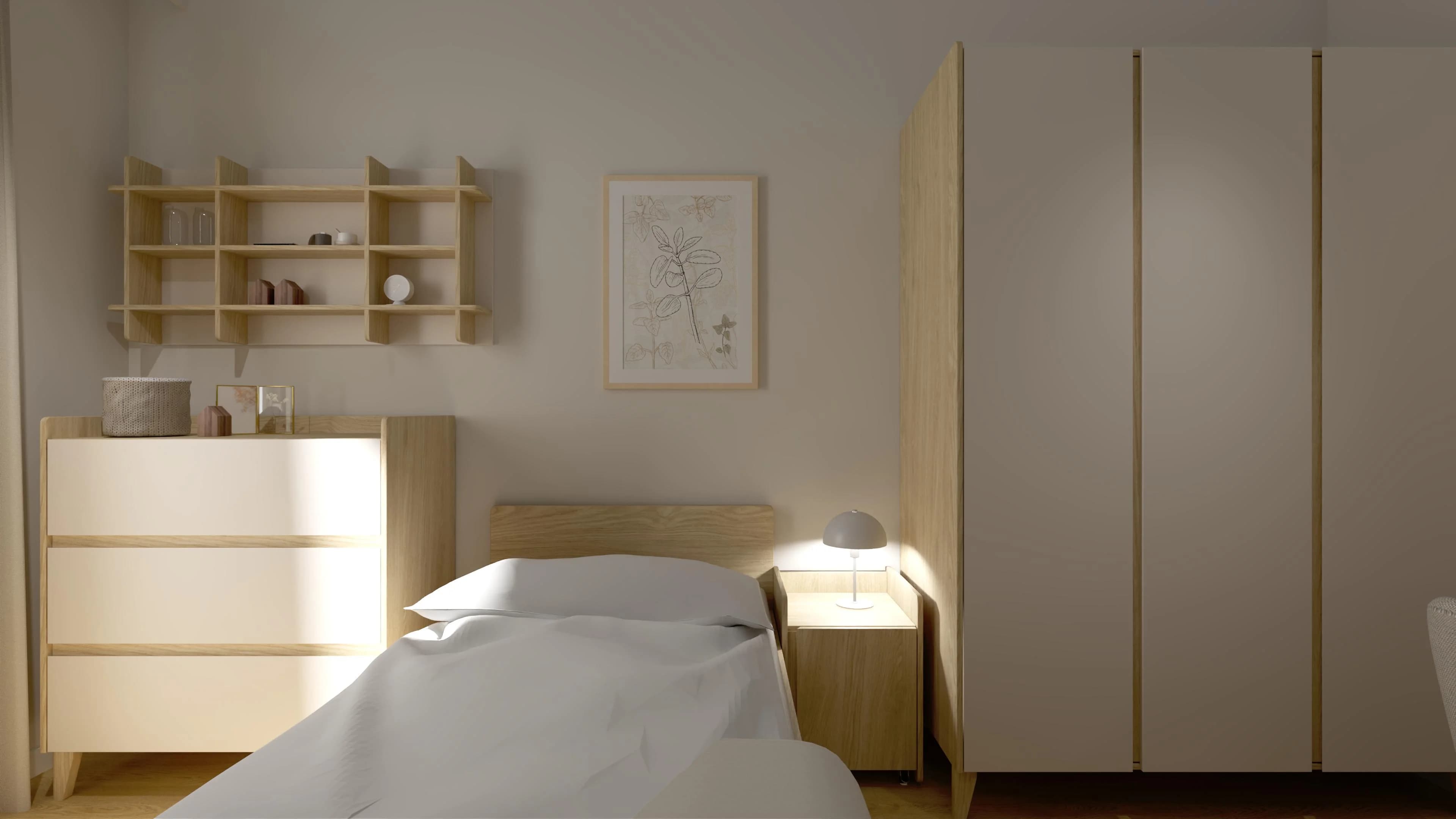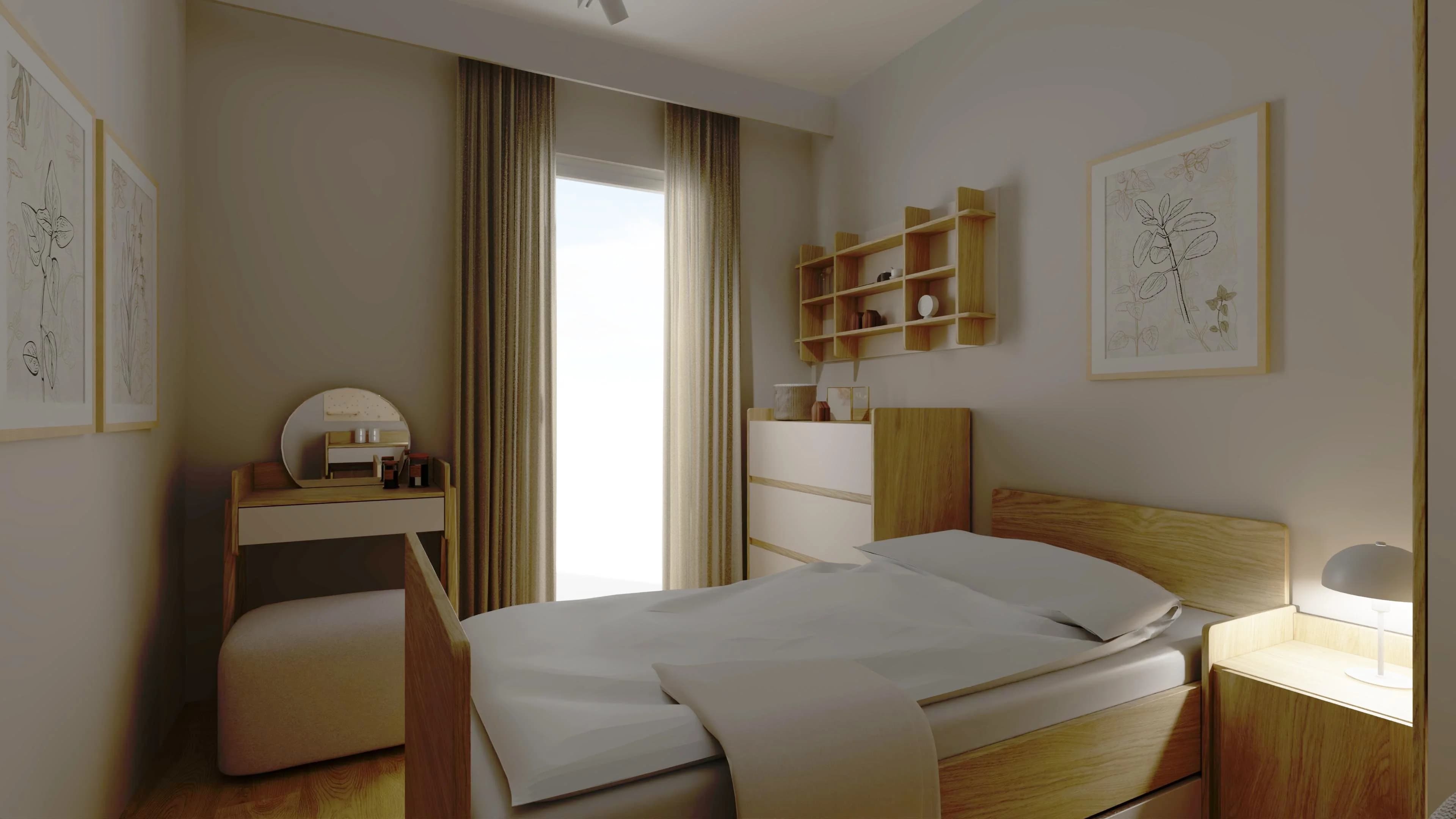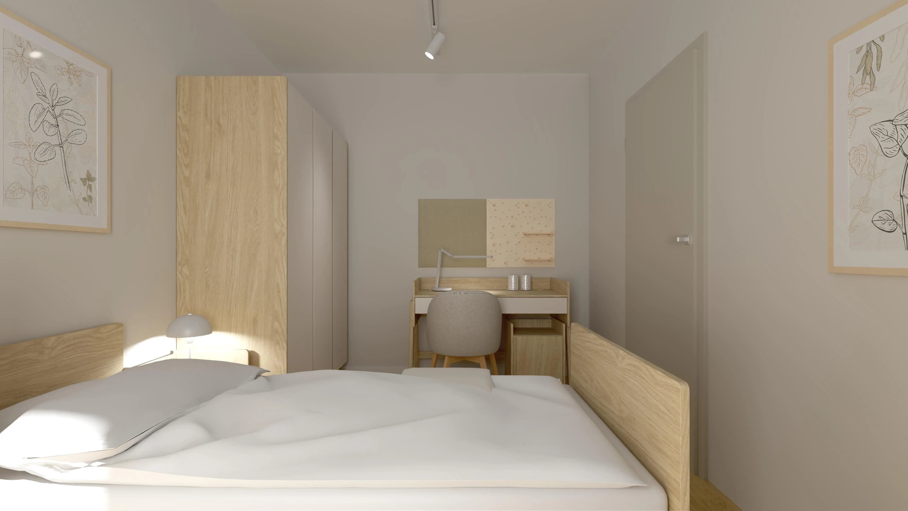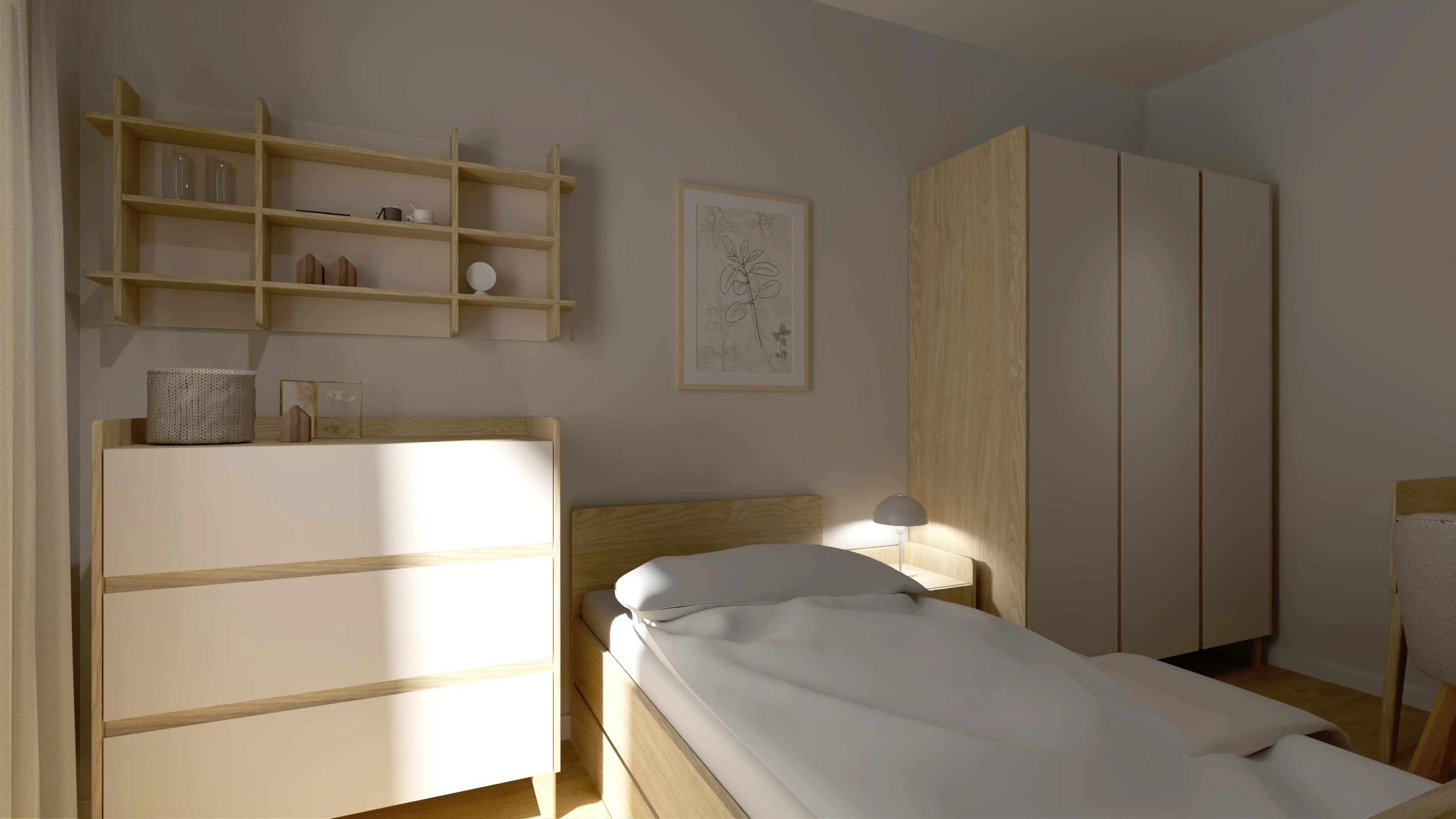 Choć pokój jest niewielki, z powodzeniem spełnia różne funkcje. Łóżko ustawione w centrum gwarantuje komfortowy wypoczynek, a poręczny stolik pozwala mieć potrzebne drobiazgi tuż obok. Liczne miejsca do przechowywania pomagają utrzymać porządek. Przy praktycznym biurku można wygodnie odrabiać lekcje, a kompaktowa toaletka tworzy własną strefę beauty.