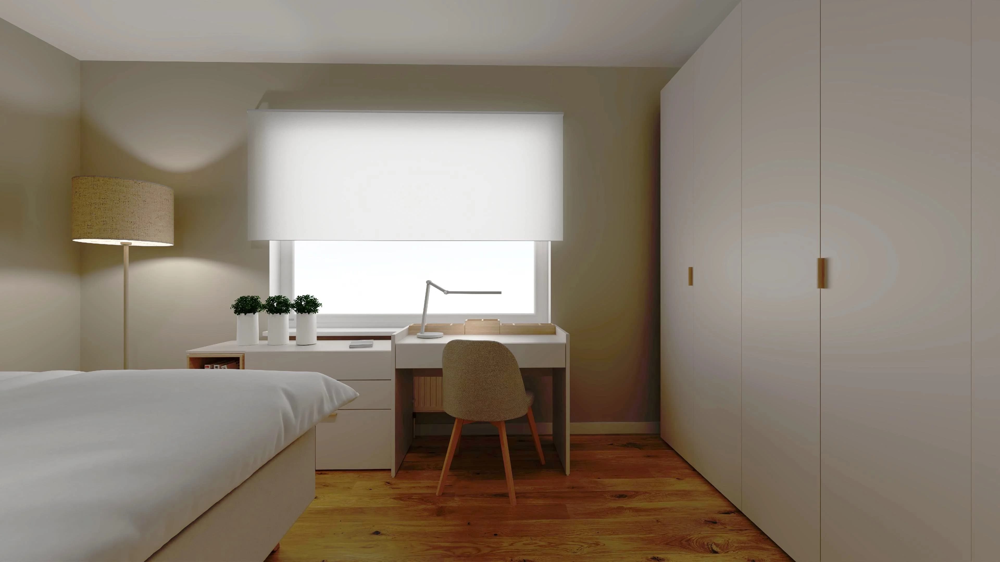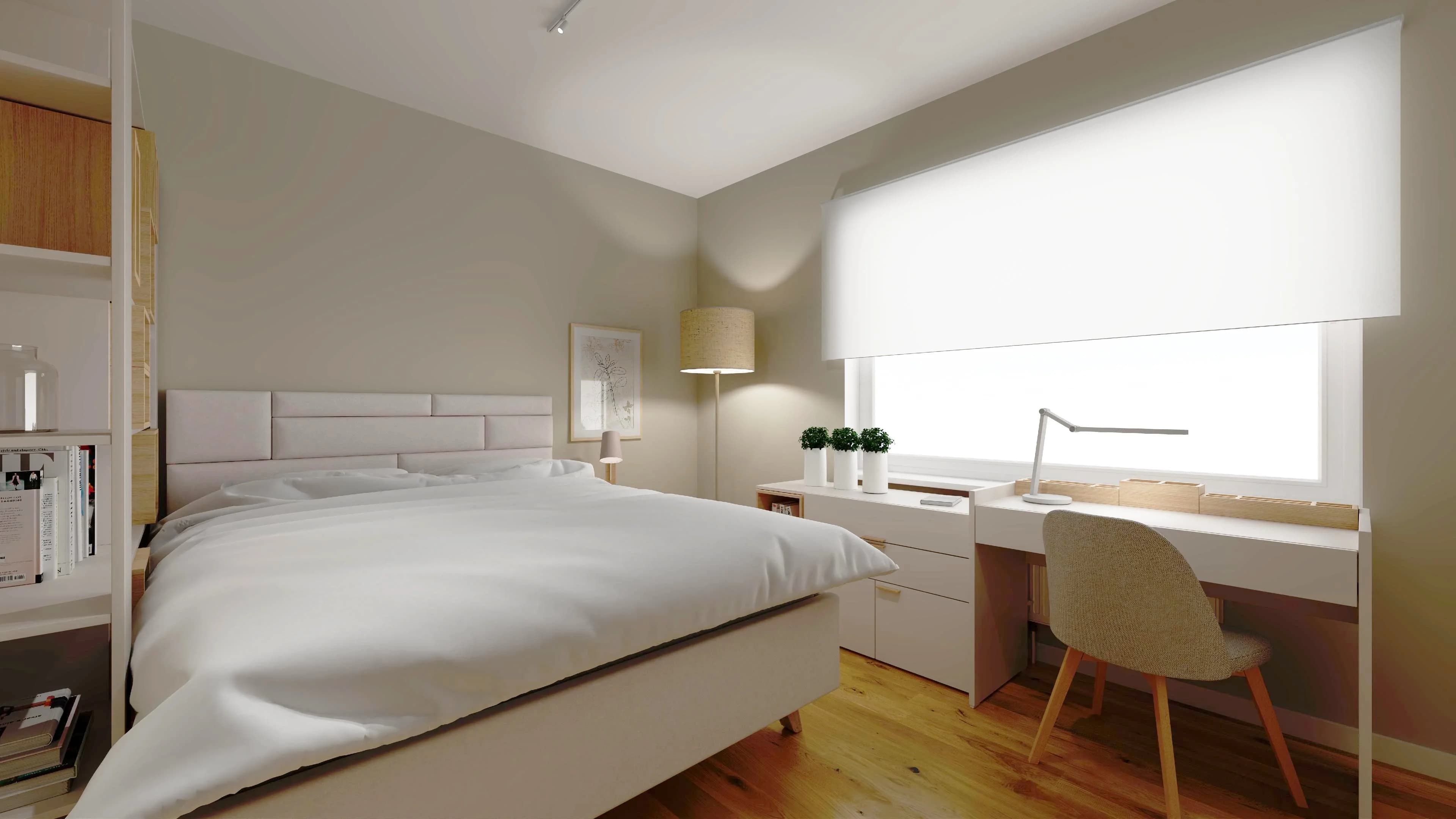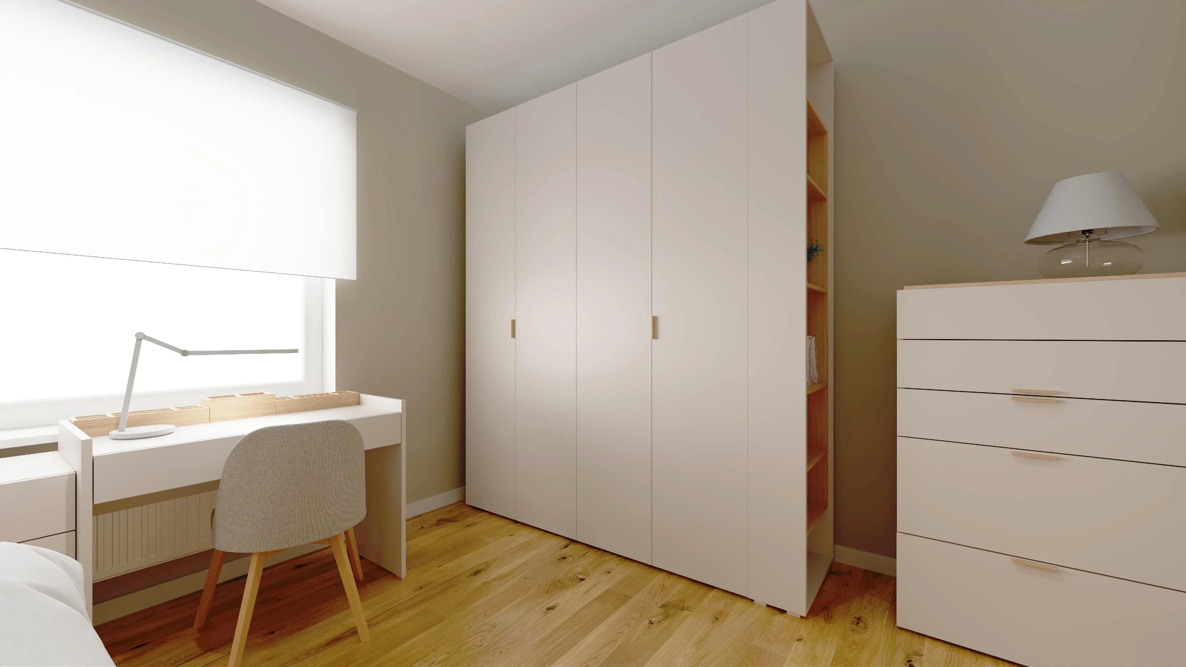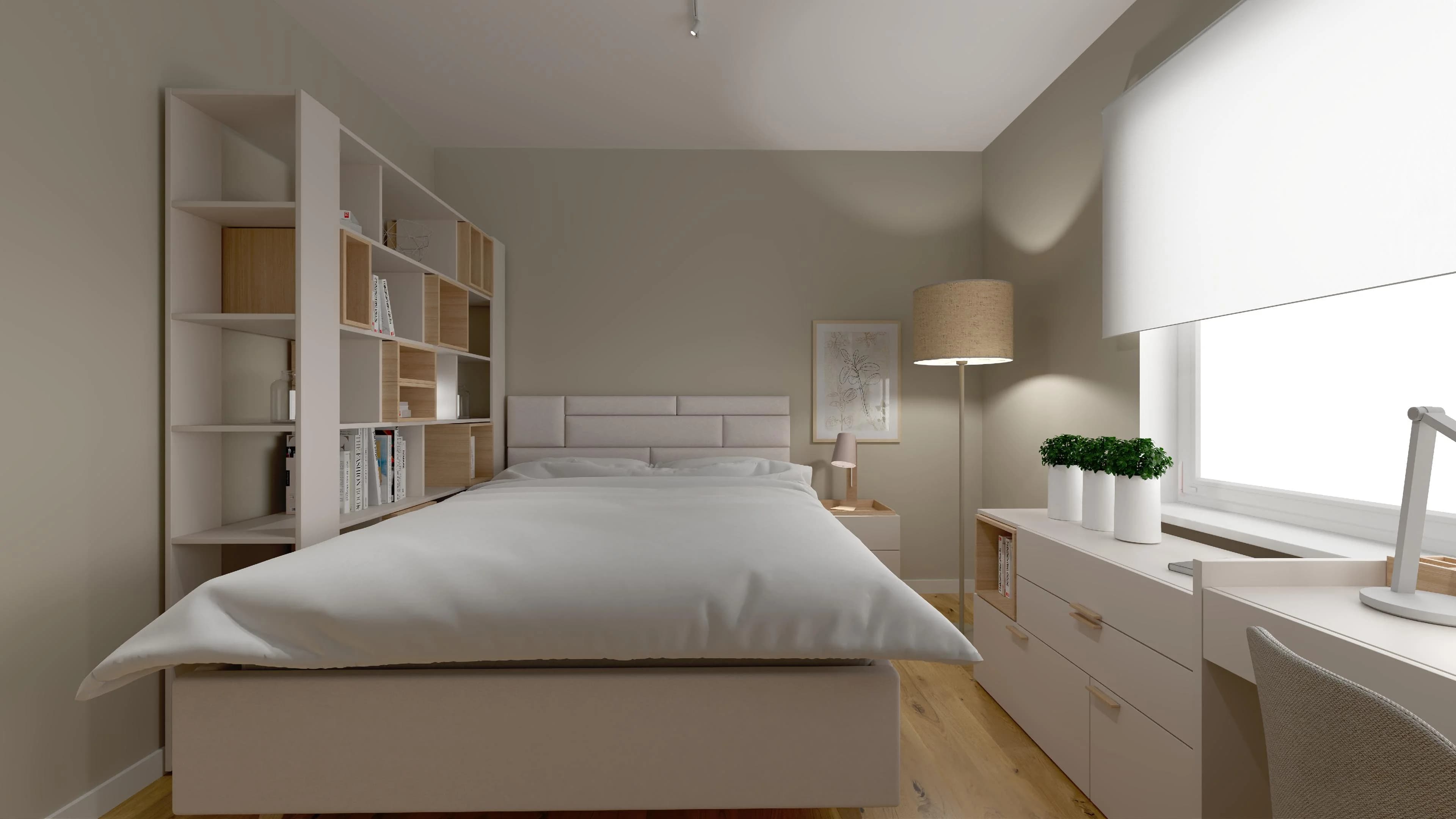 Jasna sypialnia to miejsce pełne harmonii. Dominują w niej ciepłe barwy drewna i beżu, które koją zmysły i tworzą atmosferę relaksu. Mimo małego metrażu, udało się zmieścić w niej łóżko dla dwojga z wysokim zagłówkiem, o który można się wygodnie oprzeć. Pakowne meble pełnią rolę osobistej garderoby. Tuż przy oknie znajduje się biurko, pełniące również rolę toaletki.